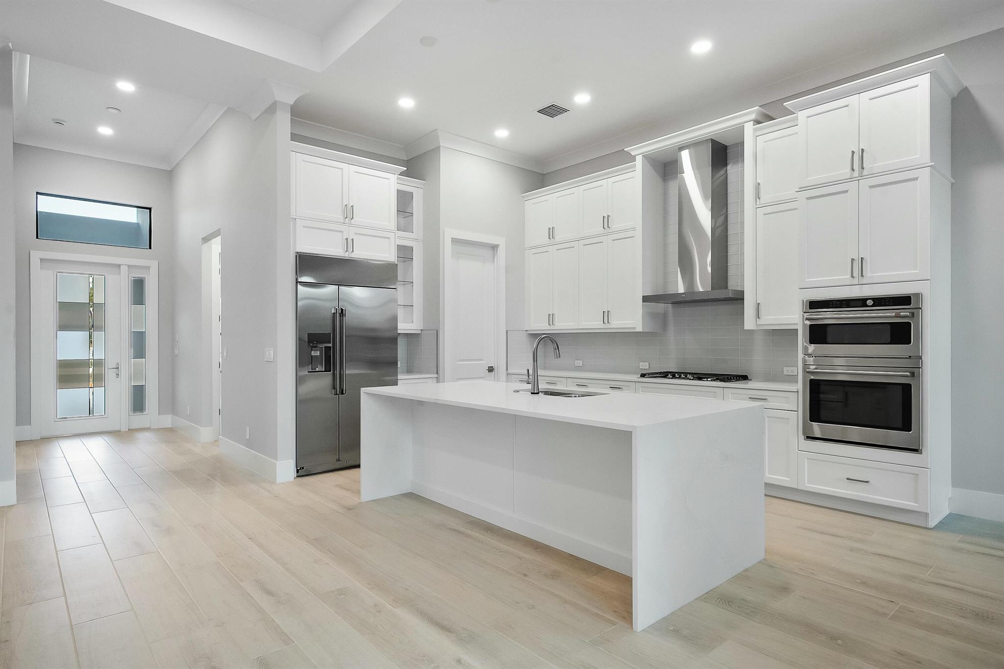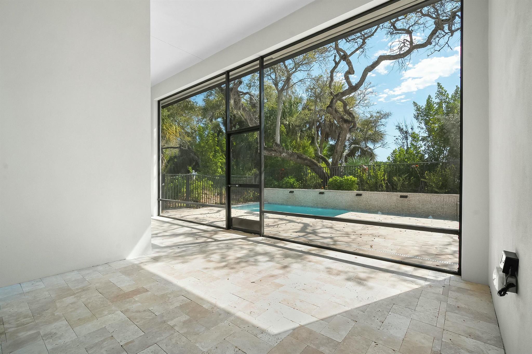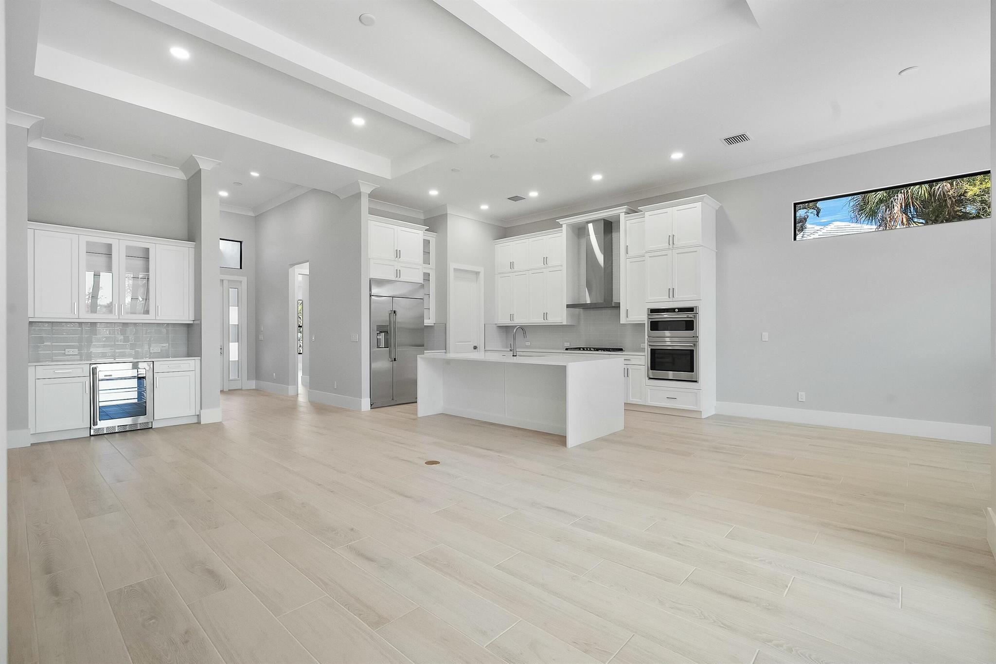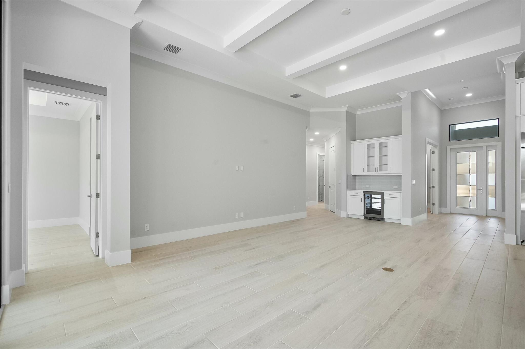 The Seabreeze Grande, a 4-bedroom, 3-bath villa with over 2366 finished square feet, offering the ultimate in-island living. Nestled in a charming Florida setting surrounded by lush landscaping, this home boasts an exquisite pool including 3-24'' sheer descent waterfalls and a built-in wrap-around bench surrounded by lush landscaping, perfect for embracing the carefree island lifestyle. The covered patio is screened in with rail fencing around the pool area. And a retractable screen on patio. Exceptional finishes include solid core interior doors, Arhus Classic Blanco wood-look tile flooring, volume ceilings, bay window in bedroom 2, quartz countertops, under-cabinet lighting, high-end Cafe appliances, Bar area with a beverage refrigerator. With the added option of a 4th bedroom or den