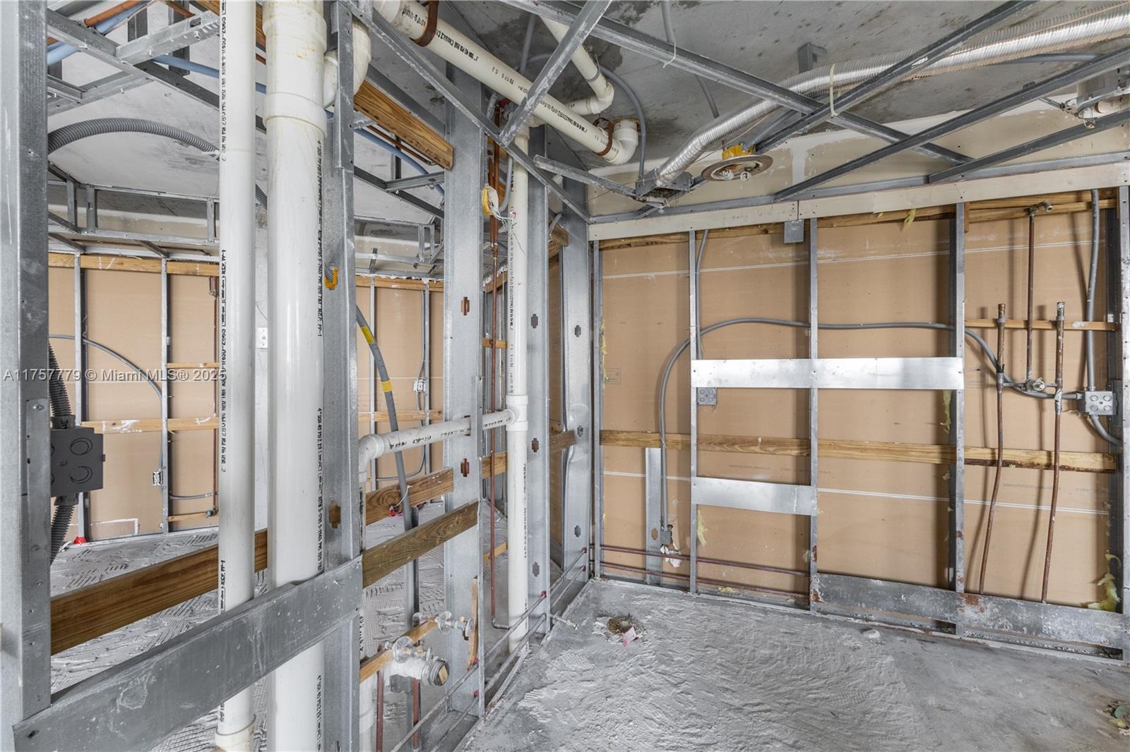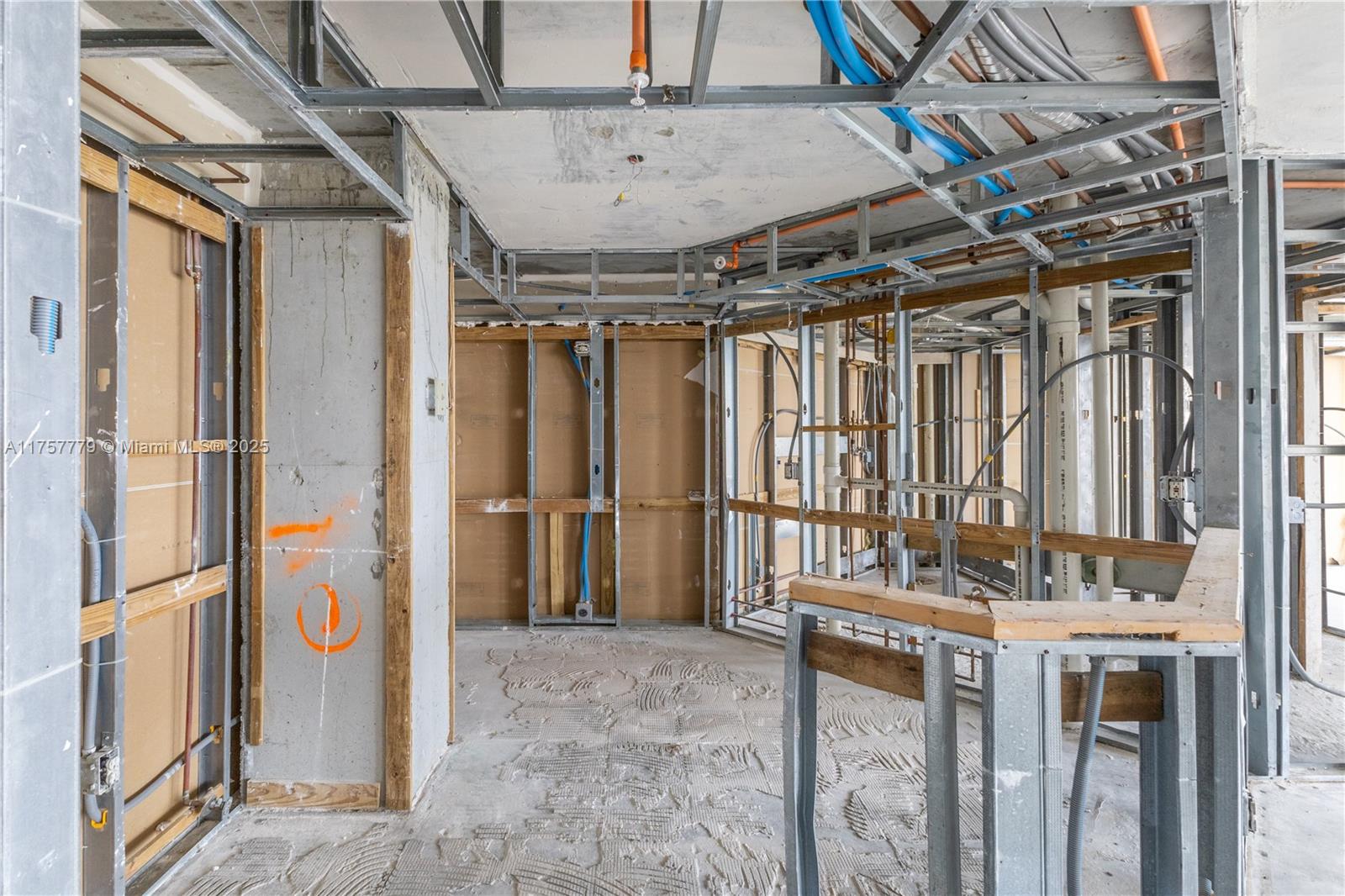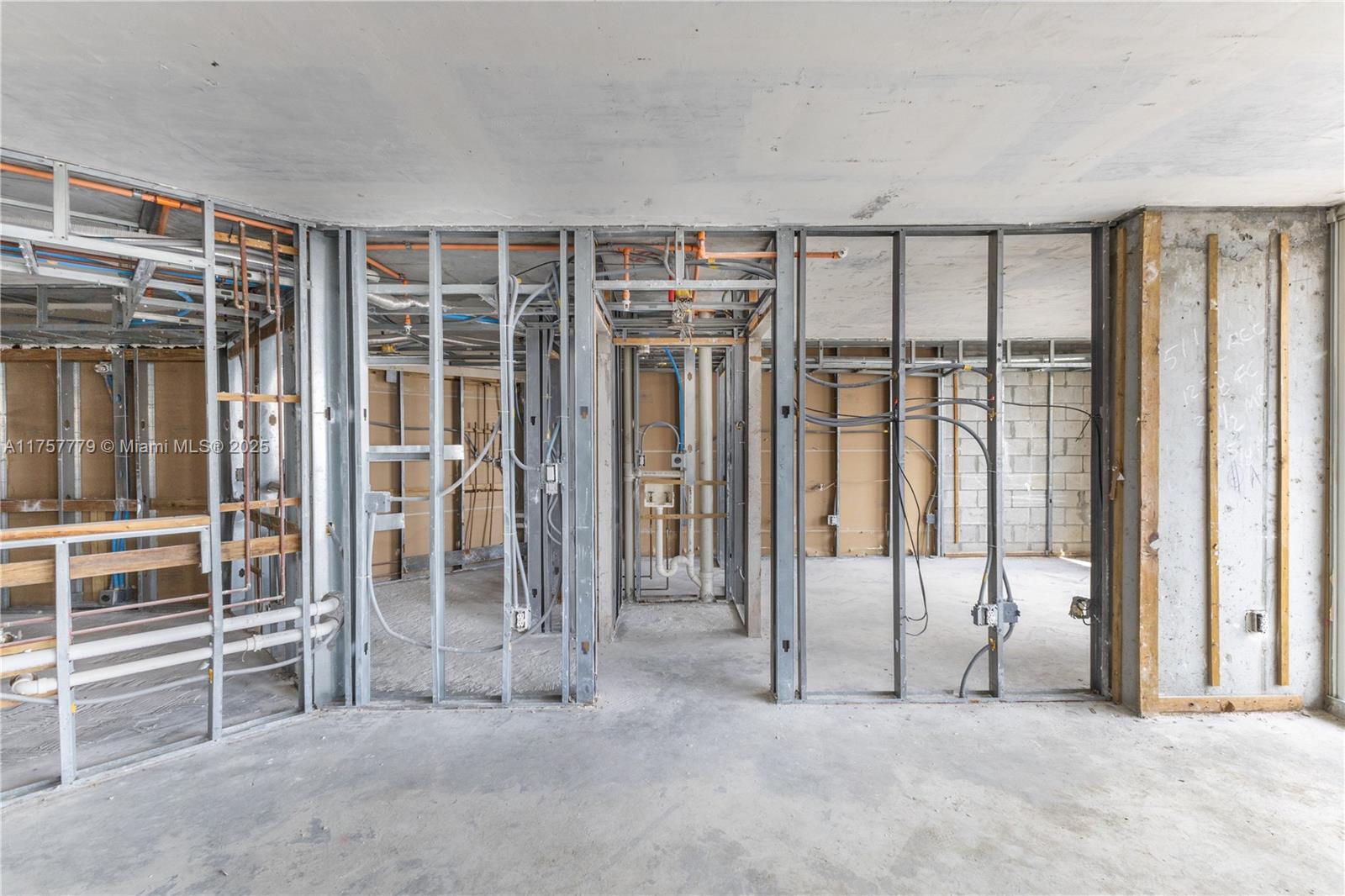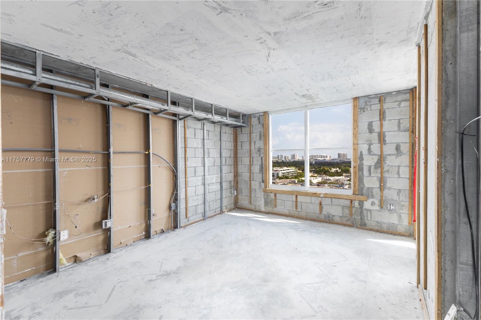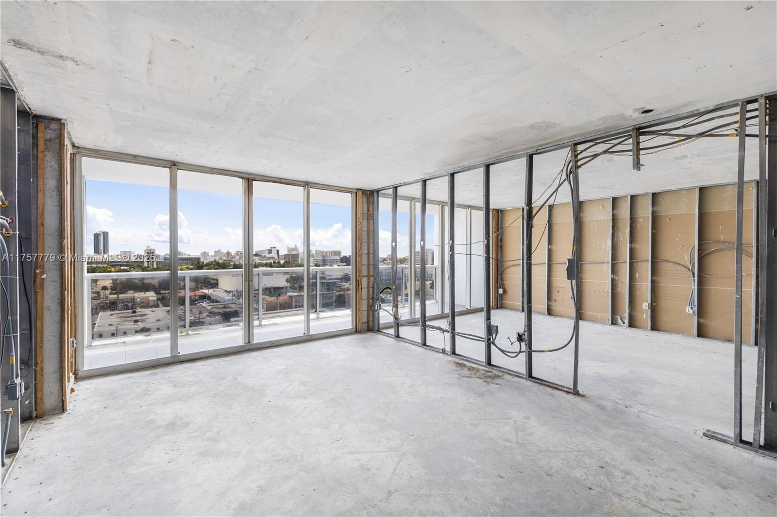 CONTRACTOR SPECIAL - BRING YOUR ARCHITECT. Unit fire in 2024 - needs complete rebuild. Rare opportunity to build out a bright South Beach condo @ Sunset Harbour. Skyline Views facing east with golf course and peek of distant ocean. This unit has been completely gutted down to the studs and concrete floors for fast construction and build out to your dream finishes (with your own contractor team.) This is being delivered As Is - all planning and permitting to be handled by the buyer. Flexible layout began as a 2/2 with split bedroom plan, 3 walk-in closets and walls of sliding glass opening to a private 30 foot balcony with access from every room.