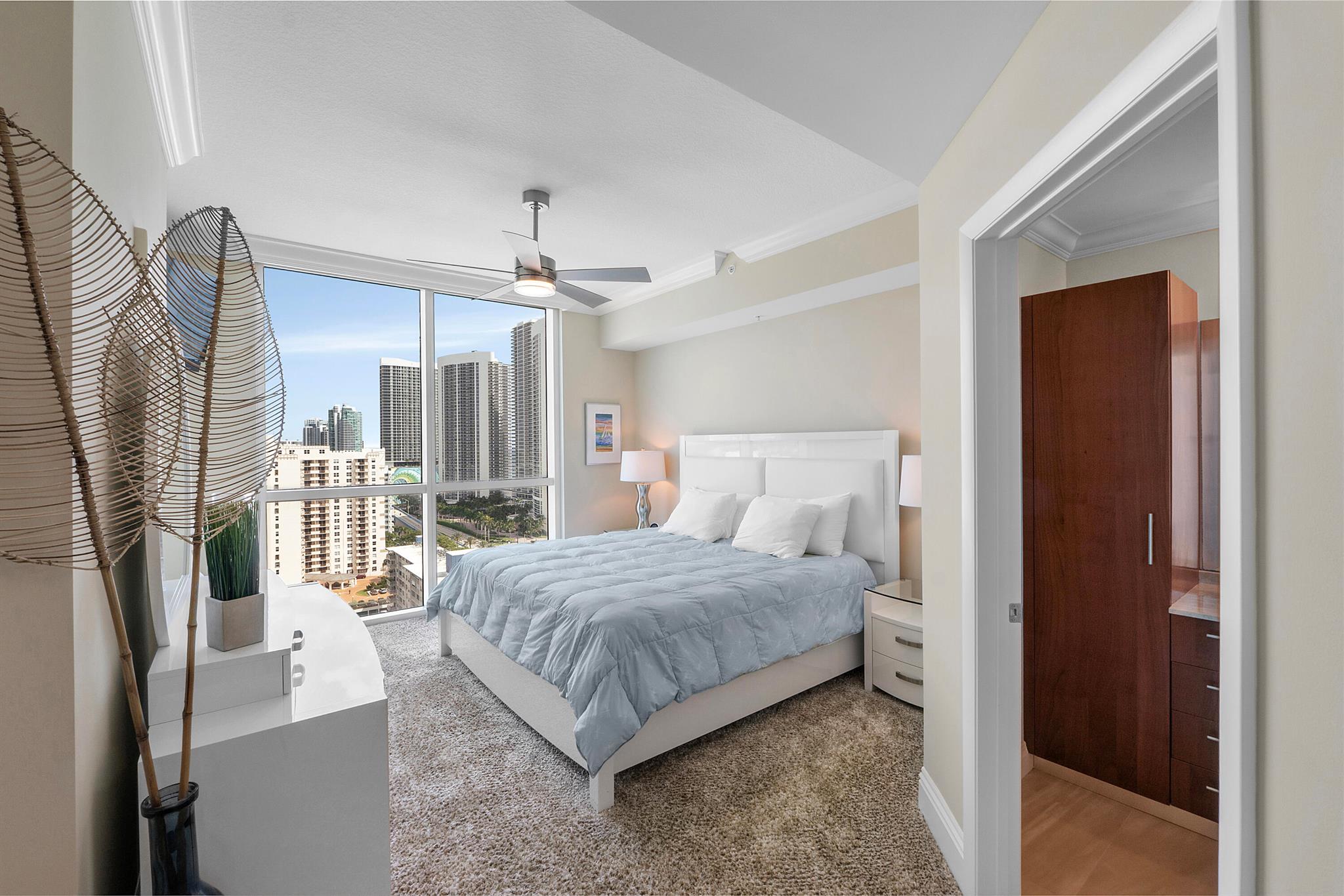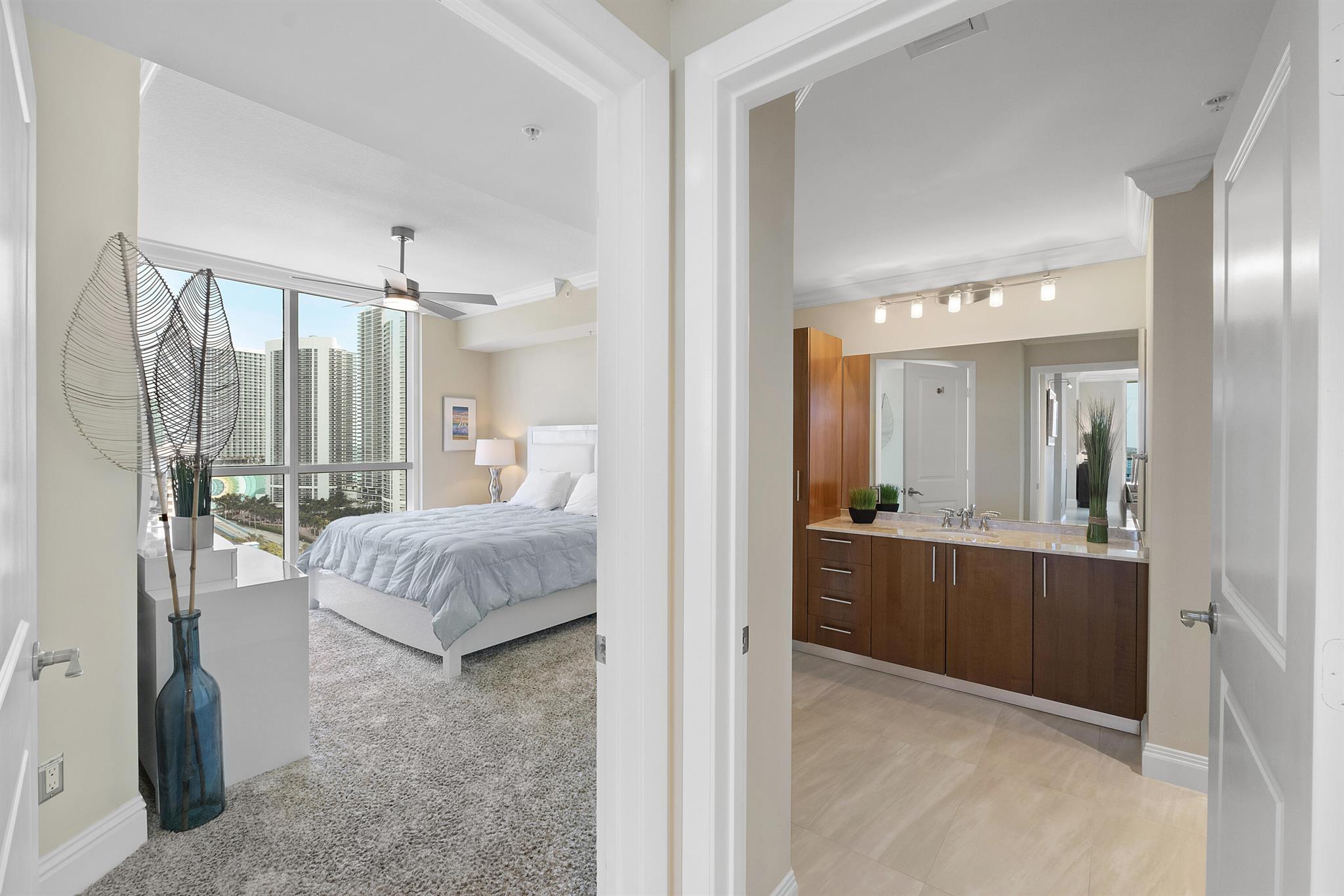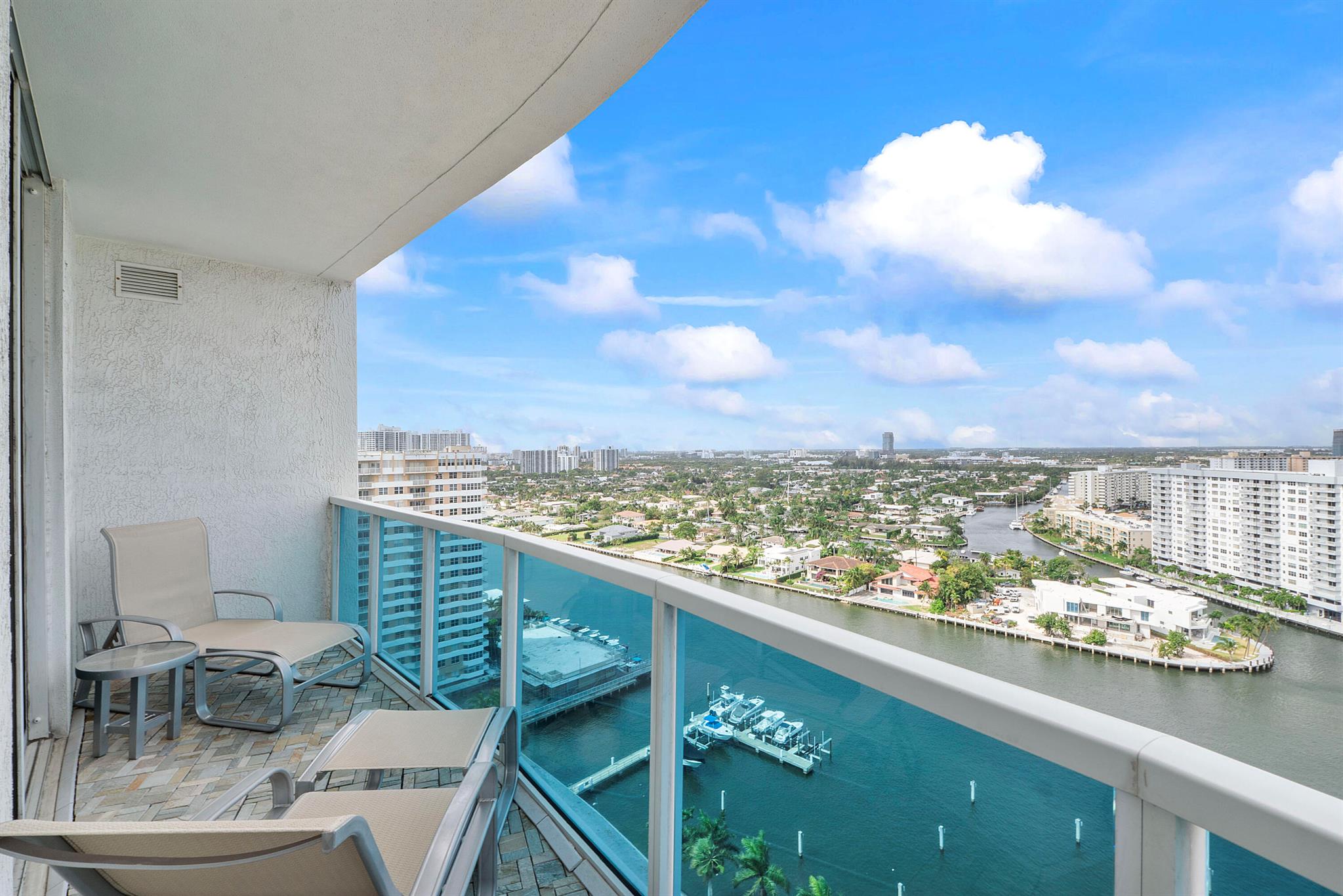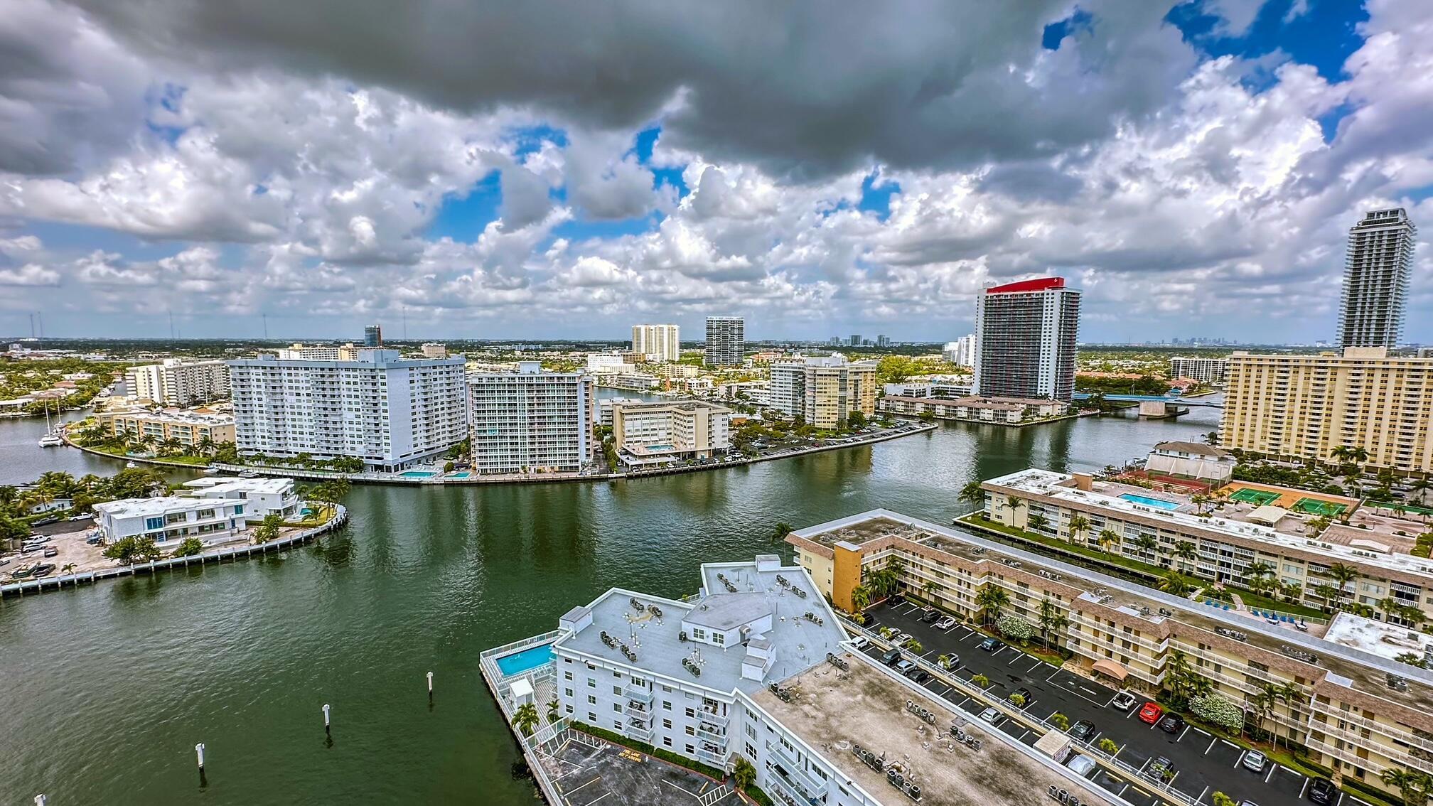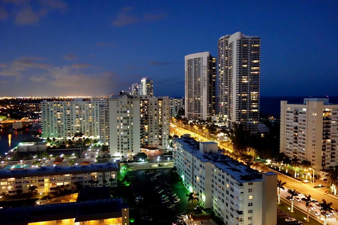 Fantastic find! Welcome to this magnificent sunlit 3 BR/2.5 Bath aerie high above the Intracoastal Waterway with views that go on 'forever'. This is a rare opportunity to own this 19th floor SW corner condo in the Ocean Marine Yacht Club.The unit has everything you want and is truly move-in ready. Both the primary and the 2nd bedroom have en-suite full, custom bathrooms. The 3rd bedroom would make a great office/den. There are new s/s appliances, Italian porcelain floors, gorgeous lighting fixtures that are all electrically controlled, an open island kitchen with another window over the sink and sliders to the tile-covered wrap-around terrace, custom closets galore, custom black-out shades, and more. There is also a separate large laundry room with a new washer and dryer.