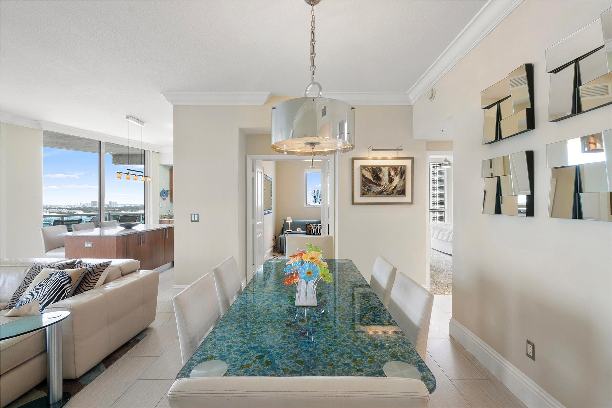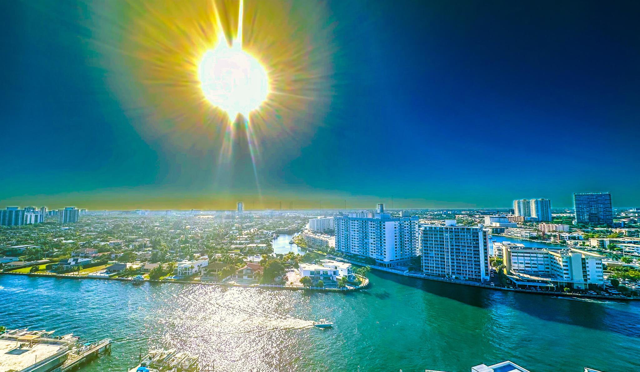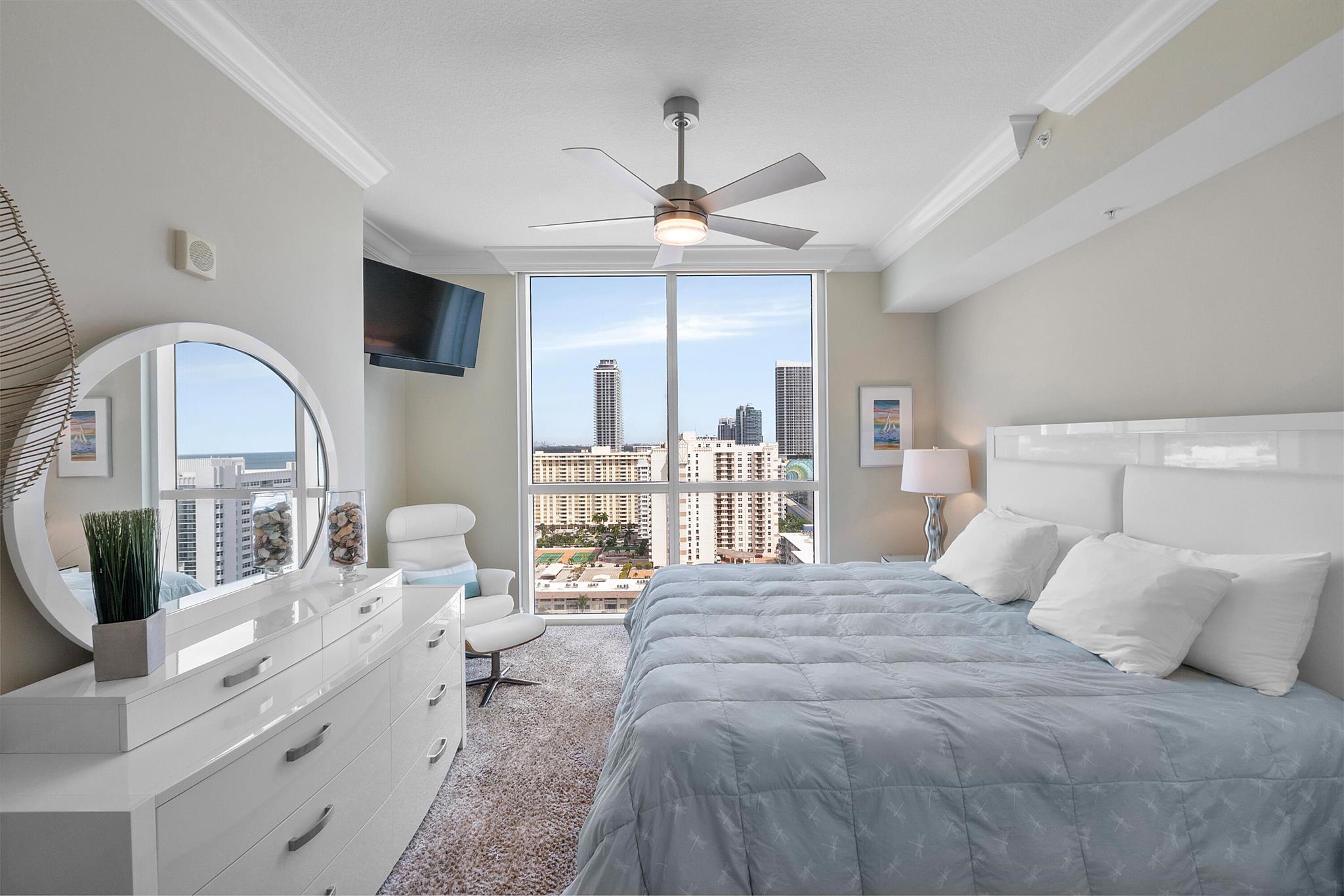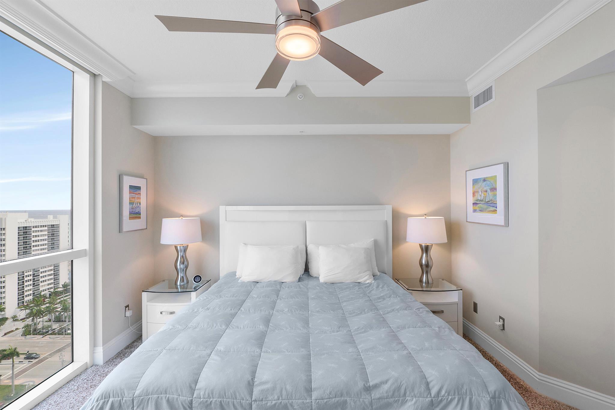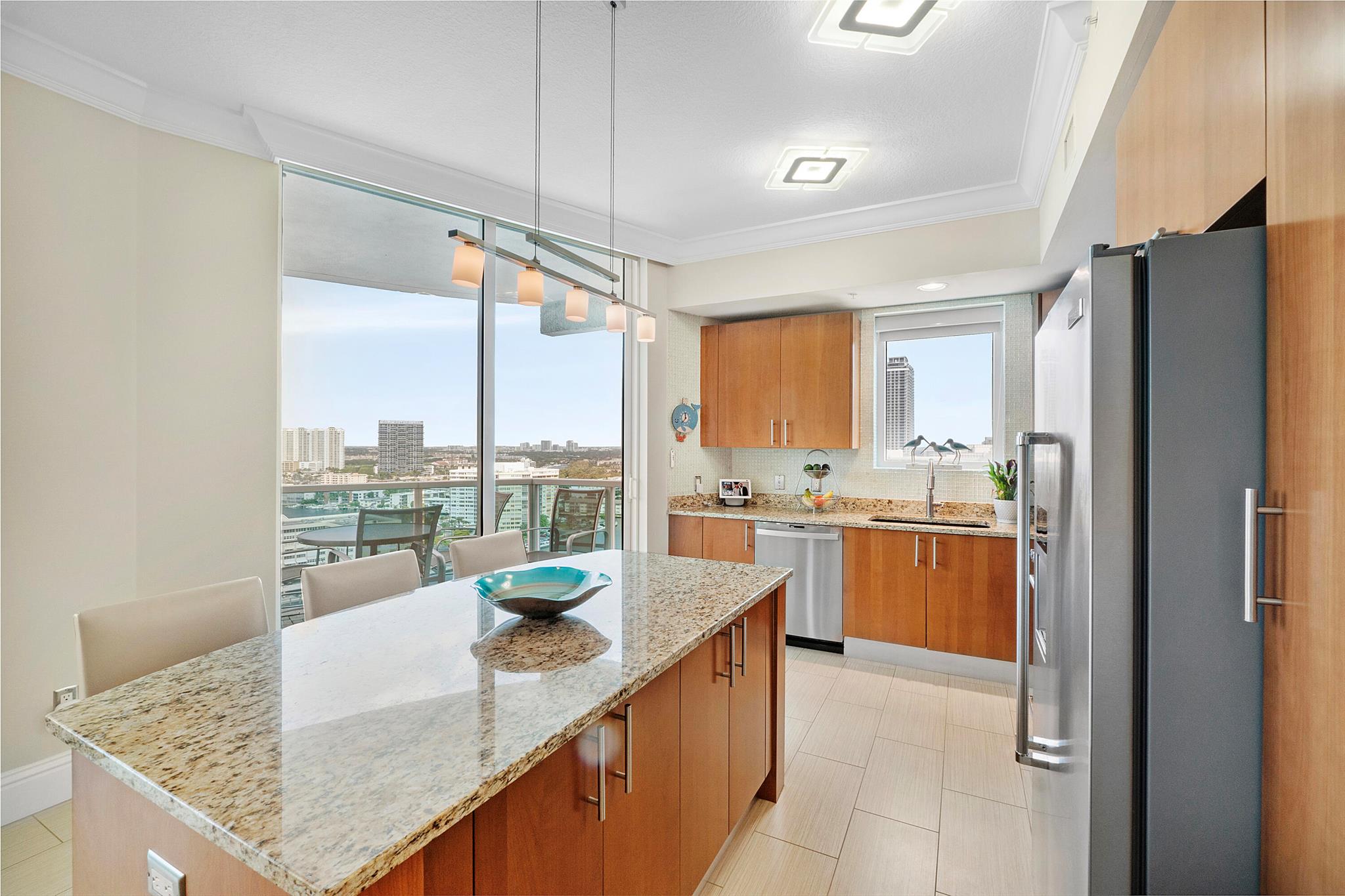 Fantastic find! Welcome to this magnificent sunlit 3 BR/2.5 Bath aerie high above the Intracoastal Waterway with views that go on 'forever'. This is a rare opportunity to own this 19th floor SW corner condo in the Ocean Marine Yacht Club.The unit has everything you want and is truly move-in ready. Both the primary and the 2nd bedroom have en-suite full, custom bathrooms. The 3rd bedroom would make a great office/den. There are new s/s appliances, Italian porcelain floors, gorgeous lighting fixtures that are all electrically controlled, an open island kitchen with another window over the sink and sliders to the tile-covered wrap-around terrace, custom closets galore, custom black-out shades, and more. There is also a separate large laundry room with a new washer and dryer.