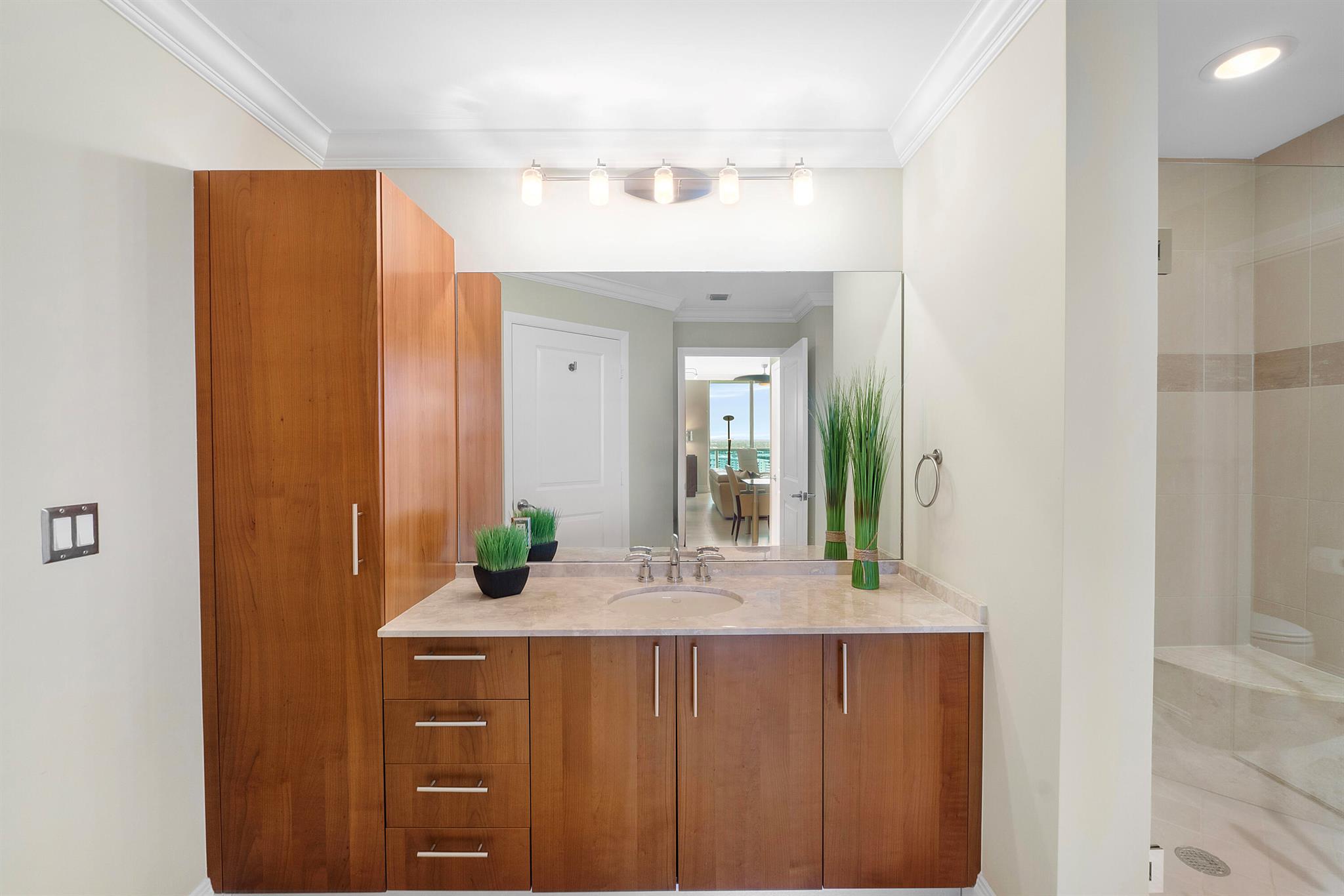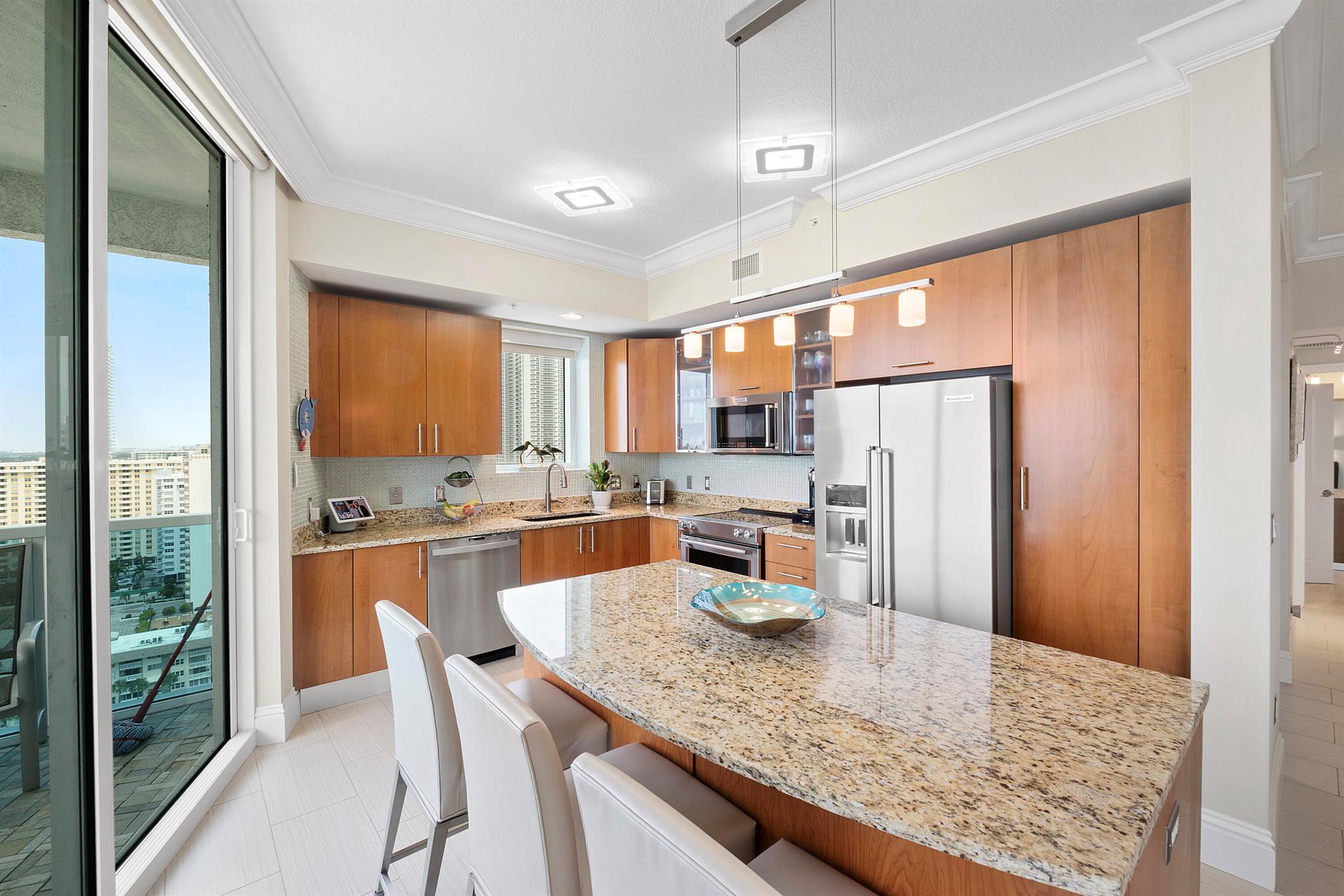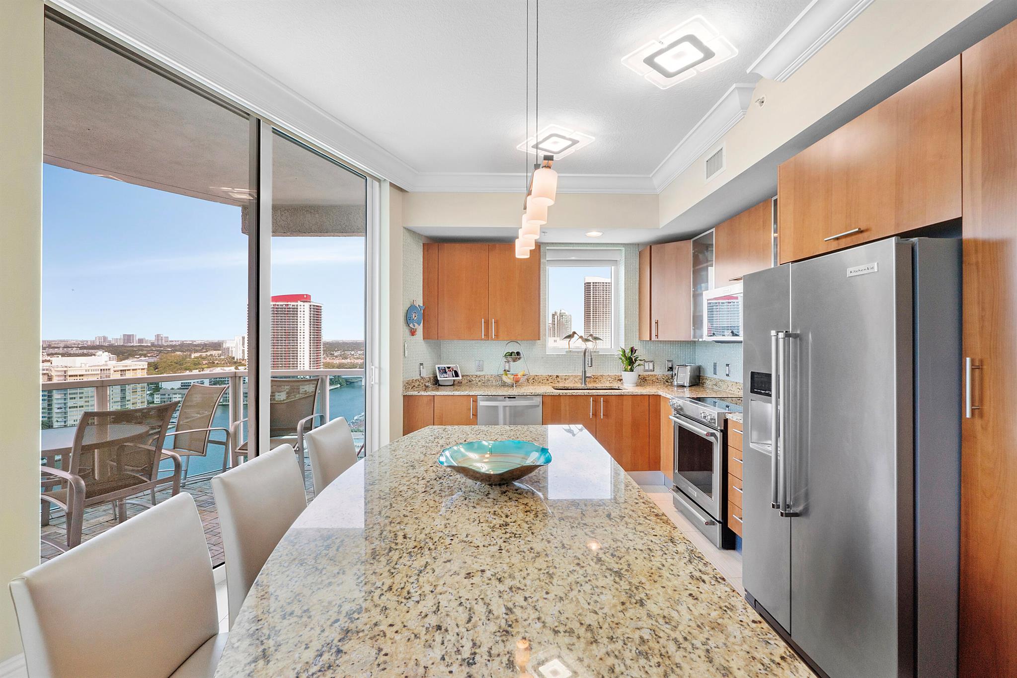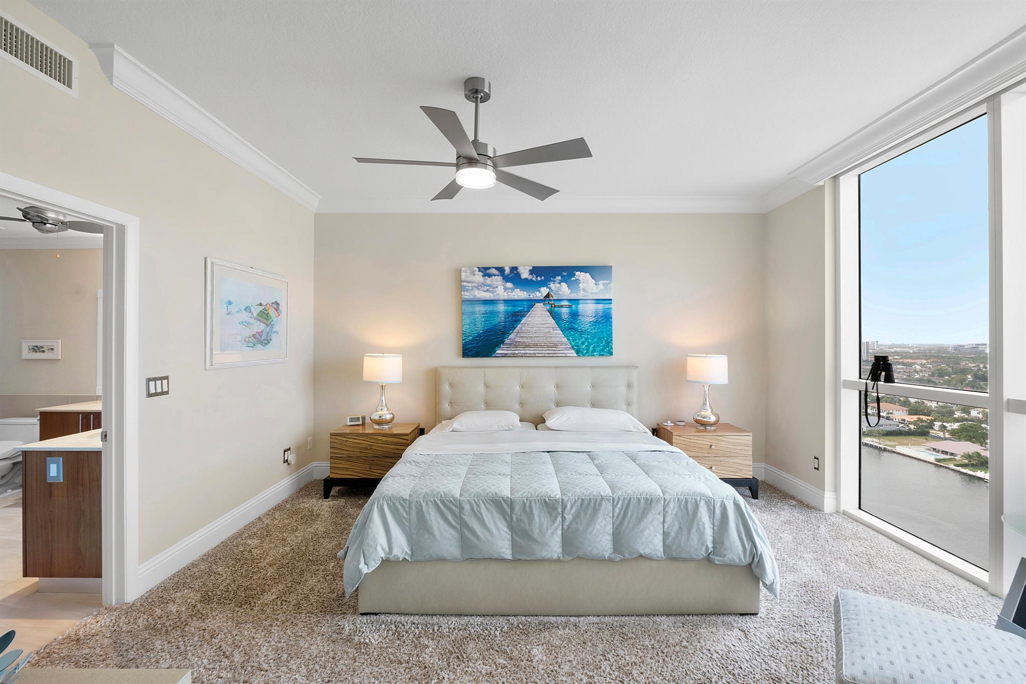 Fantastic find! Welcome to this magnificent sunlit 3 BR/2.5 Bath aerie high above the Intracoastal Waterway with views that go on 'forever'. This is a rare opportunity to own this 19th floor SW corner condo in the Ocean Marine Yacht Club.The unit has everything you want and is truly move-in ready. Both the primary and the 2nd bedroom have en-suite full, custom bathrooms. The 3rd bedroom would make a great office/den. There are new s/s appliances, Italian porcelain floors, gorgeous lighting fixtures that are all electrically controlled, an open island kitchen with another window over the sink and sliders to the tile-covered wrap-around terrace, custom closets galore, custom black-out shades, and more. There is also a separate large laundry room with a new washer and dryer.