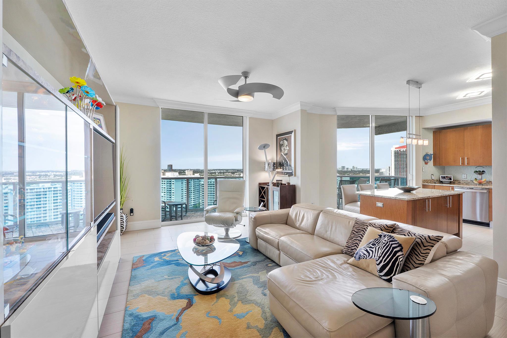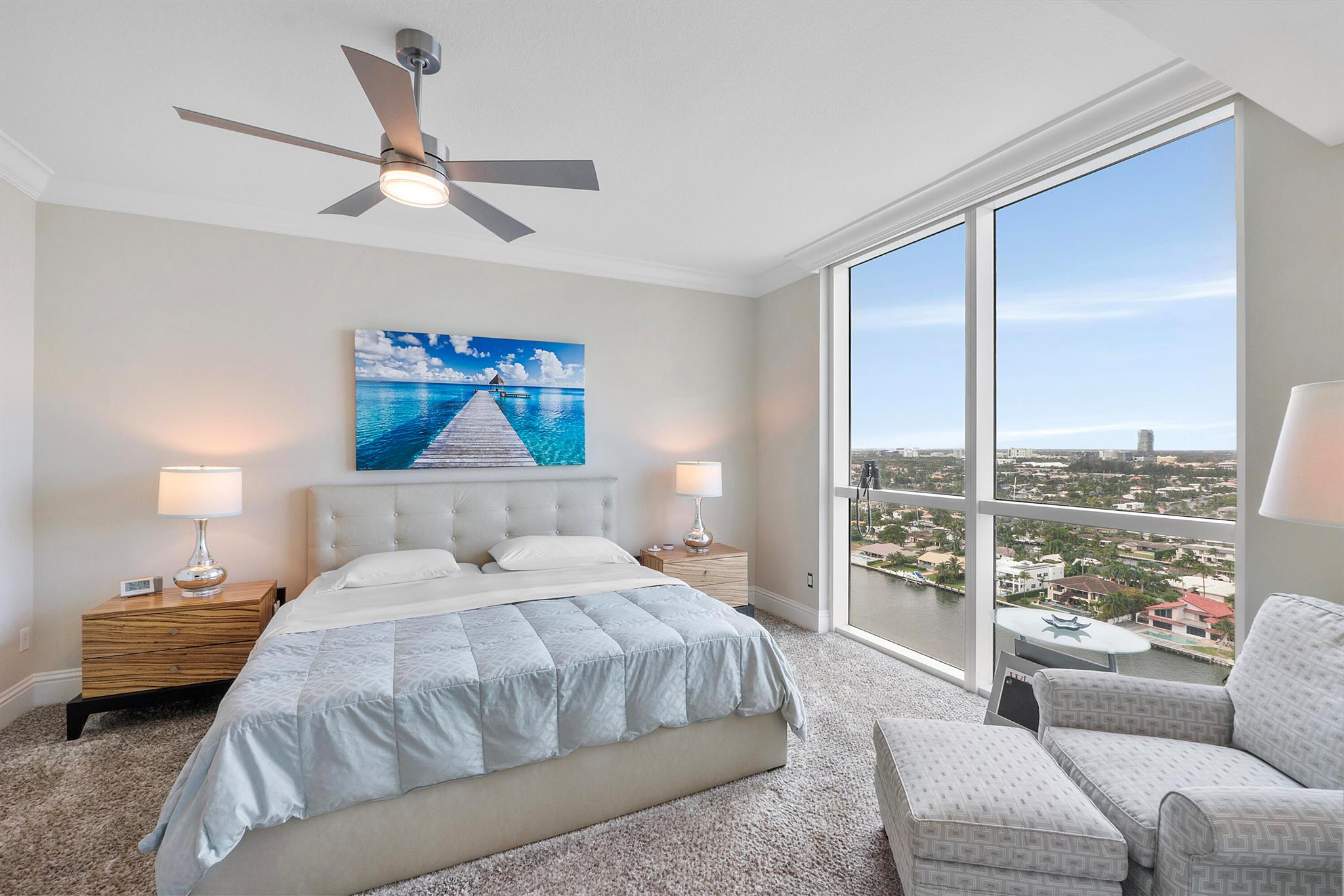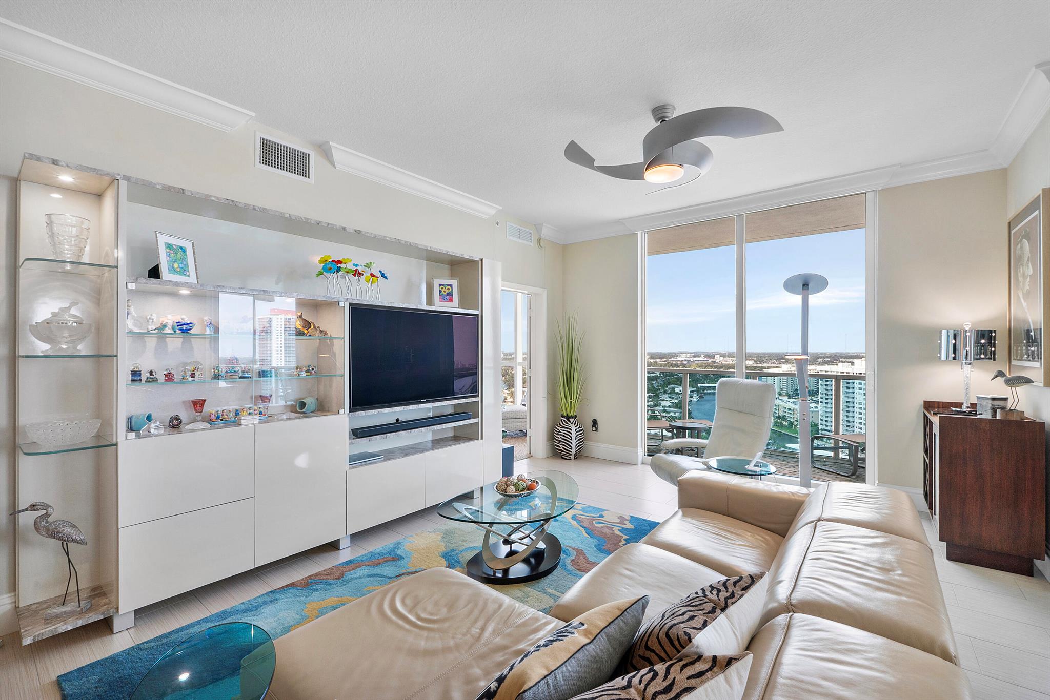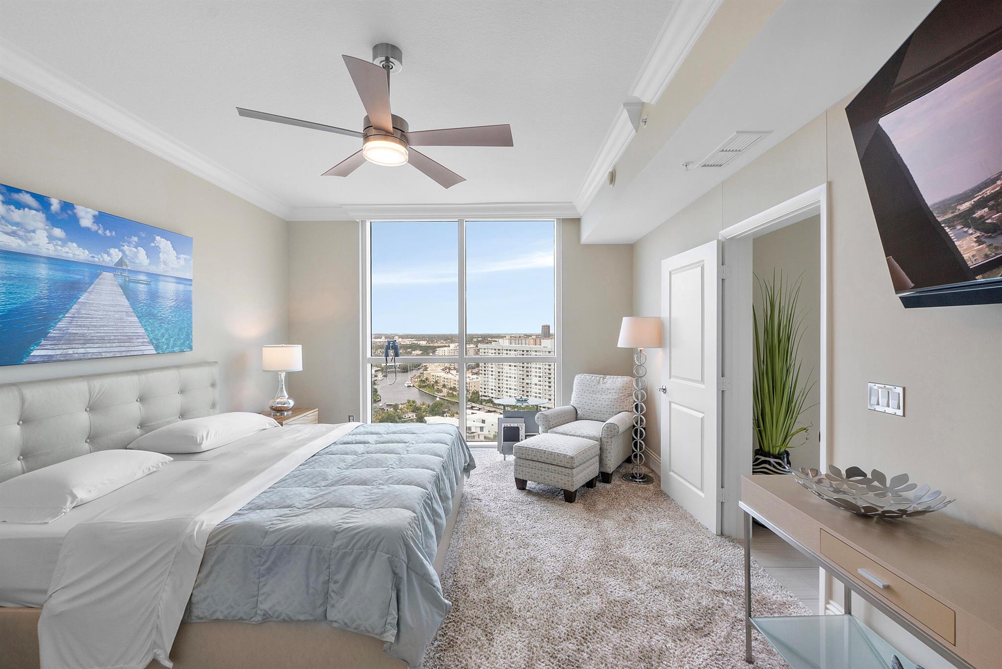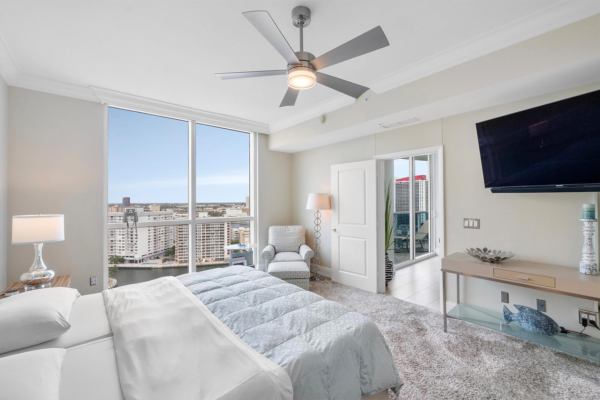 Fantastic find! Welcome to this magnificent sunlit 3 BR/2.5 Bath aerie high above the Intracoastal Waterway with views that go on 'forever'. This is a rare opportunity to own this 19th floor SW corner condo in the Ocean Marine Yacht Club.The unit has everything you want and is truly move-in ready. Both the primary and the 2nd bedroom have en-suite full, custom bathrooms. The 3rd bedroom would make a great office/den. There are new s/s appliances, Italian porcelain floors, gorgeous lighting fixtures that are all electrically controlled, an open island kitchen with another window over the sink and sliders to the tile-covered wrap-around terrace, custom closets galore, custom black-out shades, and more. There is also a separate large laundry room with a new washer and dryer.