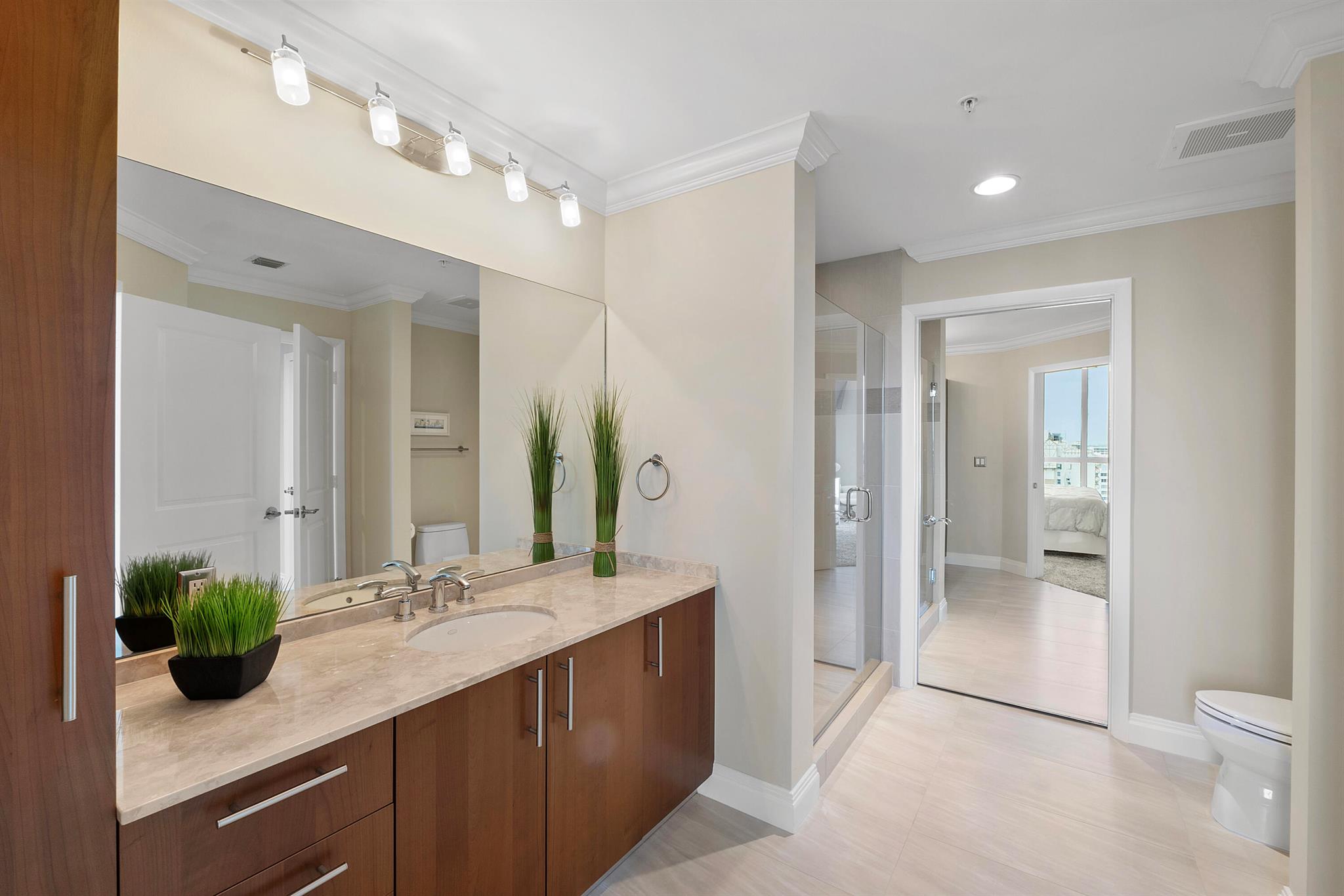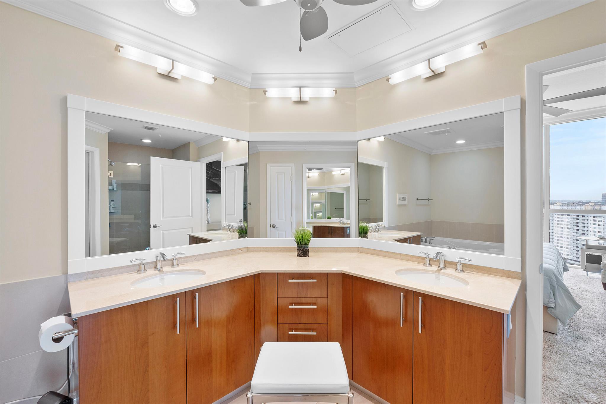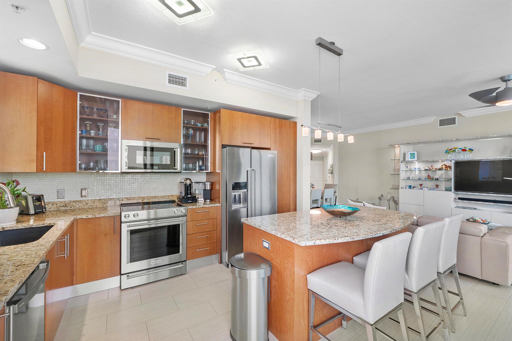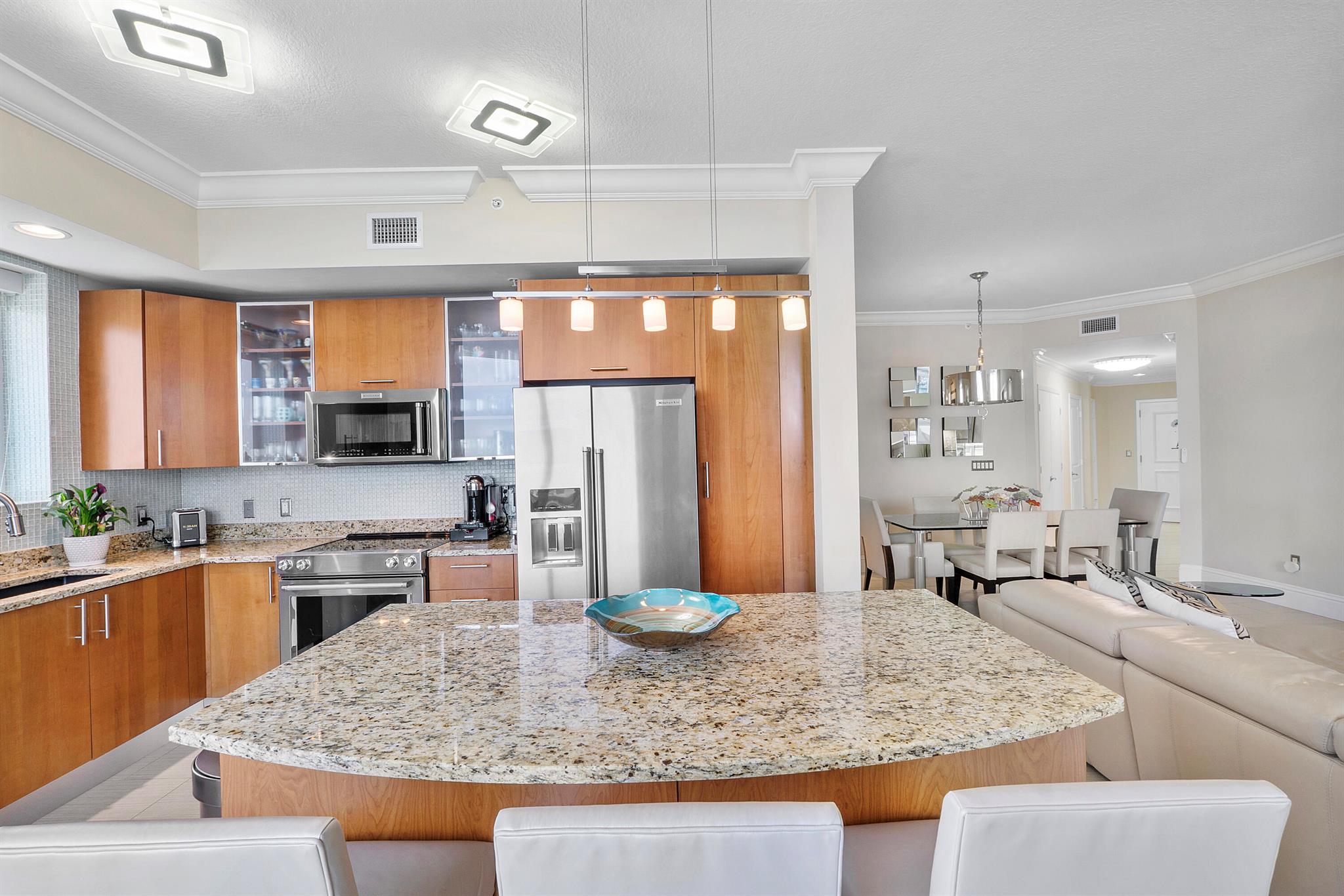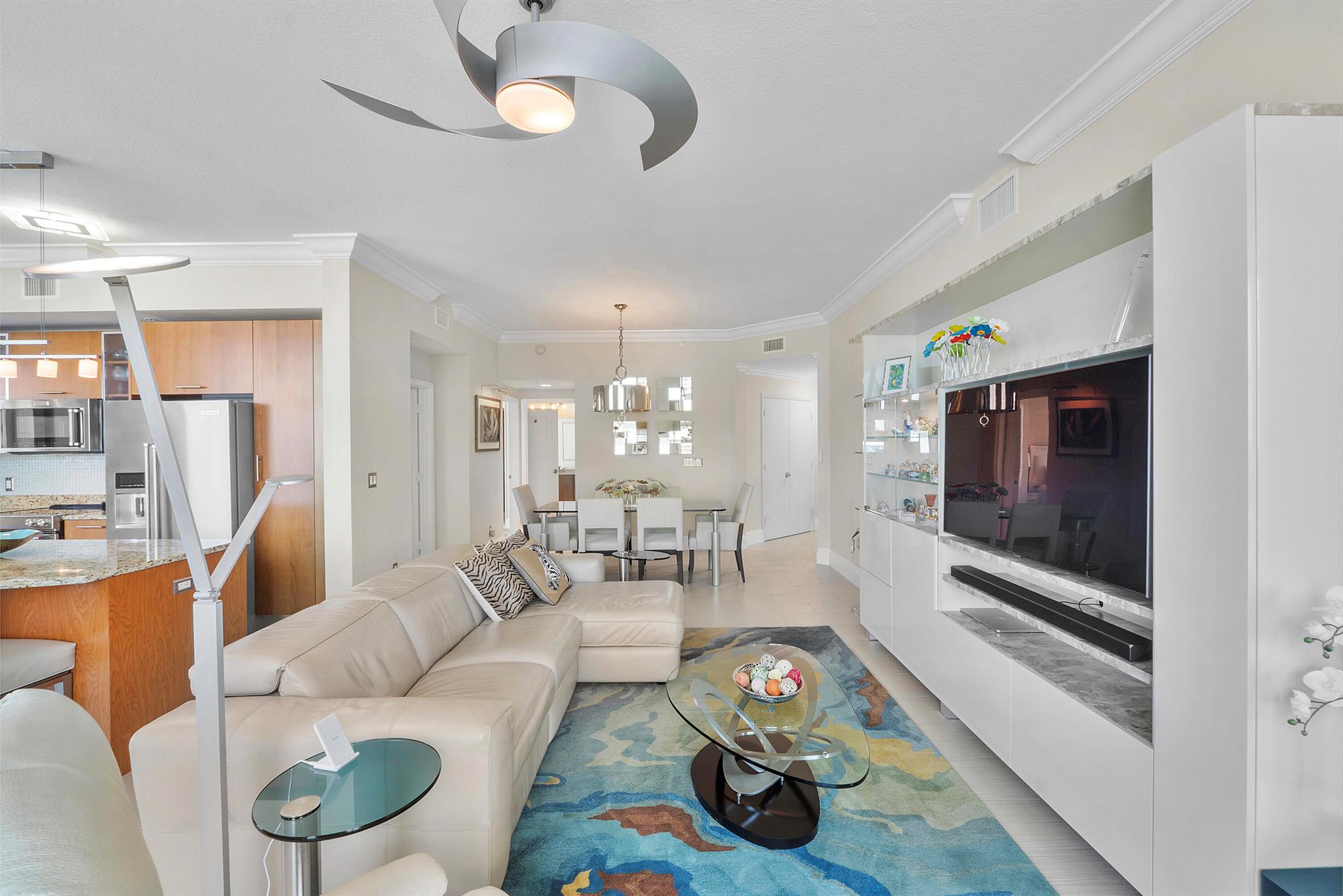 Fantastic find! Welcome to this magnificent sunlit 3 BR/2.5 Bath aerie high above the Intracoastal Waterway with views that go on 'forever'. This is a rare opportunity to own this 19th floor SW corner condo in the Ocean Marine Yacht Club.The unit has everything you want and is truly move-in ready. Both the primary and the 2nd bedroom have en-suite full, custom bathrooms. The 3rd bedroom would make a great office/den. There are new s/s appliances, Italian porcelain floors, gorgeous lighting fixtures that are all electrically controlled, an open island kitchen with another window over the sink and sliders to the tile-covered wrap-around terrace, custom closets galore, custom black-out shades, and more. There is also a separate large laundry room with a new washer and dryer.