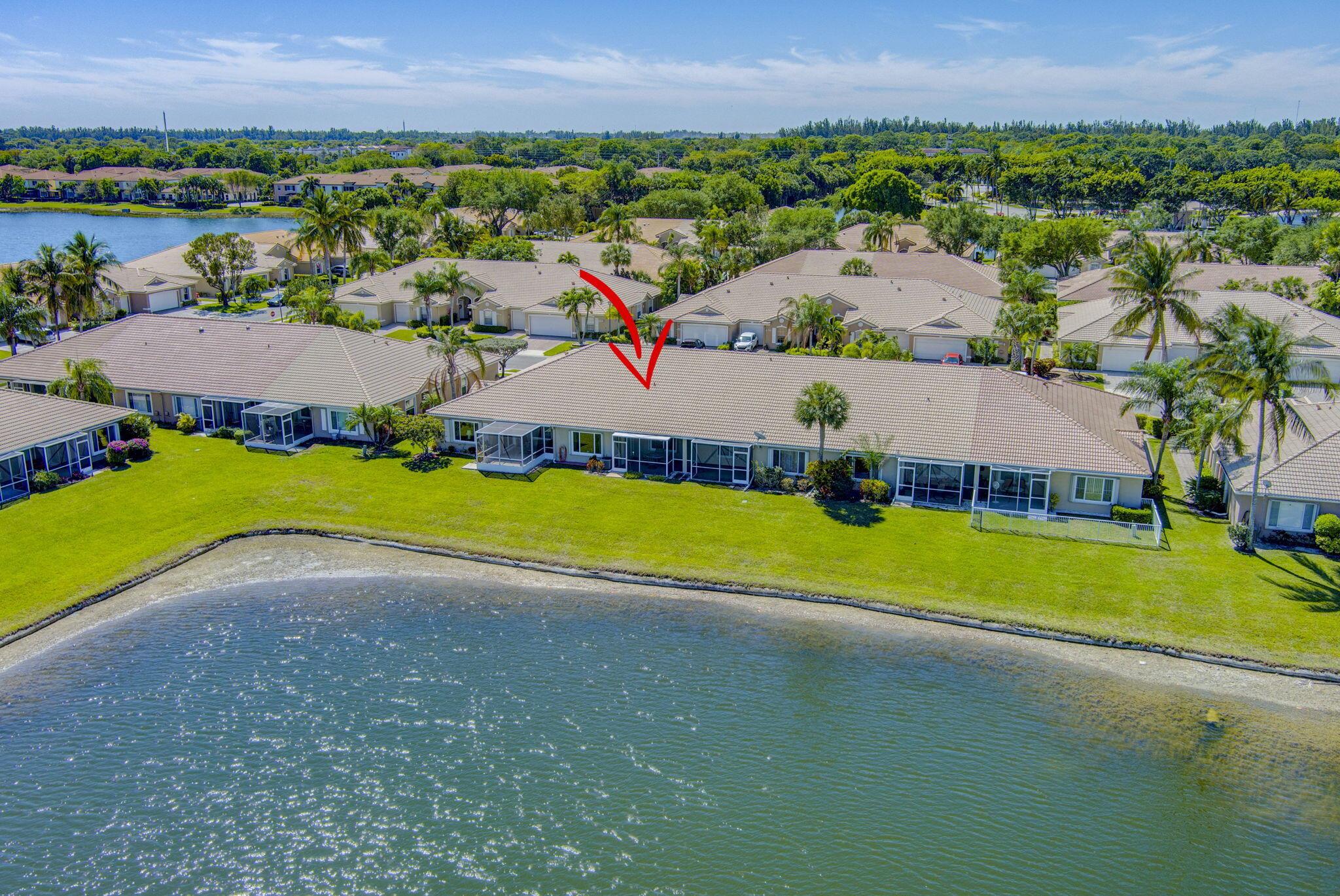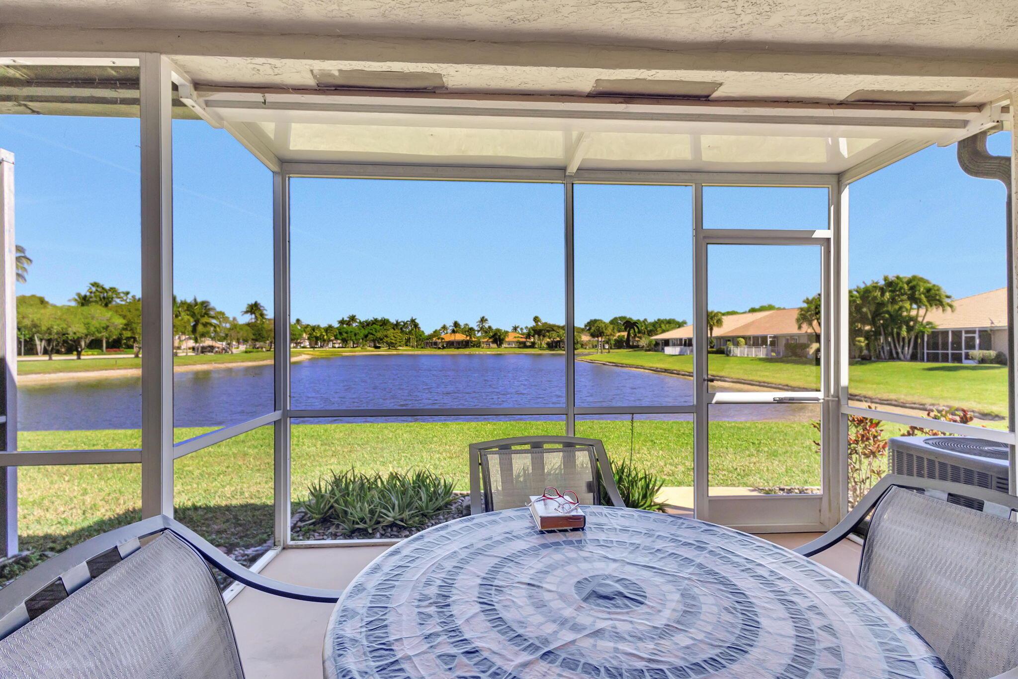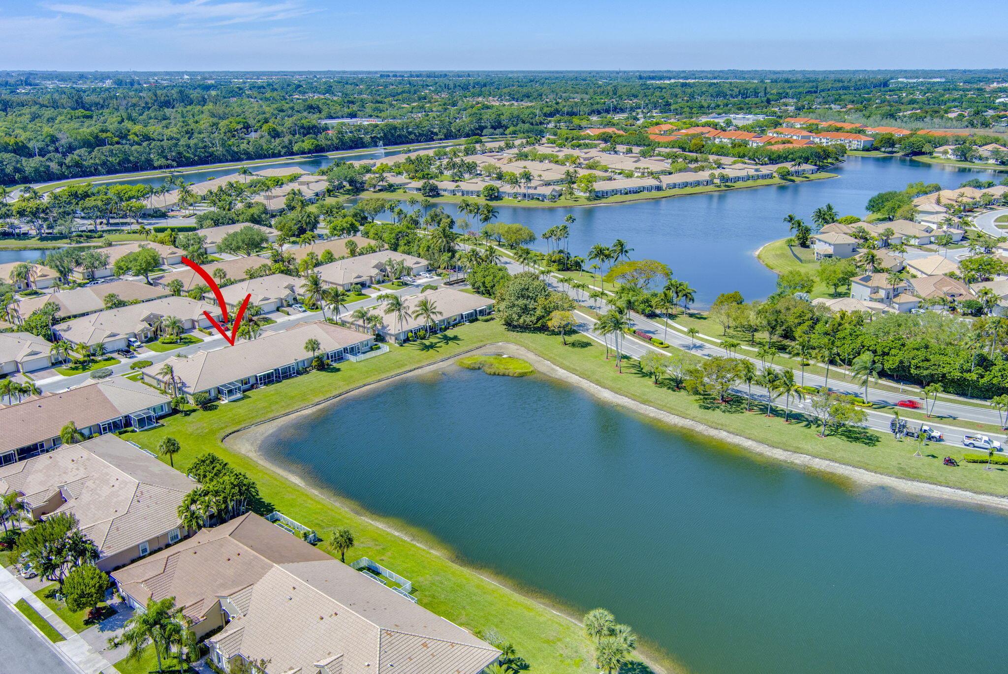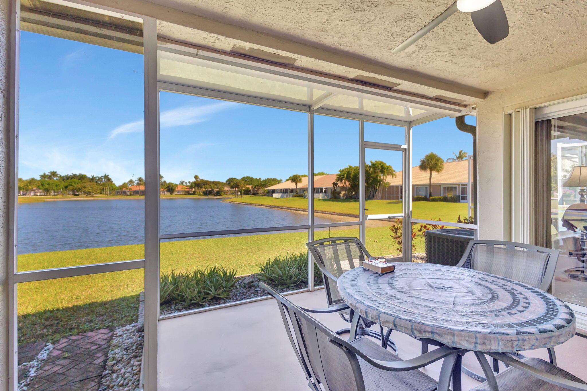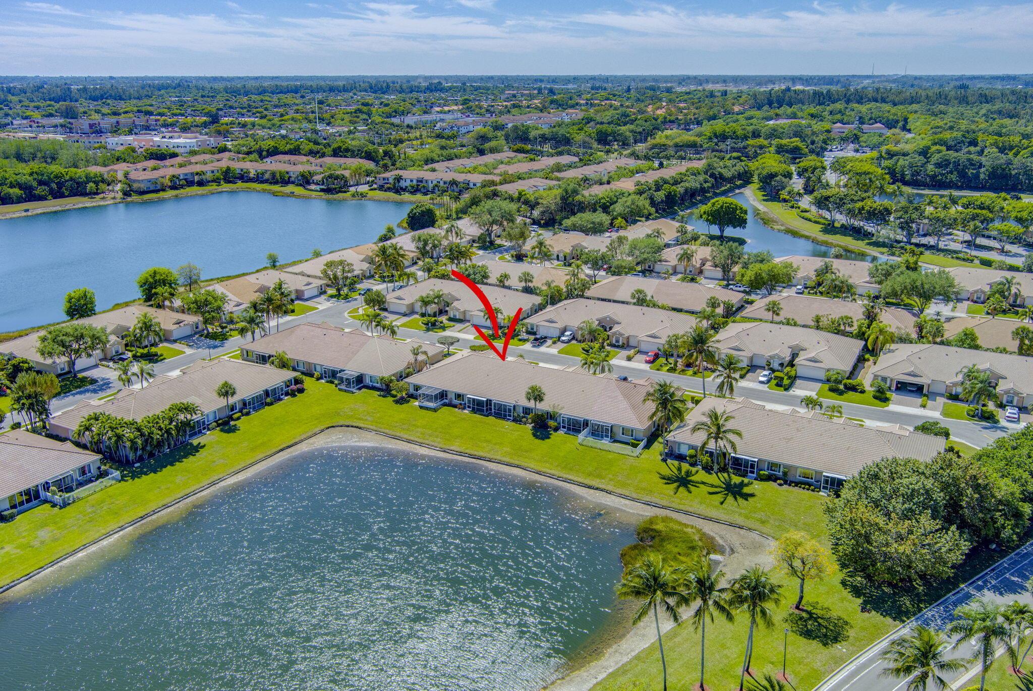 Pristine 2/2/1 villa with wide lake views. Seller is a Snowbird. Offered Furnished. Fully renovated bathrooms, and renovated Kitchen. New appliances. Newer A/C (one year). Rare double driveway in one car garage villas allows 2nd car. Hurricane Impact Windows (except patio slider has accordian storm shutter) Tile floors except carpet in bedrooms. Large covered and screened patio. Premium window treatments. HOA includes monitored security system, 24-7 Staffed gate, CATV, WiFi, Broadband, landscaping,front and back irrigation (lake, not meter), Roof cleaning, exterior painting, resort clubhouse with heated pool and well equipped Fitness Center. Private access road to nearby Publix Shpping Plaza. Easy access to Airporrt, Turnpike, Dwtn WPB, Wellington, mall, cinema, restaurant