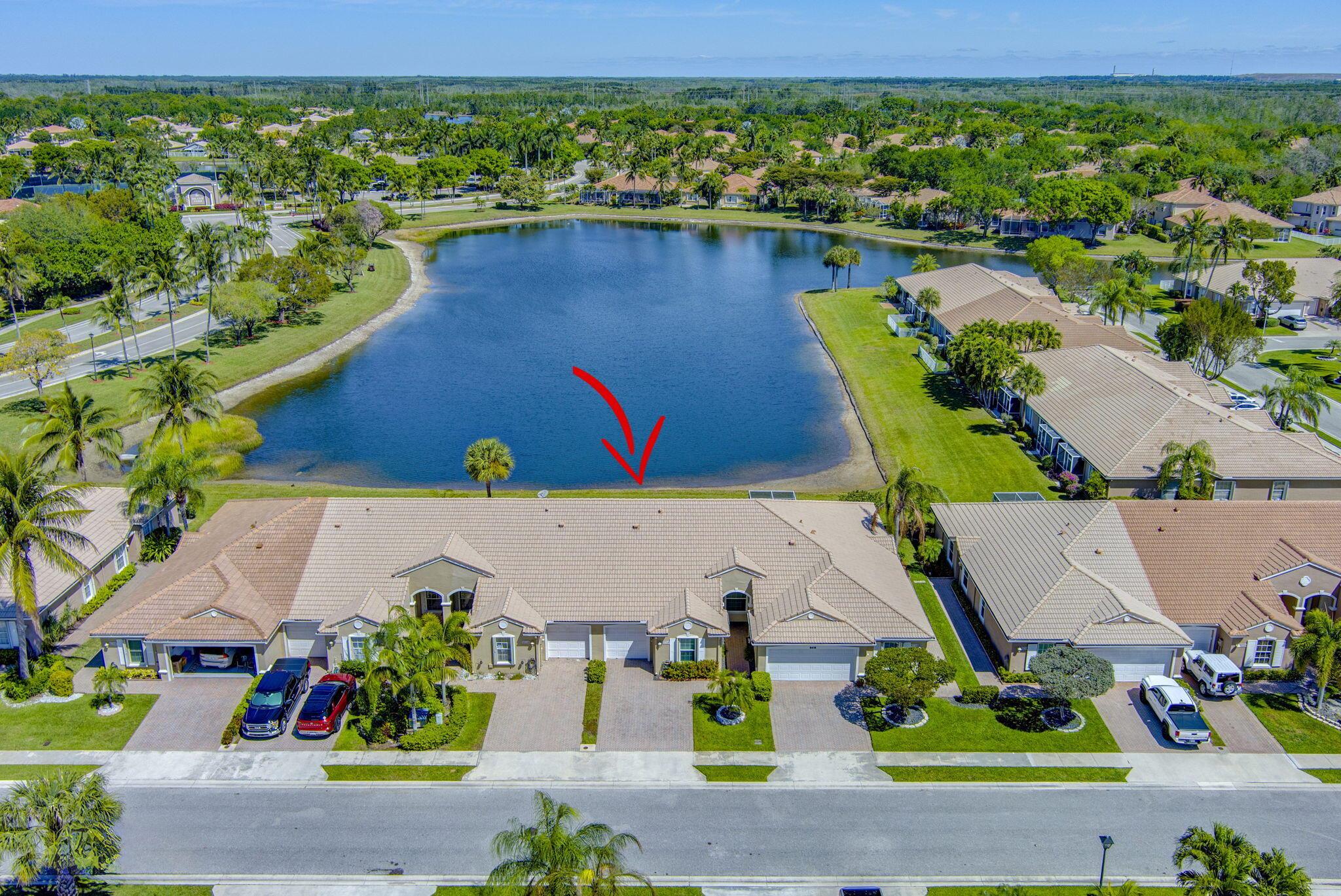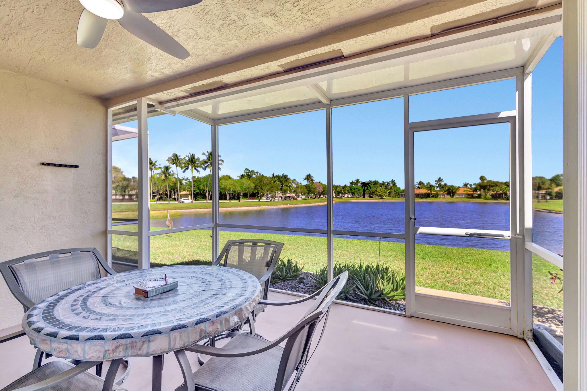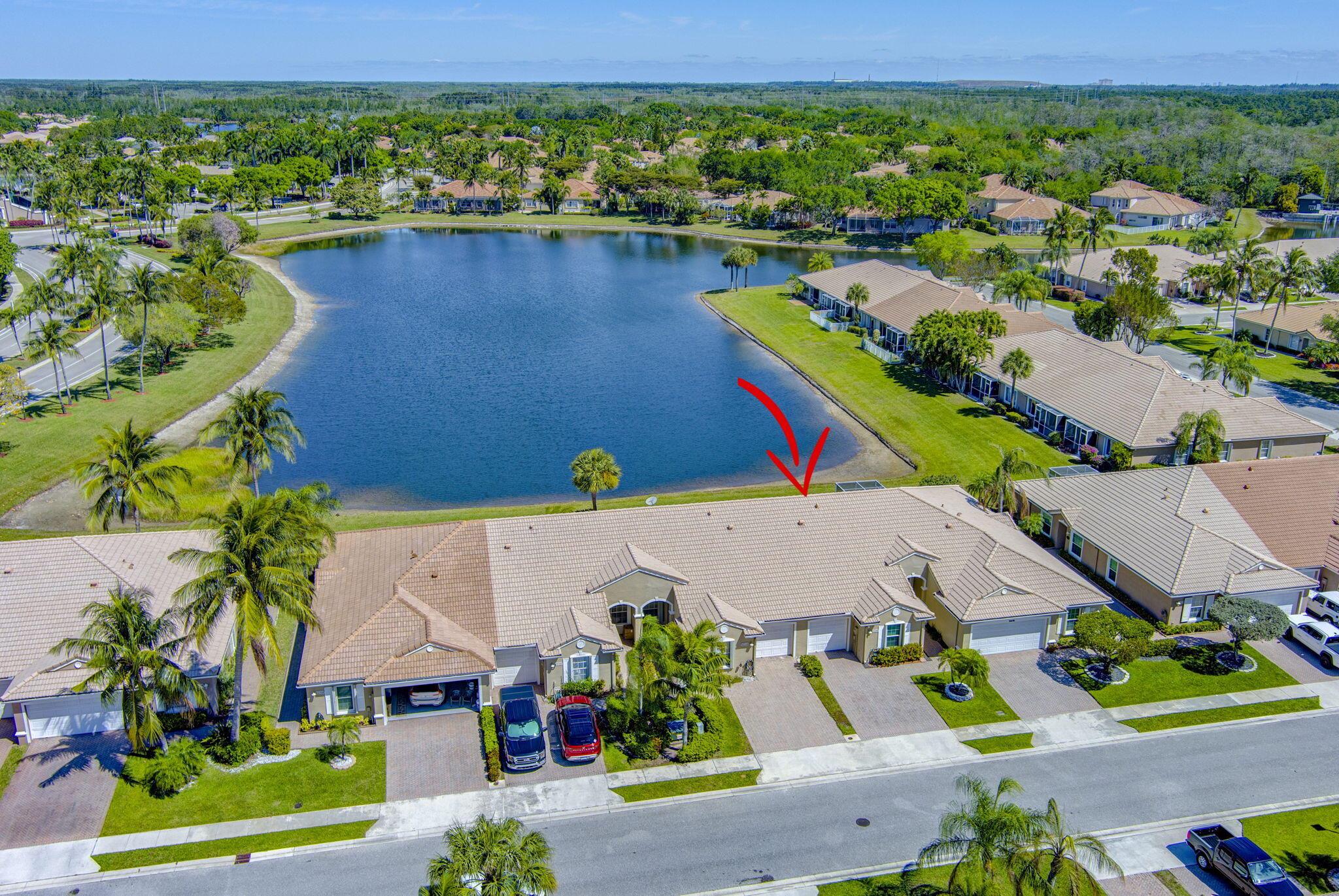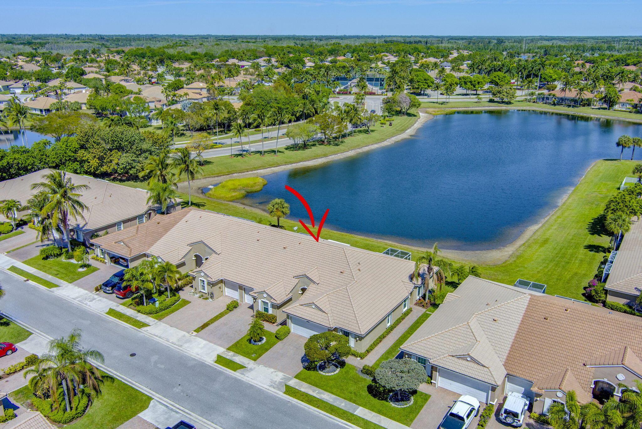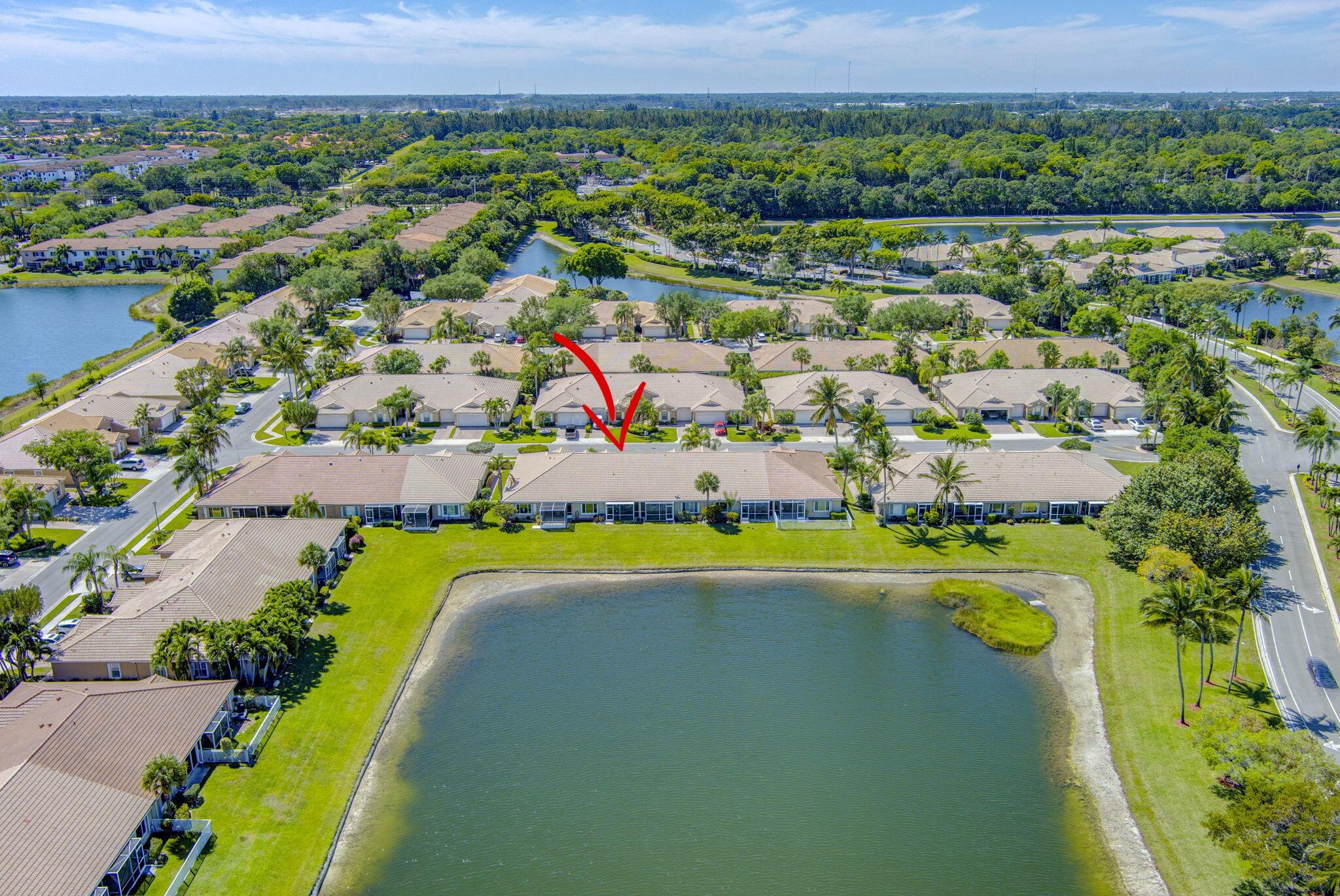Pristine 2/2/1 villa with wide lake views. Seller is a Snowbird. Offered Furnished. Fully renovated bathrooms, and renovated Kitchen. New appliances. Newer A/C (one year). Rare double driveway in one car garage villas allows 2nd car. Hurricane Impact Windows (except patio slider has accordian storm shutter) Tile floors except carpet in bedrooms. Large covered and screened patio. Premium window treatments. HOA includes monitored security system, 24-7 Staffed gate, CATV, WiFi, Broadband, landscaping,front and back irrigation (lake, not meter), Roof cleaning, exterior painting, resort clubhouse with heated pool and well equipped Fitness Center. Private access road to nearby Publix Shpping Plaza. Easy access to Airporrt, Turnpike, Dwtn WPB, Wellington, mall, cinema, restaurant