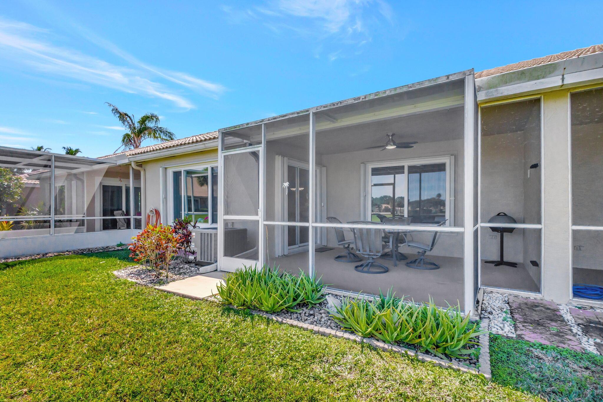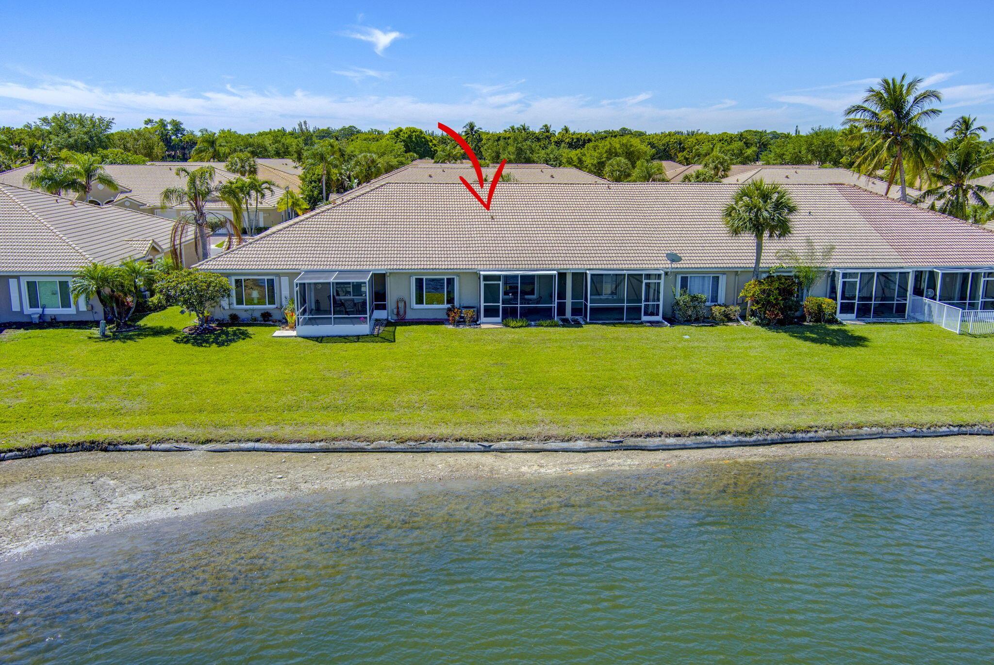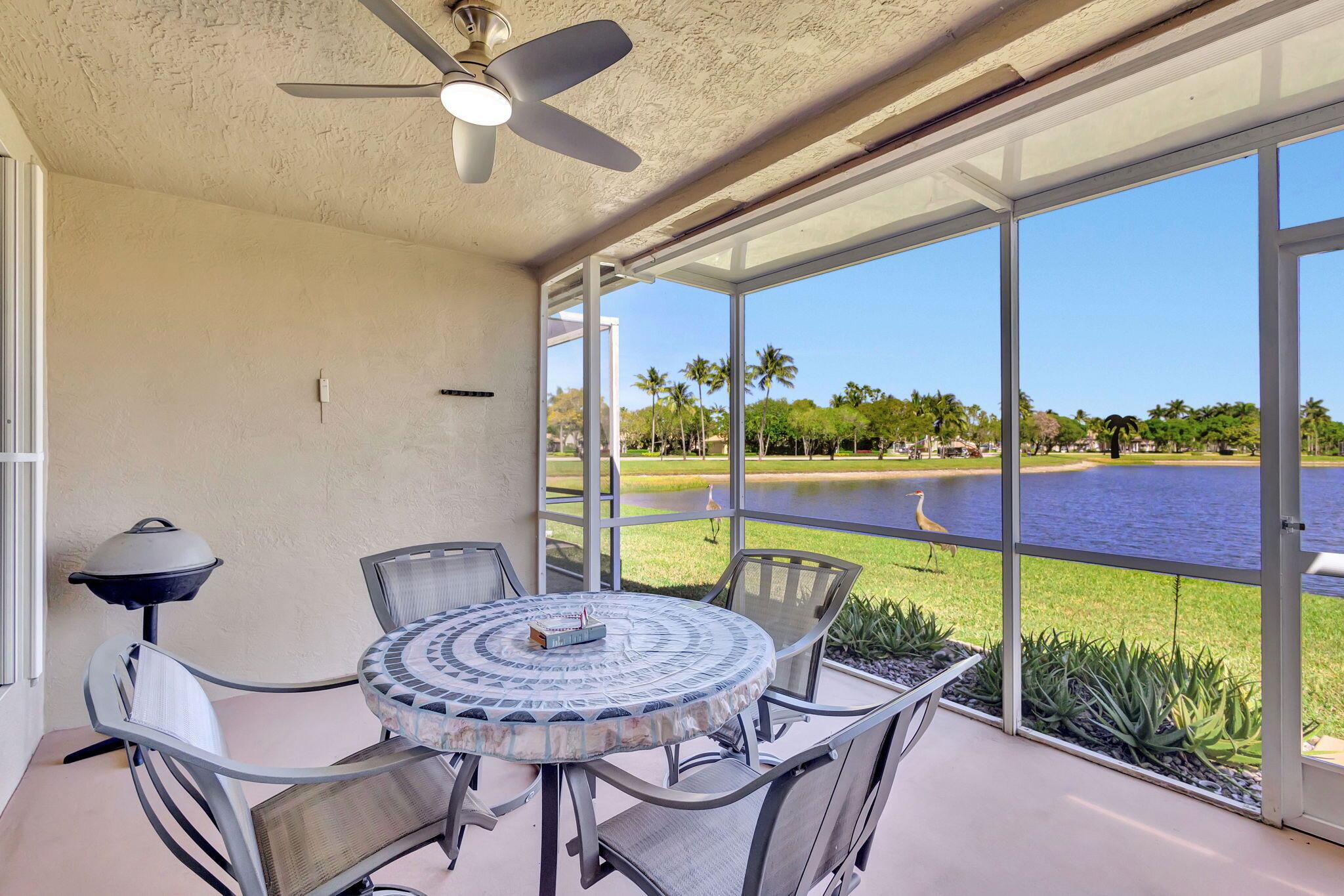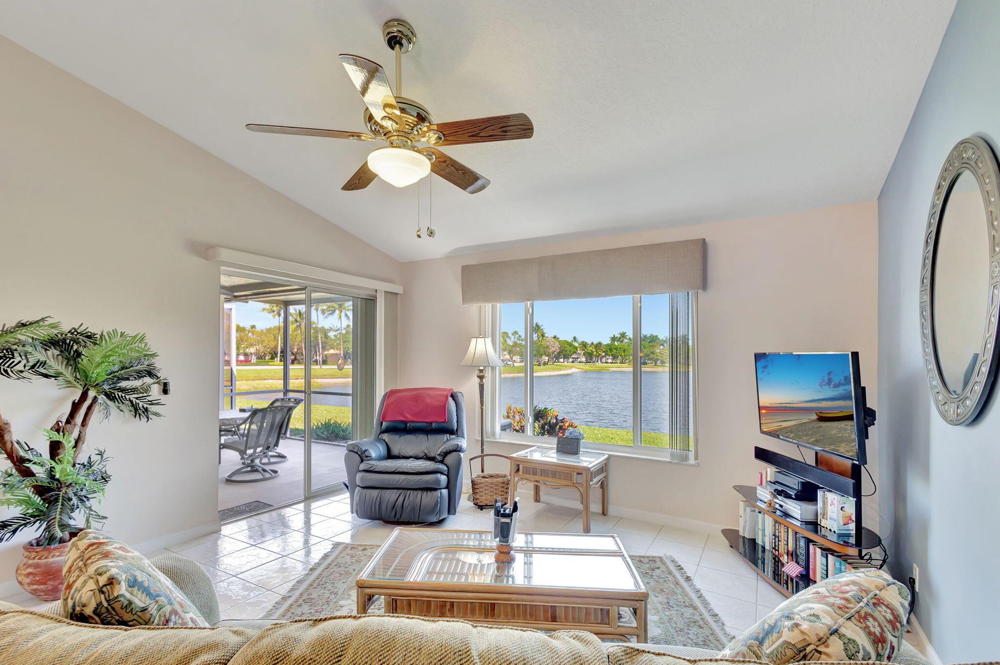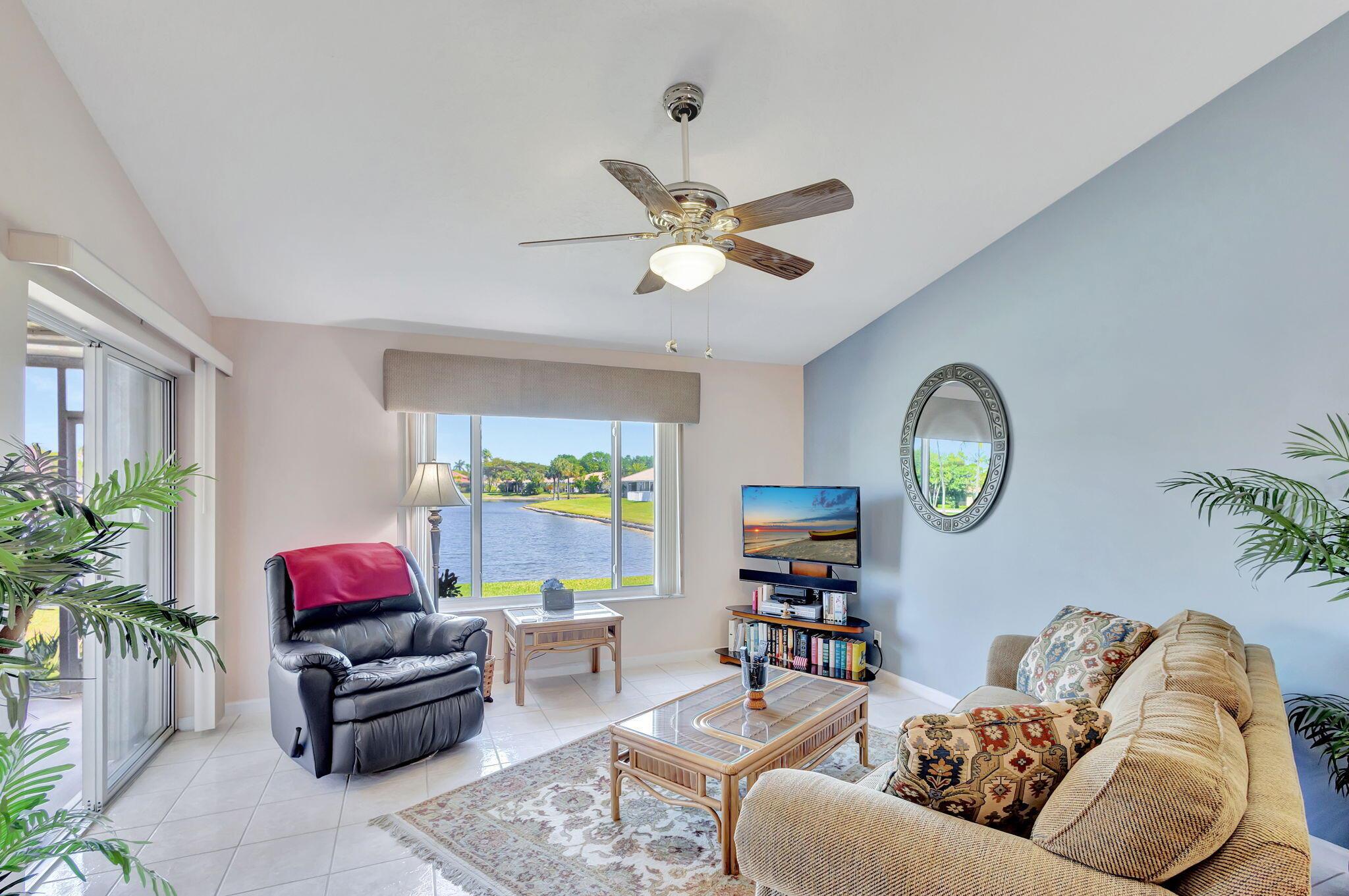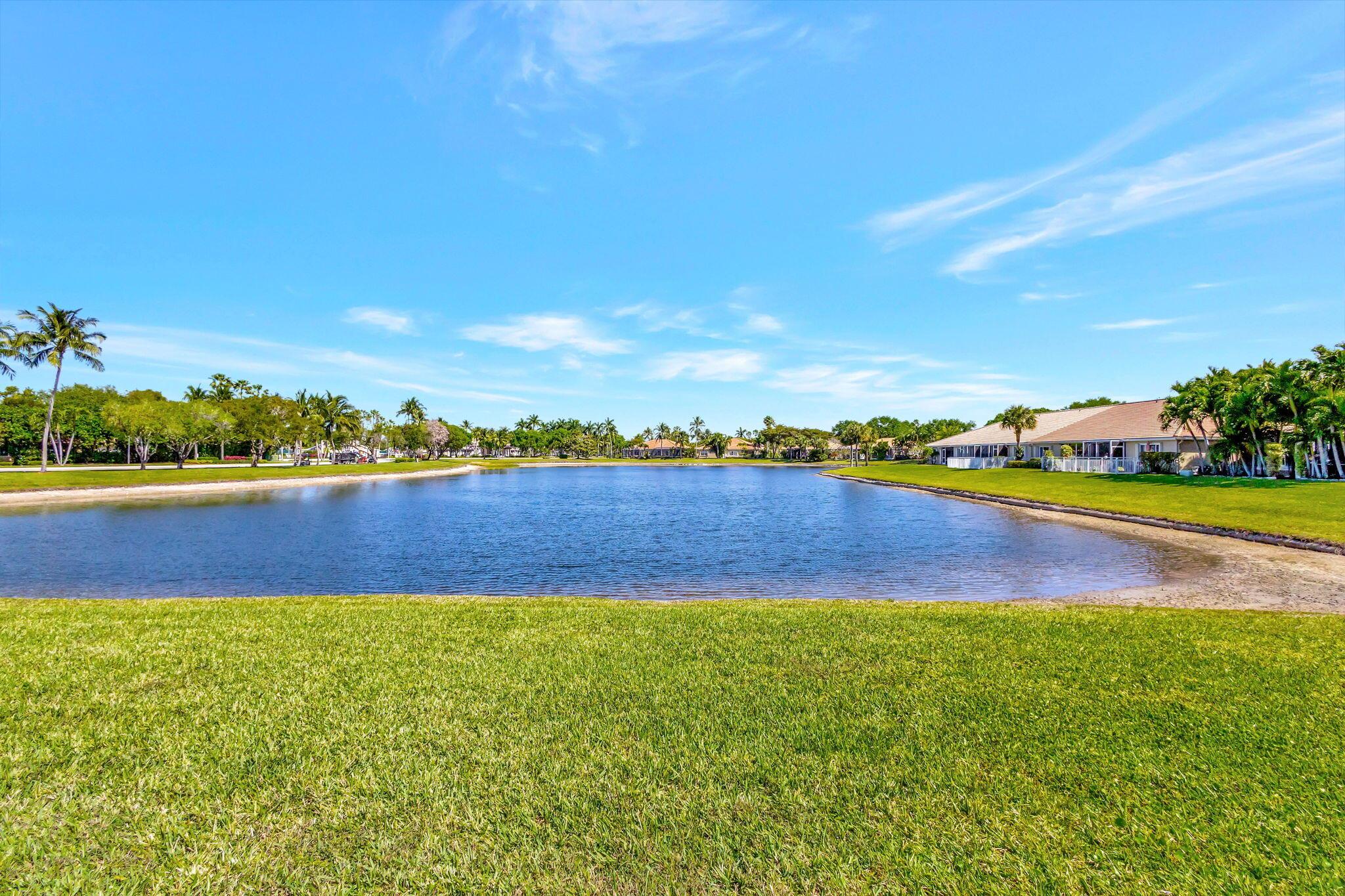 Pristine 2/2/1 villa with wide lake views. Seller is a Snowbird. Offered Furnished. Fully renovated bathrooms, and renovated Kitchen. New appliances. Newer A/C (one year). Rare double driveway in one car garage villas allows 2nd car. Hurricane Impact Windows (except patio slider has accordian storm shutter) Tile floors except carpet in bedrooms. Large covered and screened patio. Premium window treatments. HOA includes monitored security system, 24-7 Staffed gate, CATV, WiFi, Broadband, landscaping,front and back irrigation (lake, not meter), Roof cleaning, exterior painting, resort clubhouse with heated pool and well equipped Fitness Center. Private access road to nearby Publix Shpping Plaza. Easy access to Airporrt, Turnpike, Dwtn WPB, Wellington, mall, cinema, restaurant