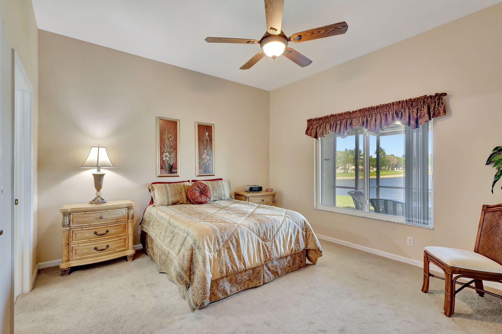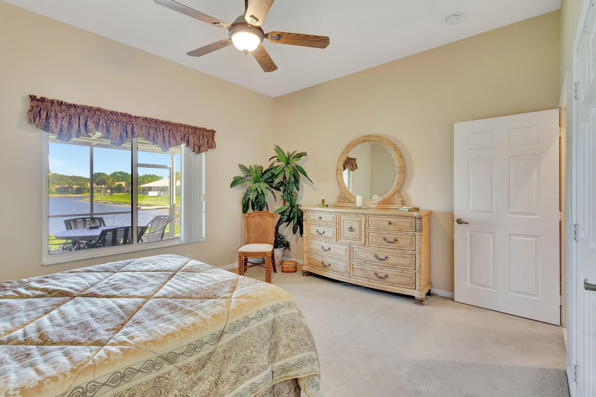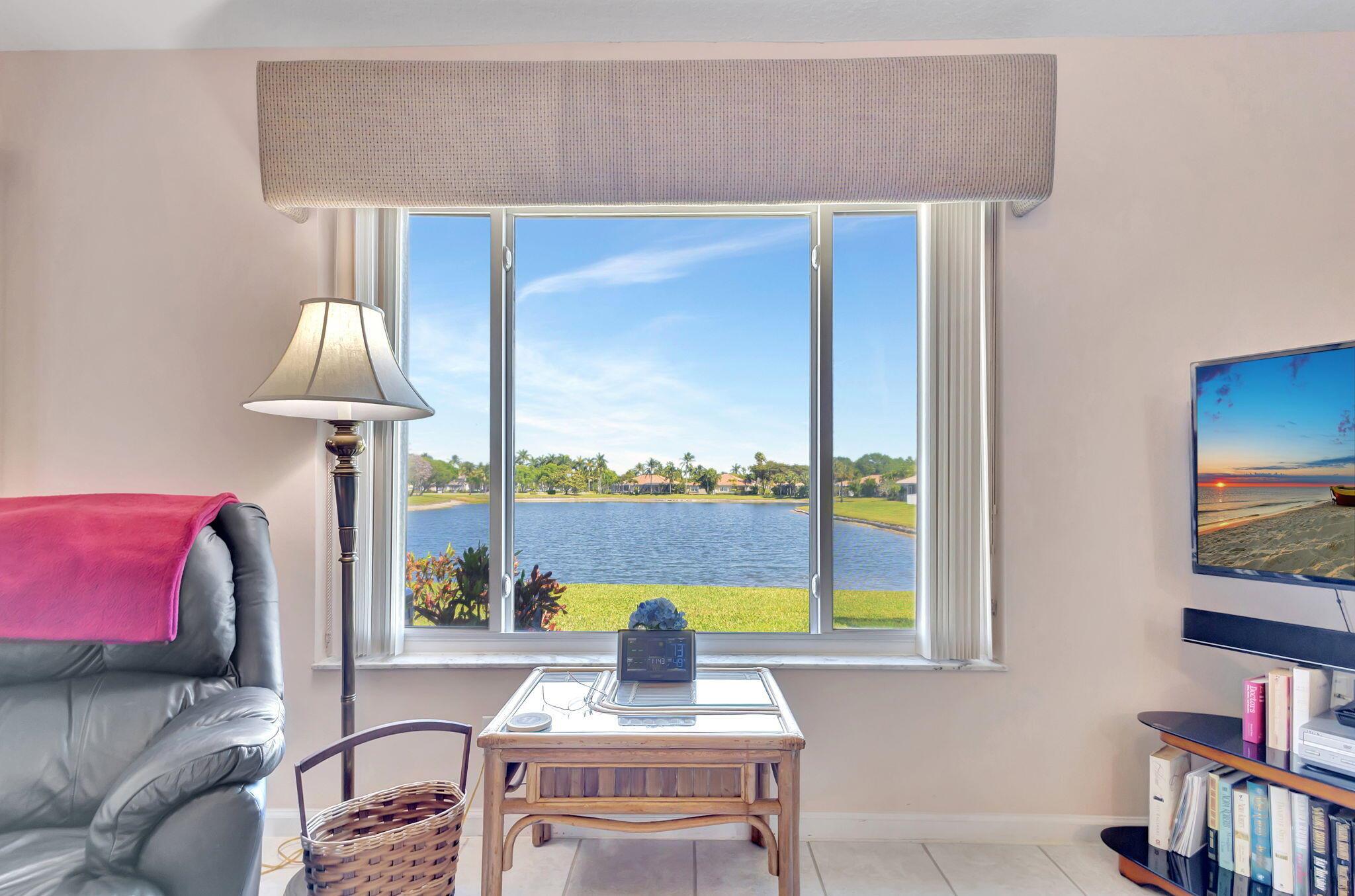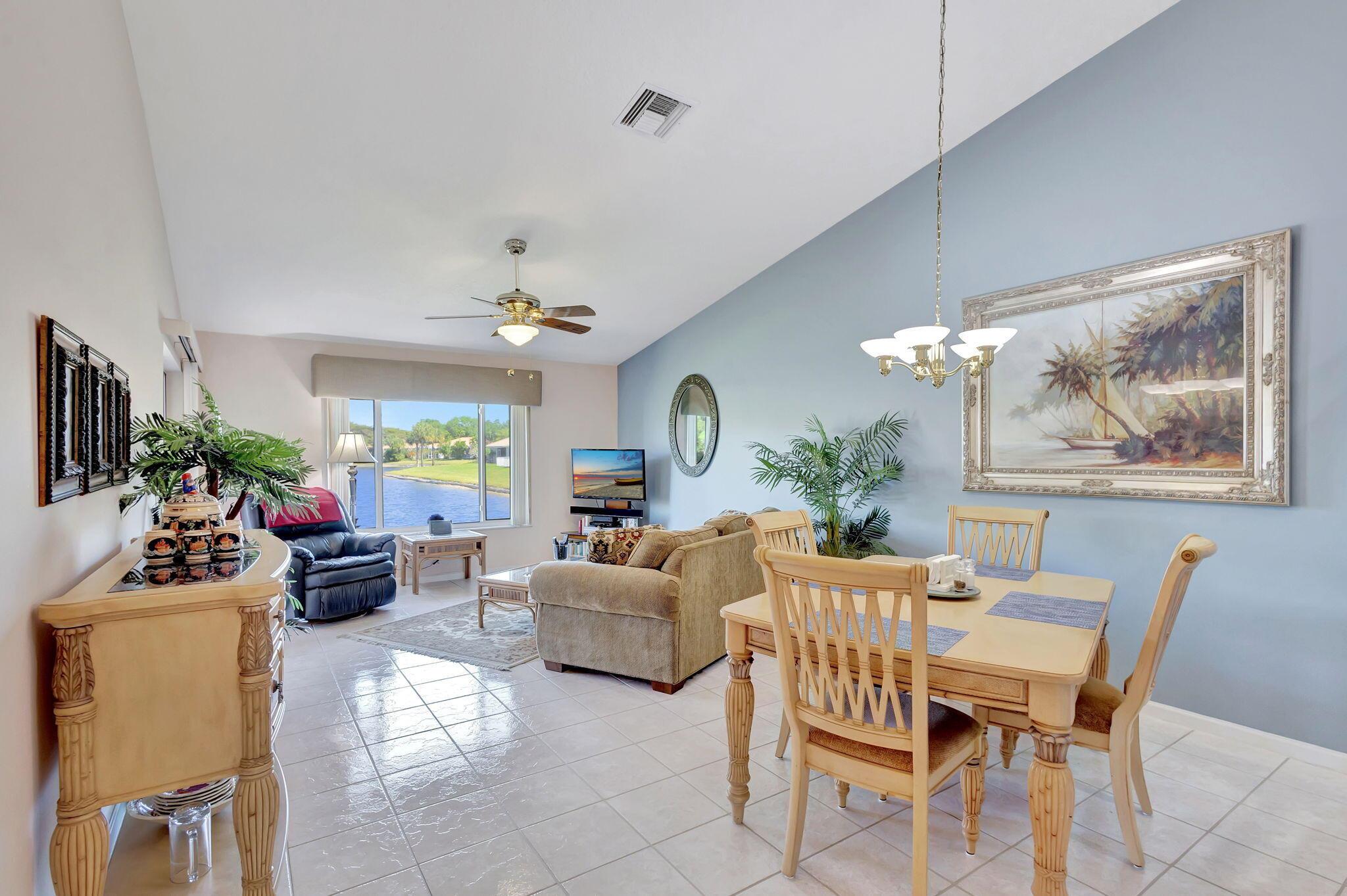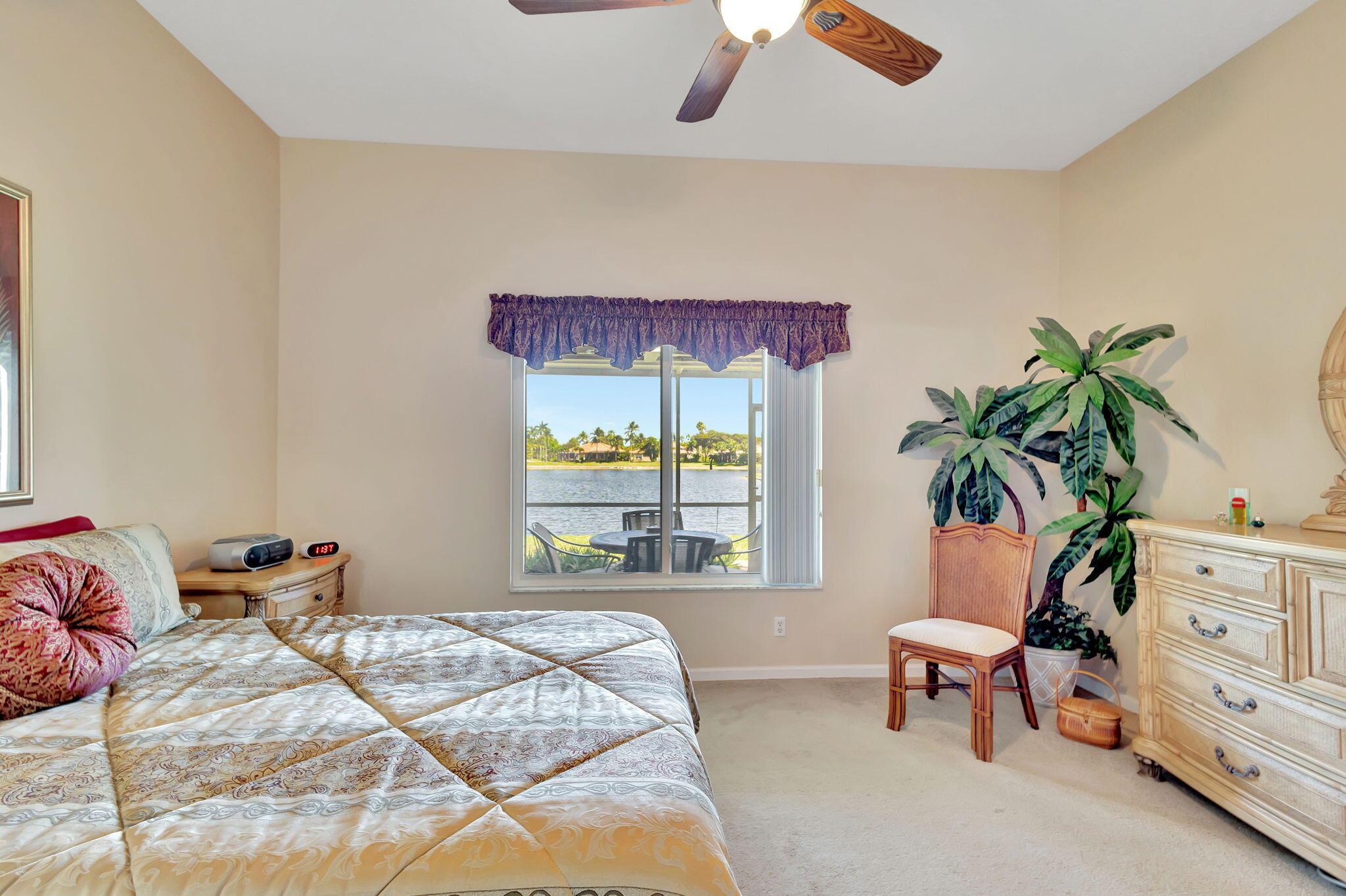 Pristine 2/2/1 villa with wide lake views. Seller is a Snowbird. Offered Furnished. Fully renovated bathrooms, and renovated Kitchen. New appliances. Newer A/C (one year). Rare double driveway in one car garage villas allows 2nd car. Hurricane Impact Windows (except patio slider has accordian storm shutter) Tile floors except carpet in bedrooms. Large covered and screened patio. Premium window treatments. HOA includes monitored security system, 24-7 Staffed gate, CATV, WiFi, Broadband, landscaping,front and back irrigation (lake, not meter), Roof cleaning, exterior painting, resort clubhouse with heated pool and well equipped Fitness Center. Private access road to nearby Publix Shpping Plaza. Easy access to Airporrt, Turnpike, Dwtn WPB, Wellington, mall, cinema, restaurant
