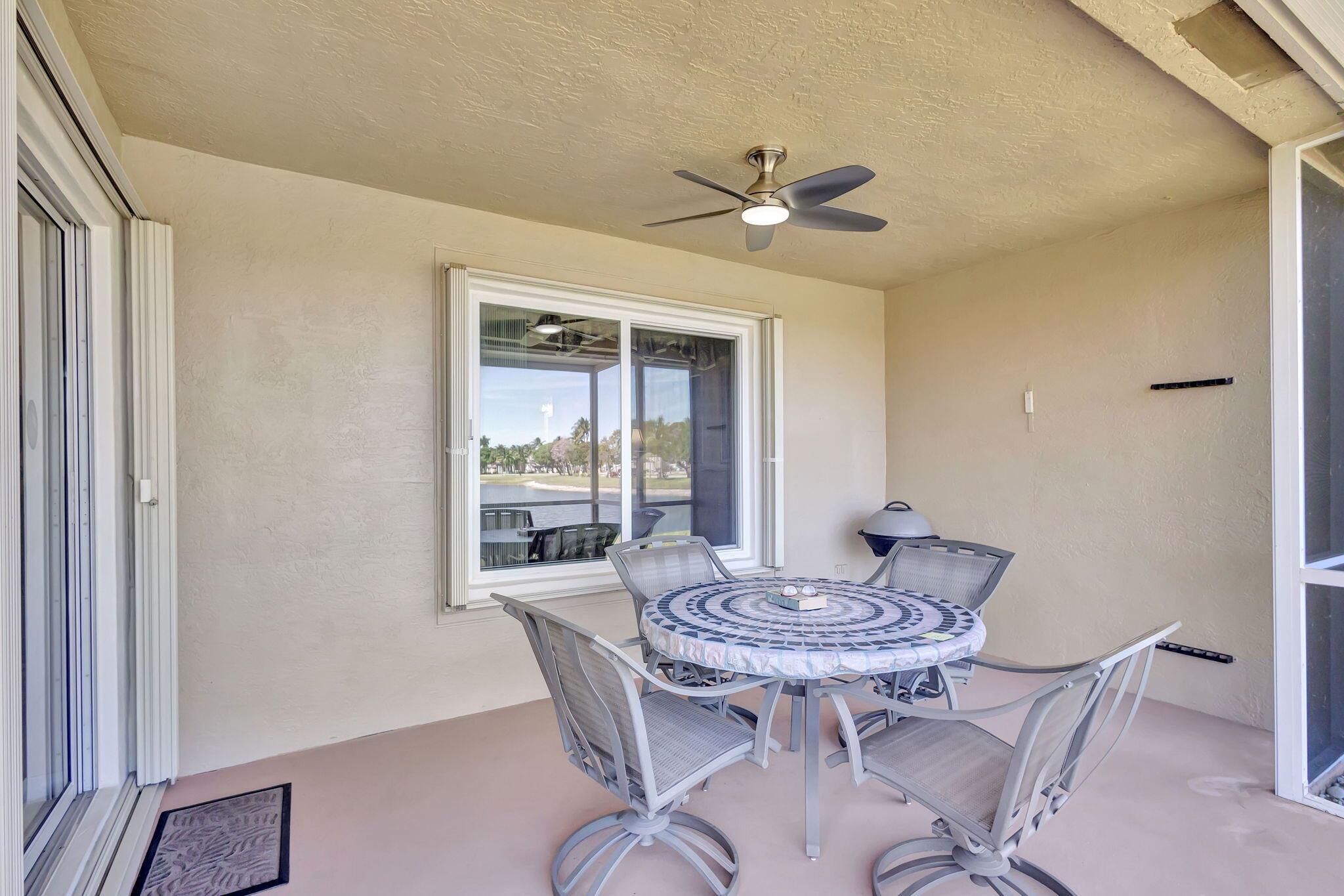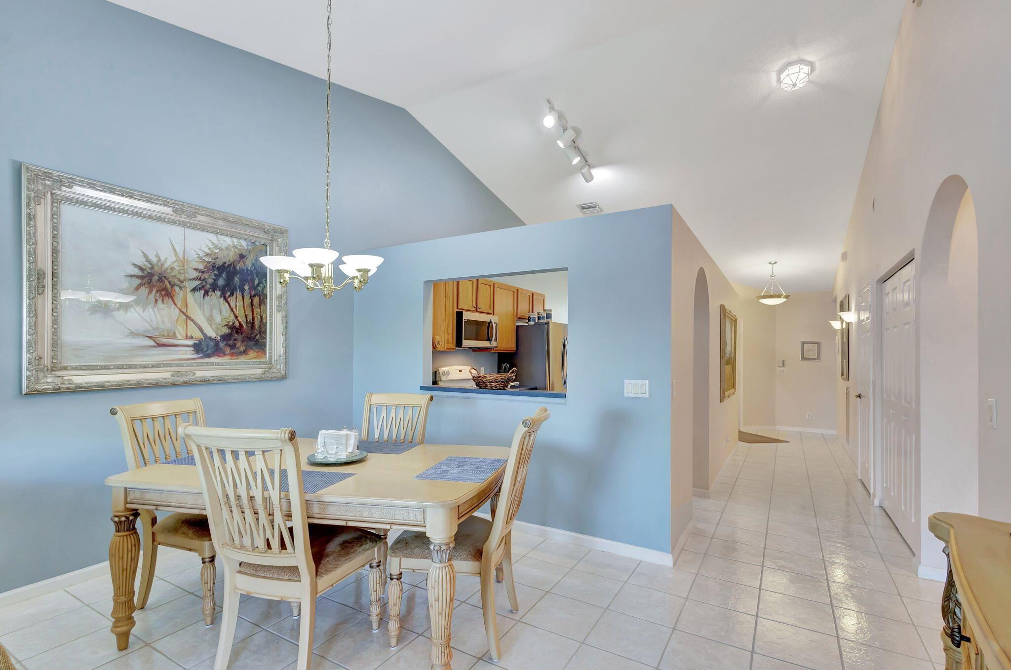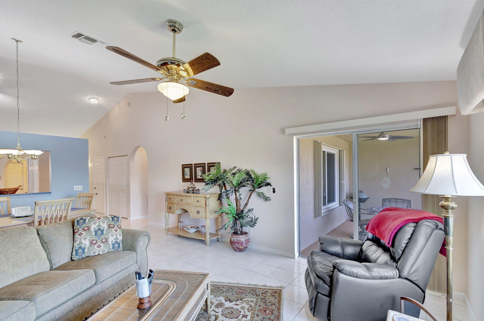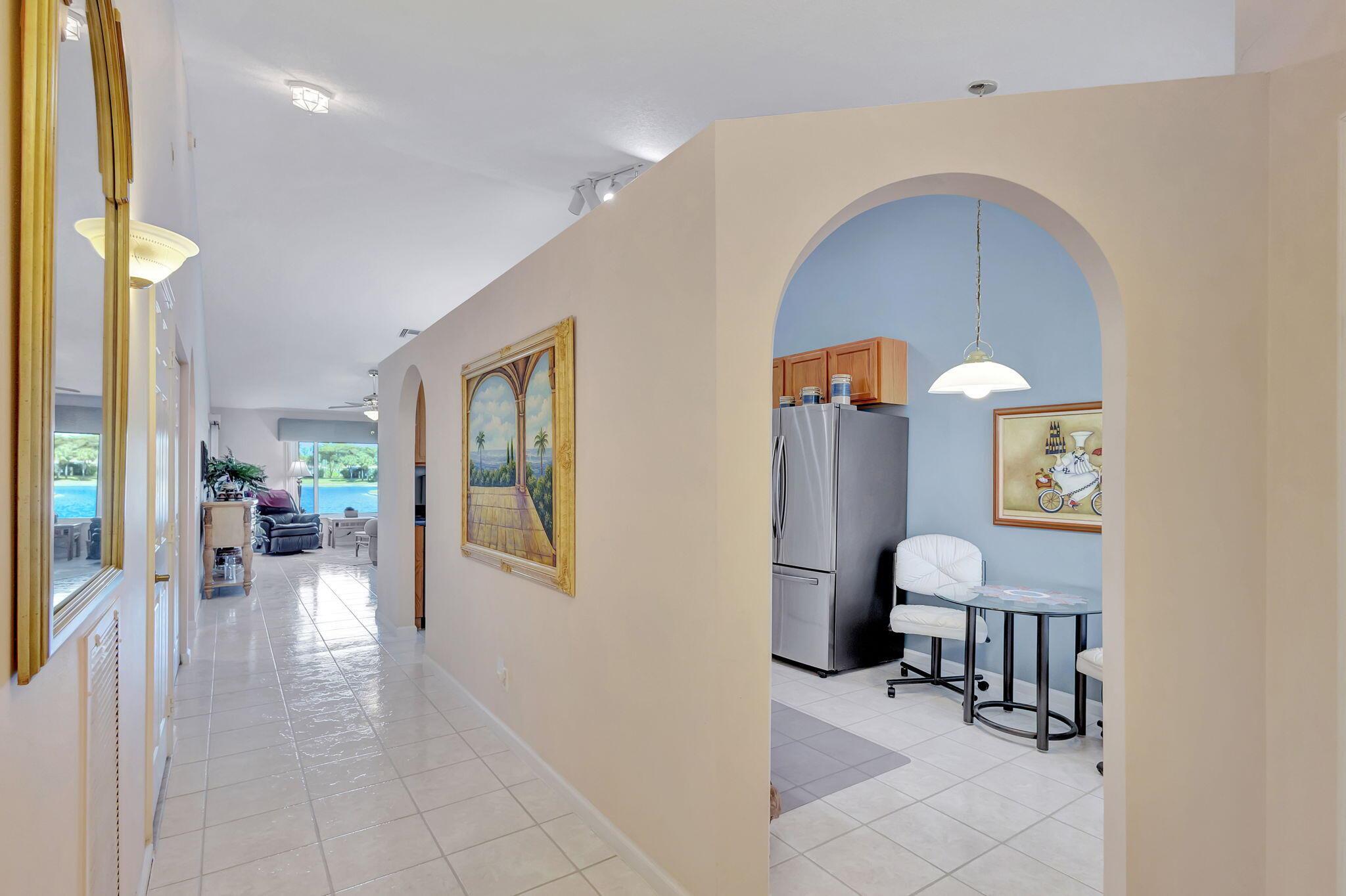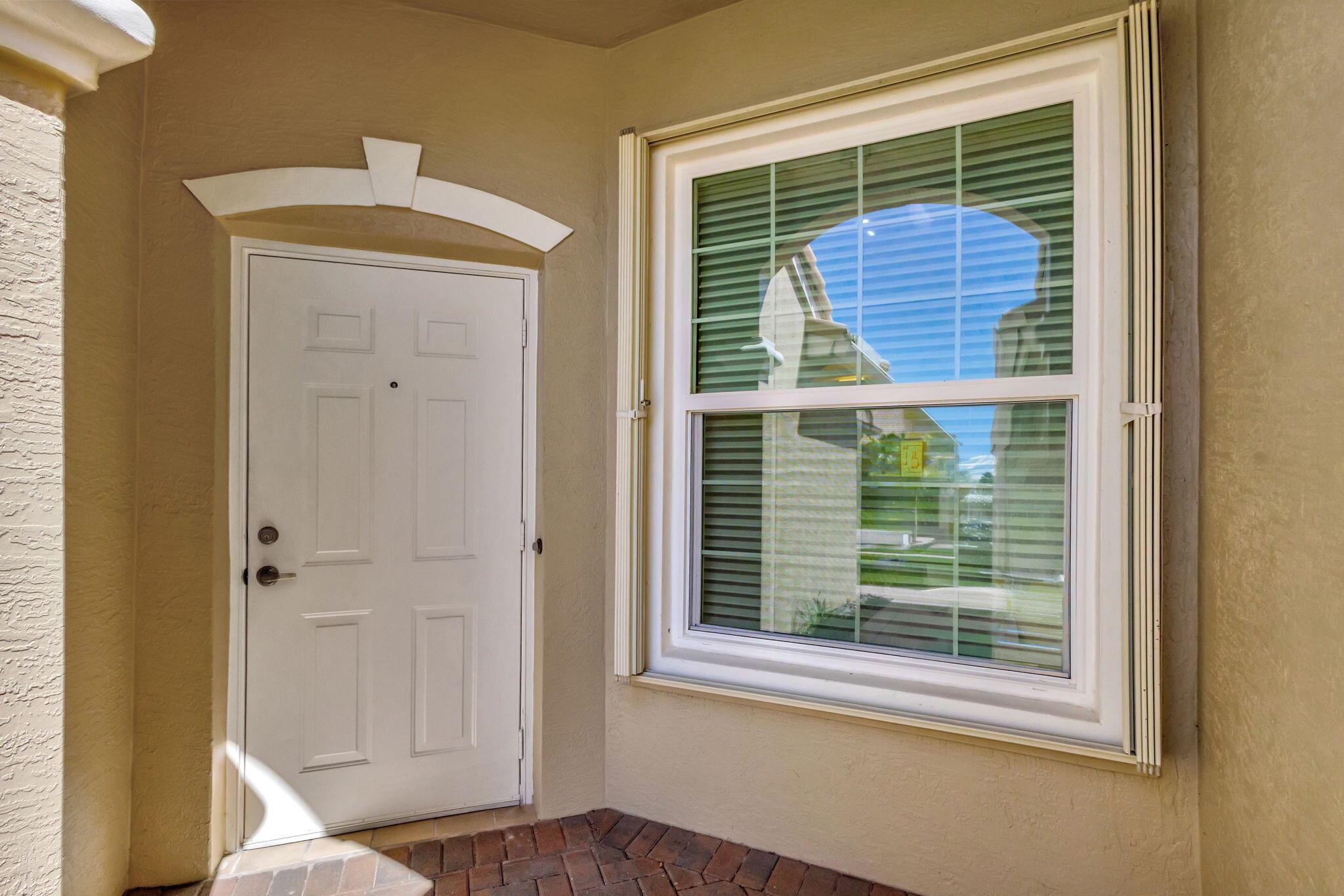 Pristine 2/2/1 villa with wide lake views. Seller is a Snowbird. Offered Furnished. Fully renovated bathrooms, and renovated Kitchen. New appliances. Newer A/C (one year). Rare double driveway in one car garage villas allows 2nd car. Hurricane Impact Windows (except patio slider has accordian storm shutter) Tile floors except carpet in bedrooms. Large covered and screened patio. Premium window treatments. HOA includes monitored security system, 24-7 Staffed gate, CATV, WiFi, Broadband, landscaping,front and back irrigation (lake, not meter), Roof cleaning, exterior painting, resort clubhouse with heated pool and well equipped Fitness Center. Private access road to nearby Publix Shpping Plaza. Easy access to Airporrt, Turnpike, Dwtn WPB, Wellington, mall, cinema, restaurant