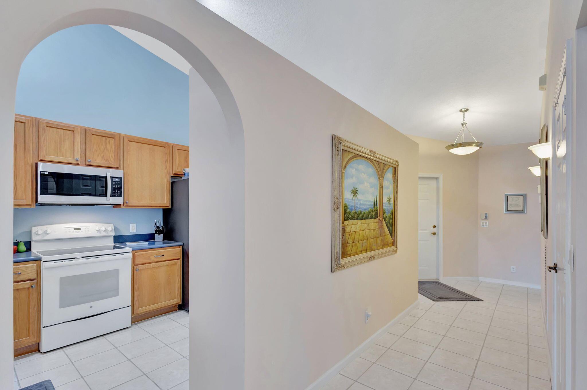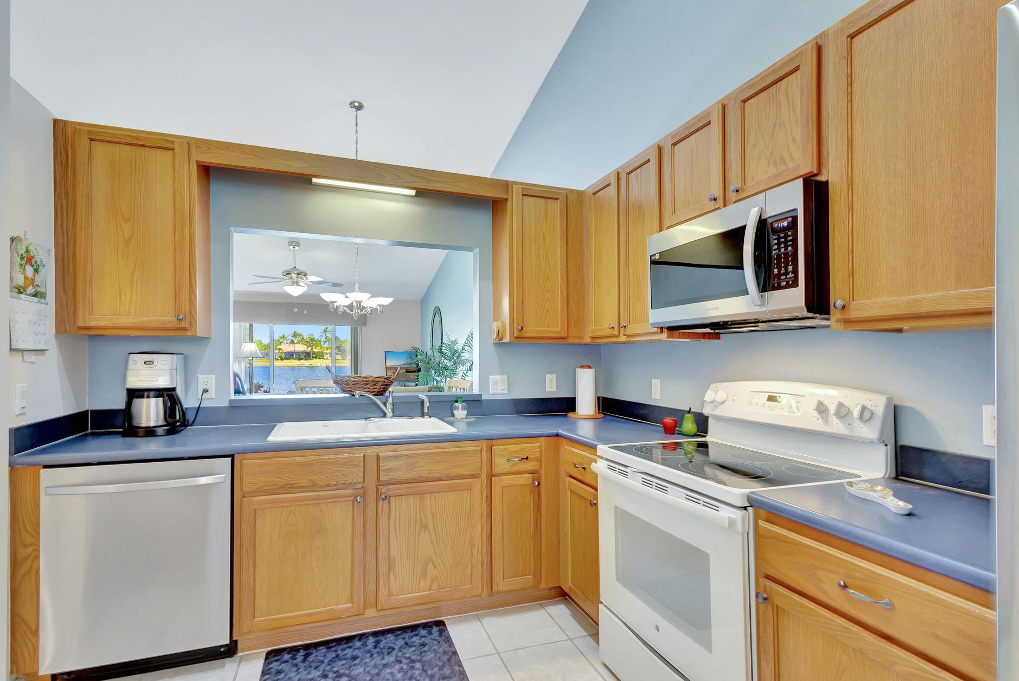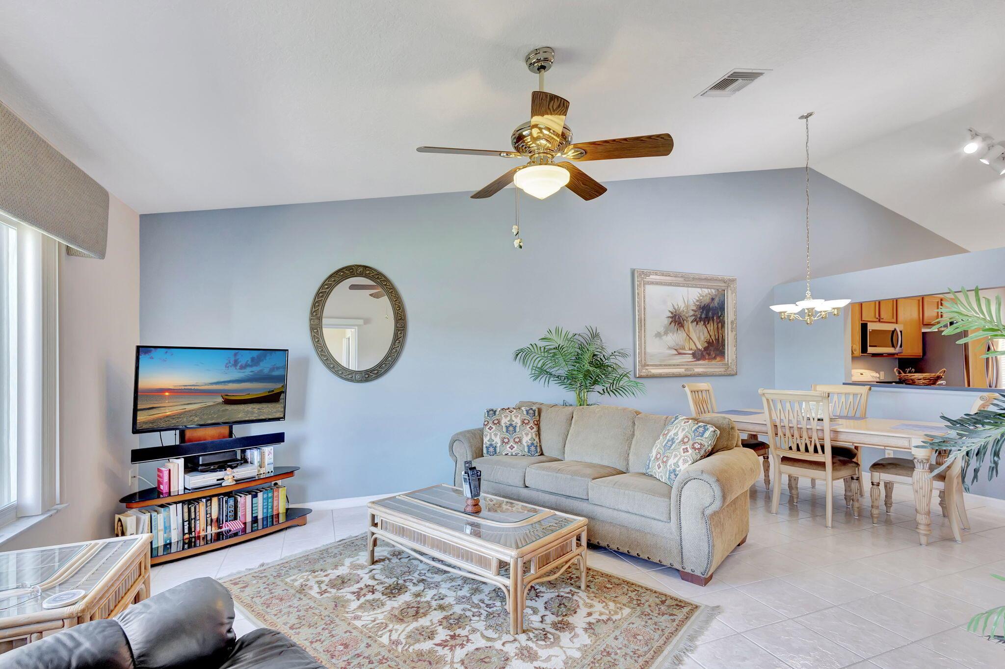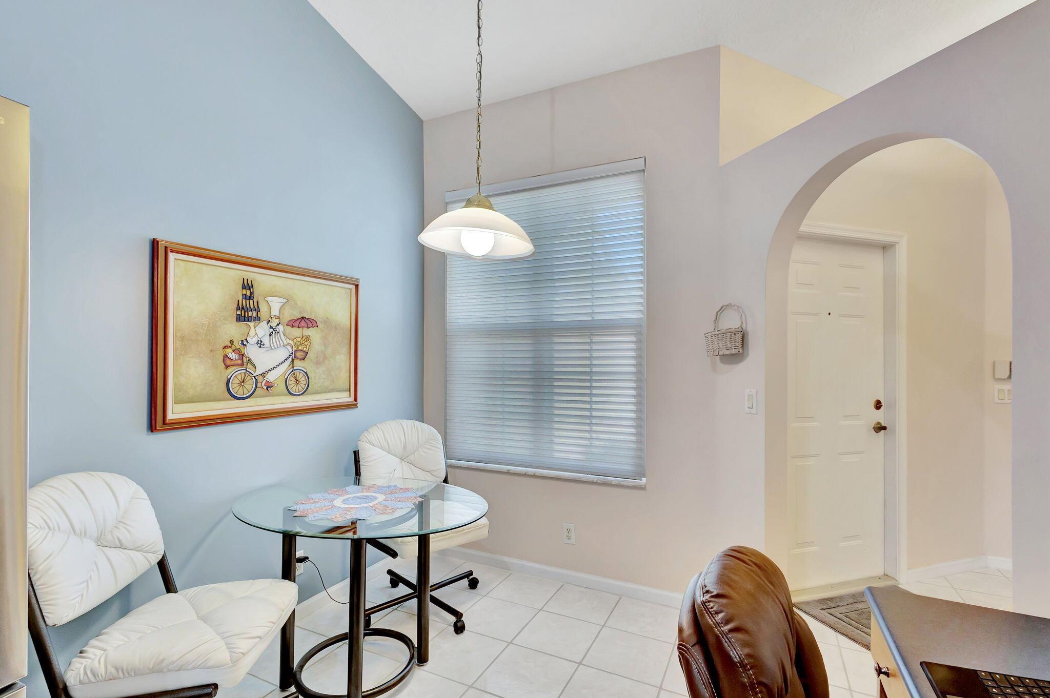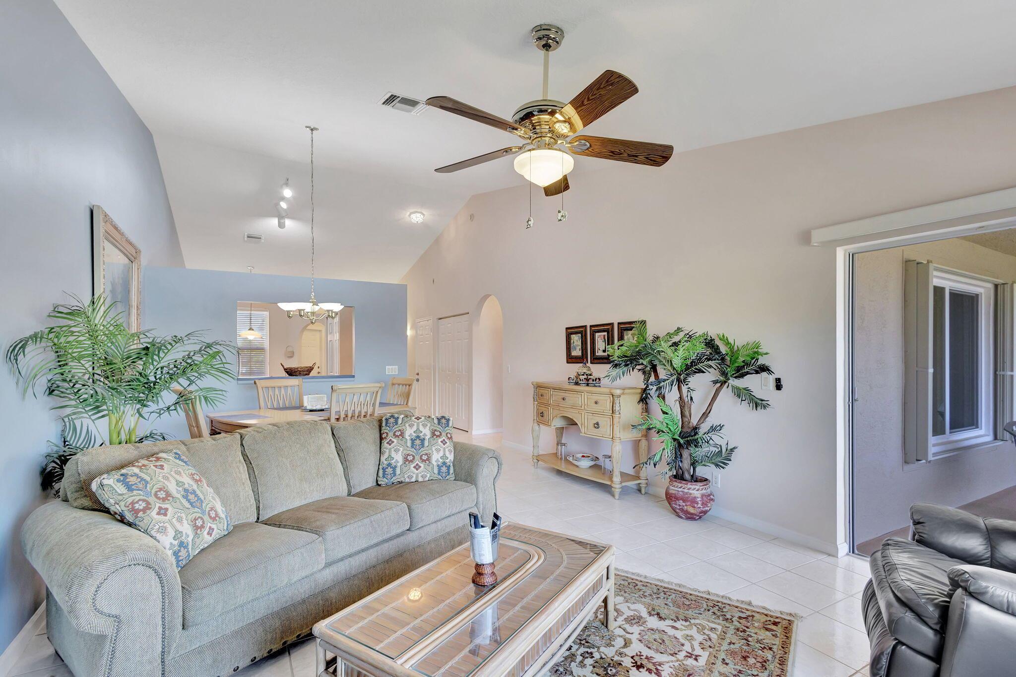 Pristine 2/2/1 villa with wide lake views. Seller is a Snowbird. Offered Furnished. Fully renovated bathrooms, and renovated Kitchen. New appliances. Newer A/C (one year). Rare double driveway in one car garage villas allows 2nd car. Hurricane Impact Windows (except patio slider has accordian storm shutter) Tile floors except carpet in bedrooms. Large covered and screened patio. Premium window treatments. HOA includes monitored security system, 24-7 Staffed gate, CATV, WiFi, Broadband, landscaping,front and back irrigation (lake, not meter), Roof cleaning, exterior painting, resort clubhouse with heated pool and well equipped Fitness Center. Private access road to nearby Publix Shpping Plaza. Easy access to Airporrt, Turnpike, Dwtn WPB, Wellington, mall, cinema, restaurant