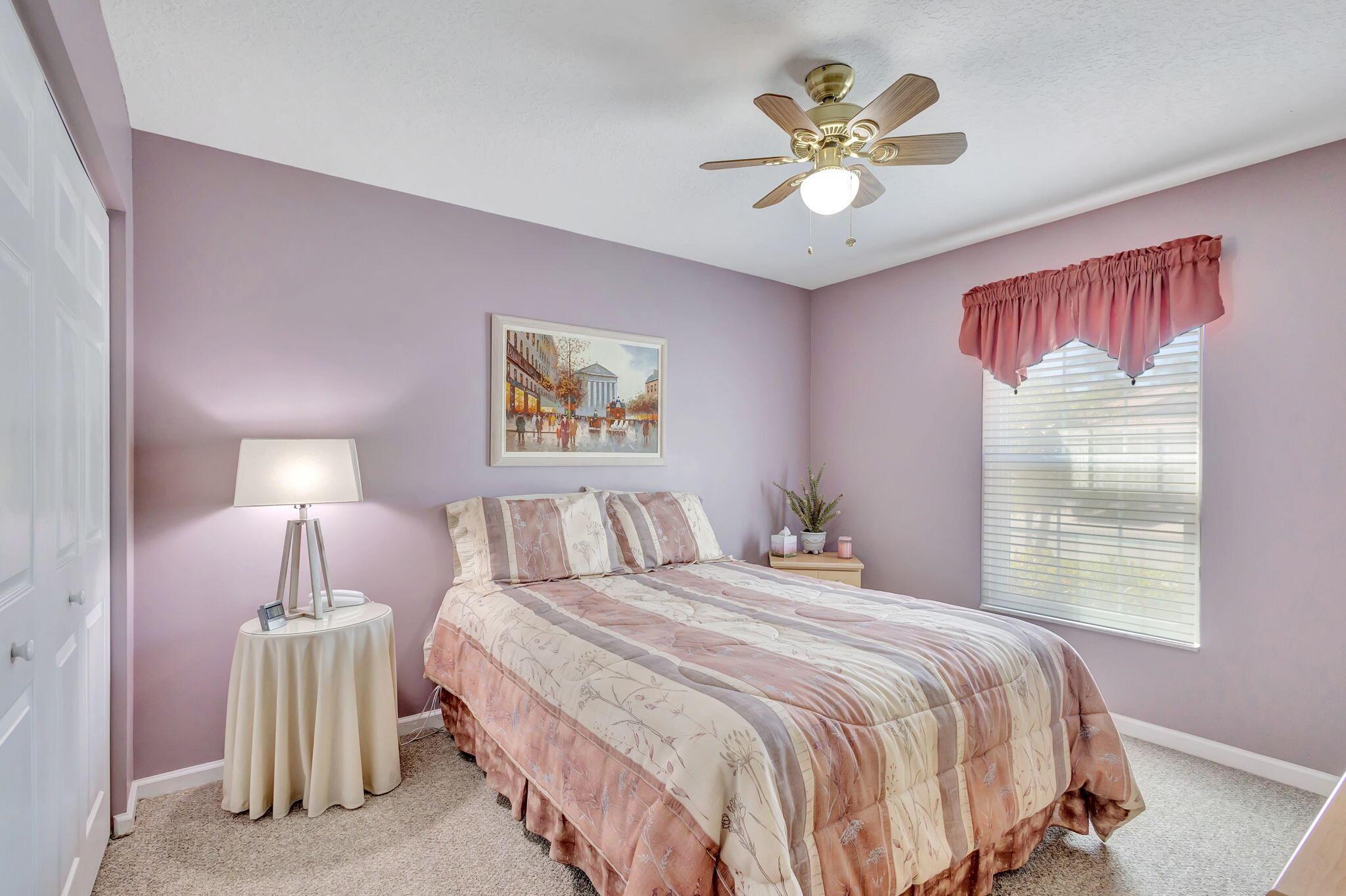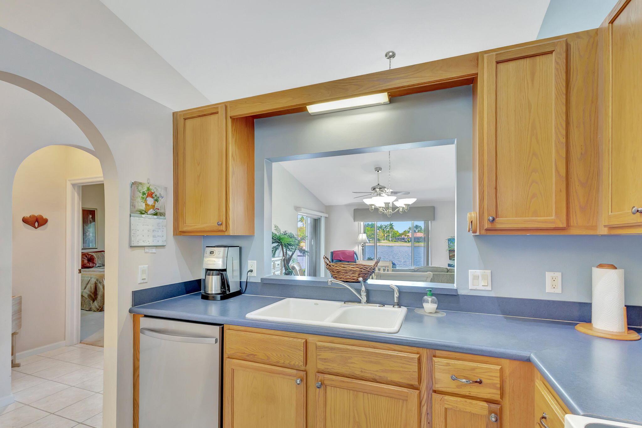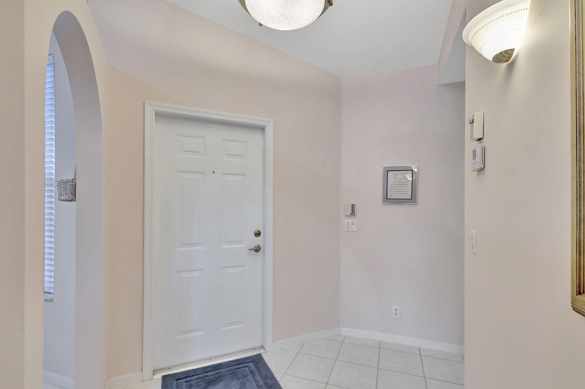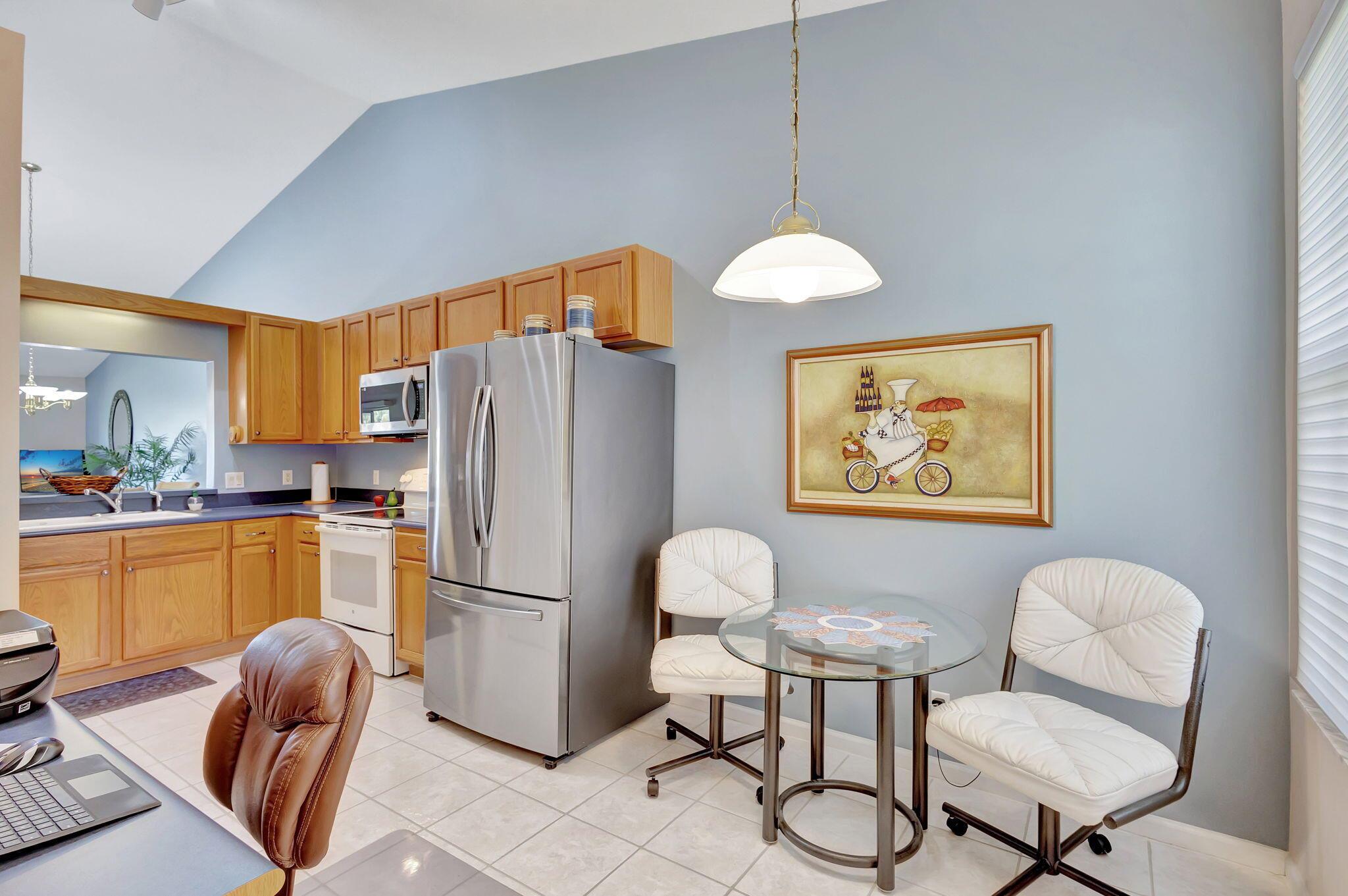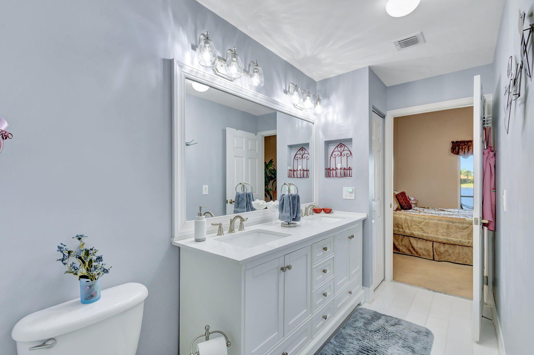 Pristine 2/2/1 villa with wide lake views. Seller is a Snowbird. Offered Furnished. Fully renovated bathrooms, and renovated Kitchen. New appliances. Newer A/C (one year). Rare double driveway in one car garage villas allows 2nd car. Hurricane Impact Windows (except patio slider has accordian storm shutter) Tile floors except carpet in bedrooms. Large covered and screened patio. Premium window treatments. HOA includes monitored security system, 24-7 Staffed gate, CATV, WiFi, Broadband, landscaping,front and back irrigation (lake, not meter), Roof cleaning, exterior painting, resort clubhouse with heated pool and well equipped Fitness Center. Private access road to nearby Publix Shpping Plaza. Easy access to Airporrt, Turnpike, Dwtn WPB, Wellington, mall, cinema, restaurant