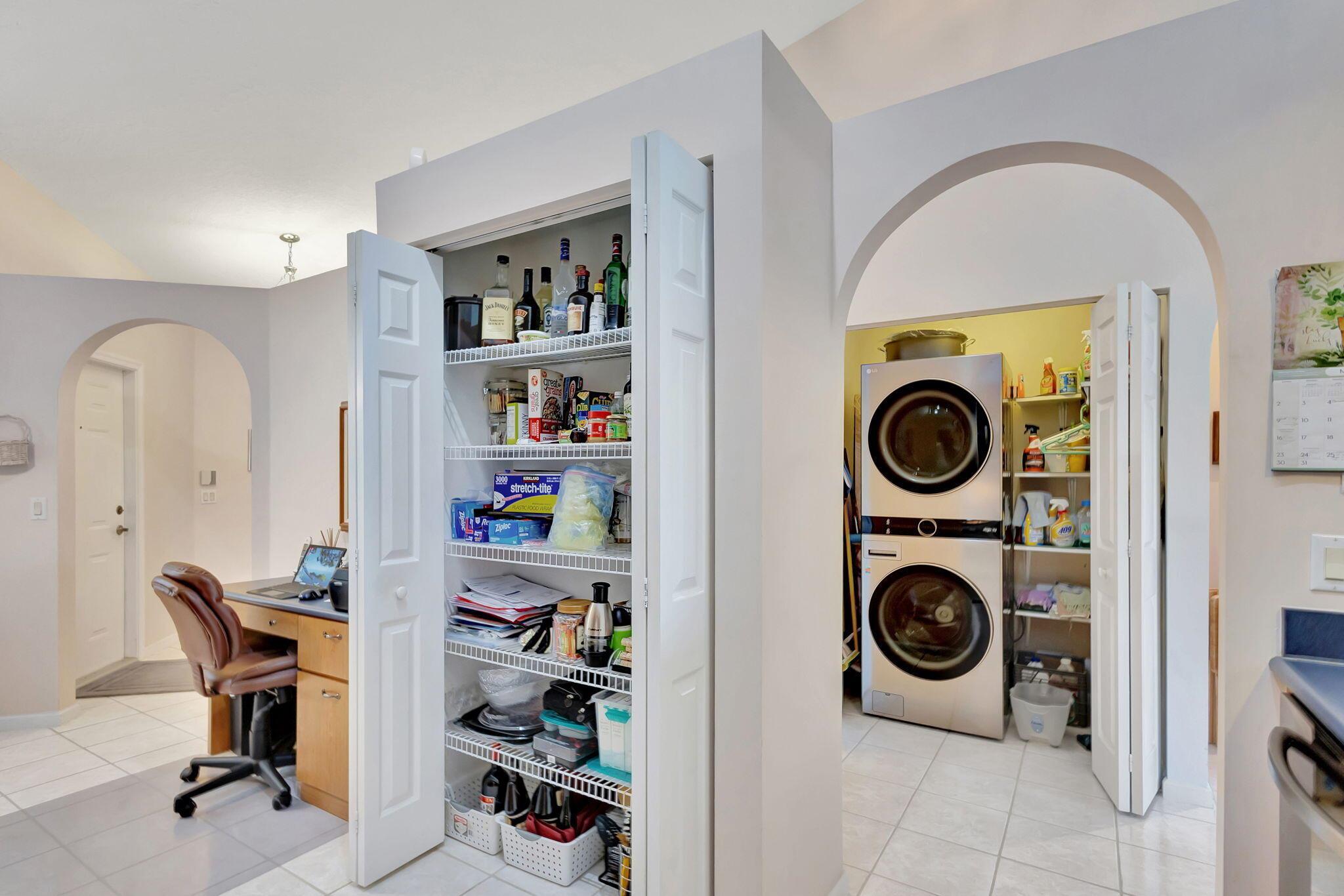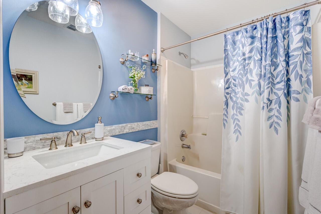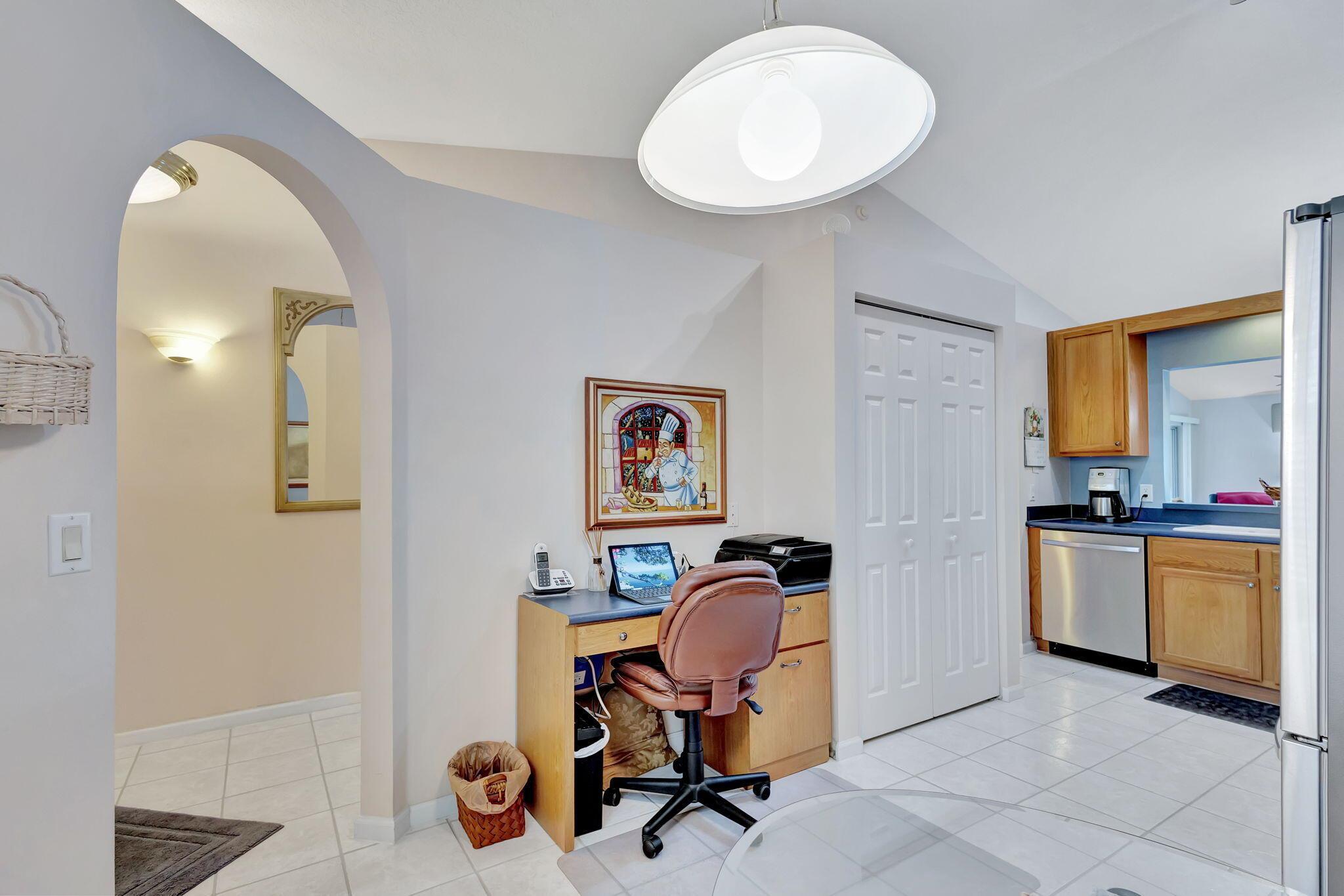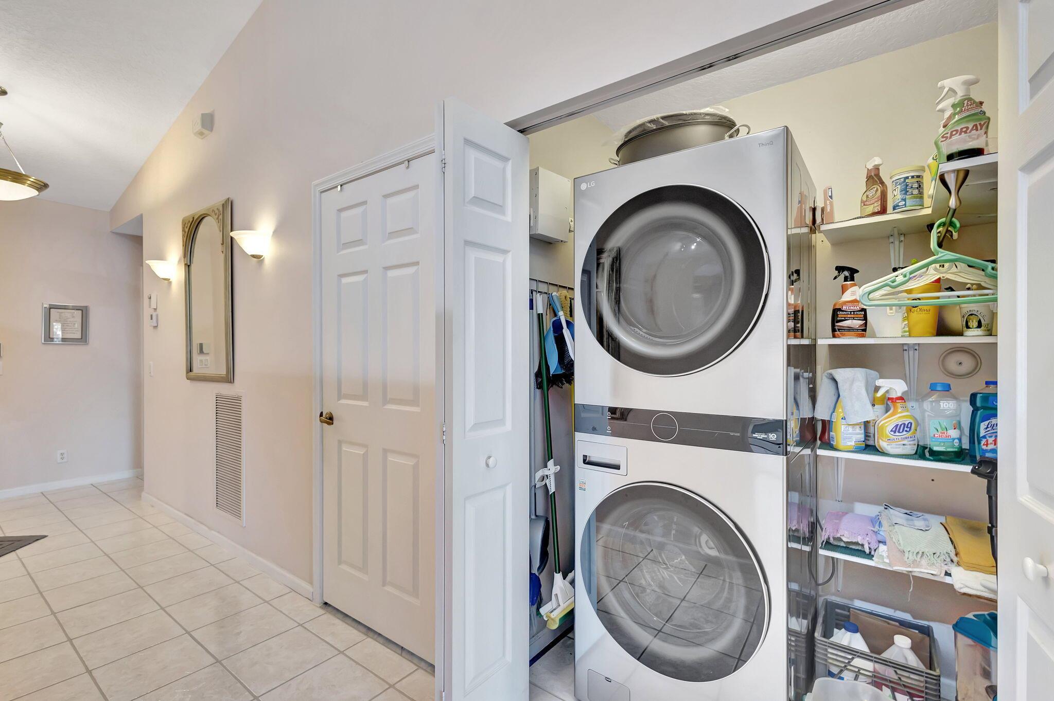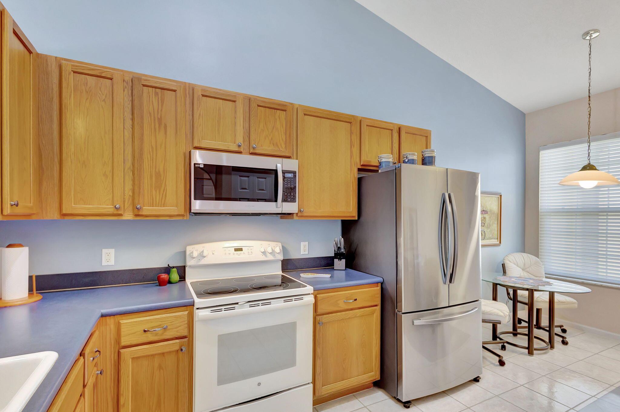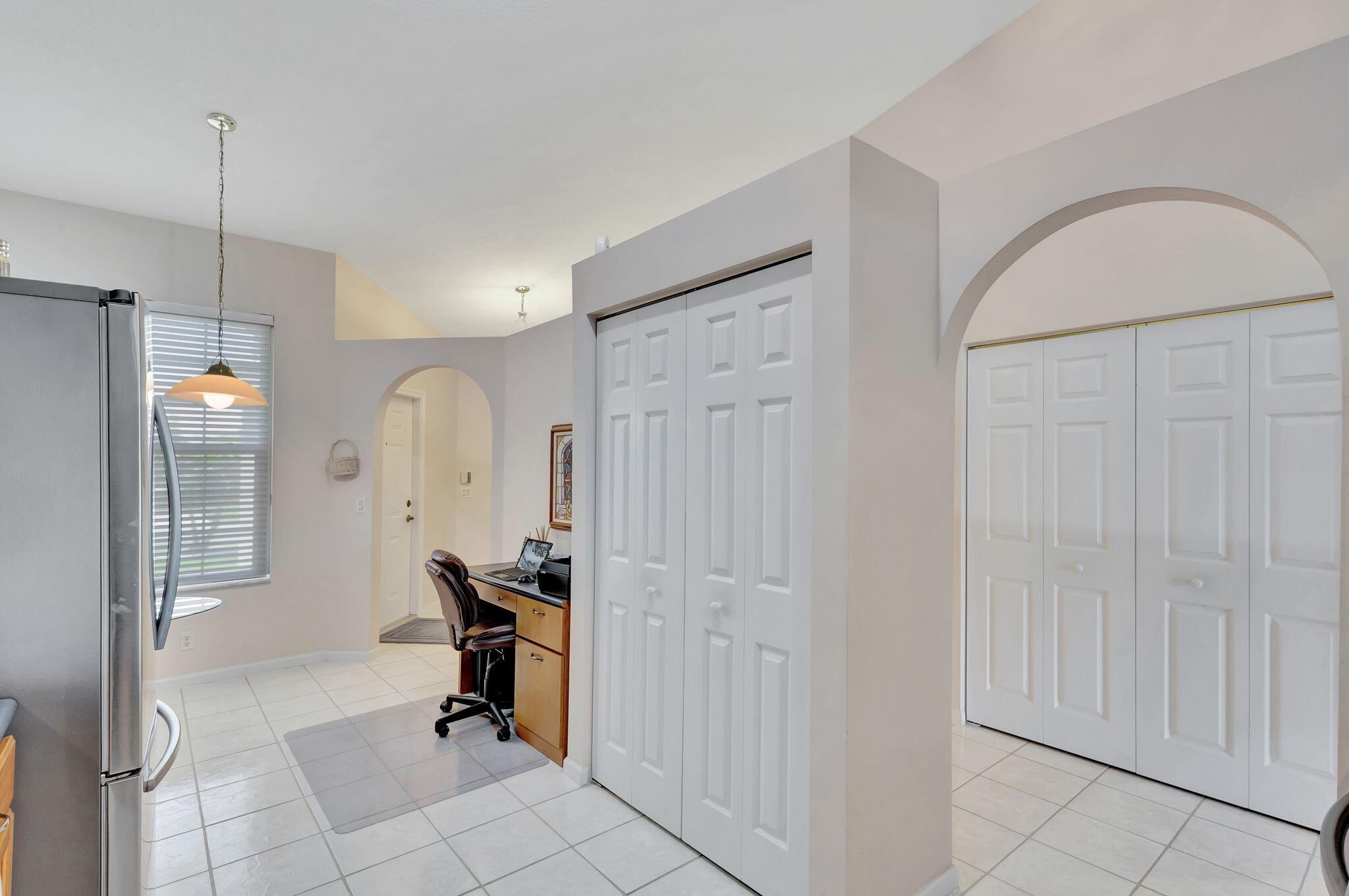 Pristine 2/2/1 villa with wide lake views. Seller is a Snowbird. Offered Furnished. Fully renovated bathrooms, and renovated Kitchen. New appliances. Newer A/C (one year). Rare double driveway in one car garage villas allows 2nd car. Hurricane Impact Windows (except patio slider has accordian storm shutter) Tile floors except carpet in bedrooms. Large covered and screened patio. Premium window treatments. HOA includes monitored security system, 24-7 Staffed gate, CATV, WiFi, Broadband, landscaping,front and back irrigation (lake, not meter), Roof cleaning, exterior painting, resort clubhouse with heated pool and well equipped Fitness Center. Private access road to nearby Publix Shpping Plaza. Easy access to Airporrt, Turnpike, Dwtn WPB, Wellington, mall, cinema, restaurant