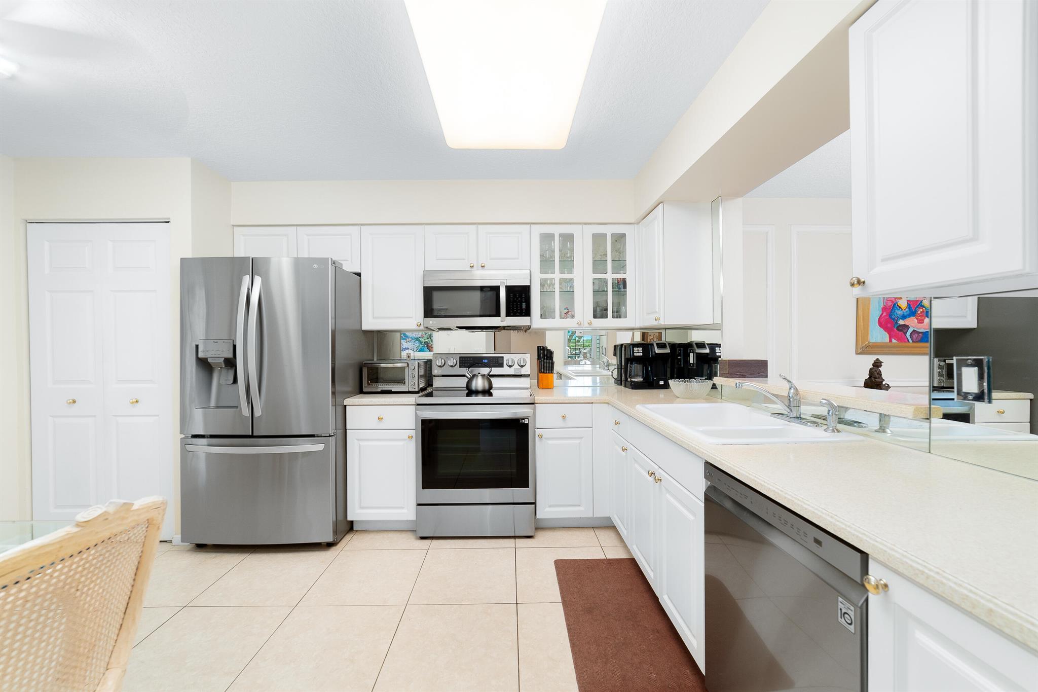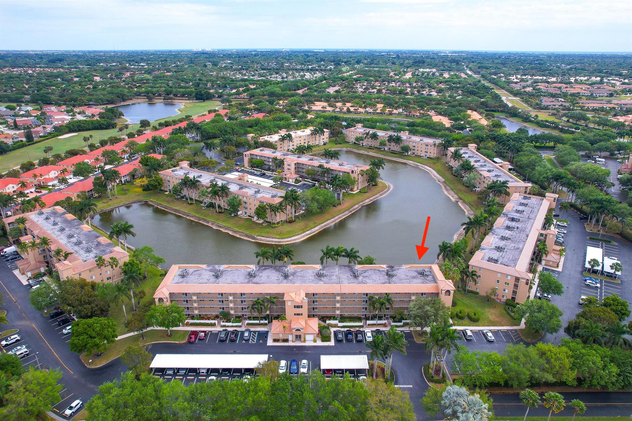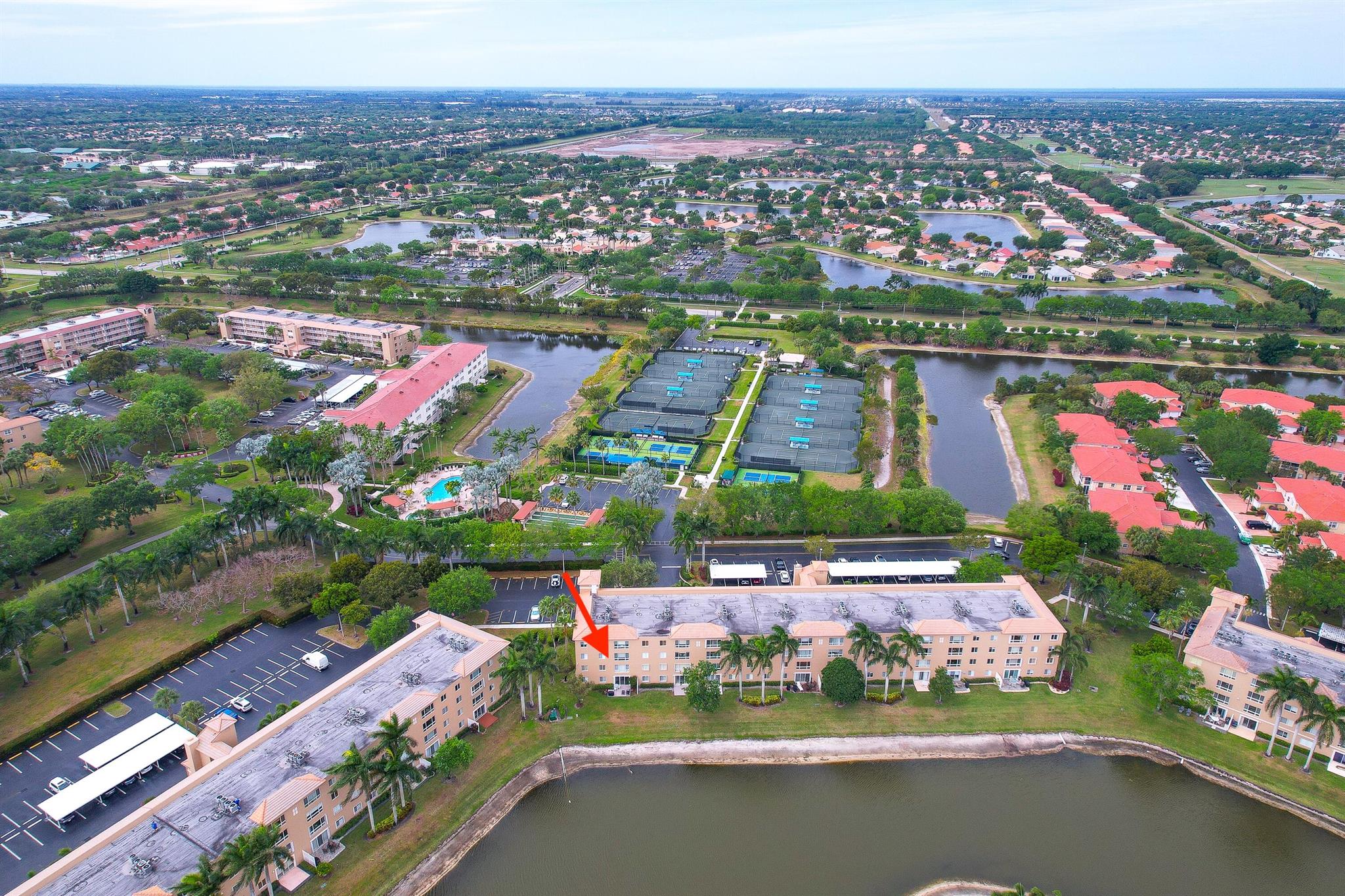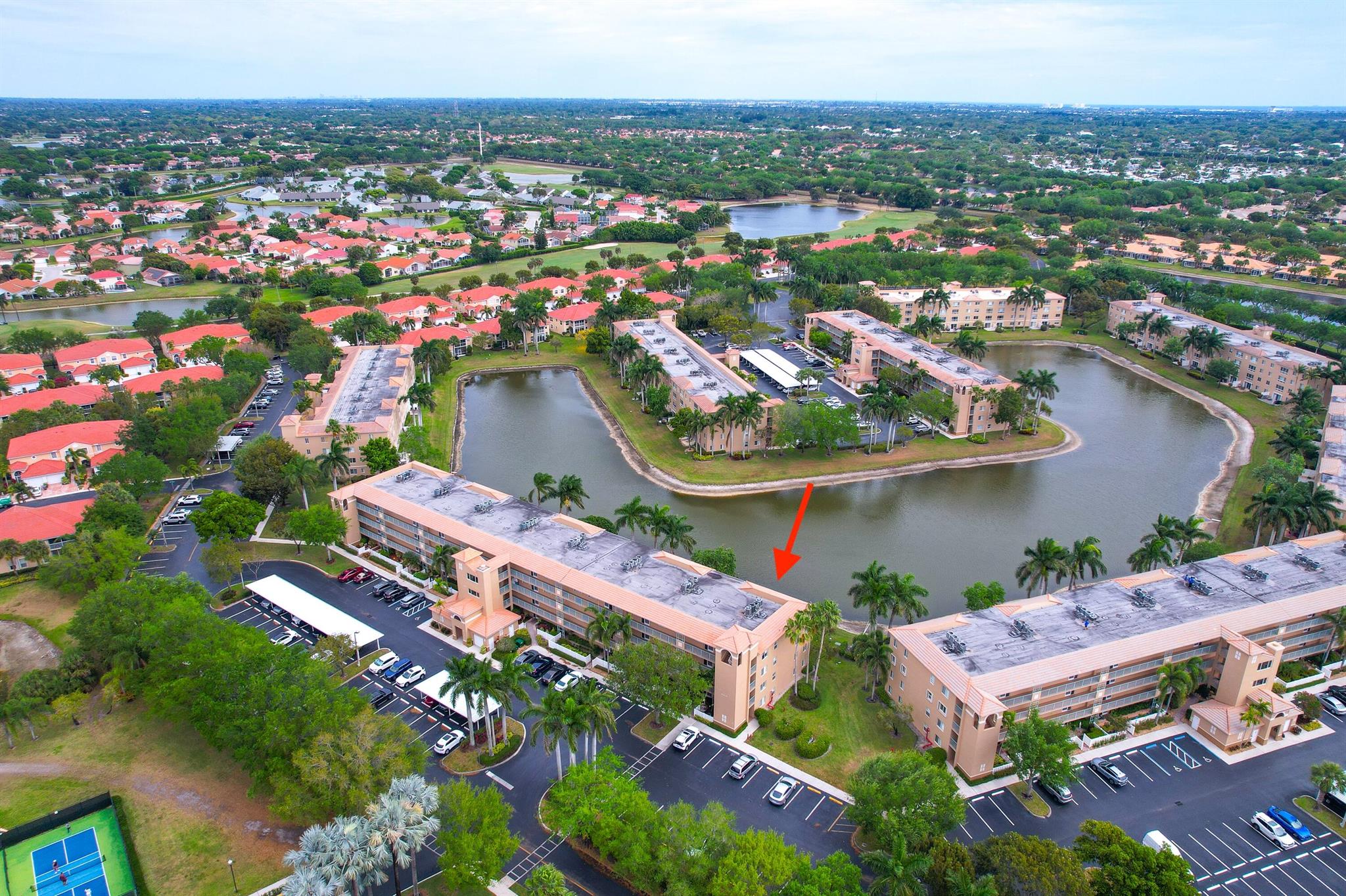 PRICED TO SELL, MOTIVATED SELLER! You'll love the gorgeous LAKE view from this bright and spacious unit in a fantastic, active 55+ community that has so much to offer! The eat-in kitchen is equipped with stainless steel appliances, Corian countertops, pantry and breakfast area. There is ceramic tile in the living areas and den, laminate in the guest bedroom and luxury carpet in the primary bedroom. The primary bedroom faces the lake, and offers a generous walk-in and strip closets. The en-suite primary bathroom is finished with dual sinks, separate tub and shower. Other notable features include a laundry room with a sink, plenty of storage closets, plantation shutters, 2023 AC and 2021 water heater. The roof is expected to be replaced in 2025. This unit is located steps away from the palm