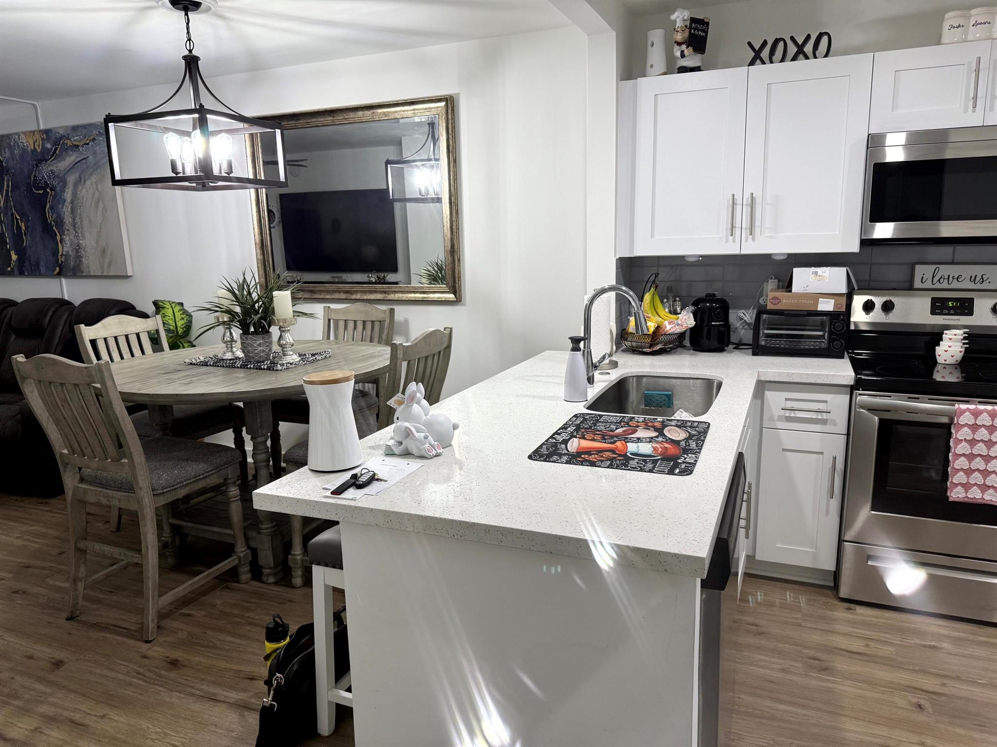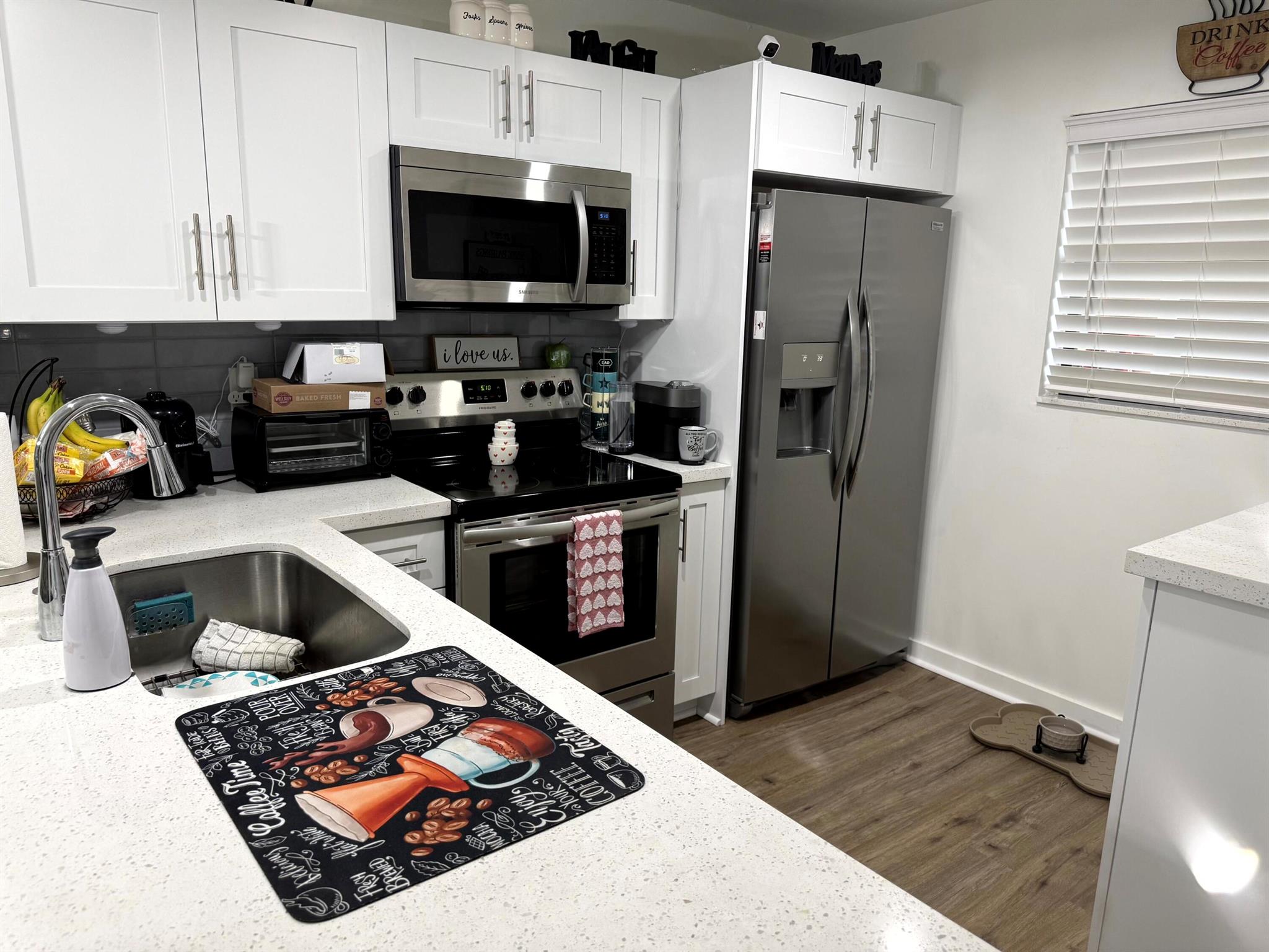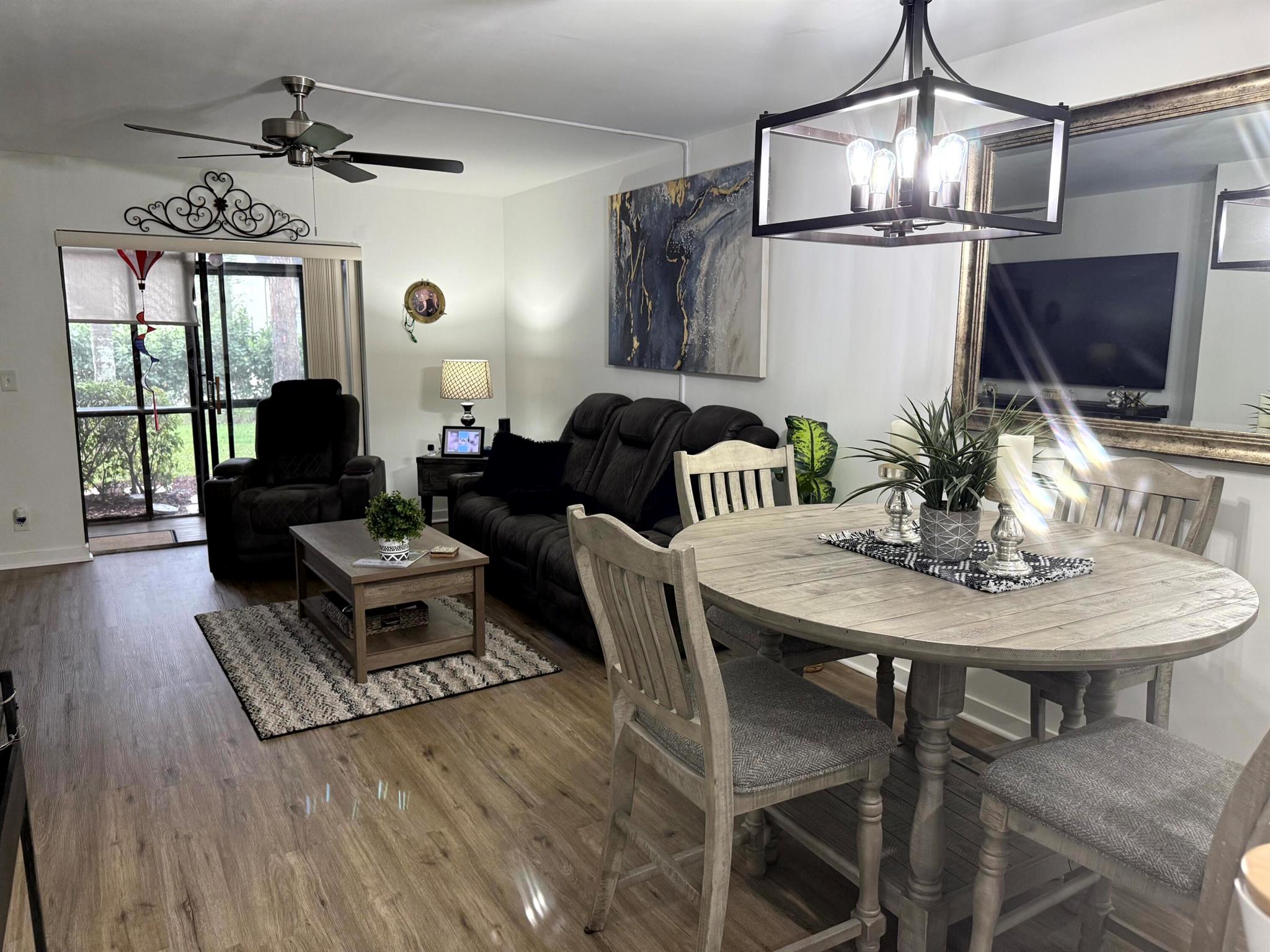 Welcome Home. Nothing to do expect move in. Everything (plus appliances) is new. Remodel in 2023...The pillar in the kitchen has been removed to give you an amazing open concept feeling, custom 3/4-inch solid wood, soft close kitchen cabinets, quartz countertops. All new 30 yr waterproof flooring throughout including new wood baseboard. LED high hats in kitchen and entry area. The current owner made additional improvements: alarm system (can stay or go), ceiling fans, glass shower door in master bathroom, electric added to the cafe bar, all weather screen door, new AC unit and new roof is being currently install. Current owner paid the $3000 assessment in full so no assessment for you. Located in a wonderful 55+ community with plenty of activities.