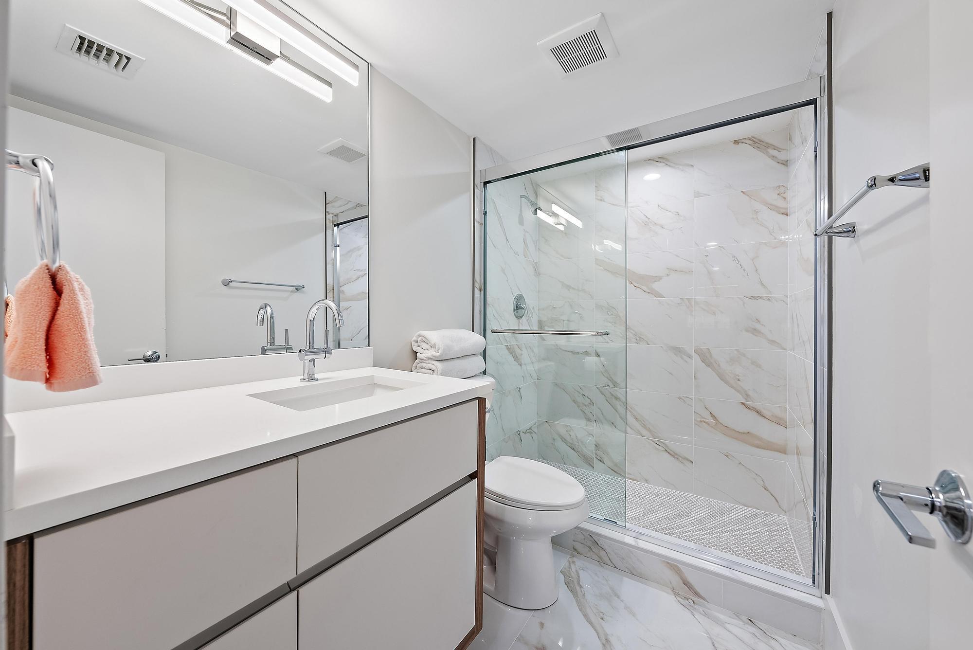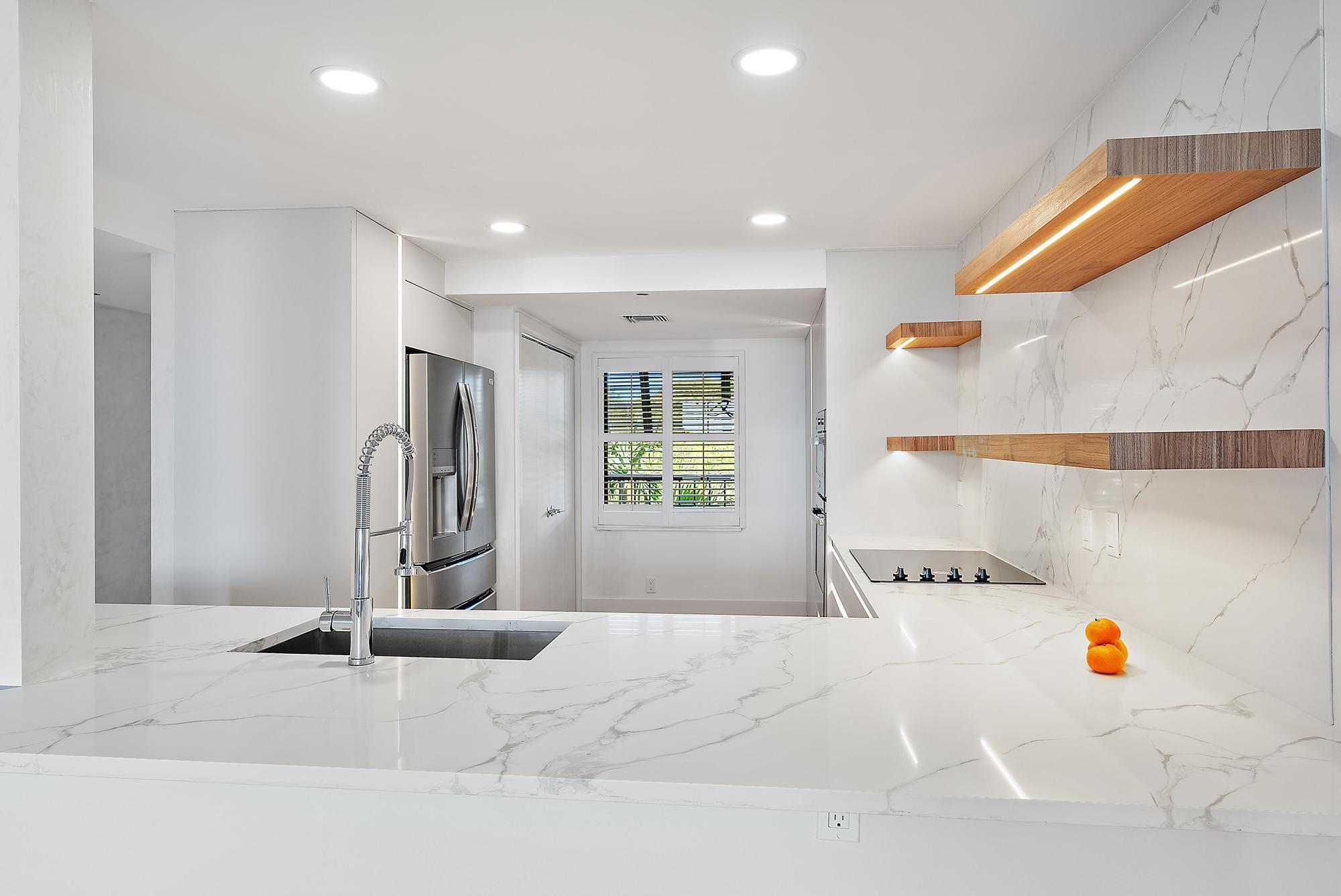Modern Elegance & Resort-Style Living in Palm Beach Gardens. Experience modern elegance in this newly renovated Palm Beach Gardens condominium with stunning Intracoastal and golf course views. The home features custom-built kitchen cabinetry with integrated lighting, quartz countertops, a full slab backsplash, and brand-new high-end appliances.Venetian plaster walls, new modern lighting, and a sleek custom entertainment unit elevate the interior. Enjoy a brand-new AC system, water heater, and noise-reducing tile flooring. The bathrooms have fully updated plumbing, custom cabinetry, and replaced cast iron pipes. The primary and guest bedrooms include custom wardrobes, and the guest suite features a built-in Murphy bed with a desk.