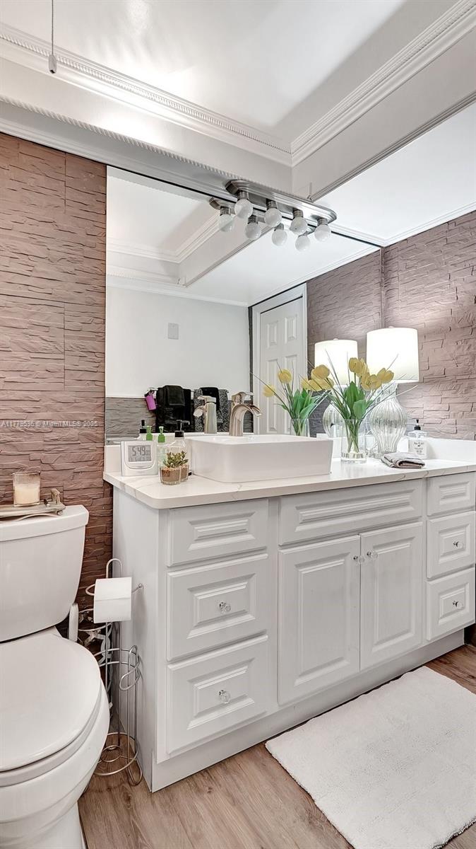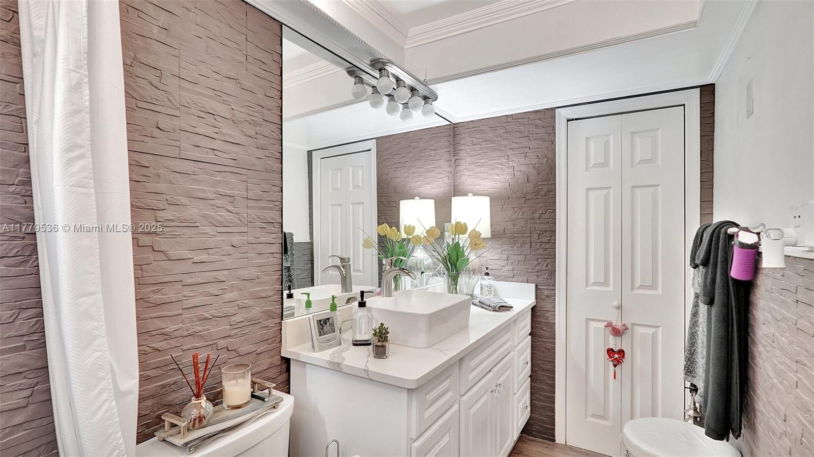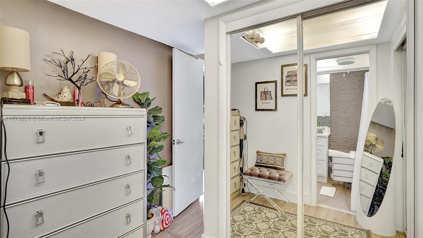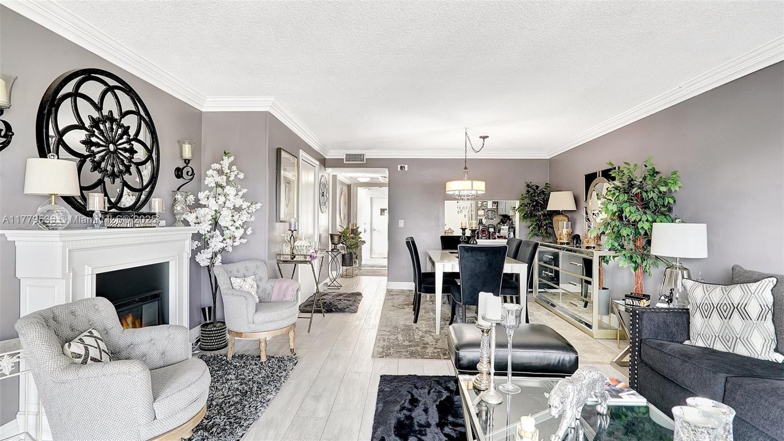 This spacious Upgraded 2BR, 2BA condo in a sought-after 55+ community features a bright, open living area with double ceiling sliders leading to a large screened-in patio. The upgraded kitchen boasts stainless steel appliances, an extra-large double fridge, plenty of cabinet space, Quartz countertops, & eating space. Both bathrooms have been remodeled—one with a tub and the other with a shower & dual sinks. Laminate tile floors & crown molding add to the appeal. Tons of closet space throughout & additional storage available. Enjoy amenities like a fitness center, clubhouse, pool, & common laundry. Ideally located just 10 minutes from the beach & close to Gulfstream racetrack & casino, Aventura Mall, restaurants, supermarkets, and hospitals.
