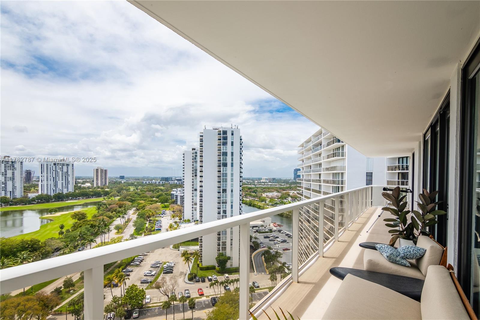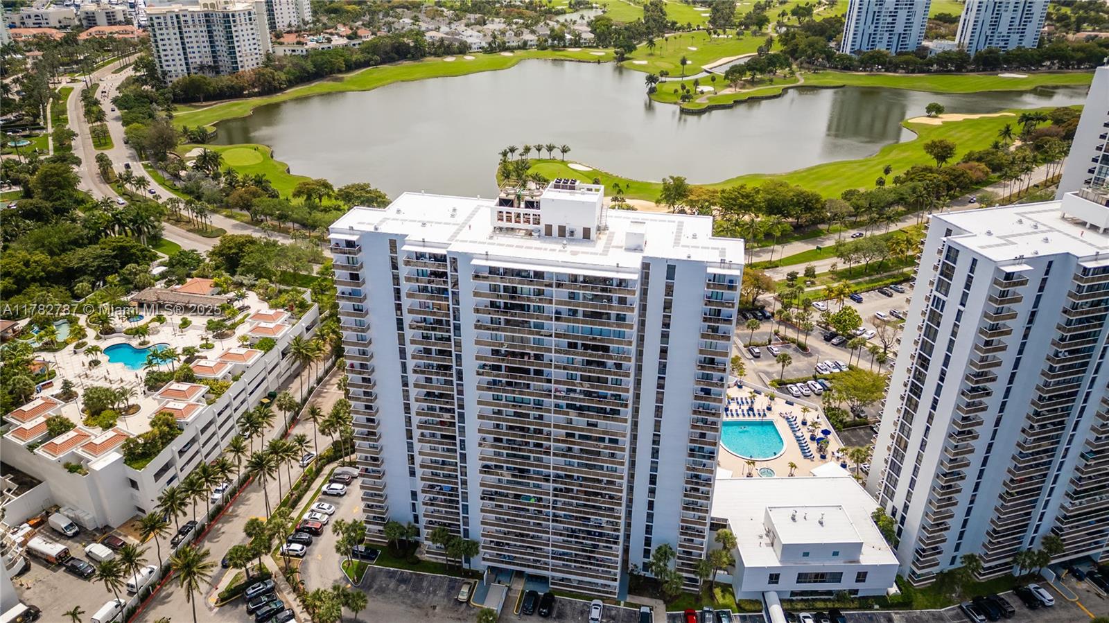 Soaring from the 19th floor, this 3-bed, 3-bath condo offers stunning golf and city views in a bright, open layout. With 1,465 sqft of tile-floored living space, the home features a well-equipped kitchen with an electric range, microwave, refrigerator, washer, and dryer in the unit. Enjoy morning coffee or sunset wine on the spacious open balcony. Central cooling and ceiling fans ensure year-round comfort, while a doorman provides added security. The waterfront building offers assigned and guest parking, blending convenience with elevated living. This high-rise retreat is perfect for those seeking comfort, style, and serene views in every direction.
