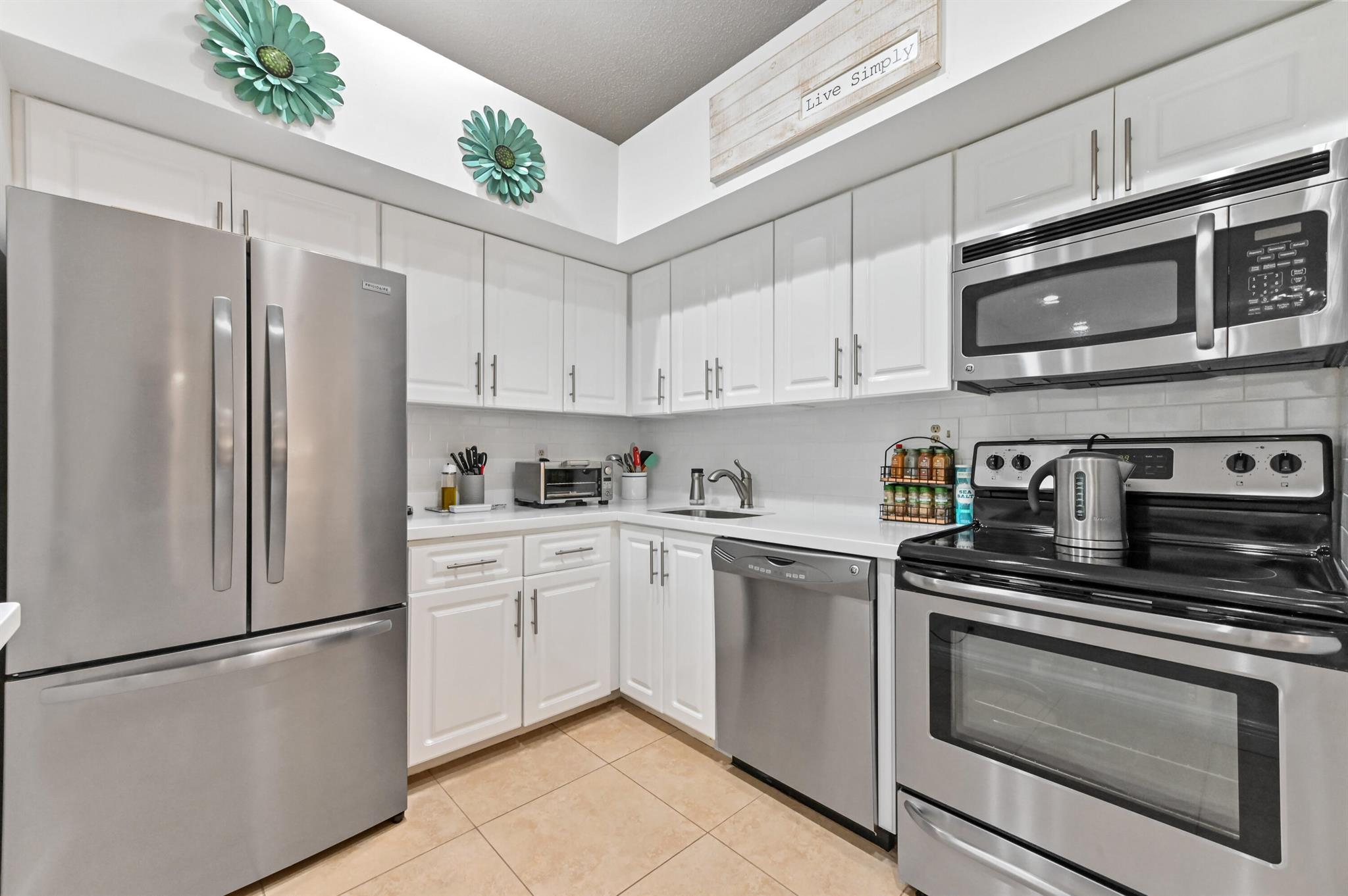 Find exceptionally elegant resort-style living in this totally renovated move-in ready condo located in the tranquil Lakes of Delray. Here you'll find newer A/C(2023), and upgraded fixtures and finishes throughout. Gorgeous kitchen features quartz counters, custom cabinetry, and stainless steel appliances. Enjoy the lovely view from a spacious Florida room where you'll find a sheltered spot that's just right for additional seating, dining, or entertaining. You'll love life in gated Lakes of Delray. This active adult condominium community offers all of the amenities and social activities you're looking for in a spectacular setting. The magnificent clubhouse features a game room, library, and fitness studio, plus multiple pools, bathhouses, and spas plus tennis and pickleball courts.