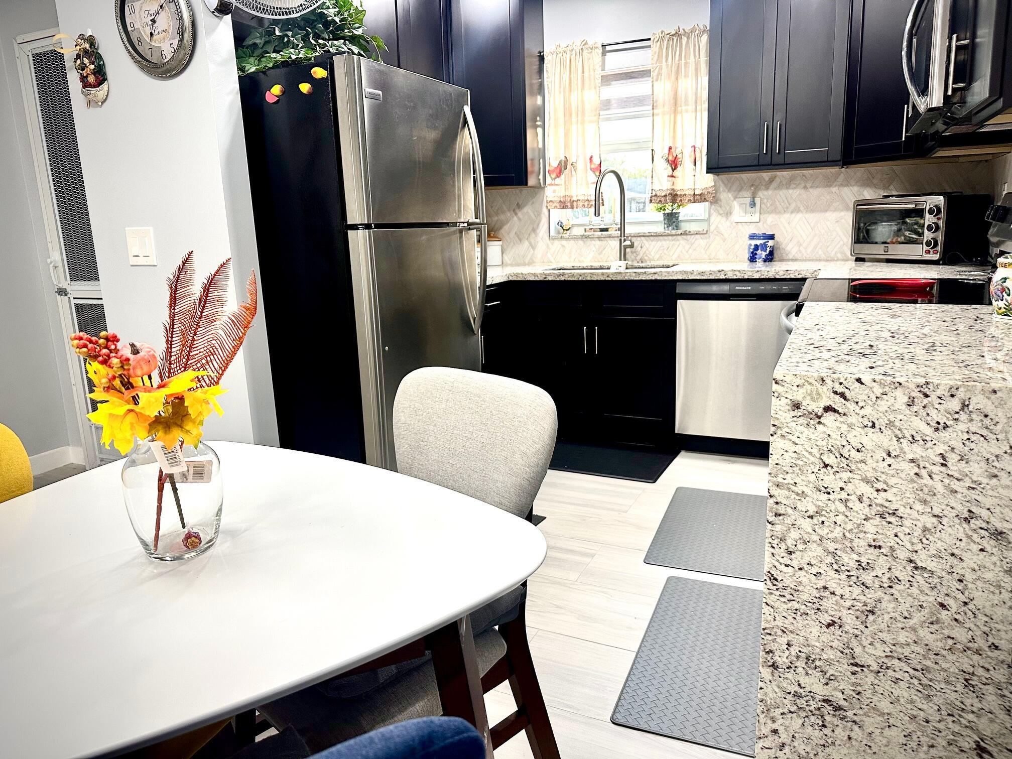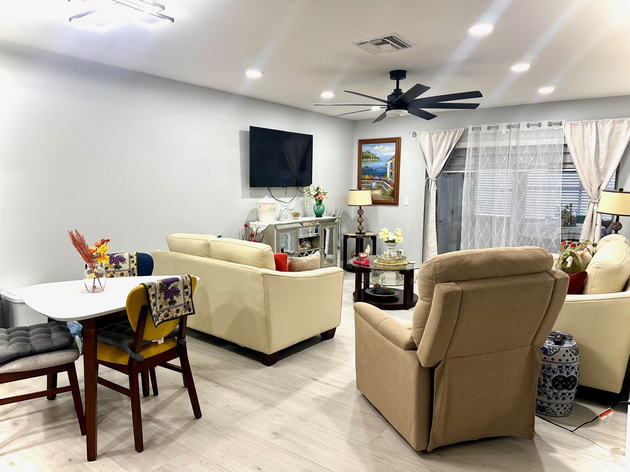 This stunning unit boasts an updated kitchen complete with stainless steel appliances. Every detail has been thoughtfully updated. Both bathrooms showcase modern ceiling-to-floor tile finishes. Enjoy energy-efficient LED recessed lighting throughout in the kitchen and living room to set the perfect mood. Additional upgrades include a 4 year old A/C unit and water heater, stylish Zebra blind window treatments. Impact-resistant windows have been installed in the kitchen, bedroom, and both bathrooms for added peace of mind. Step outside to a beautifully updated patio area with newly installed pavers. This immaculate unit is a must-see and won't be on the market for long!