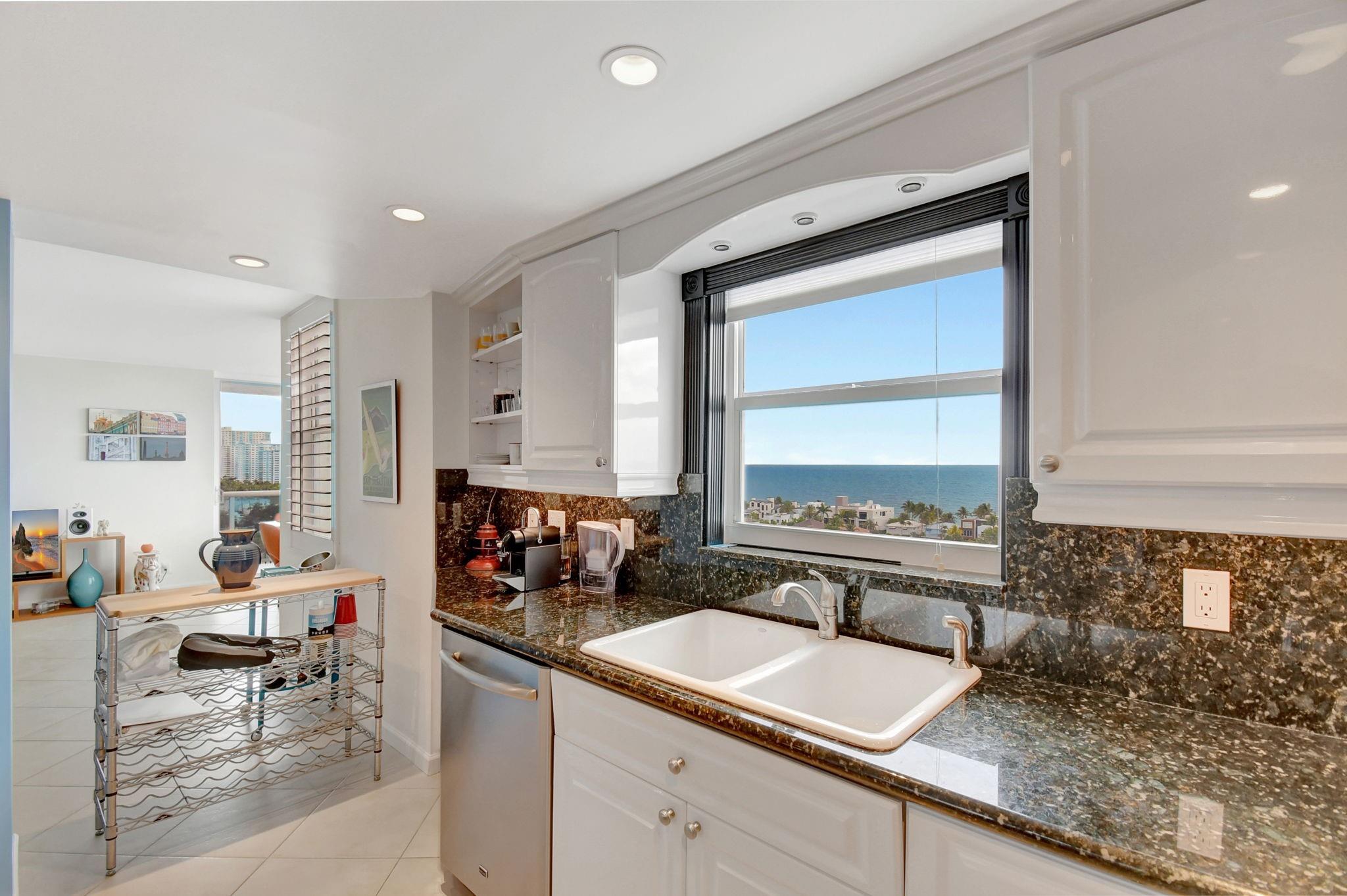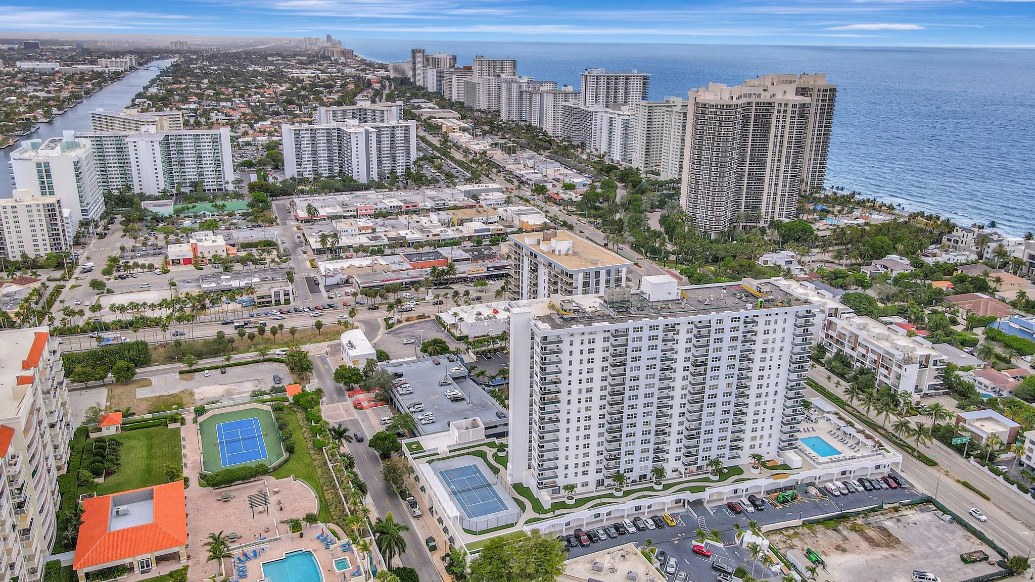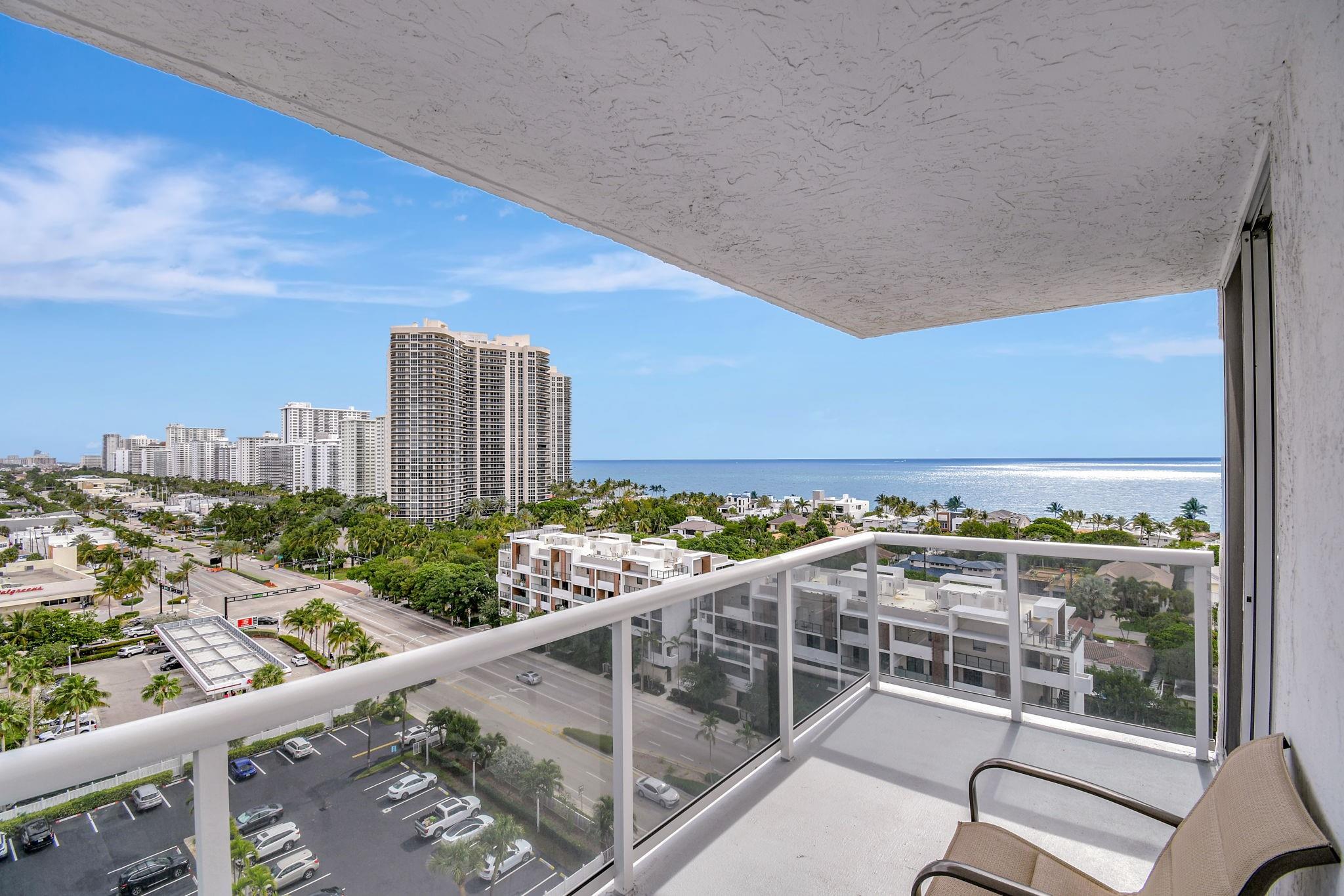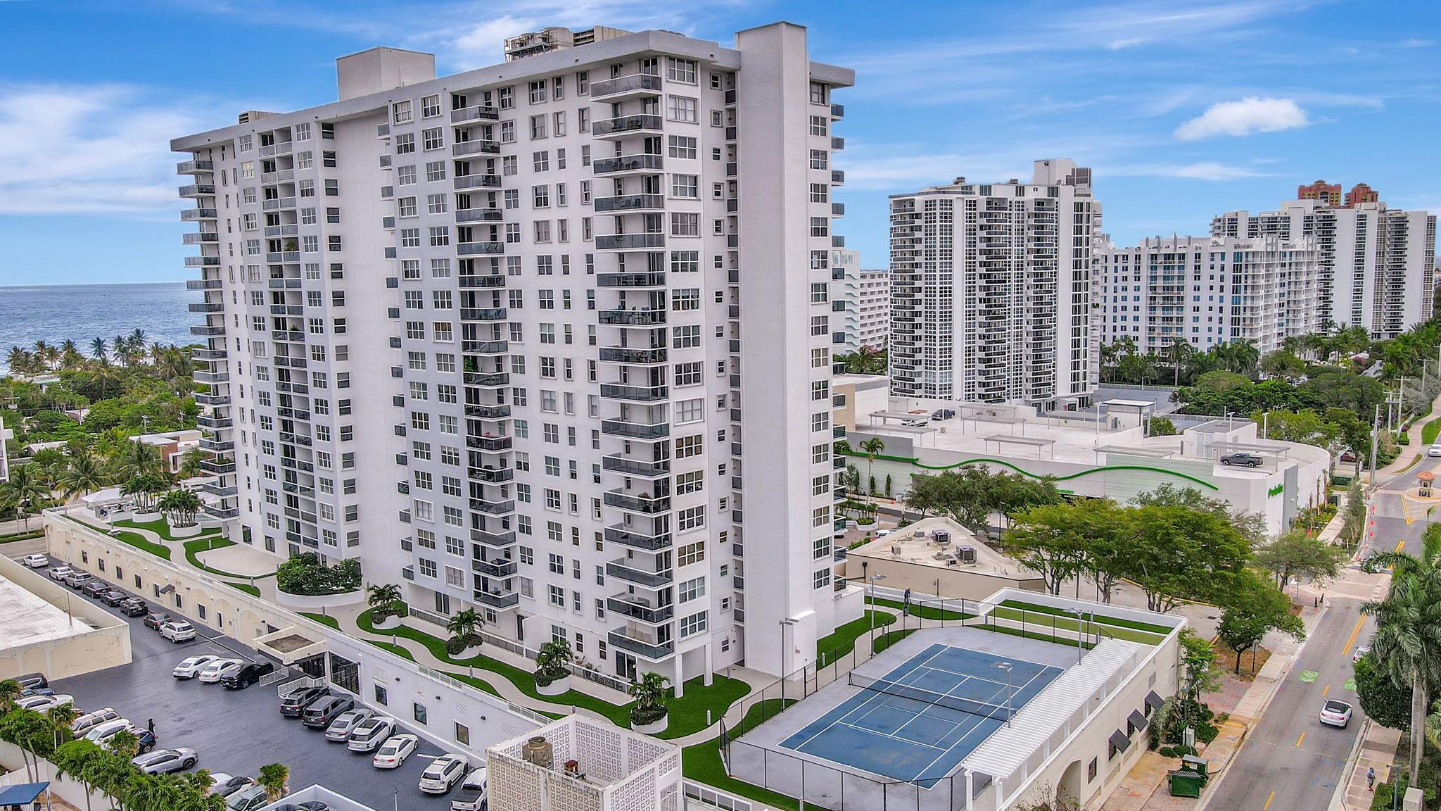 Direct ocean view from your living room, kitchen & balcony. bright, spacious unit. NE corner. Updated kitchen. Tiled throughout the unit. Impact windows/doors. Move in condition. Watch the pool and beautiful 2nd deck. View of galt ocean all the way north to lighthouse. Walk to the beach, shops, many popular restaurants, Publix across the street. Garage pkg. 24hr front desk svc. guest pkg outside. Glass balcony. 2025 roof. 50yr milestone done, water cooler. Hoa includes, water, sewer, trash pick up, basic cable, high speed fiber optic internet, pest control. You only pay electric. Extra storage & Laundry facility on same floor. Bike storage in the garage. Great place to live. great location to be in. Bayview school boundary. A rated elementary. all ages. Easy to show. NON smoking bldg.