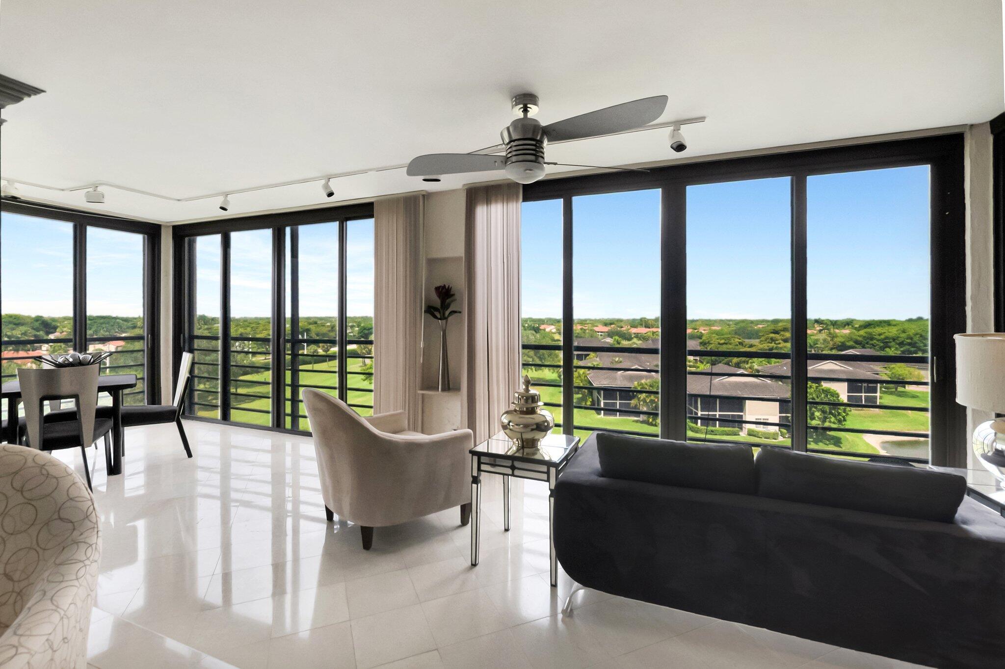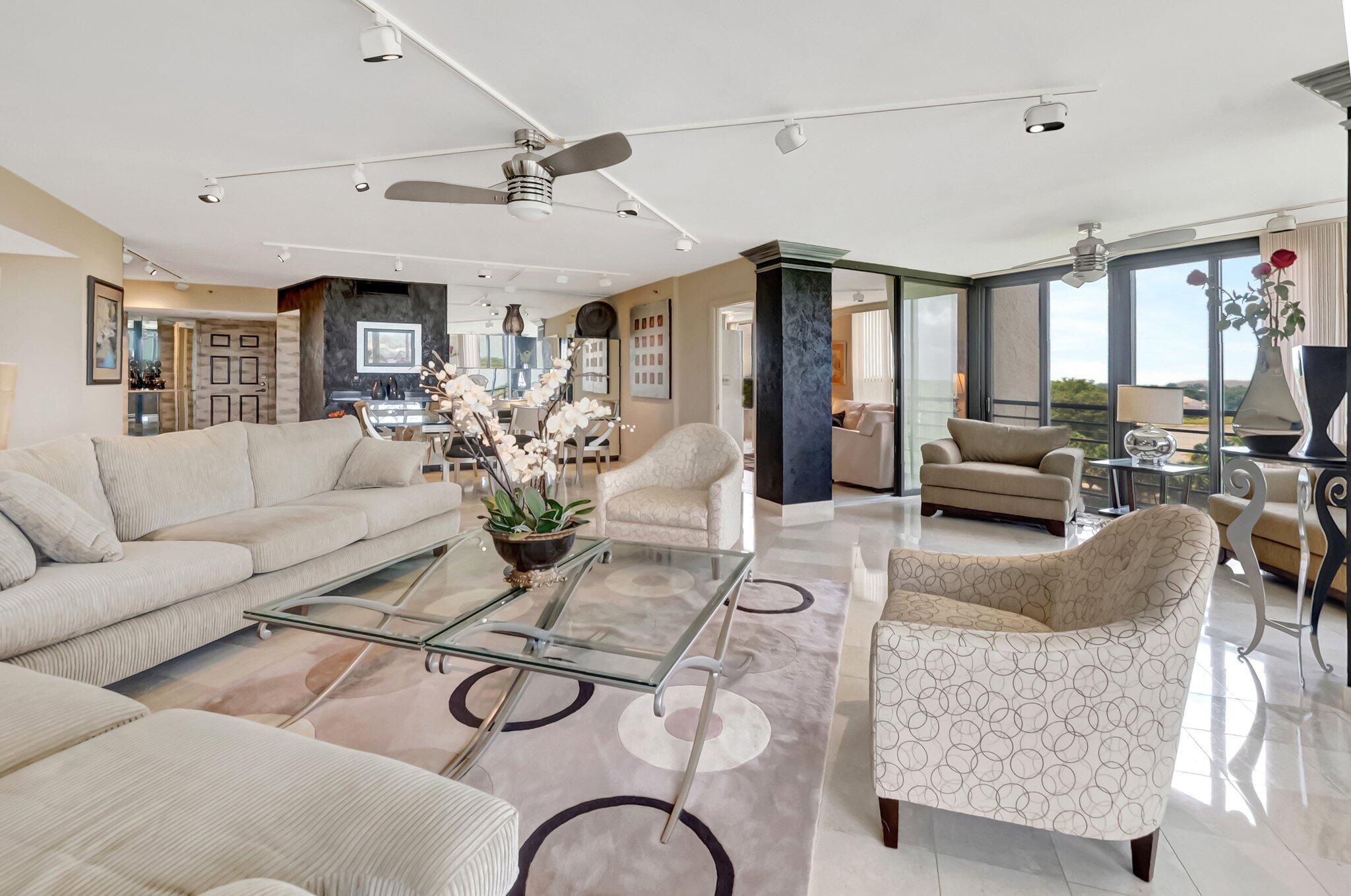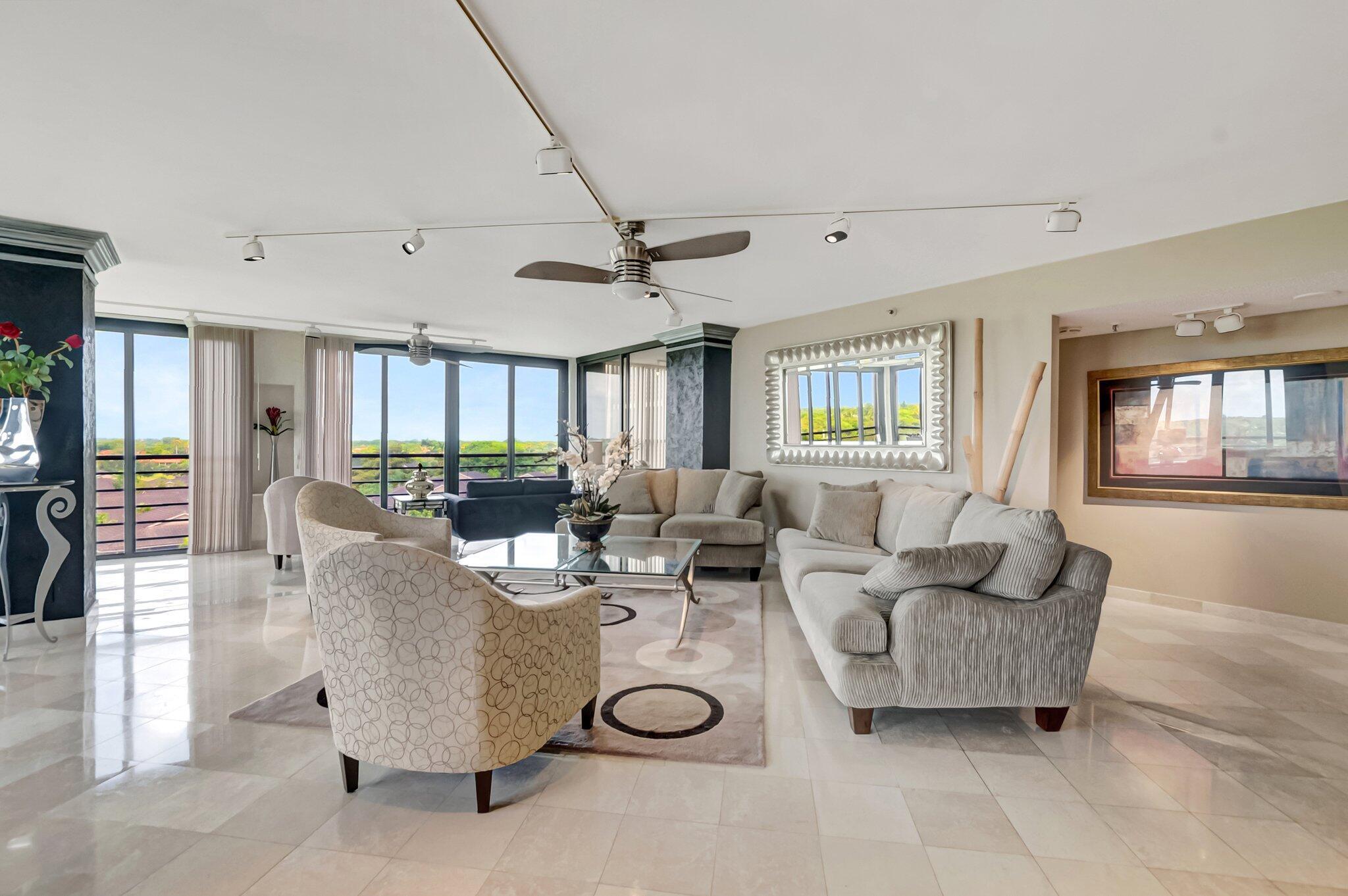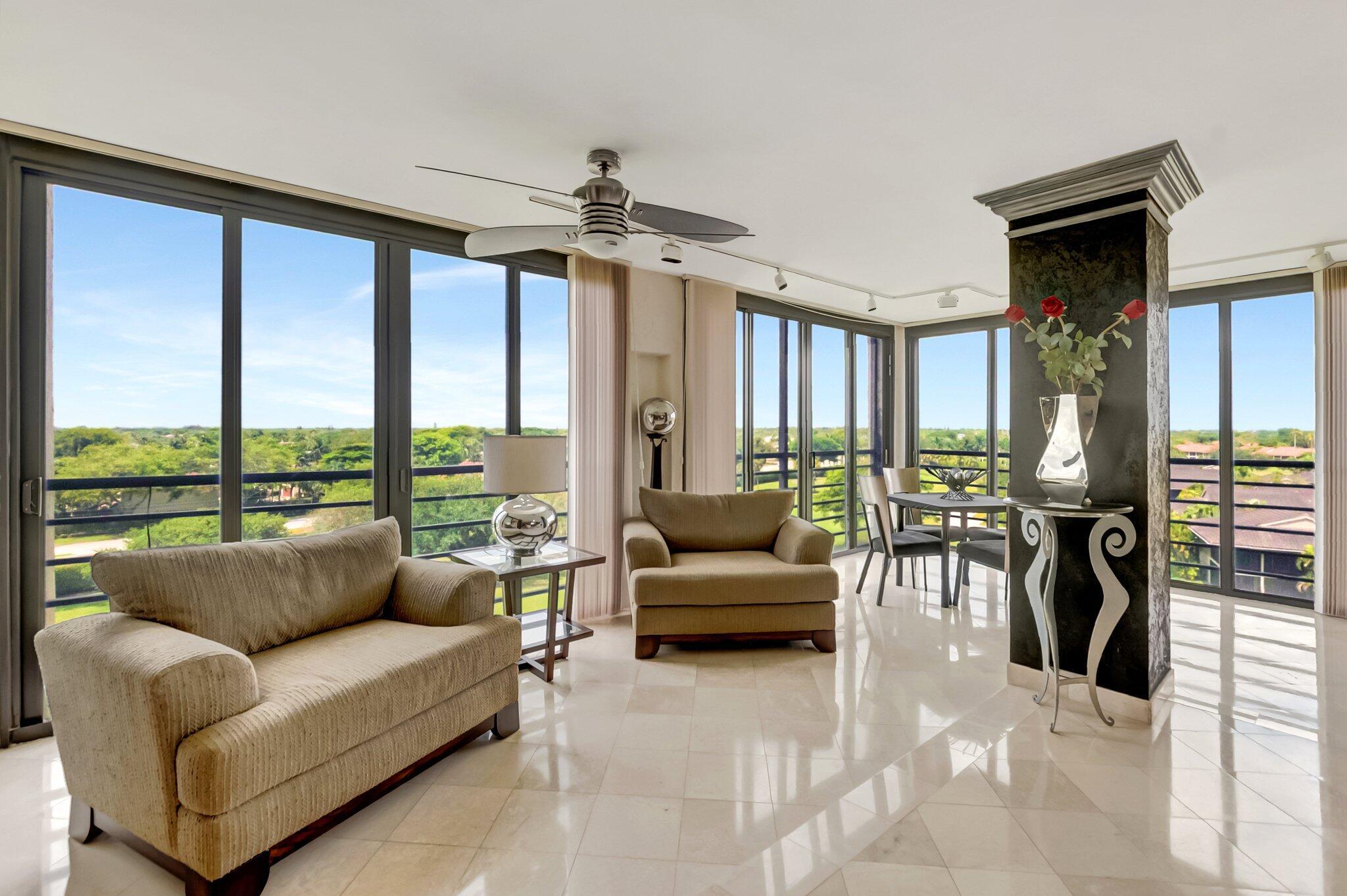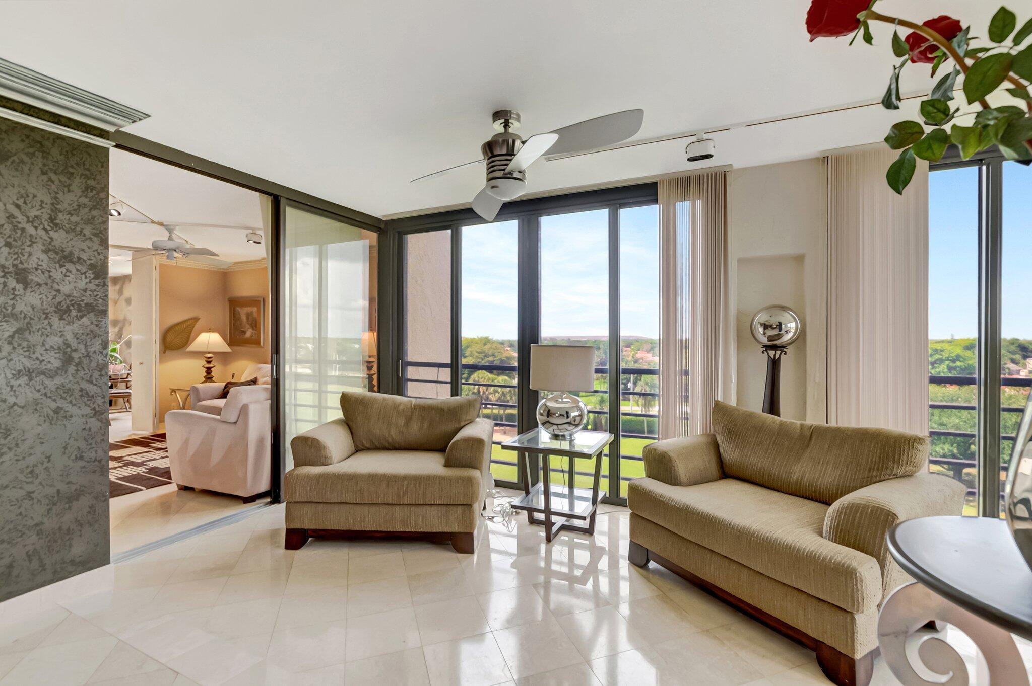 Stunning fully expanded Regency Model with Panoramic Views! This high-floor 3 bedroom 2.5 bath residence features a fully enclosed and expanded wraparound glass-enclosed patio for additional living space with impact glass doors, showcasing spectacular golf and water views with sought-after southwest exposure. Enjoy elegant marble flooring throughout and smooth ceilings in the main living areas for a sleek, modern feel. Custom built-in closets offer exceptional storage, including an additional closet in the living room. Sold fully furnished and move-in ready! Includes two assigned covered parking spaces--a rare bonus. Community features pool, community room and 24 hour manned gate.