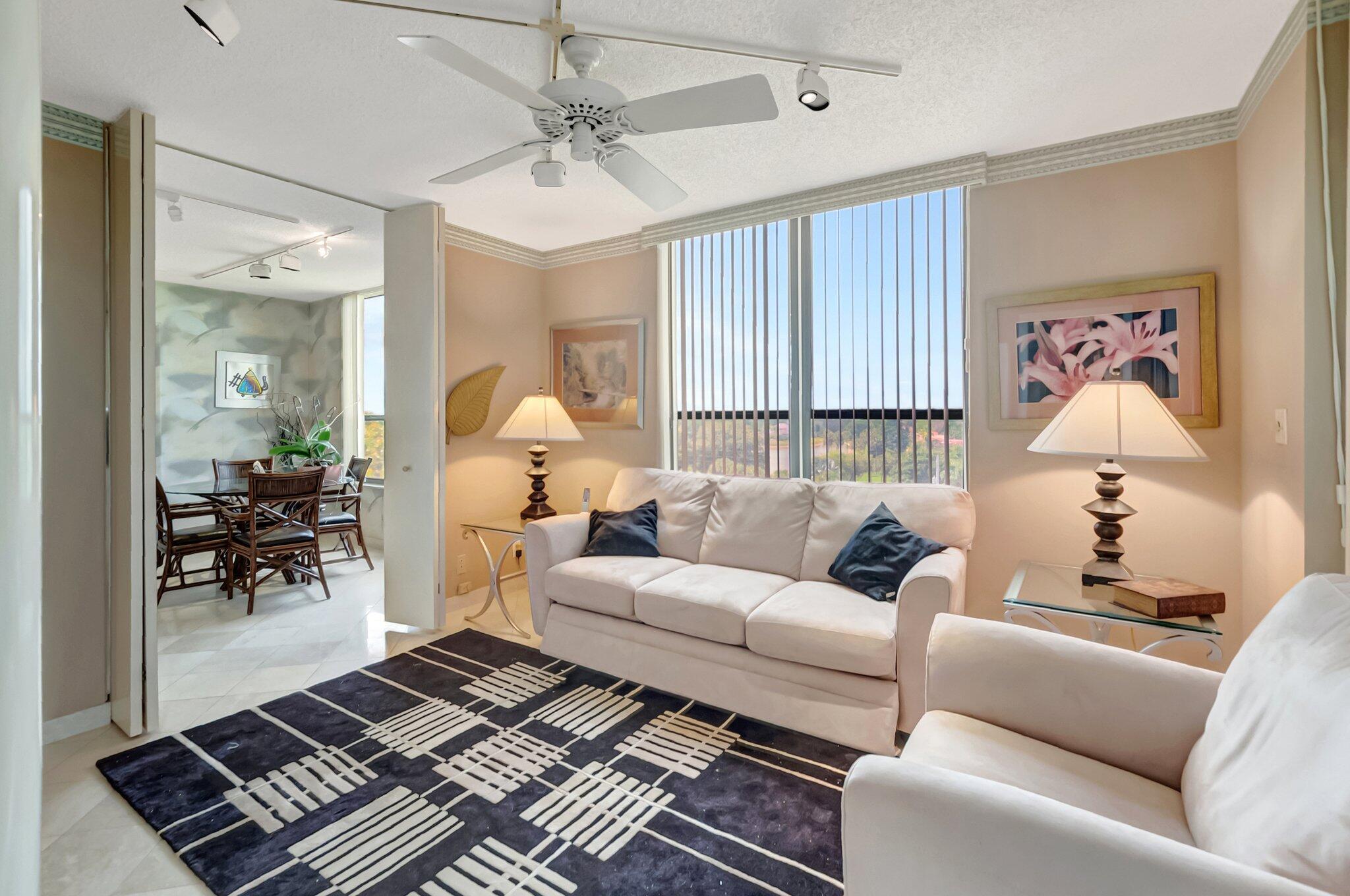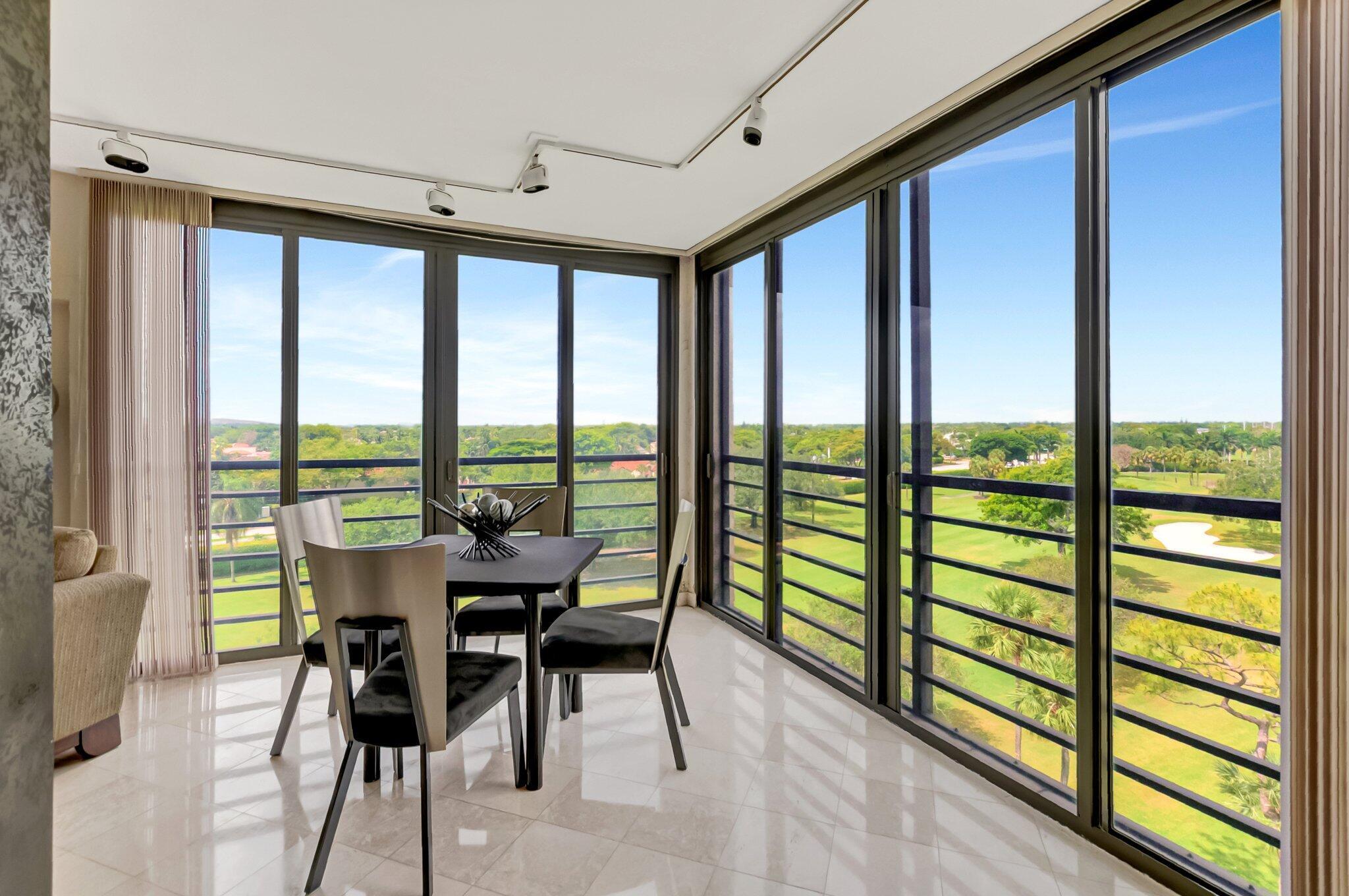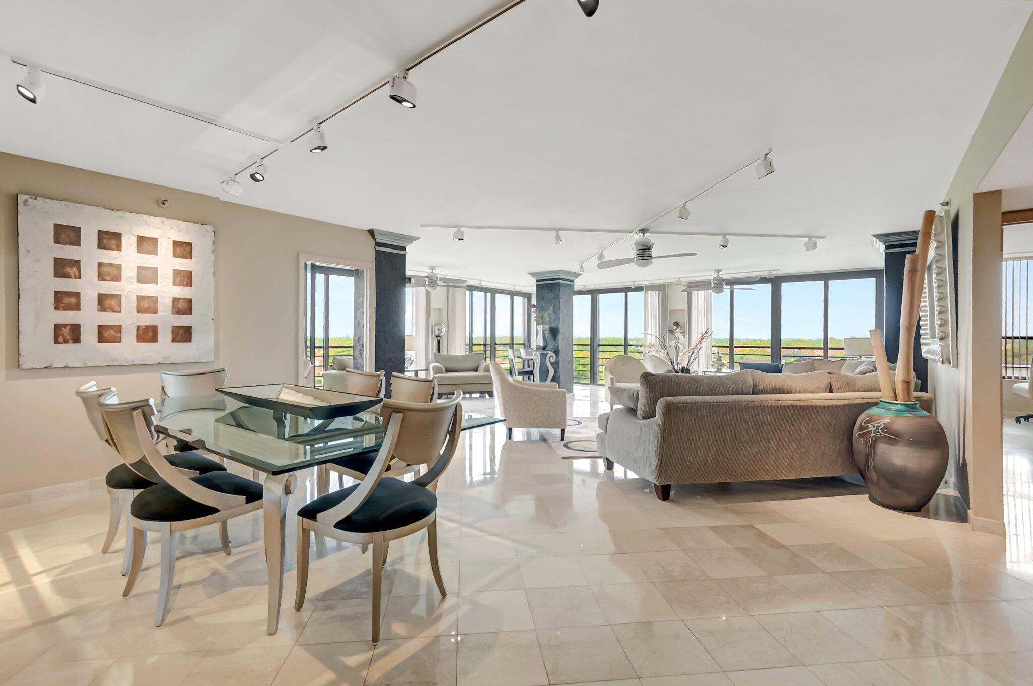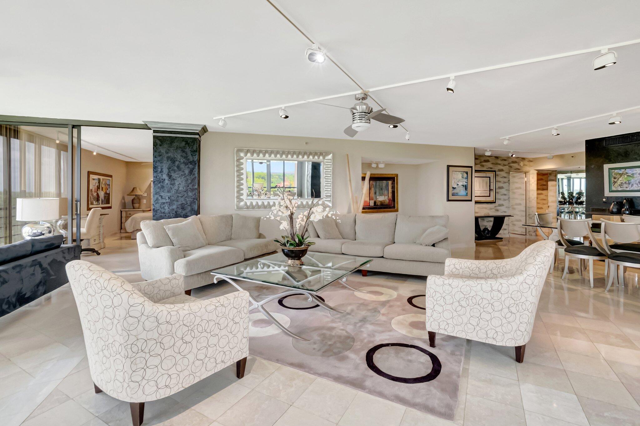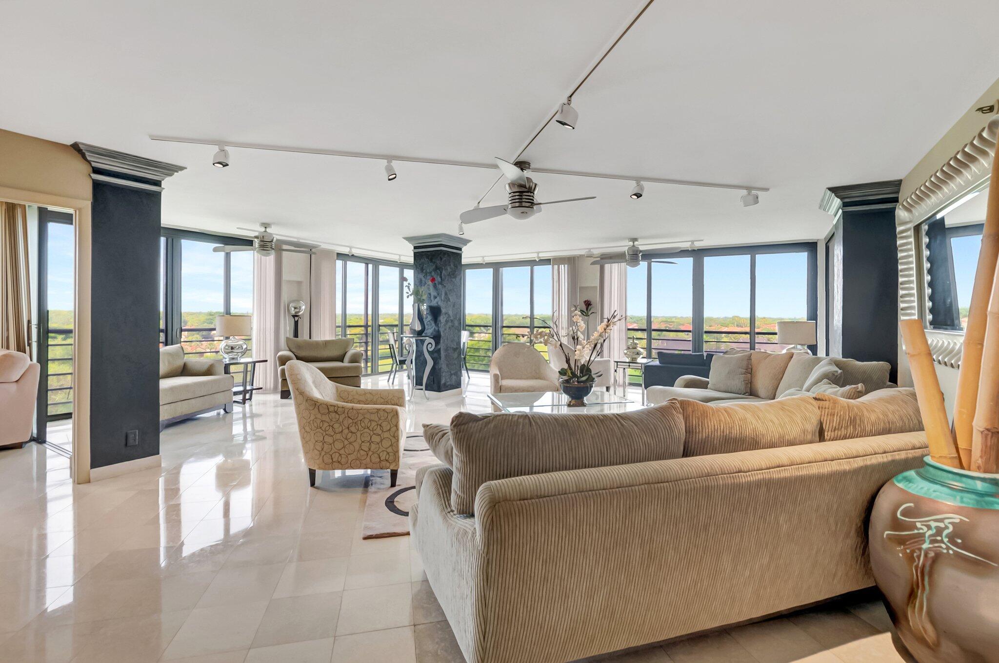 Stunning fully expanded Regency Model with Panoramic Views! This high-floor 3 bedroom 2.5 bath residence features a fully enclosed and expanded wraparound glass-enclosed patio for additional living space with impact glass doors, showcasing spectacular golf and water views with sought-after southwest exposure. Enjoy elegant marble flooring throughout and smooth ceilings in the main living areas for a sleek, modern feel. Custom built-in closets offer exceptional storage, including an additional closet in the living room. Sold fully furnished and move-in ready! Includes two assigned covered parking spaces--a rare bonus. Community features pool, community room and 24 hour manned gate.