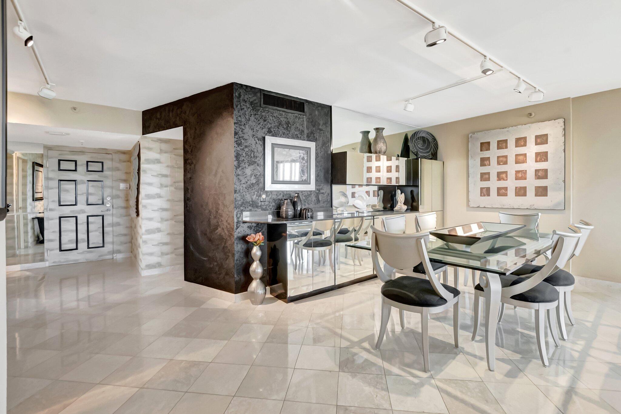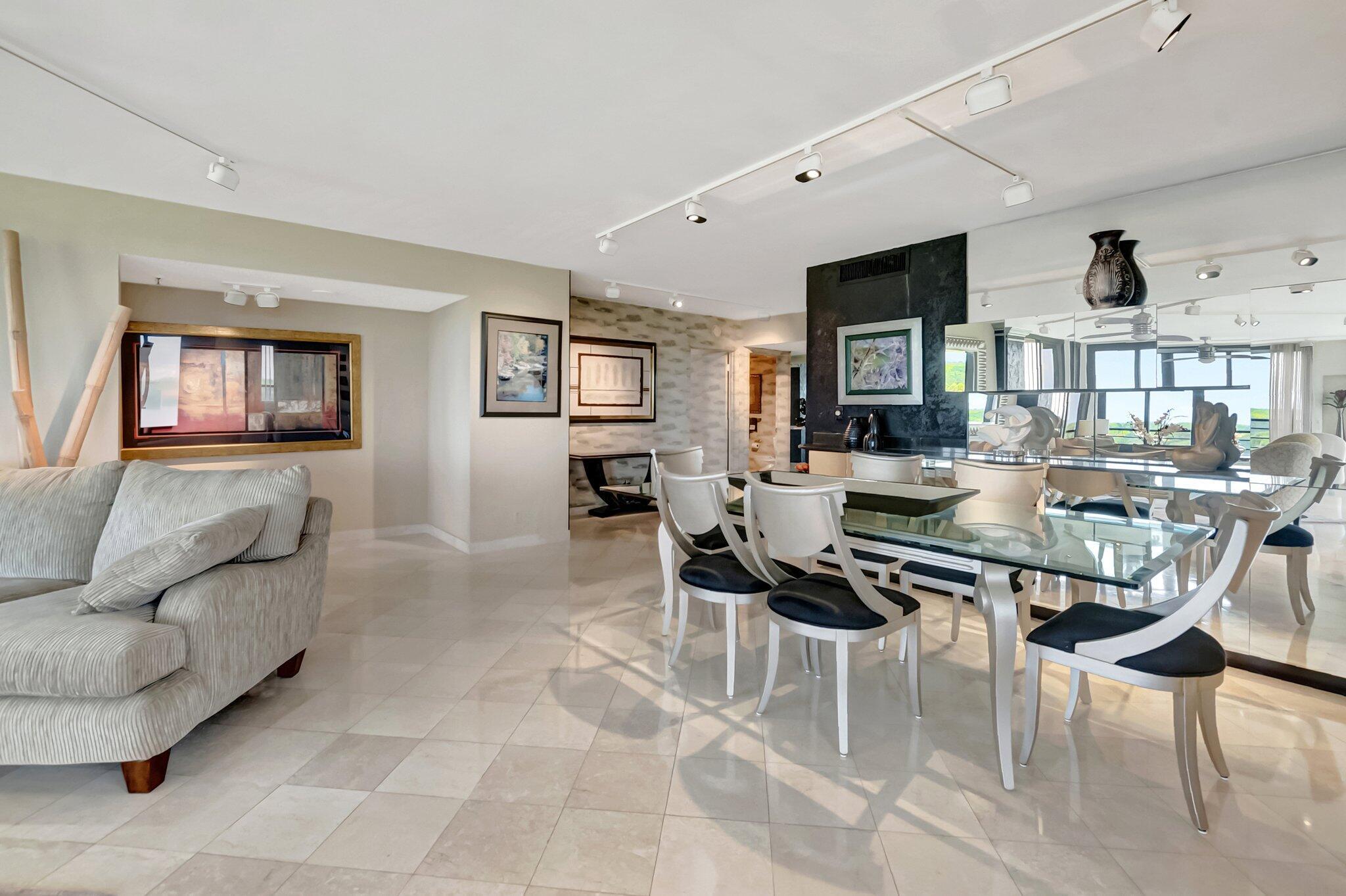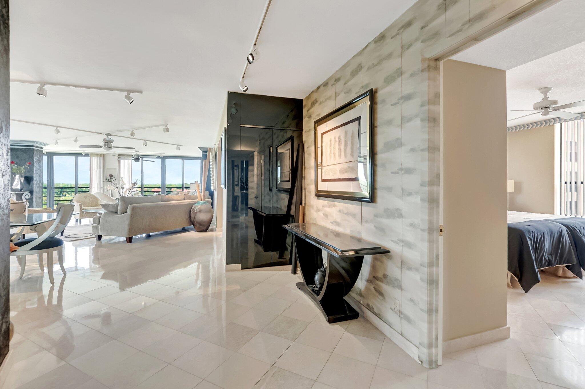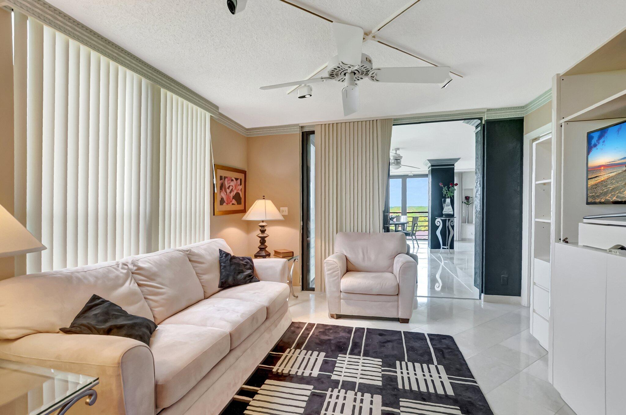 Stunning fully expanded Regency Model with Panoramic Views! This high-floor 3 bedroom 2.5 bath residence features a fully enclosed and expanded wraparound glass-enclosed patio for additional living space with impact glass doors, showcasing spectacular golf and water views with sought-after southwest exposure. Enjoy elegant marble flooring throughout and smooth ceilings in the main living areas for a sleek, modern feel. Custom built-in closets offer exceptional storage, including an additional closet in the living room. Sold fully furnished and move-in ready! Includes two assigned covered parking spaces--a rare bonus. Community features pool, community room and 24 hour manned gate.