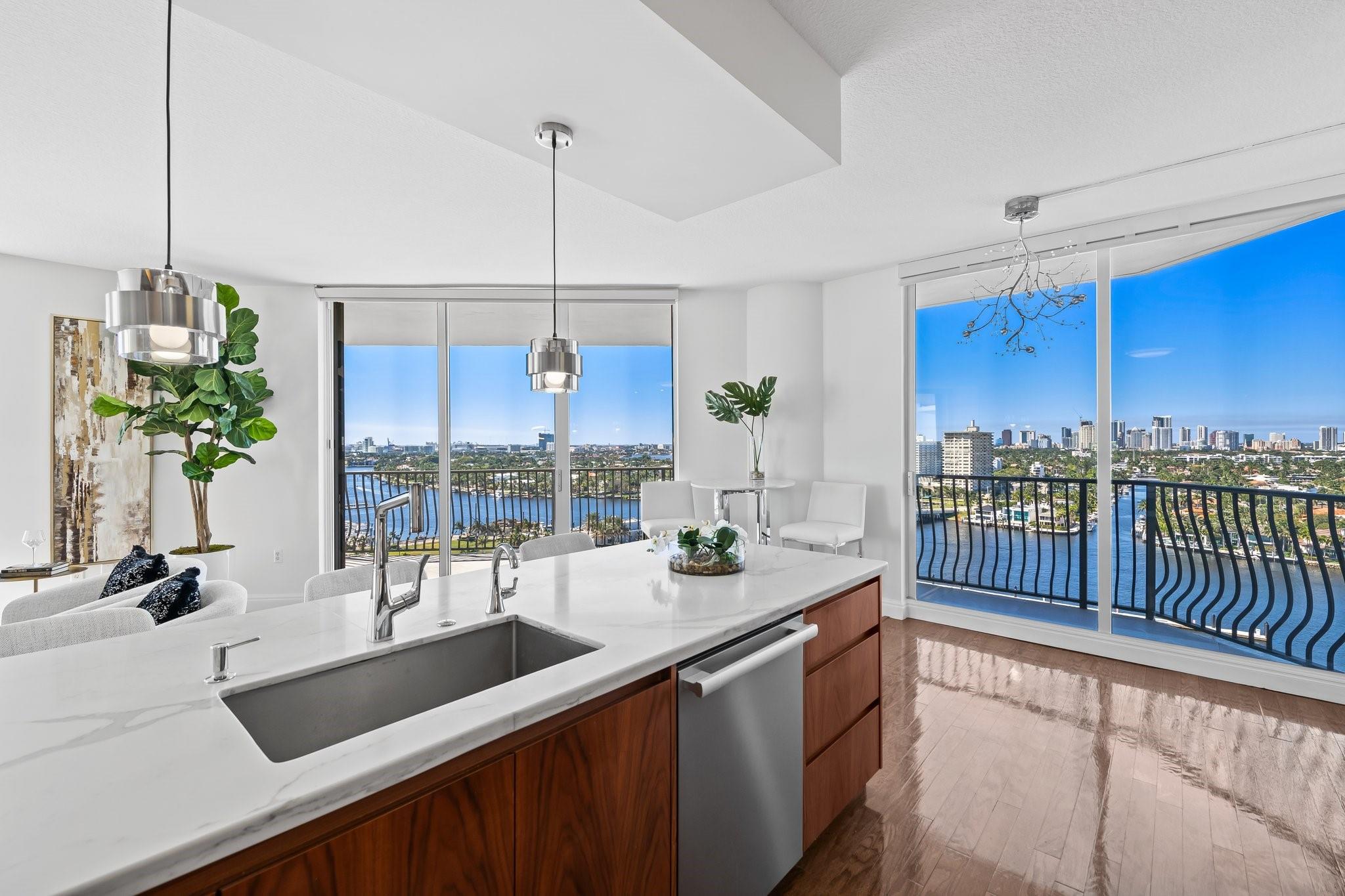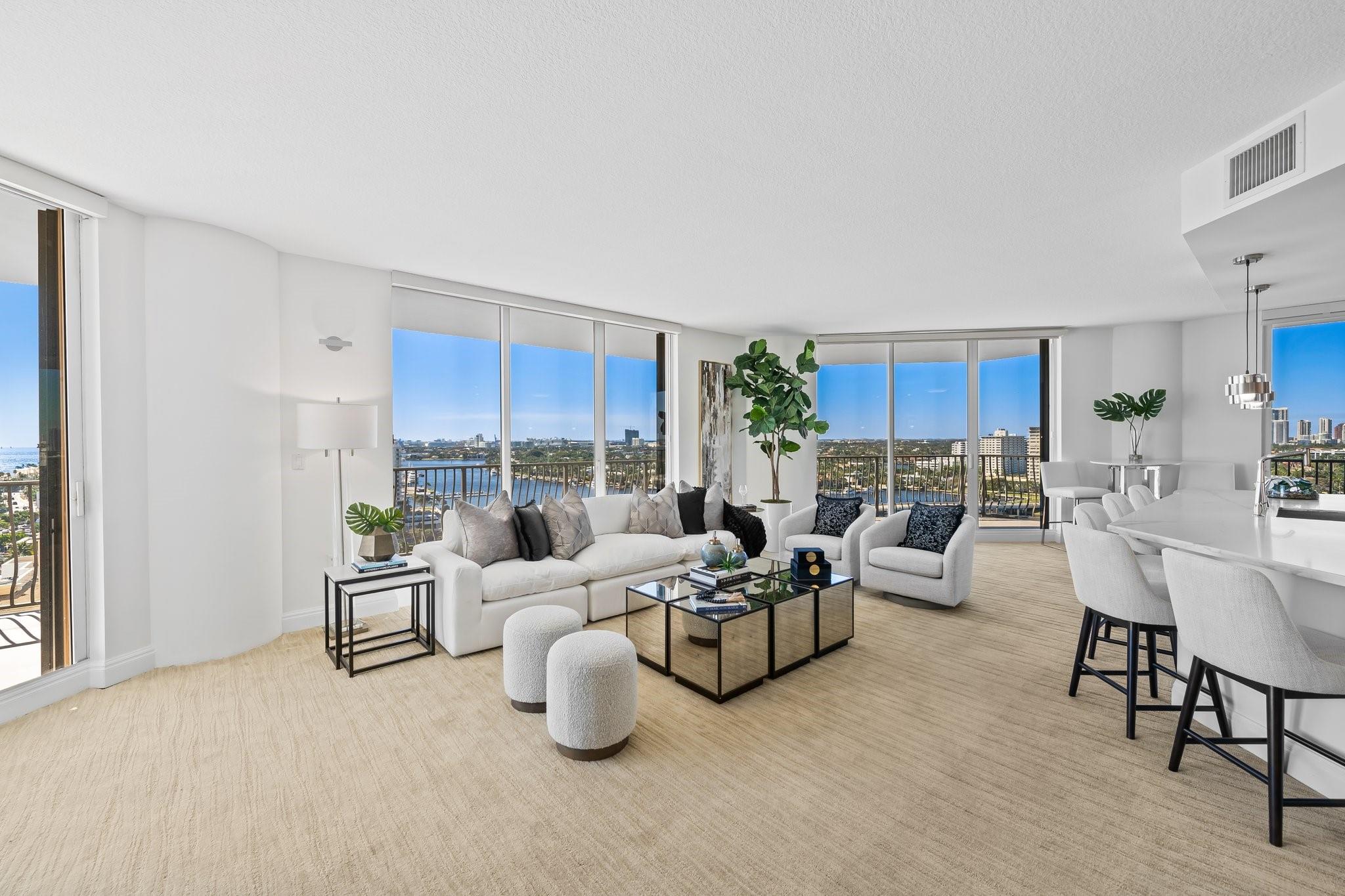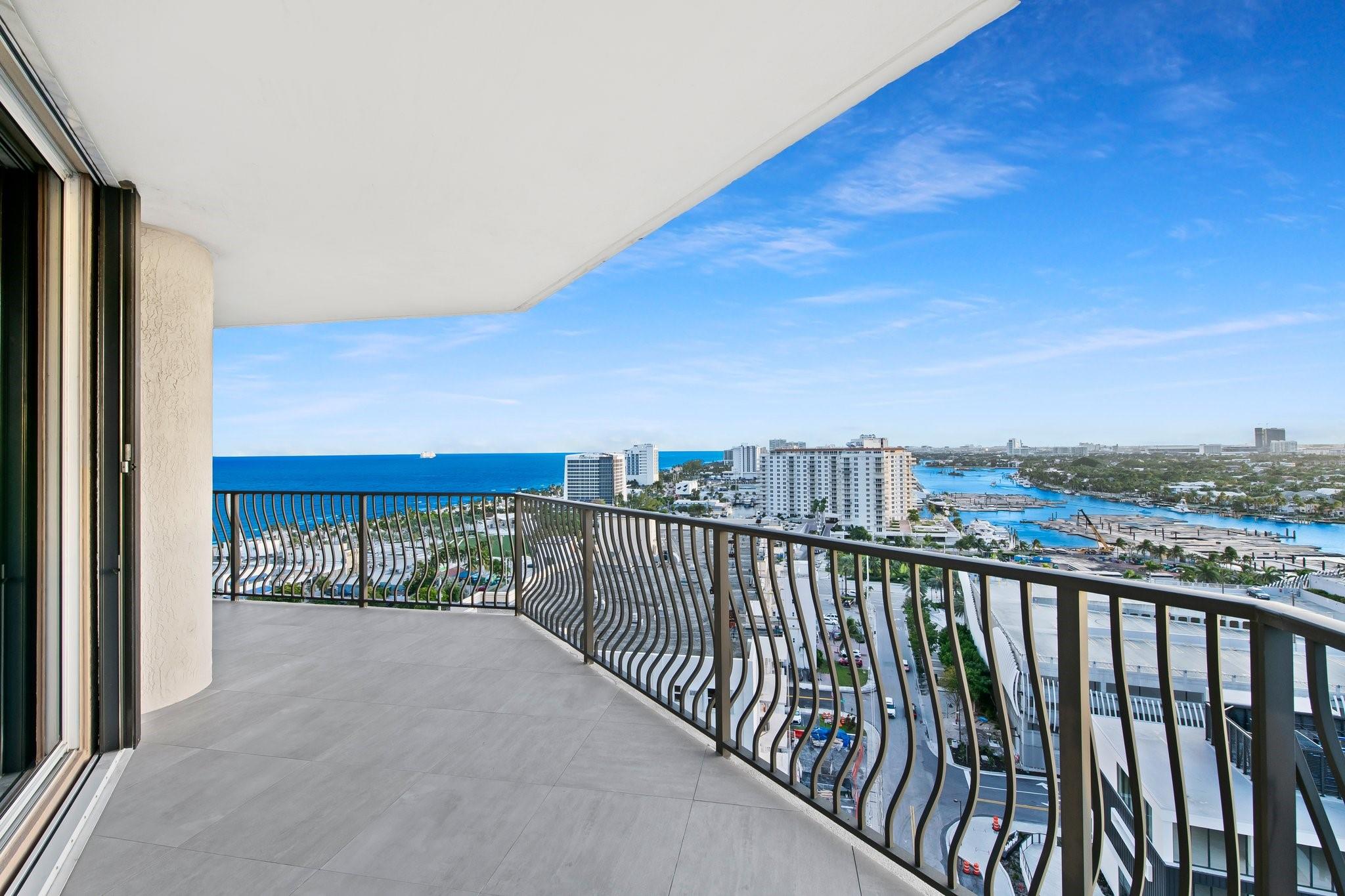 Incrrdible opportunity to own this rarely available SW corner true 3 BR, 2.5 BA residence with breathtaking views of the Intracoastal, ocean, and city and overlooking the new Las Olas Marina-the home to Mega Yachts. The newly renovated kitchen features premium Miele appliances, and the new primary bathroom ensures modern comfort. Floor-to-ceiling sliding glass doors connect indoor and outdoor spaces, creating an open, airy ambiance. Incredible oversized 715 SF wraparound terrace is great for sunset watching, relaxing and entertaining. A direct elevator access from the garage into a private foyer, provides both privacy & ease of access. The pet-friendly building offers amenities like a doorman, gym, heated pool, valet parking, and more, with additional parking space available for purchase.
