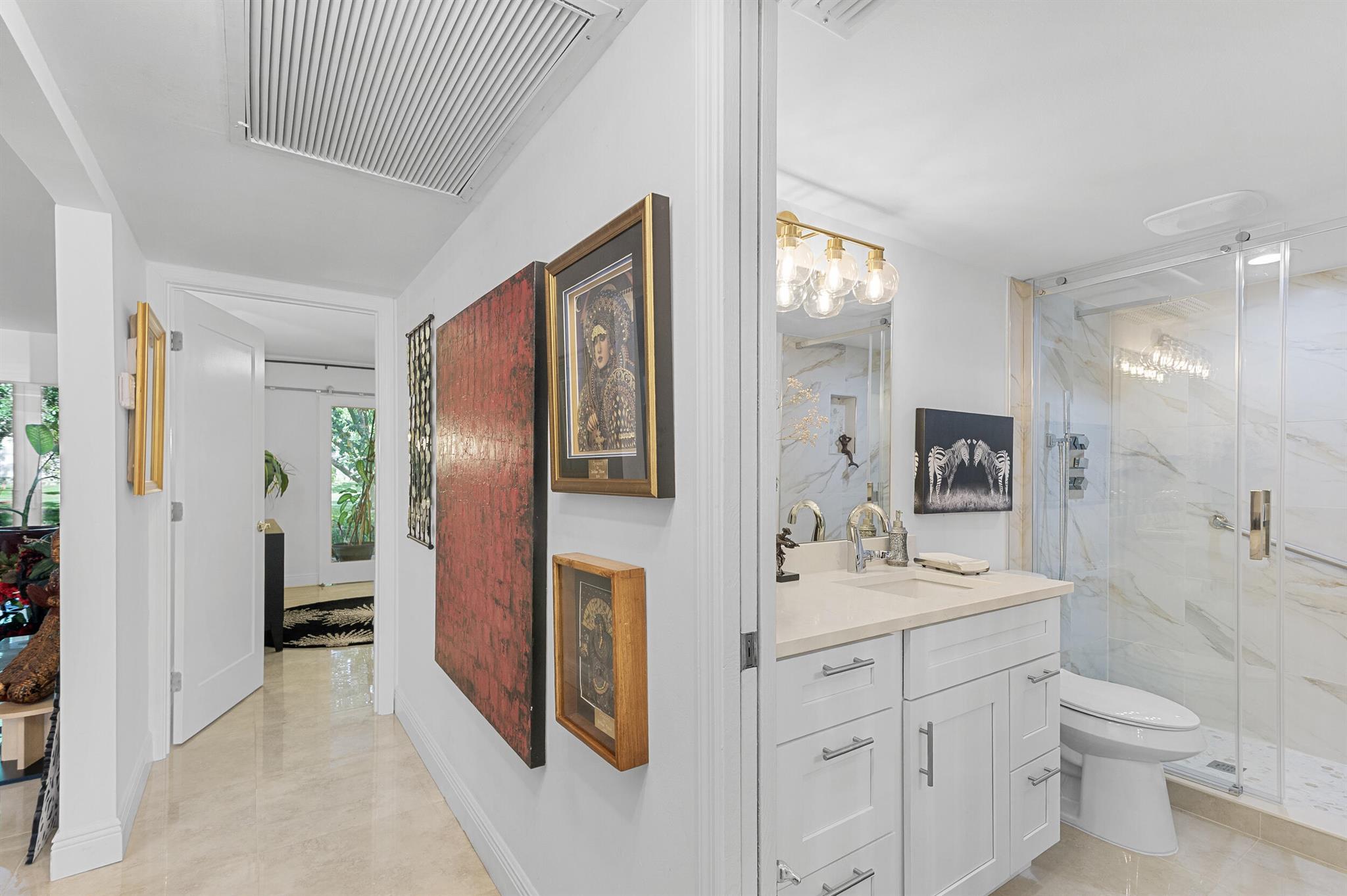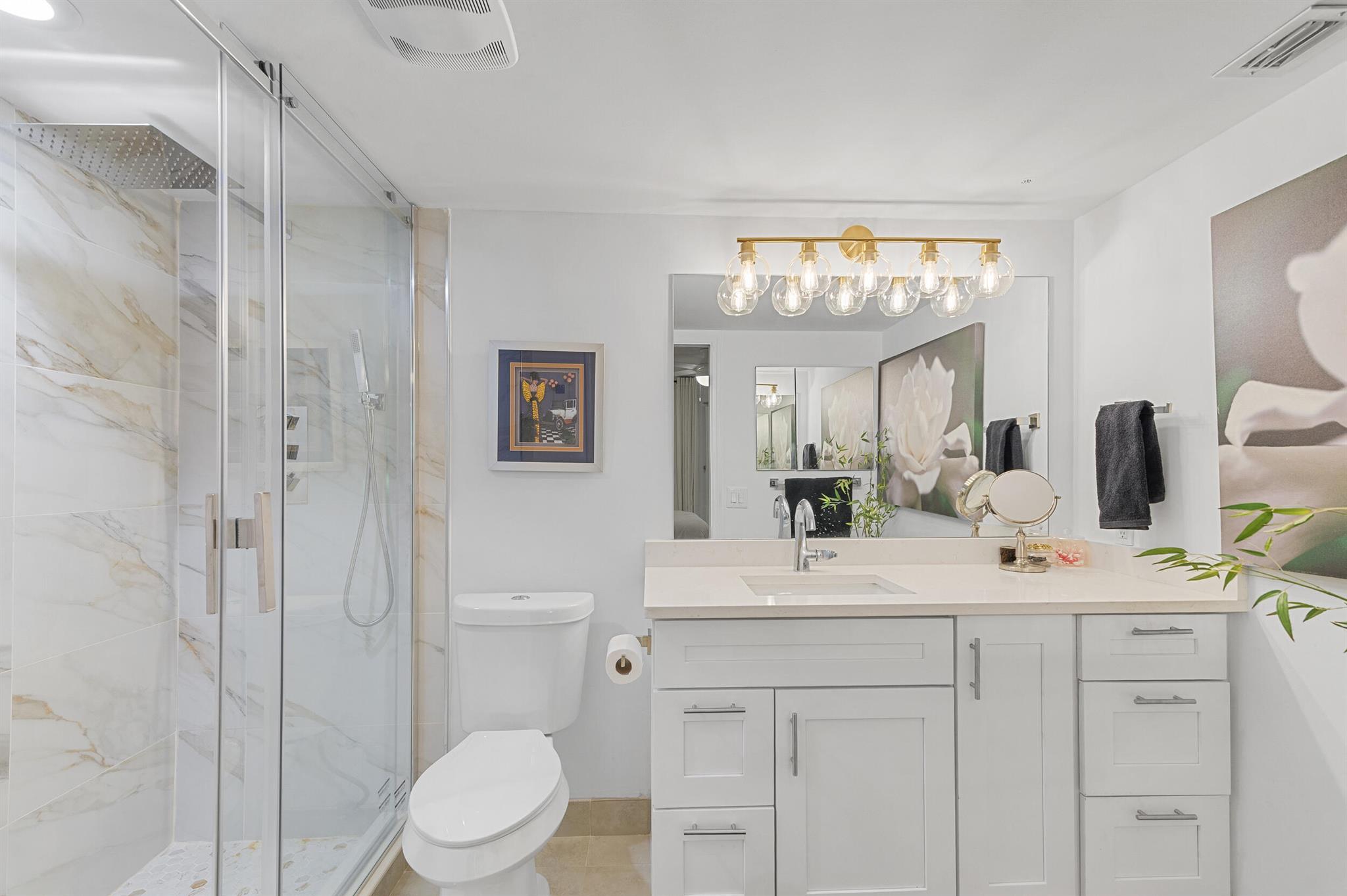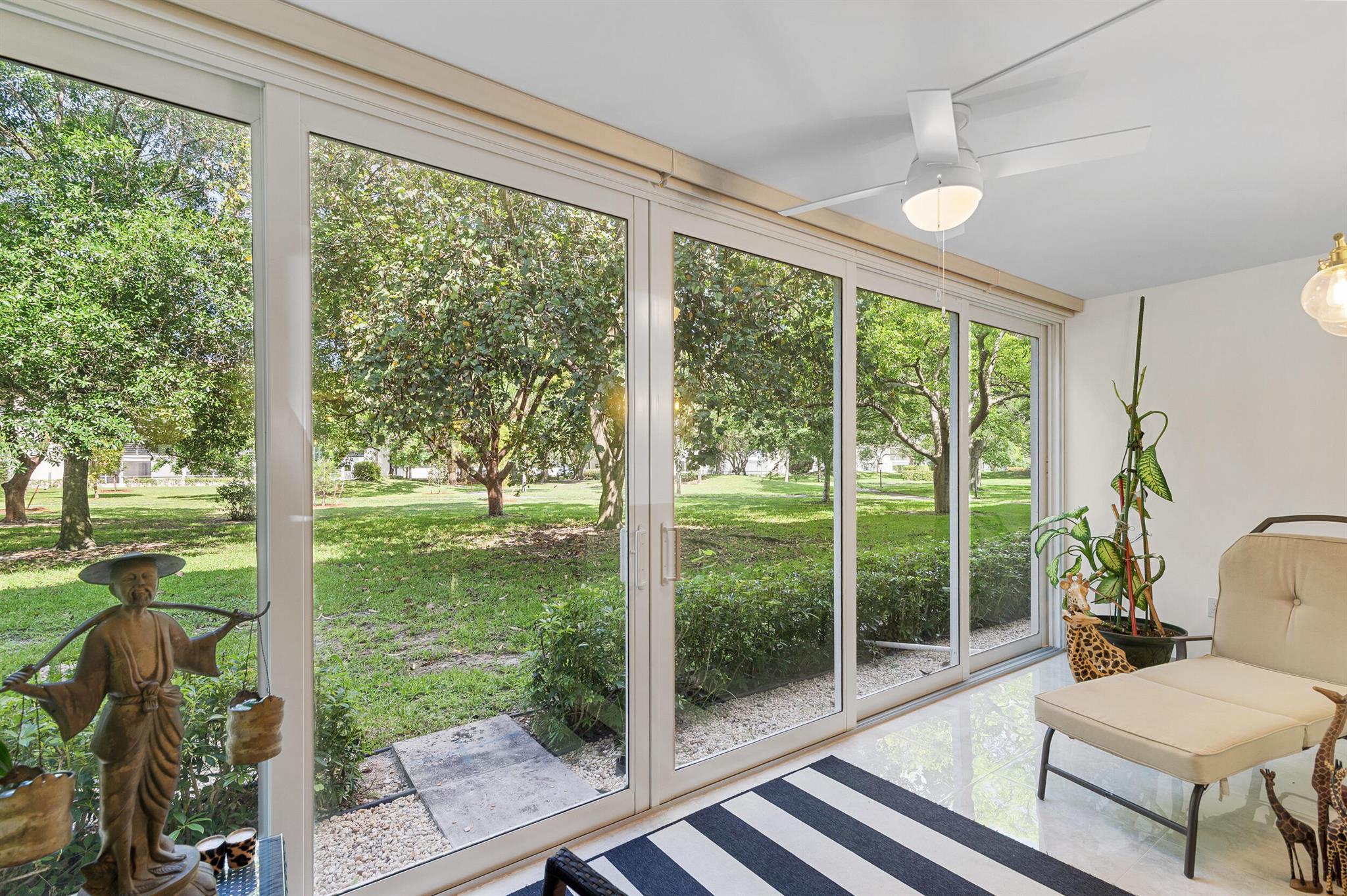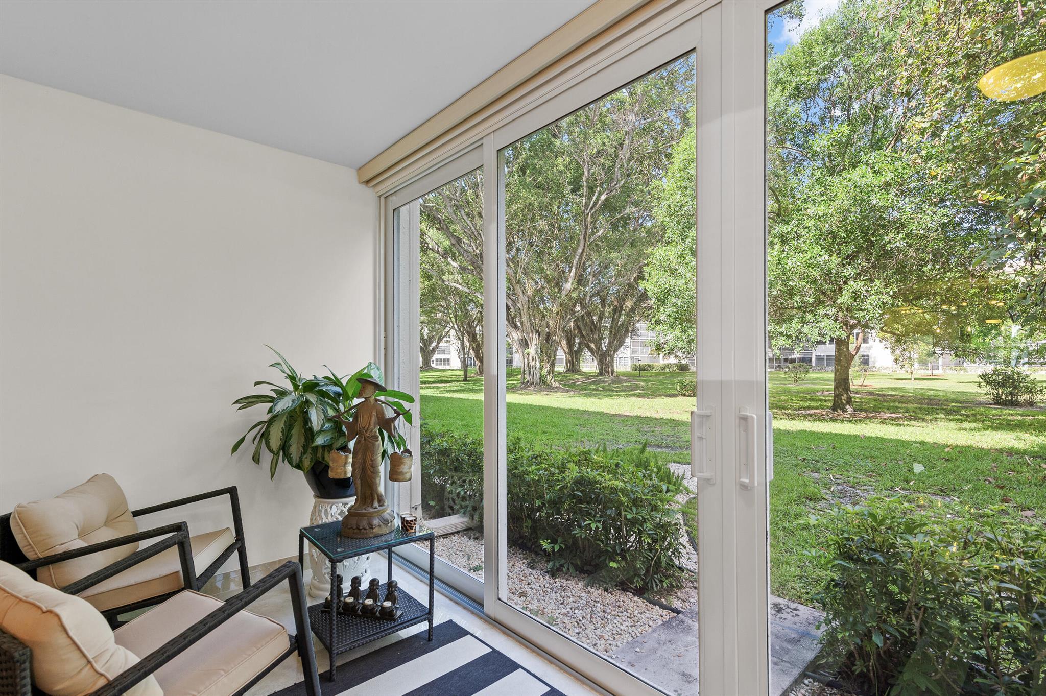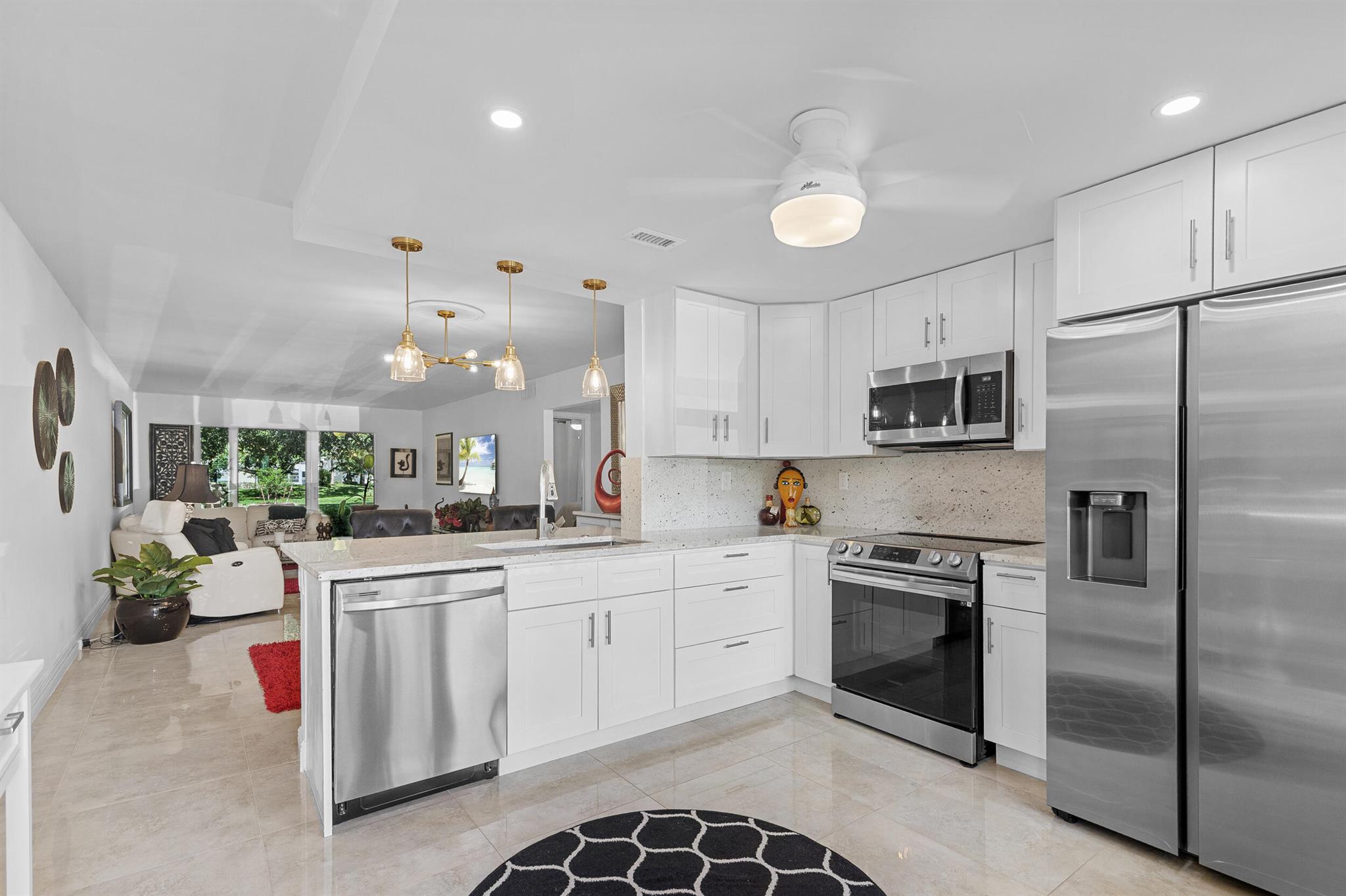 This exquisite 2BD/2BA 1st floor condo has been meticulously renovated with high-end finishes. Porcelain tile flooring and high-impact hurricane windows ensure elegance and safety. The open-concept kitchen boasts thick quartz countertops, shaker-style cabinets, stainless steel appliances, and full-height backsplash. A built-in quartz buffet enhances the dining area, perfect for entertaining. Luxurious bathrooms feature premium vanities, showers, and fixtures. Enjoy custom closets, designer lighting, barn doors, a new AC handler, and panoramic sliding glass doors with motorized window treatments, overlooking lush gardens. Assigned parking and storage with unit. All designer furniture and accessories are negotiable. Wynmoor offers pickle ball, golf, theatre, cafe on the green and MUCH MORE!