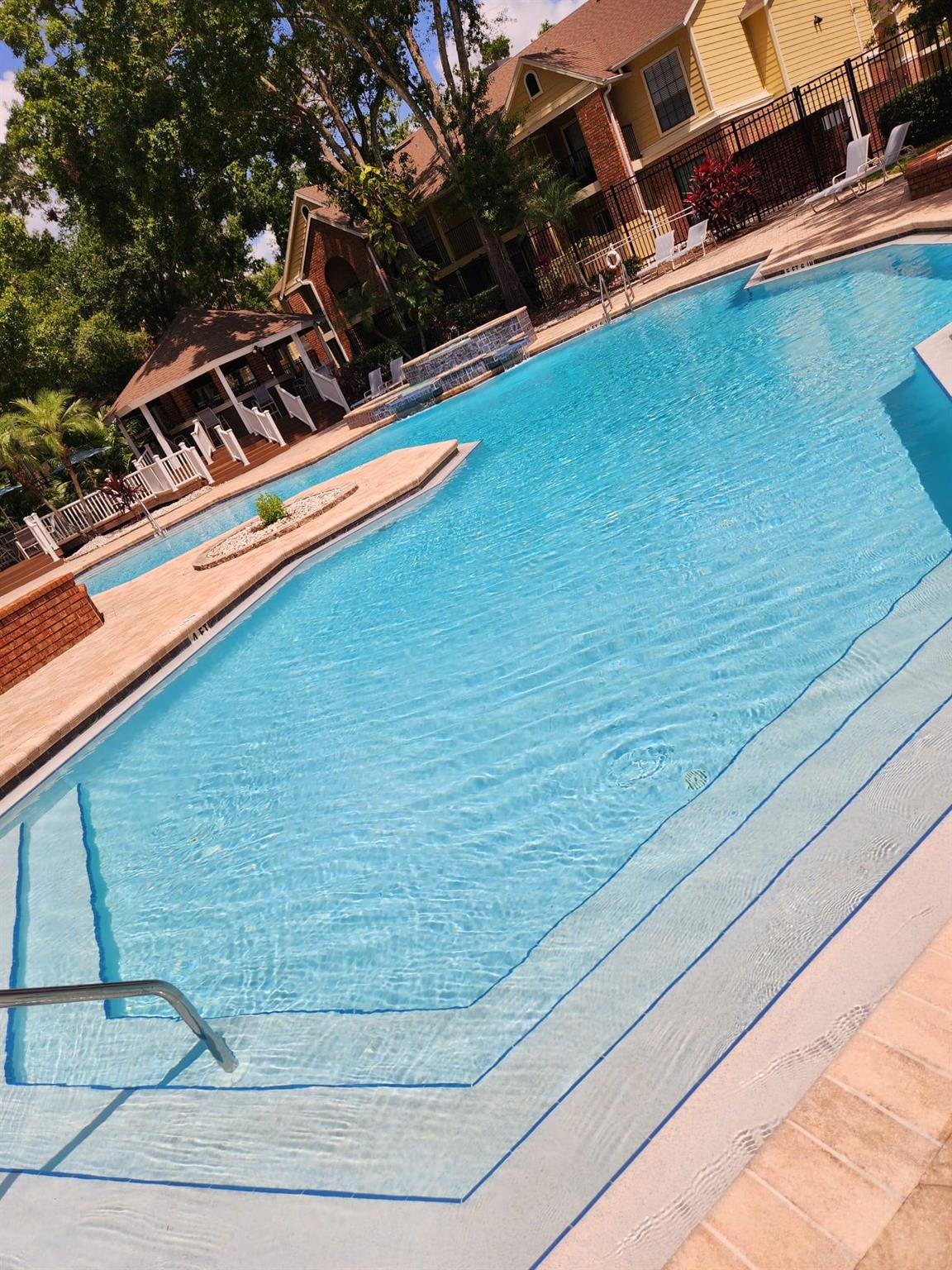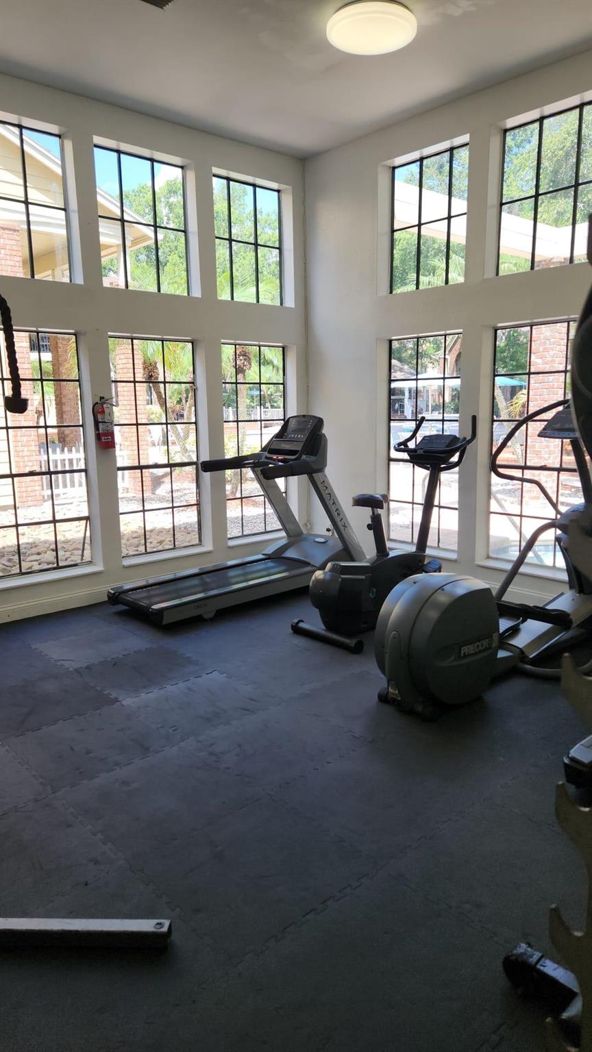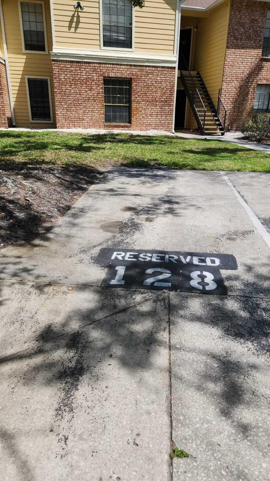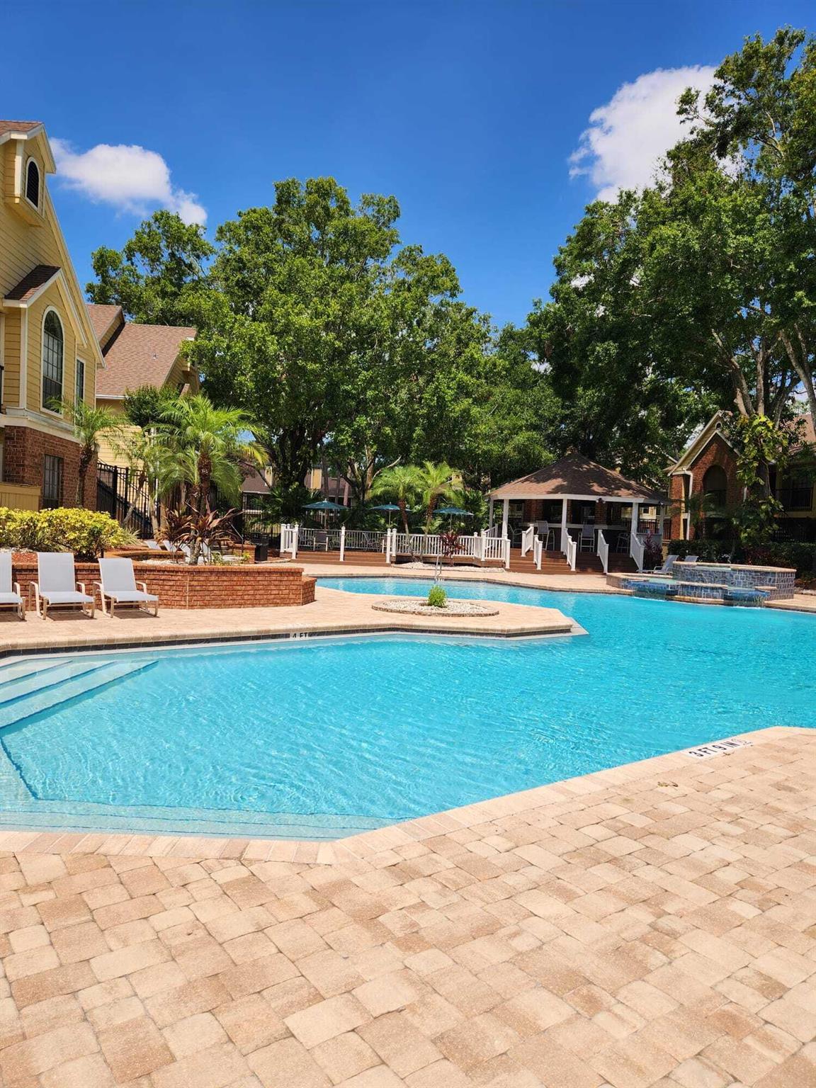 Move-in ready 2BR/2BA ground-floor condo in the gated Grand Reserve community! This well-maintained unit offers 1,027 sq ft of open living space with ceramic tile. Kitchen features modern cabinetry, countertops, and appliances including refrigerator, stove, and built-in microwave. Spacious primary suite includes a walk-in closet and private bath. A/C (2020), electrical panel (2017), and newer sliding doors. Private covered patio overlooks wooded area for peaceful views.Grand Reserve offers resort-style amenities including a large community pool, spa, fitness center, tennis courts, clubhouse, and walking paths. HOA fee includes trash, exterior maintenance, and access to all community feature. Pet-friendly (verify restrictions with HOA).