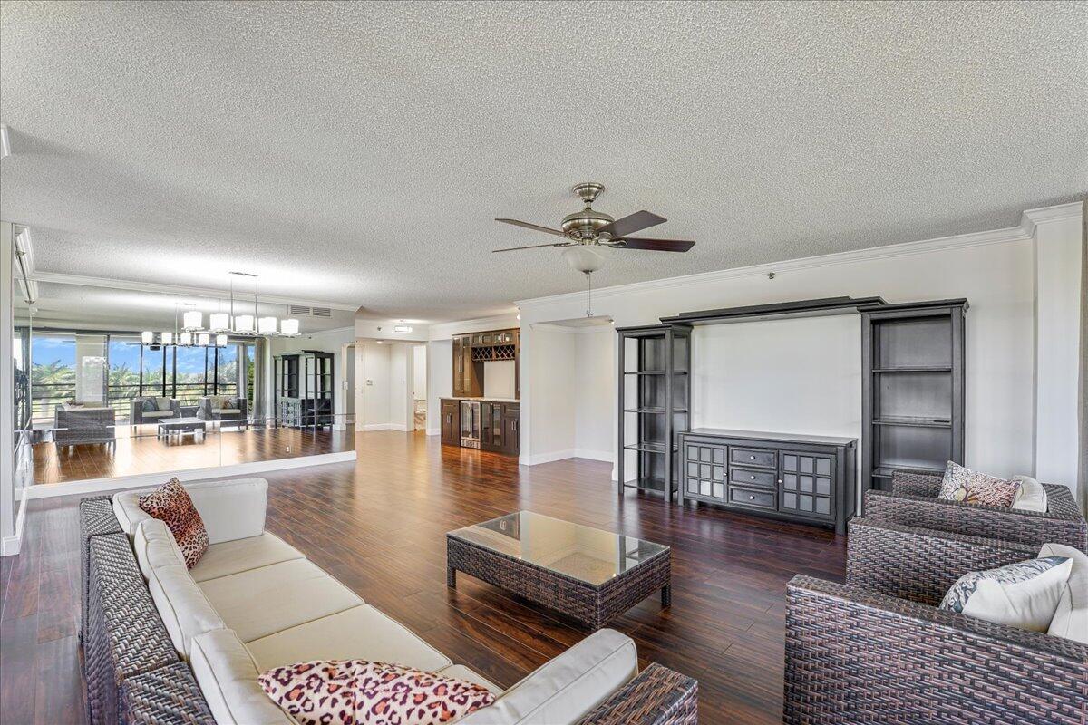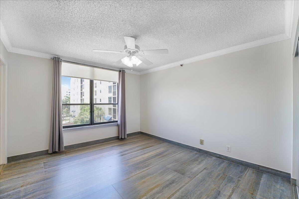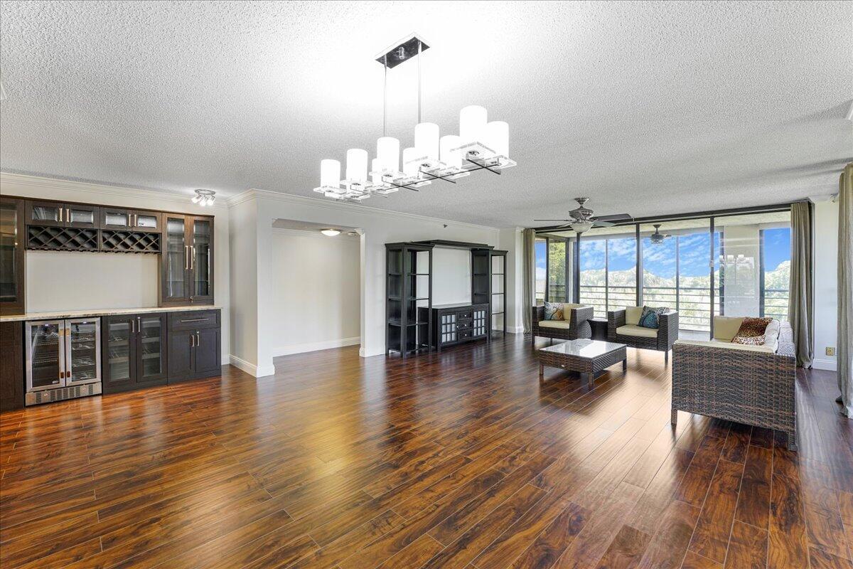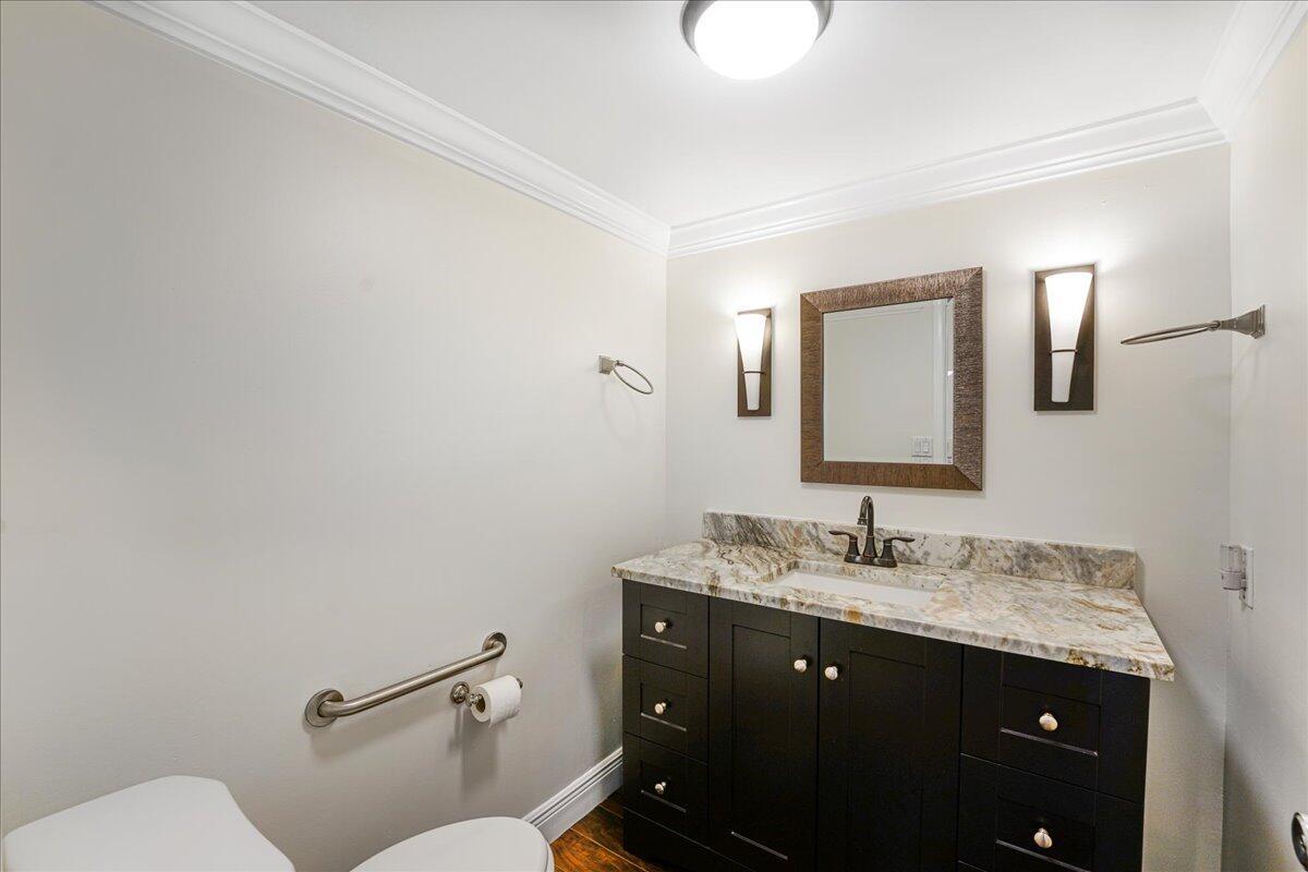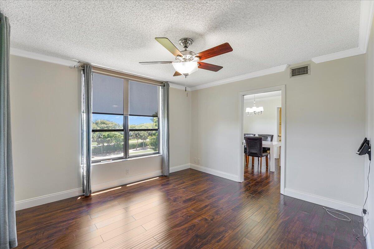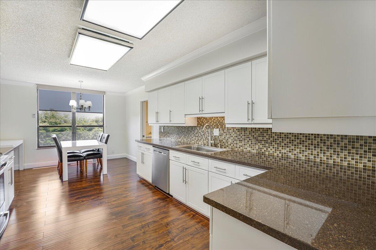 Freshly Painted, Laminate Floors Built-in Bar. Kitchen with white cabinets, granite counters, stainless steel appliances, and glass tile backsplash. Large, enclosed patio with Southeast exposure with electric sunshades. Bedrooms has crown molding. Newly updated 2nd & half bath. Large built-in closet.