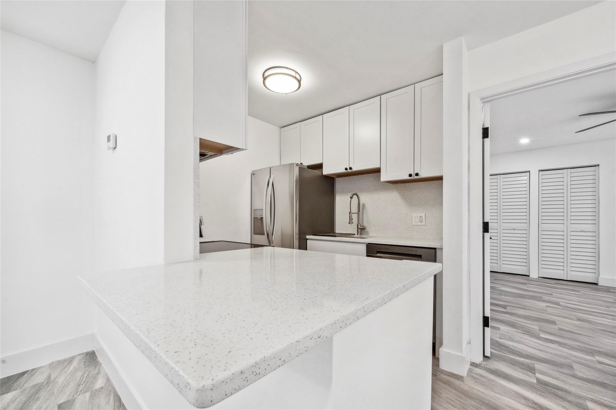 Nestled in the heart of Boynton Beach is this fully renovated 2-bed, 2-bath condo. This unit offers a fresh, modern interior featuring vinyl flooring throughout, updated LED lighting & spacious living area. The kitchen is outfitted with sleek quartz countertops, soft-close white shaker cabinetry & stainless steel appliances. Both bathrooms have been updated with new vanities, tile & fixtures. Step outside to enjoy a private balcony upstairs and a fully fenced-in patio below, ideal for outdoor living & pets. The community includes a pool, tennis courts & scenic lake views. Conveniently located just minutes from I-95, the beach, shopping & dining