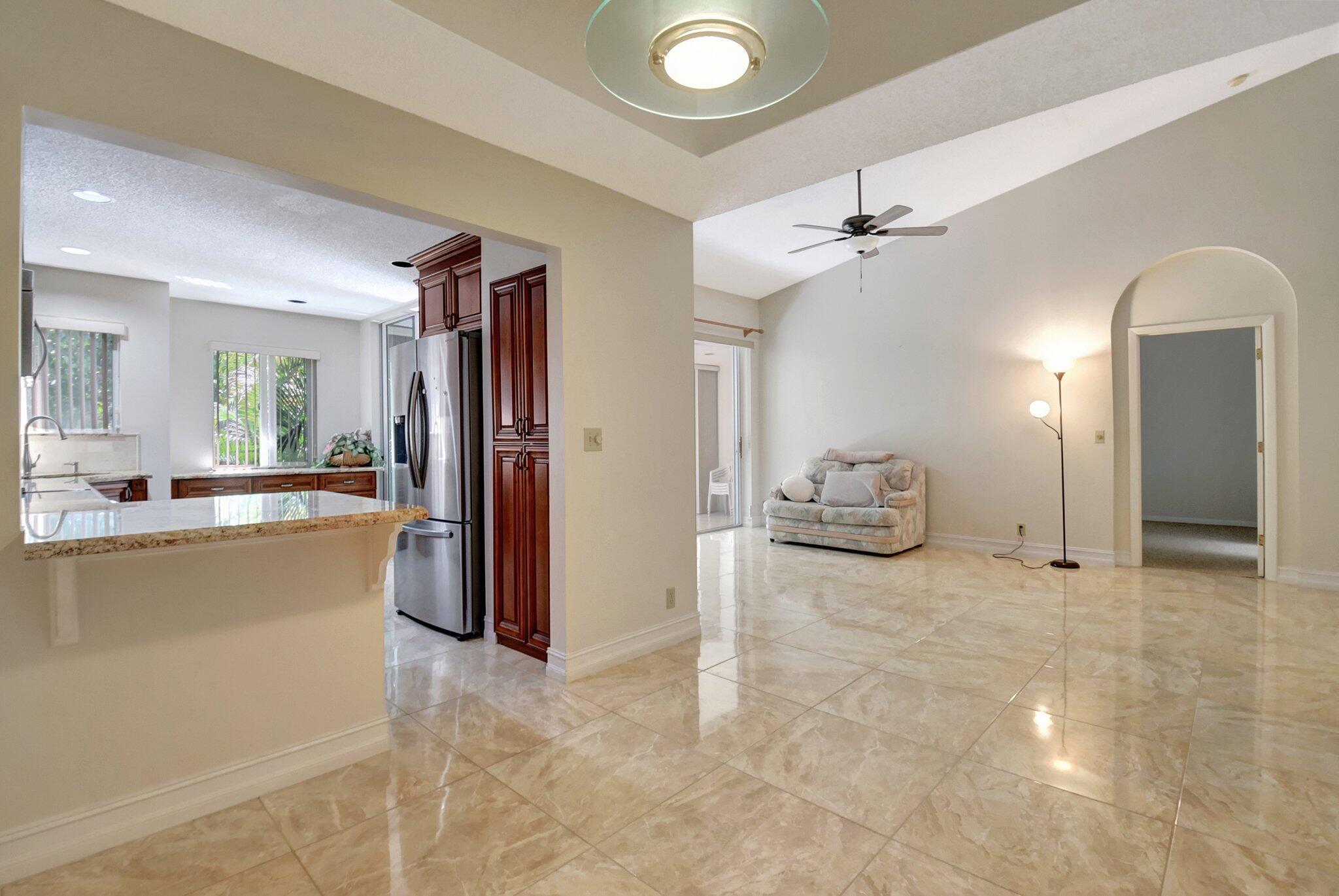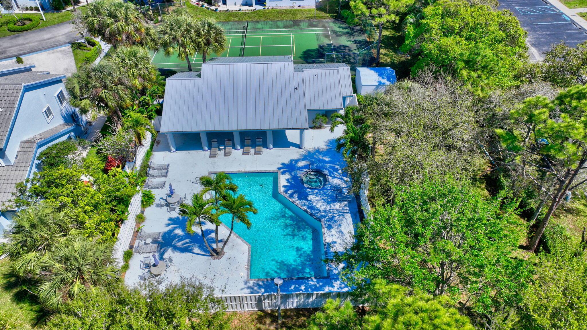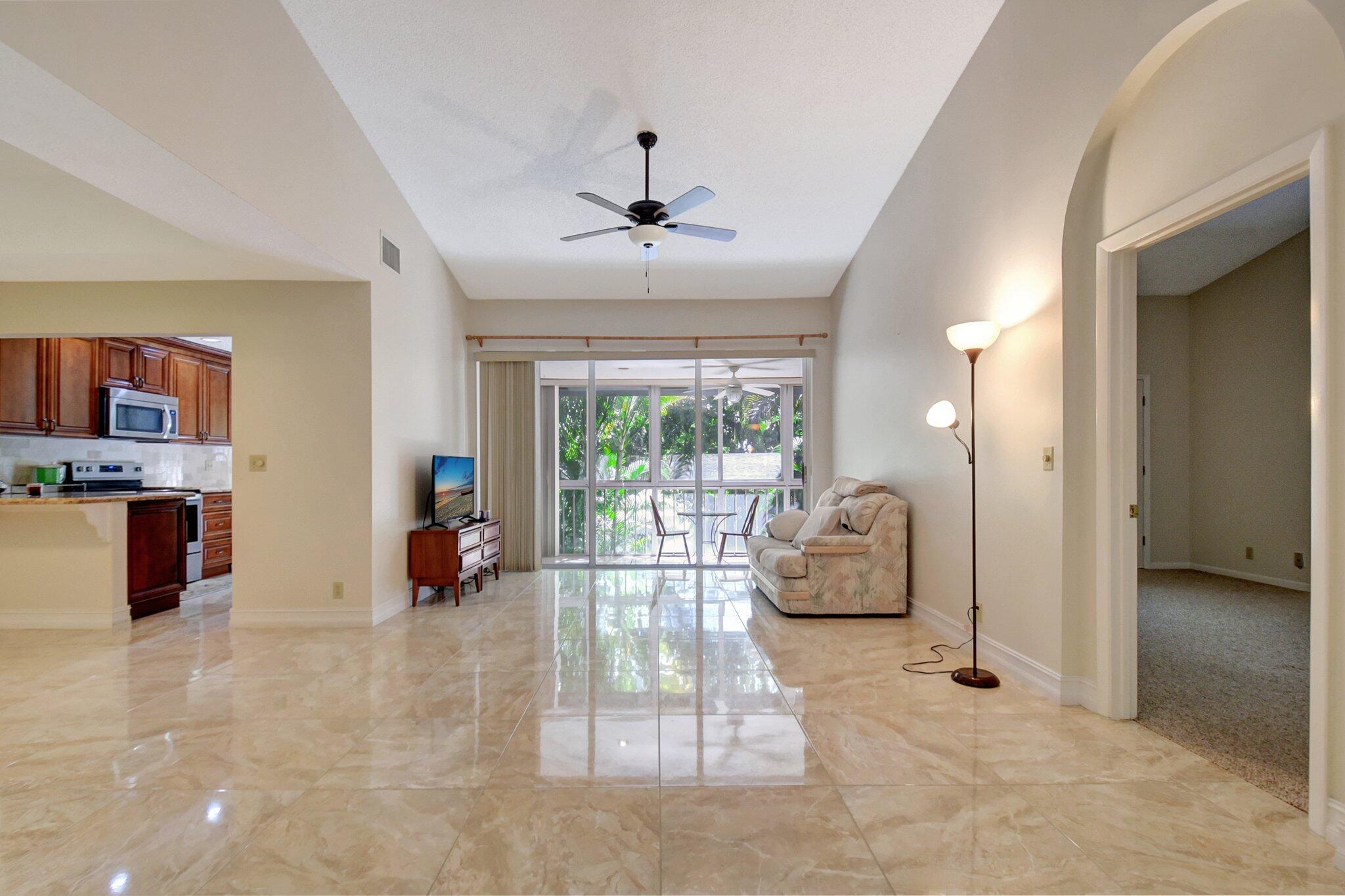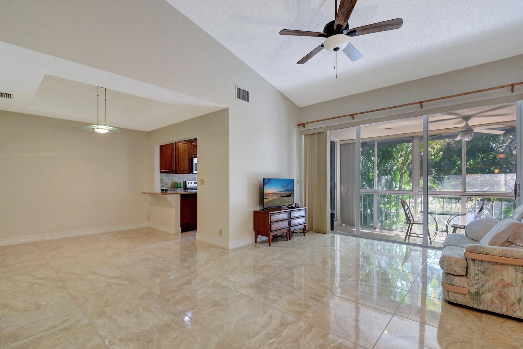 Enjoy serene water views from the lanai, which can be enjoyed as either an open-air or air-conditioned space. This beautifully remodeled second-floor condo/townhome features a split-bedroom floor plan and the convenience of a private garage. The kitchen is a standout with ample cabinetry, granite countertops, and large, modern tile flooring that extends through the main living areas. Vaulted ceilings throughout create a bright and open atmosphere, making the home feel spacious and inviting. Meticulously maintained with a new roof installed in 2023. Community Pool & Tennis Court