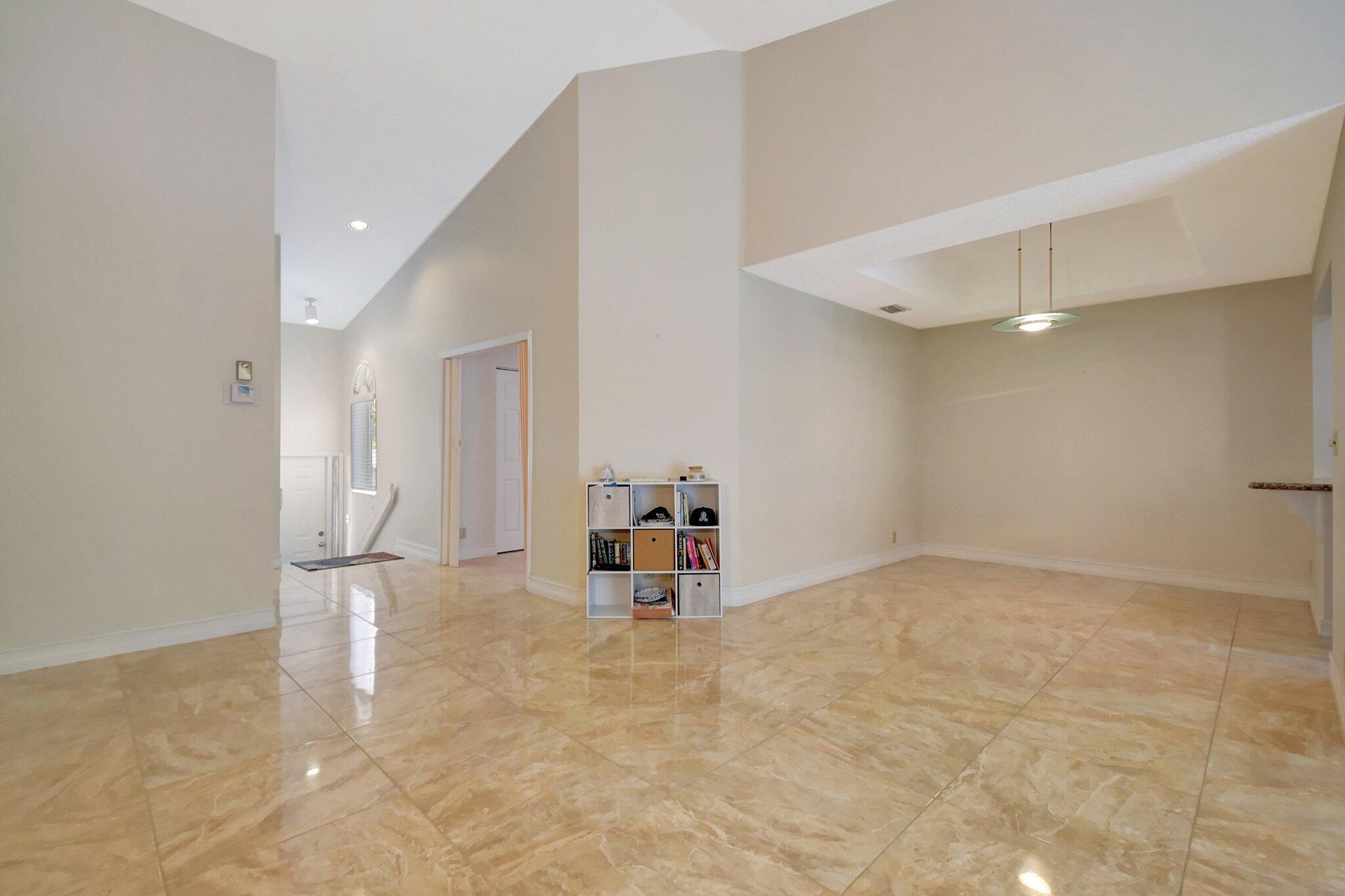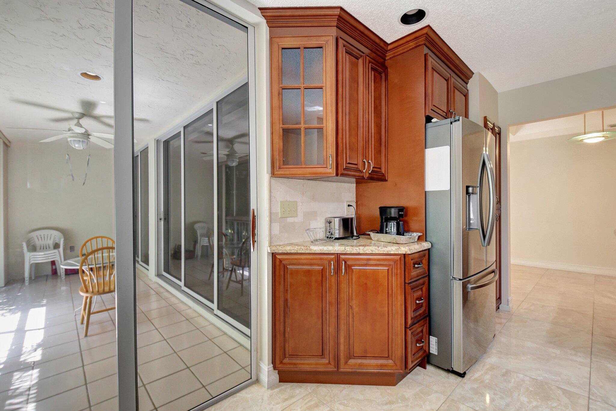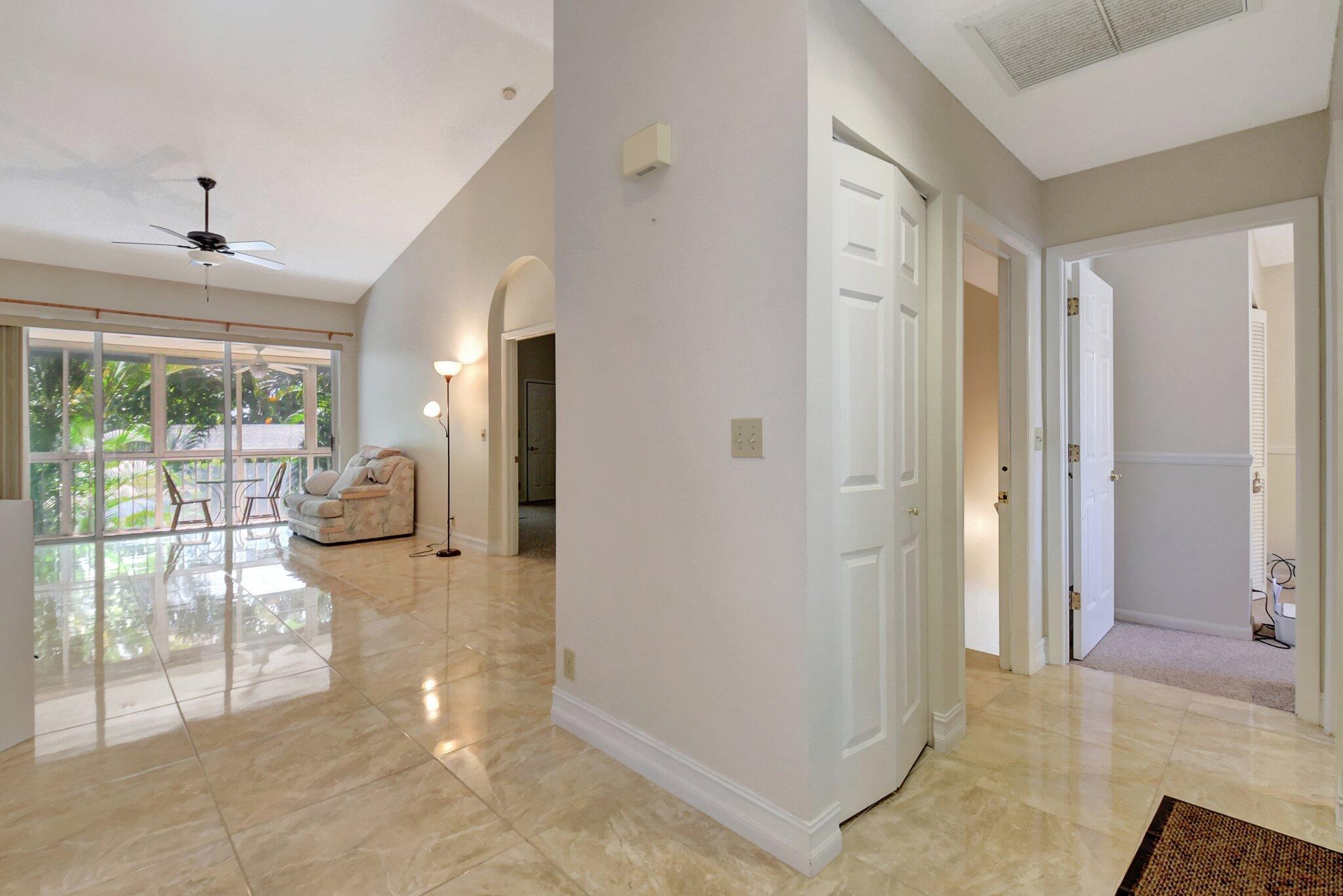 Enjoy serene water views from the lanai, which can be enjoyed as either an open-air or air-conditioned space. This beautifully remodeled second-floor condo/townhome features a split-bedroom floor plan and the convenience of a private garage. The kitchen is a standout with ample cabinetry, granite countertops, and large, modern tile flooring that extends through the main living areas. Vaulted ceilings throughout create a bright and open atmosphere, making the home feel spacious and inviting. Meticulously maintained with a new roof installed in 2023. Community Pool & Tennis Court