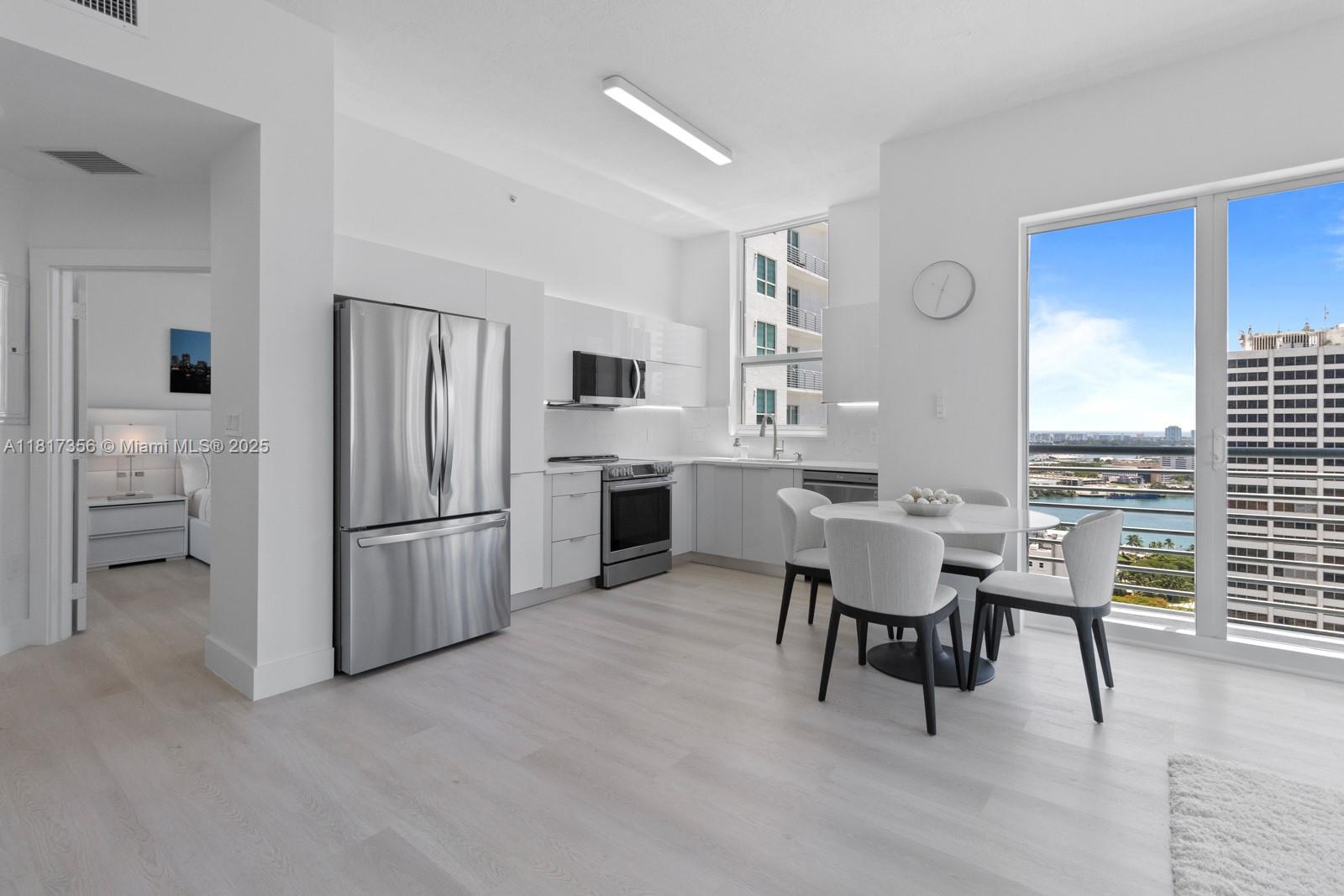BEST PRICE! For this Exquisite residence renovated to perfection! High floor, Corner exposure with views of the bay. Floor plan consists of two private bedrooms, a living room anchored by two large sliding glass doors that enhances the home with lots of Natural Light. Once the sun goes down, the lights come on! Features include high ceilings, open kitchen, spacious baths, washer and dryer. Enjoy this completely renovated residence from kitchen to baths, all appliances and modern furnishings including a new A/C Unit! Building offers 24hrs front desk attendant, secured entry, rec room w/pool table, rooftop pool, rooftop gym w/locker room & sauna, lap pool in a serene setting, & more. Walk to the Arena, Bayside, Theaters, Museums, Brickell, & 7 miles to So Beach! COME VIEW TODAY!