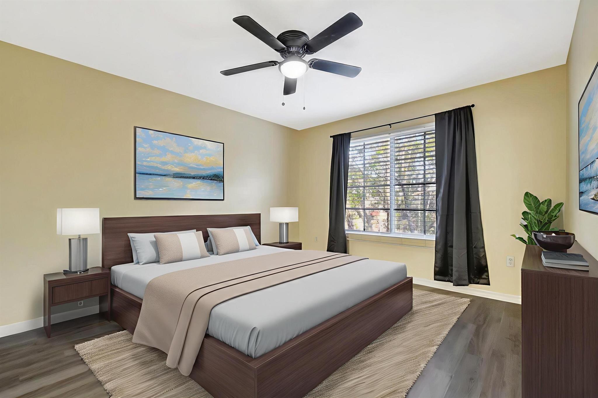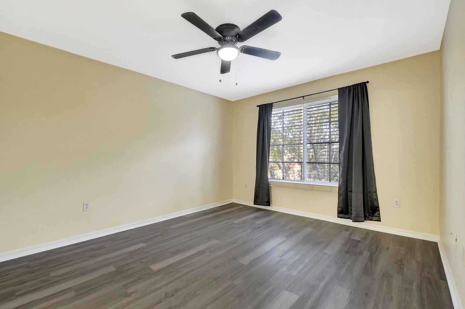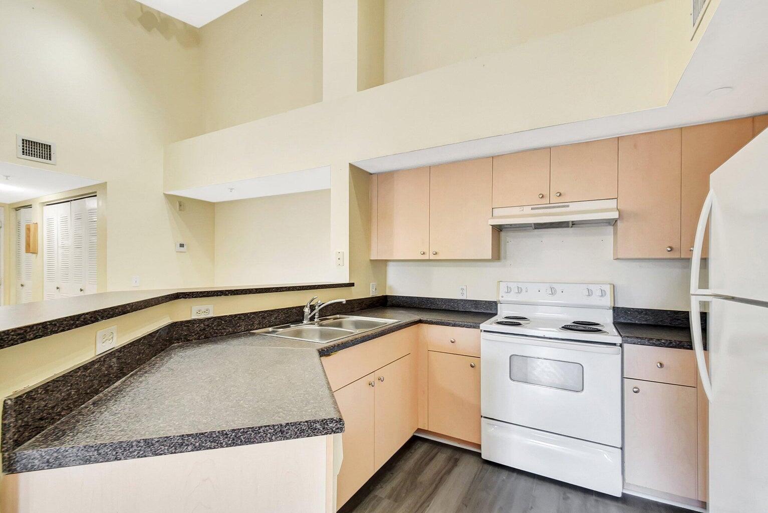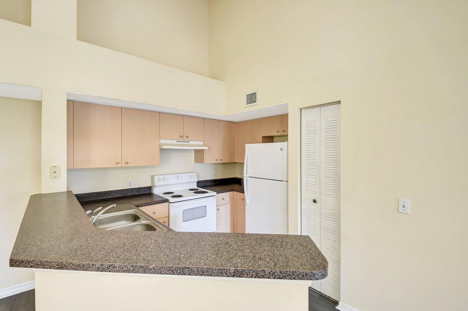 Opportunity knocks with this cozy 2-bedroom, 2-bathroom condo in the highly sought-after Emerald Isles at Laguna Lakes. Perched on the third floor, this home boasts soaring vaulted ceilings and a covered balcony perfect for enjoying Florida's sunshine and providing tons of natural light making this condo bright and airy. Equipped with hurricane storm shutters and brand-new luxury vinyl plank flooring throughout, the unit offers both peace of mind and stylish comfort. The open concept kitchen features ample counter space, seamlessly flowing into a spacious, light-filled living area. The primary suite is generously sized with a walk-in closet and a private en suite bathroom, while the second bedroom also offers plenty of space and a large closet. Additional perks include a full-size