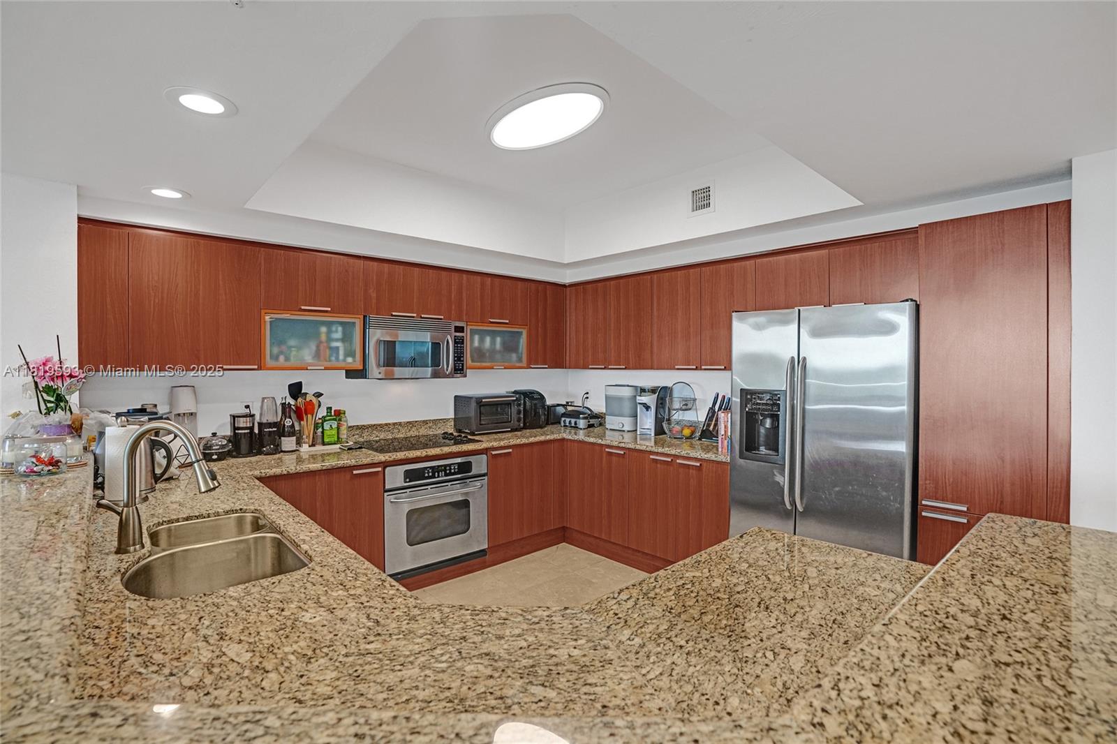 Enjoy tranquil, panoramic views overlooking the Oleta River State Park Reserve from this beautifully upgraded 2 bedroom + den, 2 bath residence. This corner unit features a formal foyer, sleek marble floors, open living and dining spaces, a modern kitchen with granite countertops and stainless-steel appliances, and floor-to-ceiling impact windows that flood the space with natural light. The oversized primary suite offers two built-in walk-in closets and a luxurious en-suite with dual vanities, spa tub, and separate shower. A spacious den adds versatility, ideal for a home office or guest area.