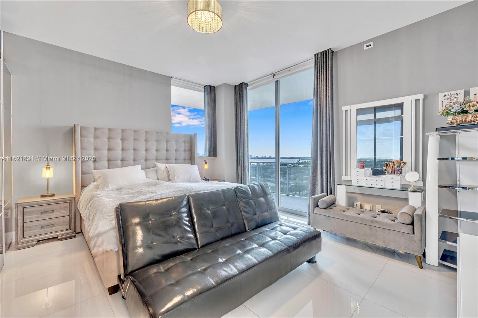 Stunning corner unit with a panoramic wraparound balcony, located in the 02-line, the best line in the building, offering unobstructed skyline and water views, including views of Biscayne Bay, the skyline, and Miami Beach. The unit features 10ft high ceilings, impact windows, a renovated interior with new flooring, a decorative fire pit, an updated kitchen, an updated bathroom, a built-in walk-in closet, and brand-new top-of-the-line appliances, including a washer and dryer. The unit includes two assigned lower-level parking spaces and private storage. The building also offers a newly redesigned lobby, a brand-new heated pool, a redesigned gym, a relaxing jacuzzi, electric car chargers, and an updated roof, making this home a true gem in the highly desirable North Bay Village.