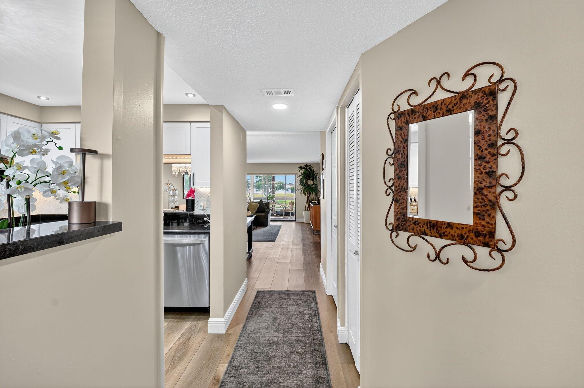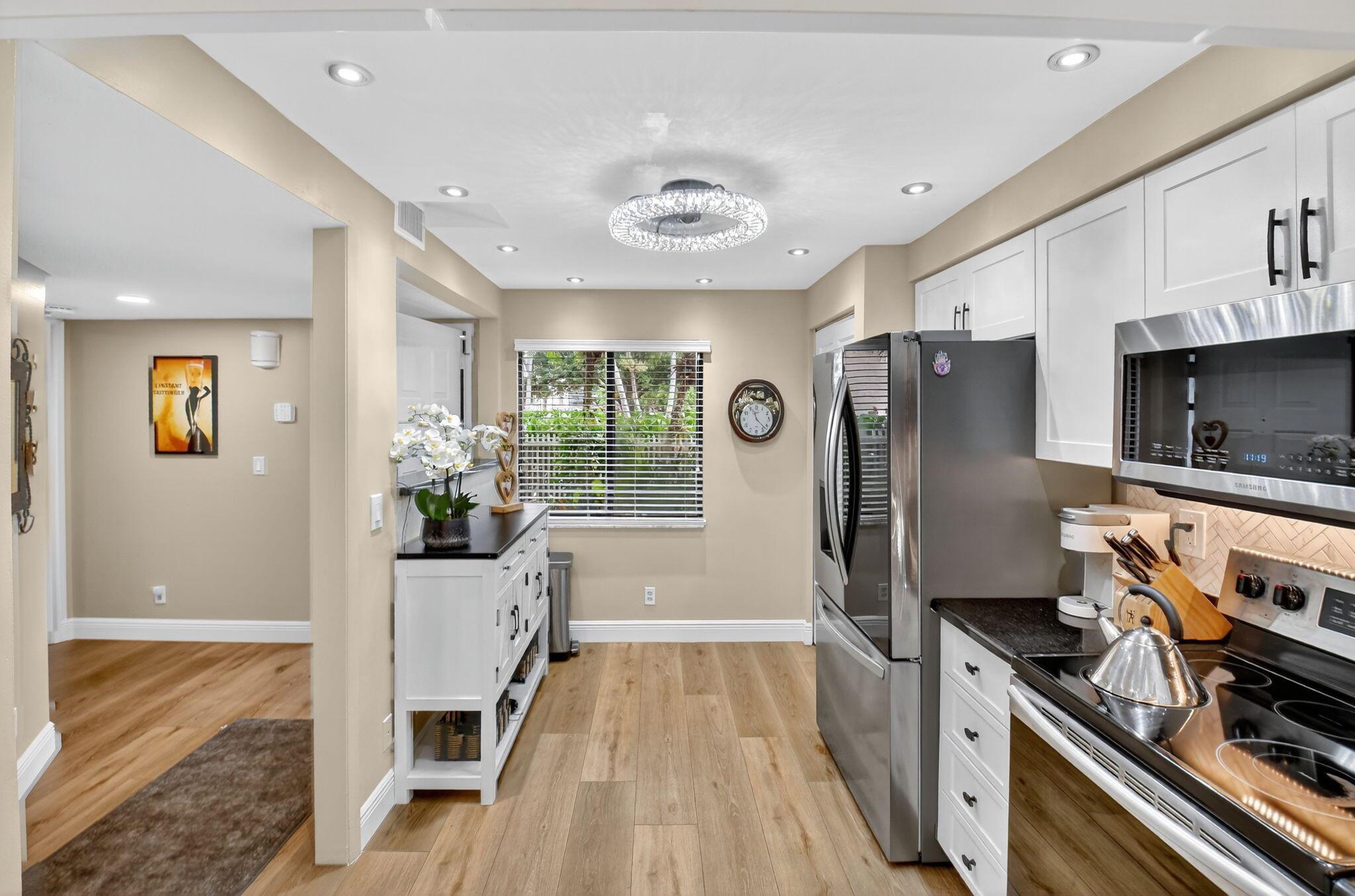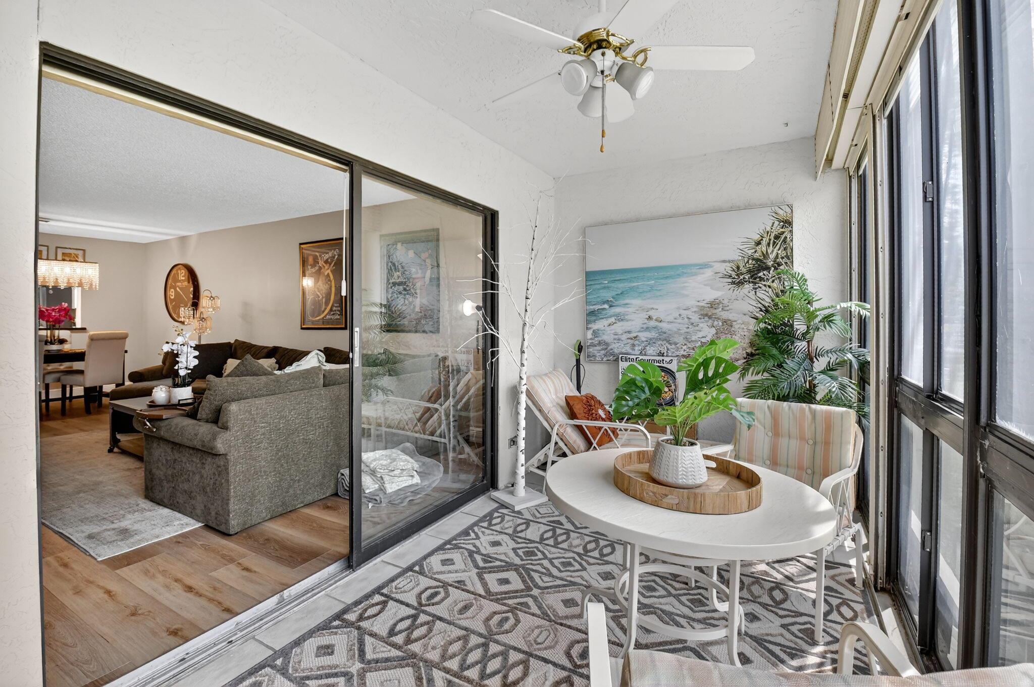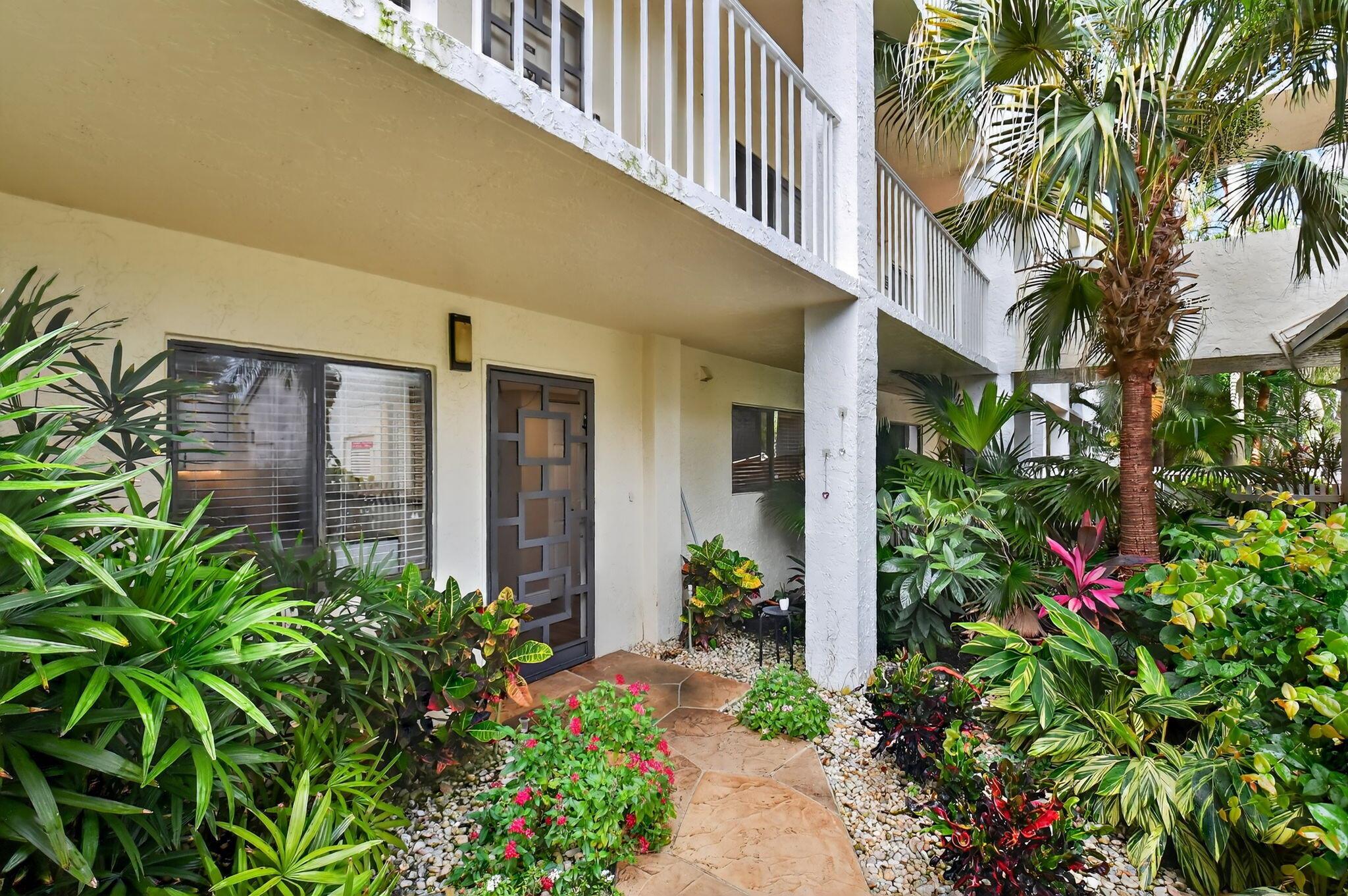 A lush, floral oasis welcomes you into your own private garden retreat. This charming ground-floor condo has a designated parking just steps from the front door. Inside, contemporary finishes create an inviting atmosphere throughout the unit.The sleek, open-concept kitchen has been elegantly updated with premium appliances, beautifully refaced cabinetry, a stylish backsplash, and granite countertops--perfect for cooking and entertaining. The spacious living and dining areas are bright and beautifully styled, offering a model-home feel.Enjoy additional living space in the enclosed Florida room, complete with serene views and direct access to a walking path that leads to the large primary suite. This tranquil bedroom features include a cozy sitting area, two custom walk-in closets
