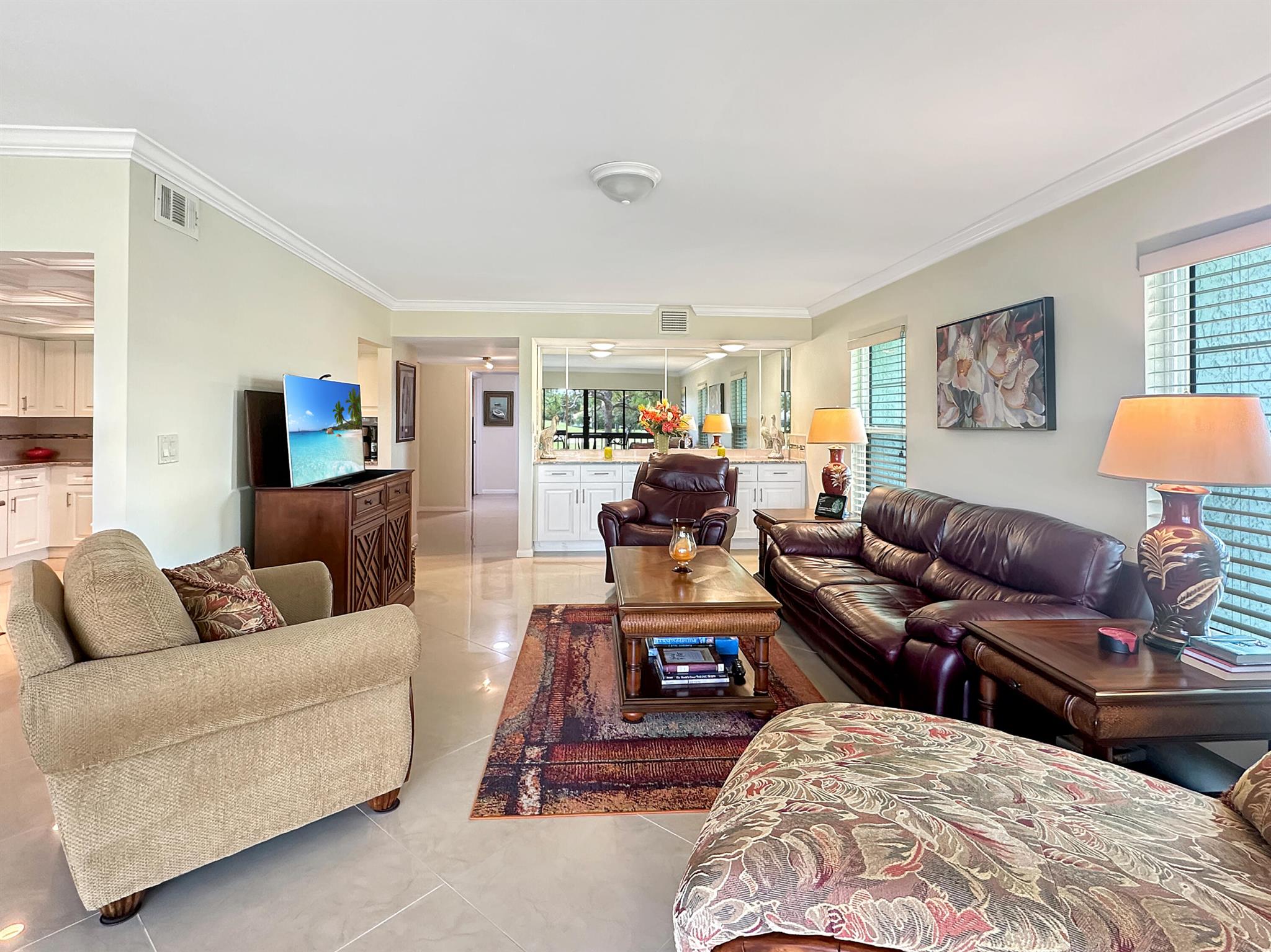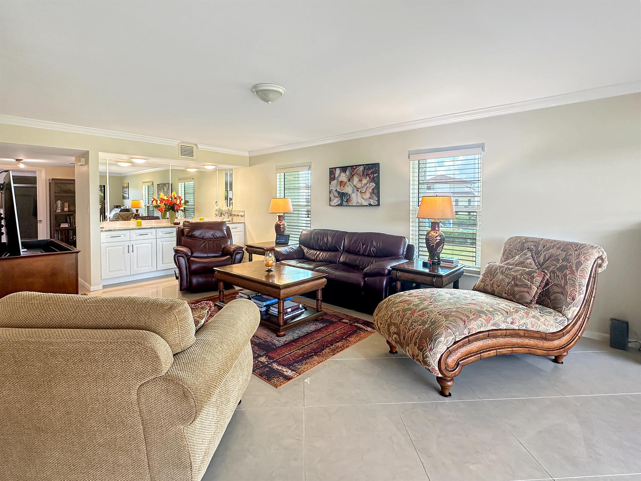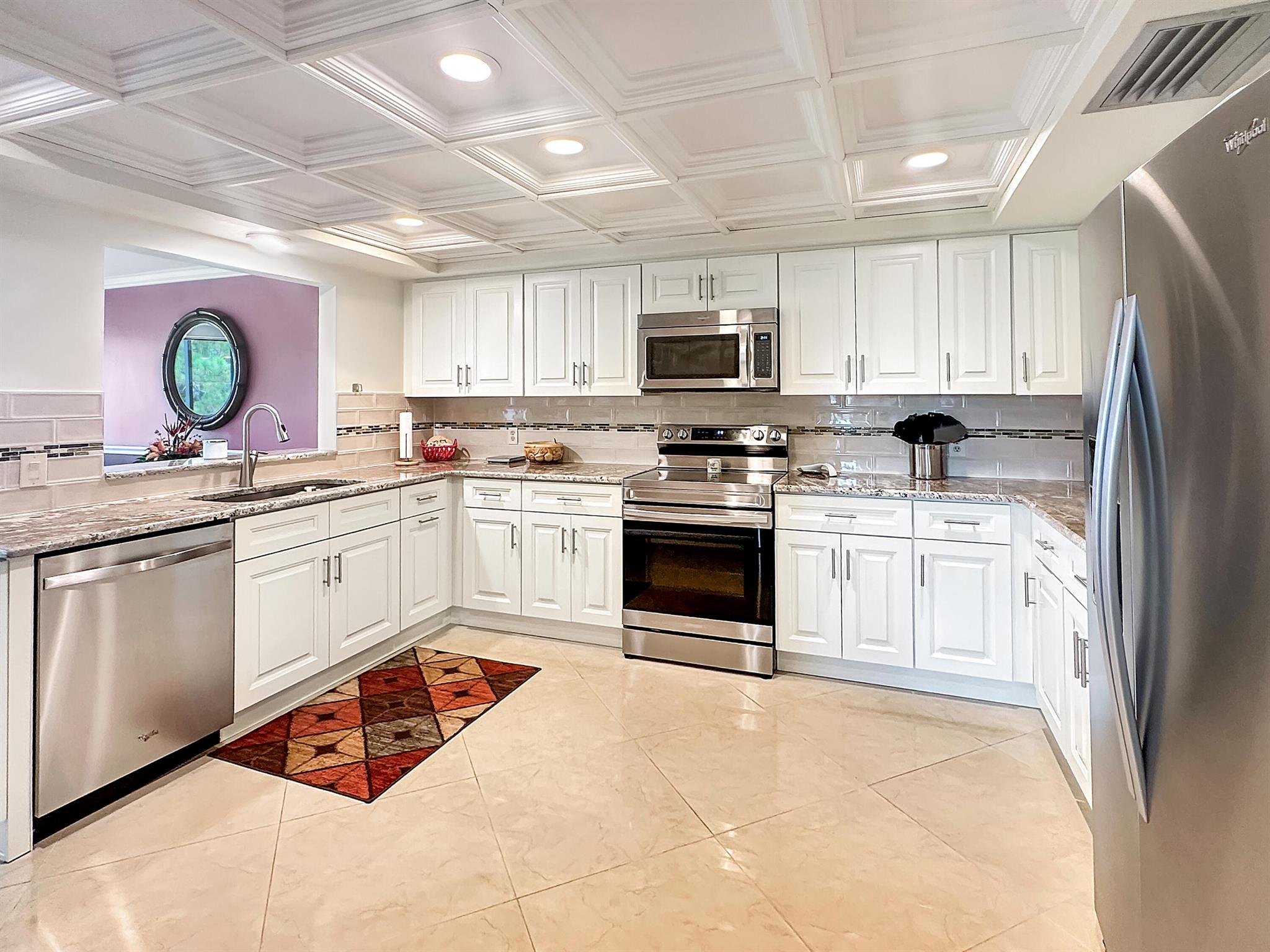 Embrace the epitome of Floridian luxury living in this stunning 2 story condo unit, perfect for those seeking an idyllic retreat. This meticulously maintained property offers a serene golf course backdrop, enhancing the tranquil atmosphere of your future home. The 3-bedroom, 2-bathroom layout is both elegant and practical, with a multitude of modern updates and upgrades that promise comfort and style.Step into the spacious kitchen, where cooking is transformed into an experience, with soft-close raised panel wood cabinetry, granite countertops, and a stylish tiled backsplash. The coffered ceiling adds a touch of sophistication to every meal prepared. The open-concept living and dining area flows out to a screened lanai, inviting you to bask
