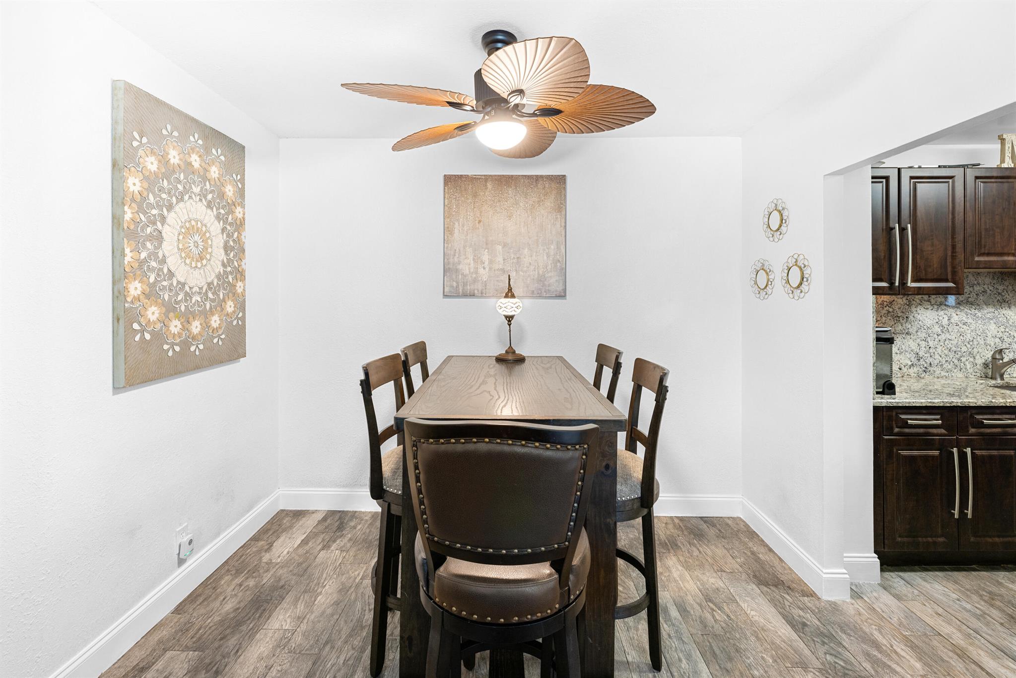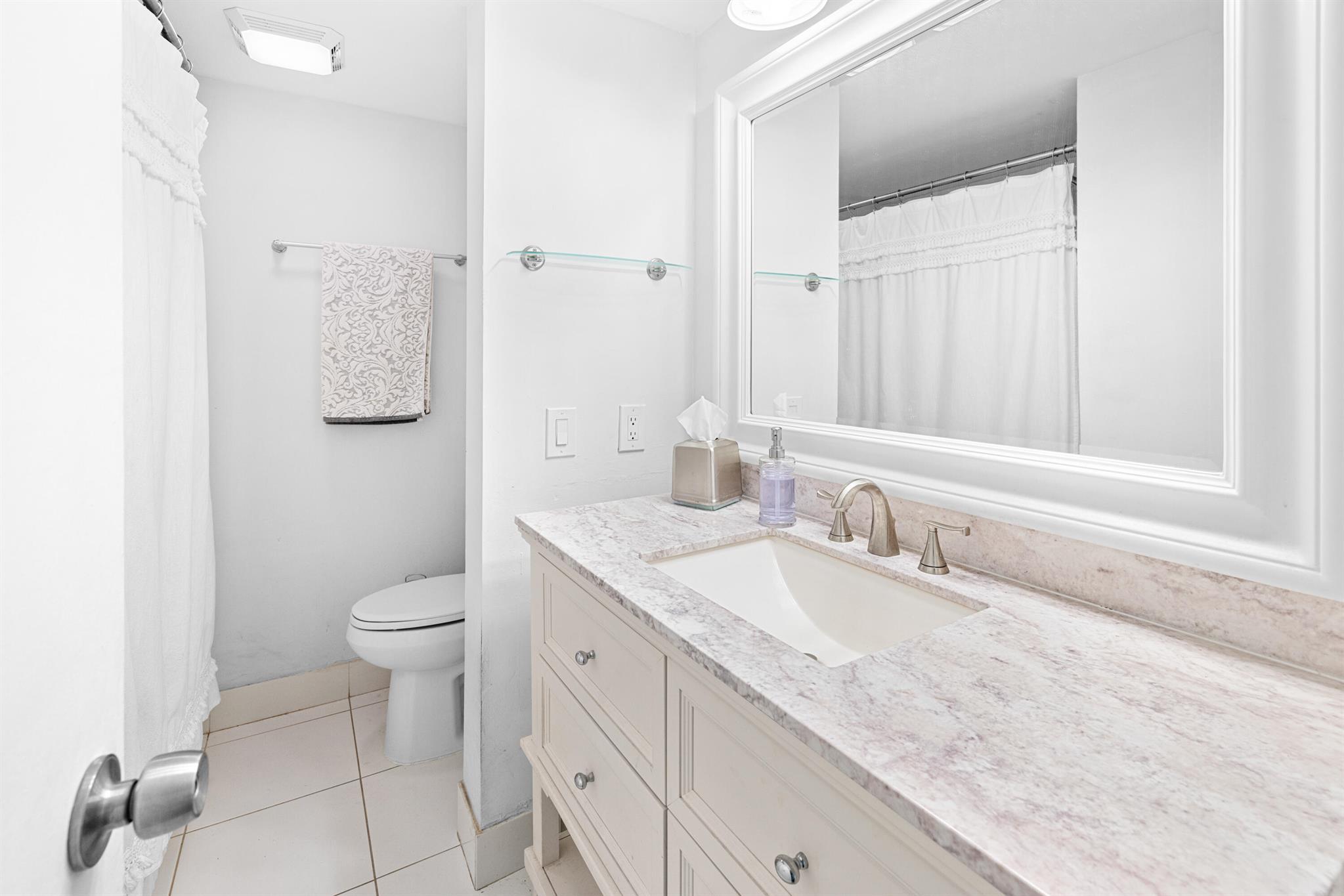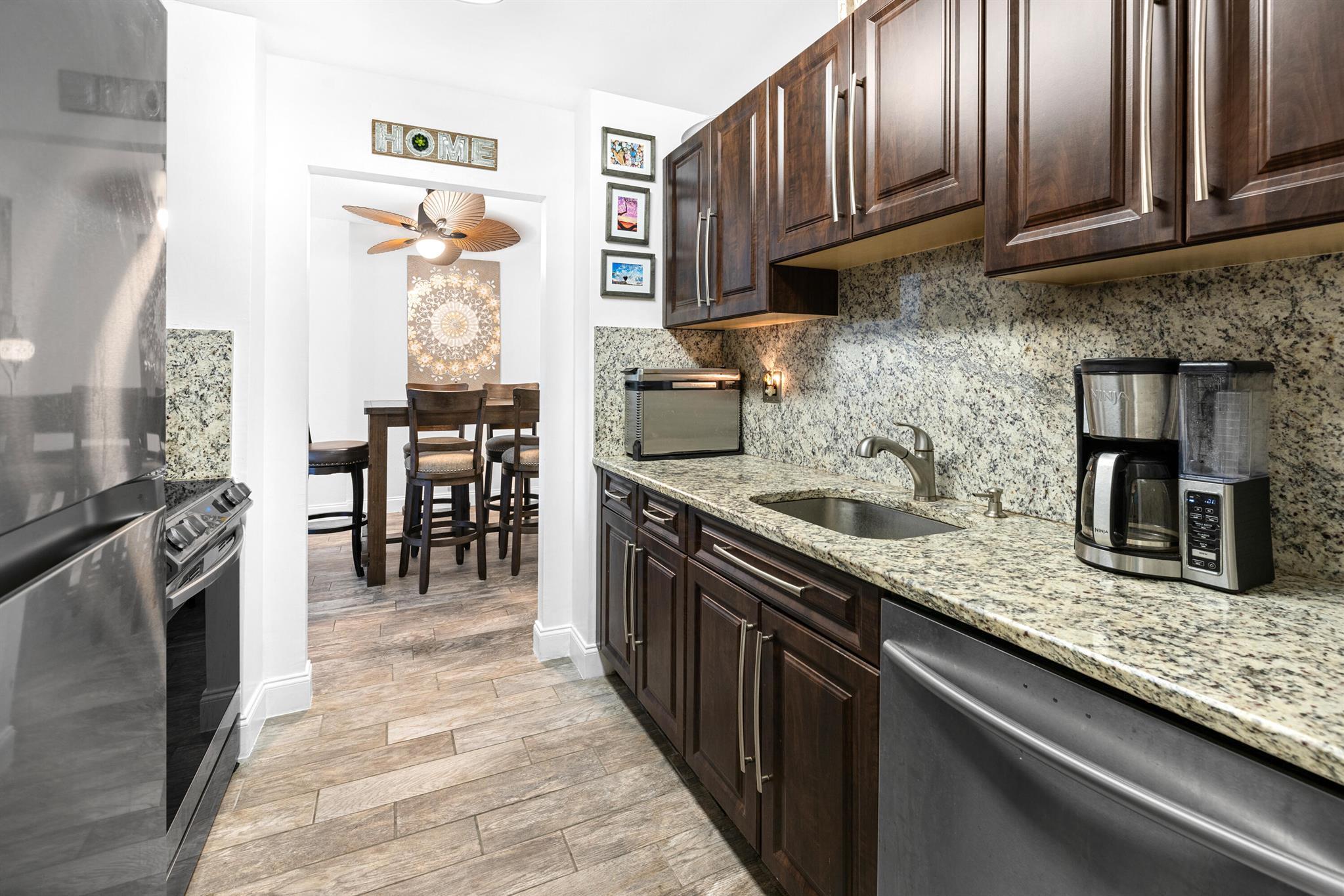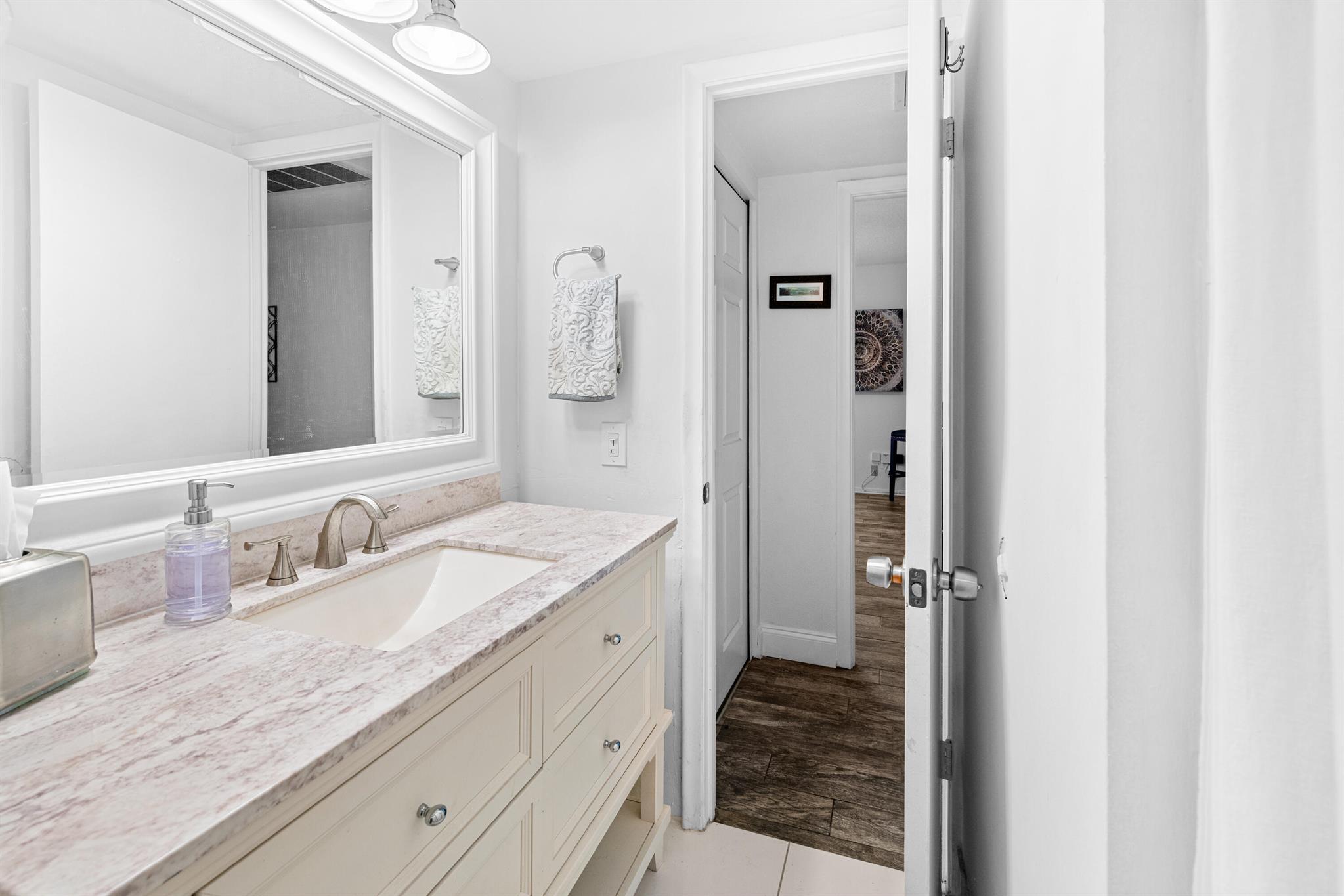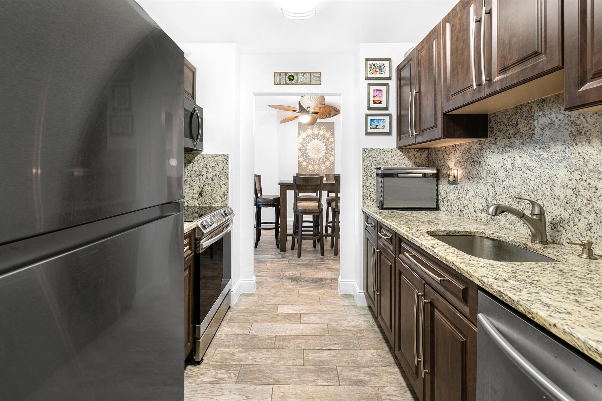 This renovated 2 bedroom, 2 bathroom unit in the great 55+ Tierra del Sol community features an updated kitchen with beautiful granite countertops and matching backsplash, stainless steel appliances and plenty of classic espresso brown cabinets. There is updated wood-like tile flooring in the formal living space. The impact glass windows throughout the unit and the balcony sliders with convenient accordion shutters ensure peace of mind. The primary bedroom offers a remodeled en-suite bathroom. A storage unit is located on the same floor as the unit. Tierra del Sol is a boutique community featuring an Olympic size heated pool, hot tub, clubhouse and shuffleboard.
