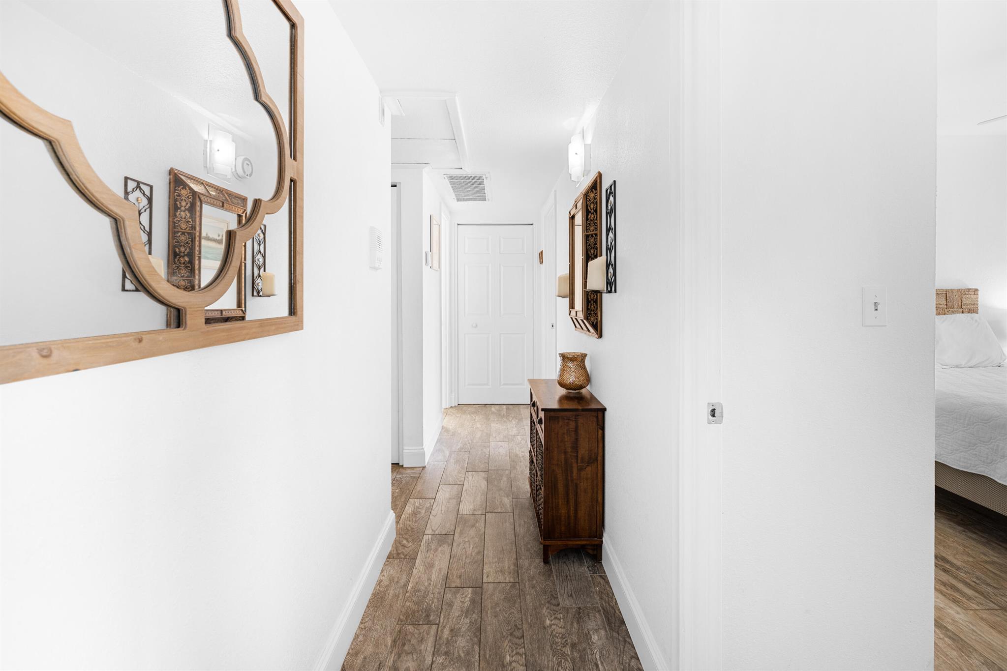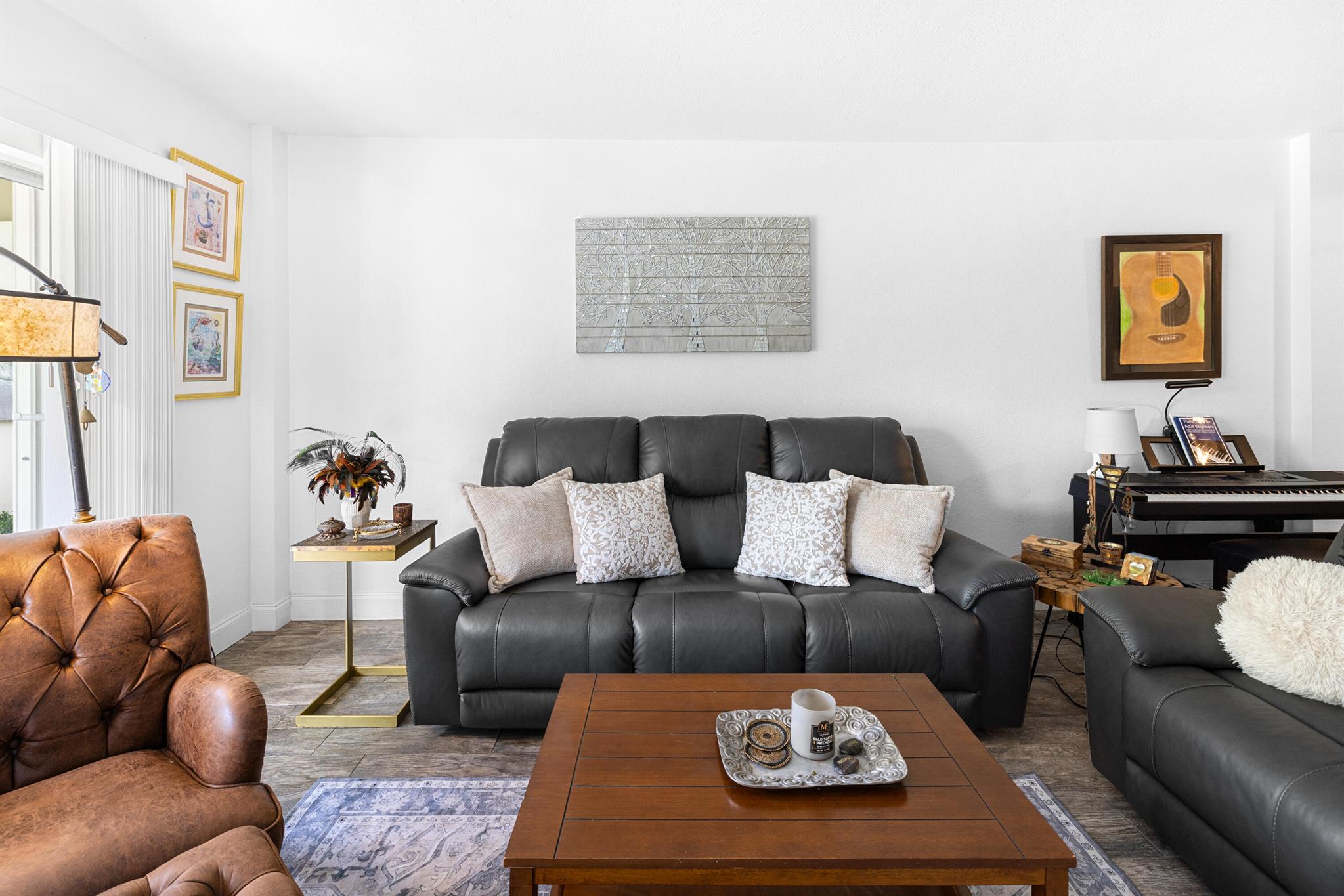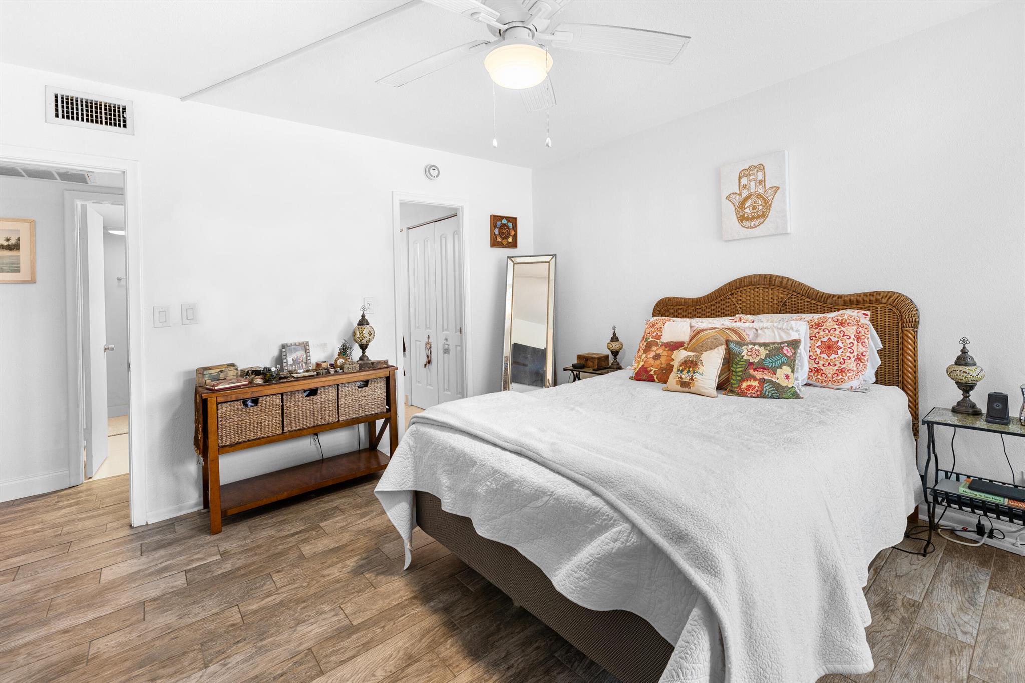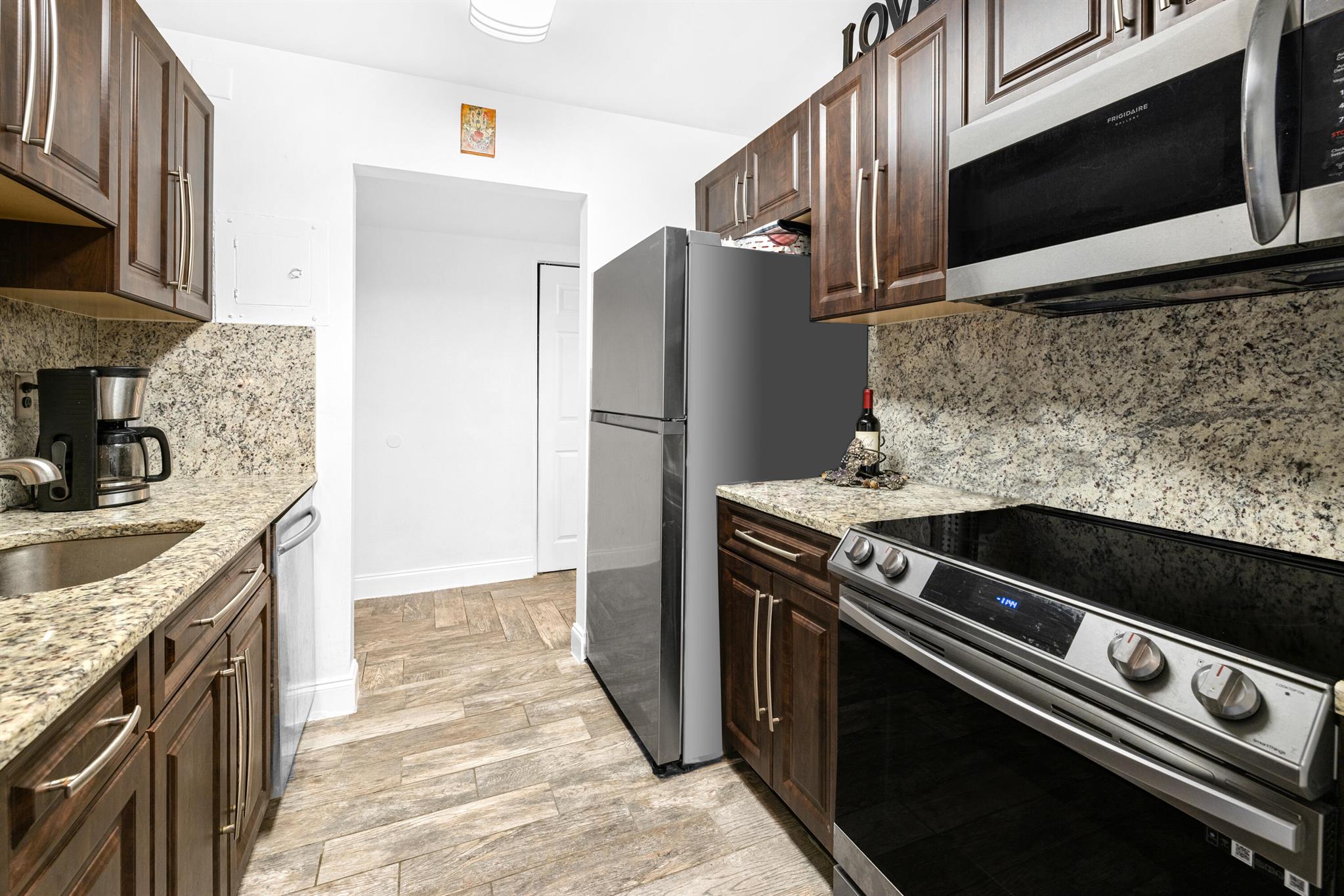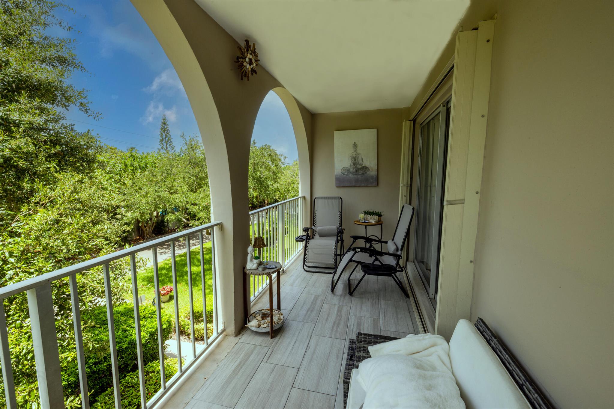 This renovated 2 bedroom, 2 bathroom unit in the great 55+ Tierra del Sol community features an updated kitchen with beautiful granite countertops and matching backsplash, stainless steel appliances and plenty of classic espresso brown cabinets. There is updated wood-like tile flooring in the formal living space. The impact glass windows throughout the unit and the balcony sliders with convenient accordion shutters ensure peace of mind. The primary bedroom offers a remodeled en-suite bathroom. A storage unit is located on the same floor as the unit. Tierra del Sol is a boutique community featuring an Olympic size heated pool, hot tub, clubhouse and shuffleboard.