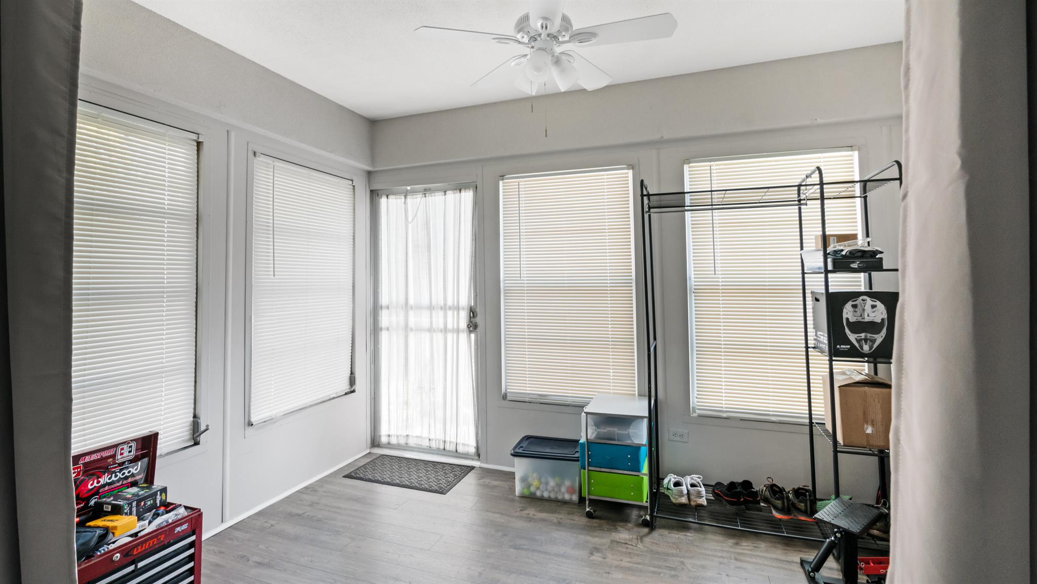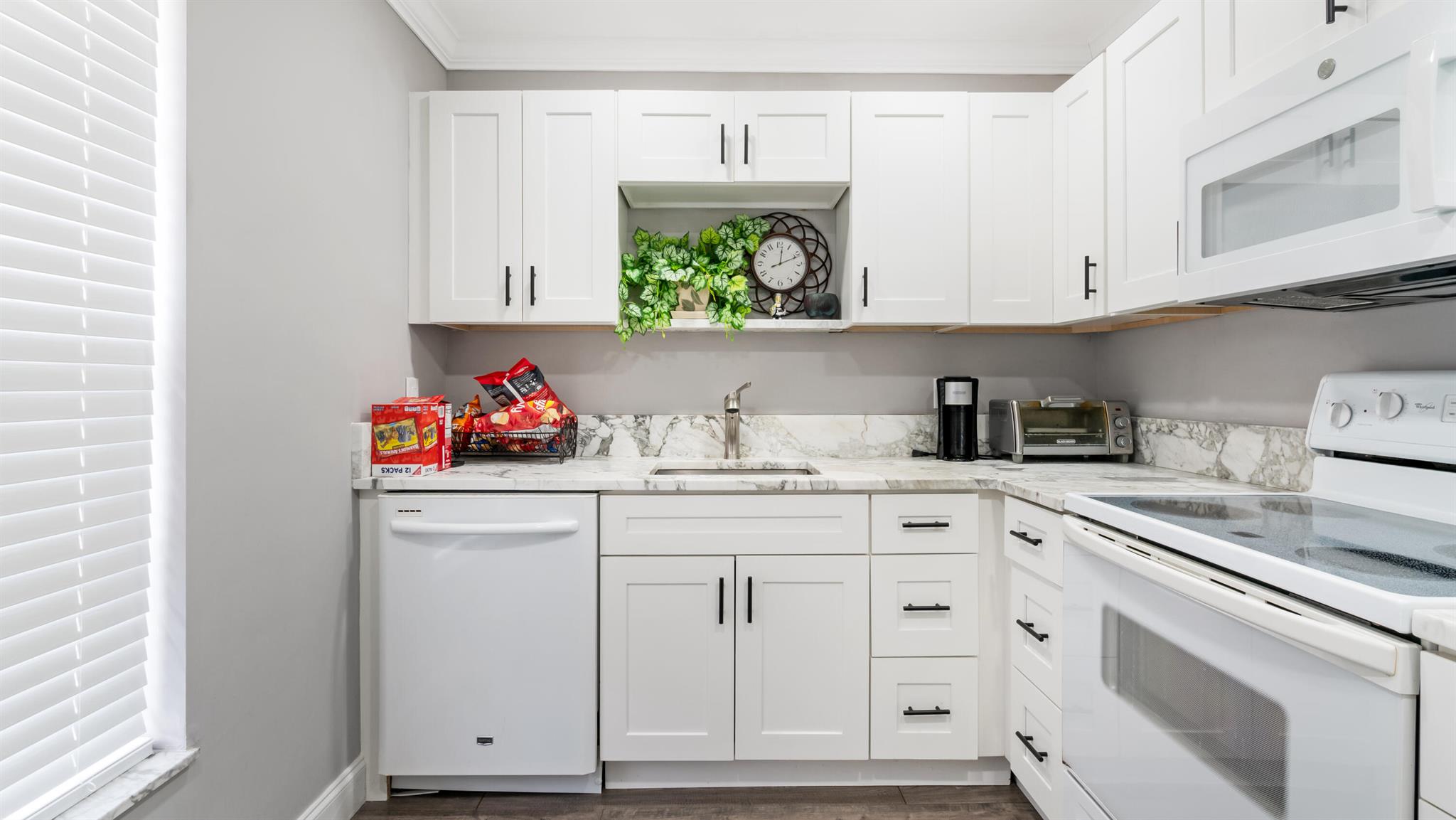 This fully remodeled villa presents a stunning kitchen and bathroom featuring premium wood cabinets, granite countertops, and upgraded white appliances. Elegant vinyl plank flooring runs throughout, accented by fresh baseboards, knock-down ceilings, and tasteful crown molding. Enhancements include a new hot water heater, upgraded bathroom vanity, shower, and toilet, along with a modern electrical panel, plumbing, exterior door, and ceiling fans. The enclosed porch has been opened to expand living space, and interiors showcase fresh paint and designer finishes throughout.