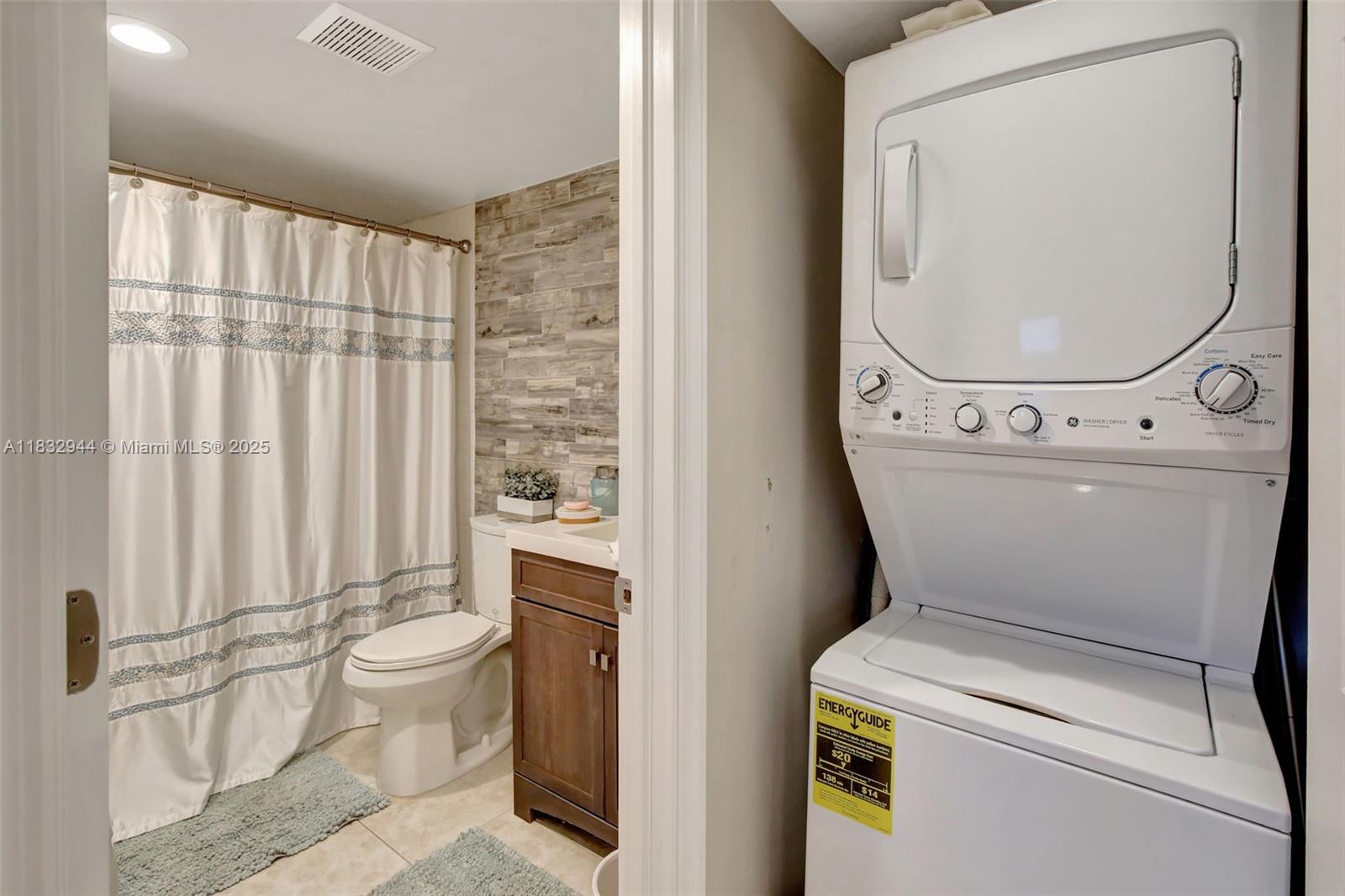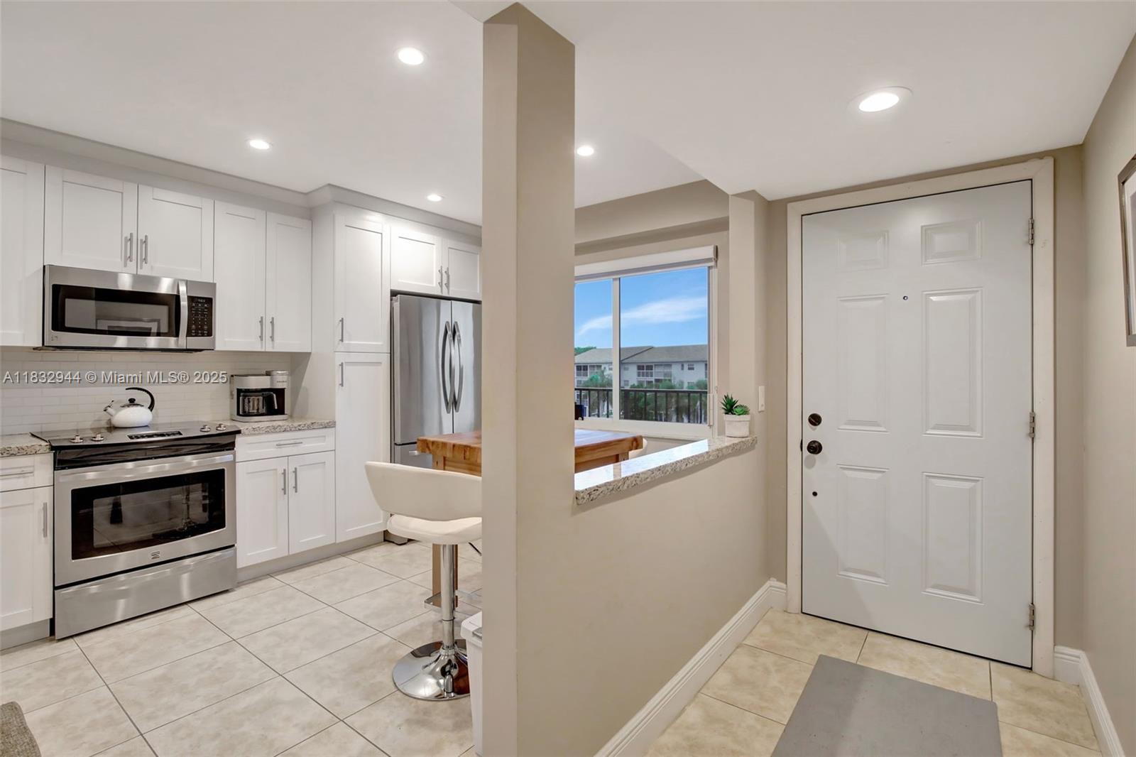 Impeccably upgraded fourth-floor unit featuring two bedrooms and two updated bathrooms. Notice the kitchen walls have been fully opened for an airy feeling! New hurricane-impact windows($25k+) for added security and peace of mind, new air-conditioning unit, new washer/dryer combo, new upgraded stainless-steel appliances, exquisitely designed wood cabinets, granite countertops, a stylish stone backsplash and new custom blinds are throughout the unit. The layout includes a bright dine-in kitchen and a spacious master bedroom with a walk-in closet. Enjoy the added benefit of attic storage space. Relax on the patio while taking in the scenic views and beautifully manicured golf course. A satellite pool is located directly across from the building for easy access.
