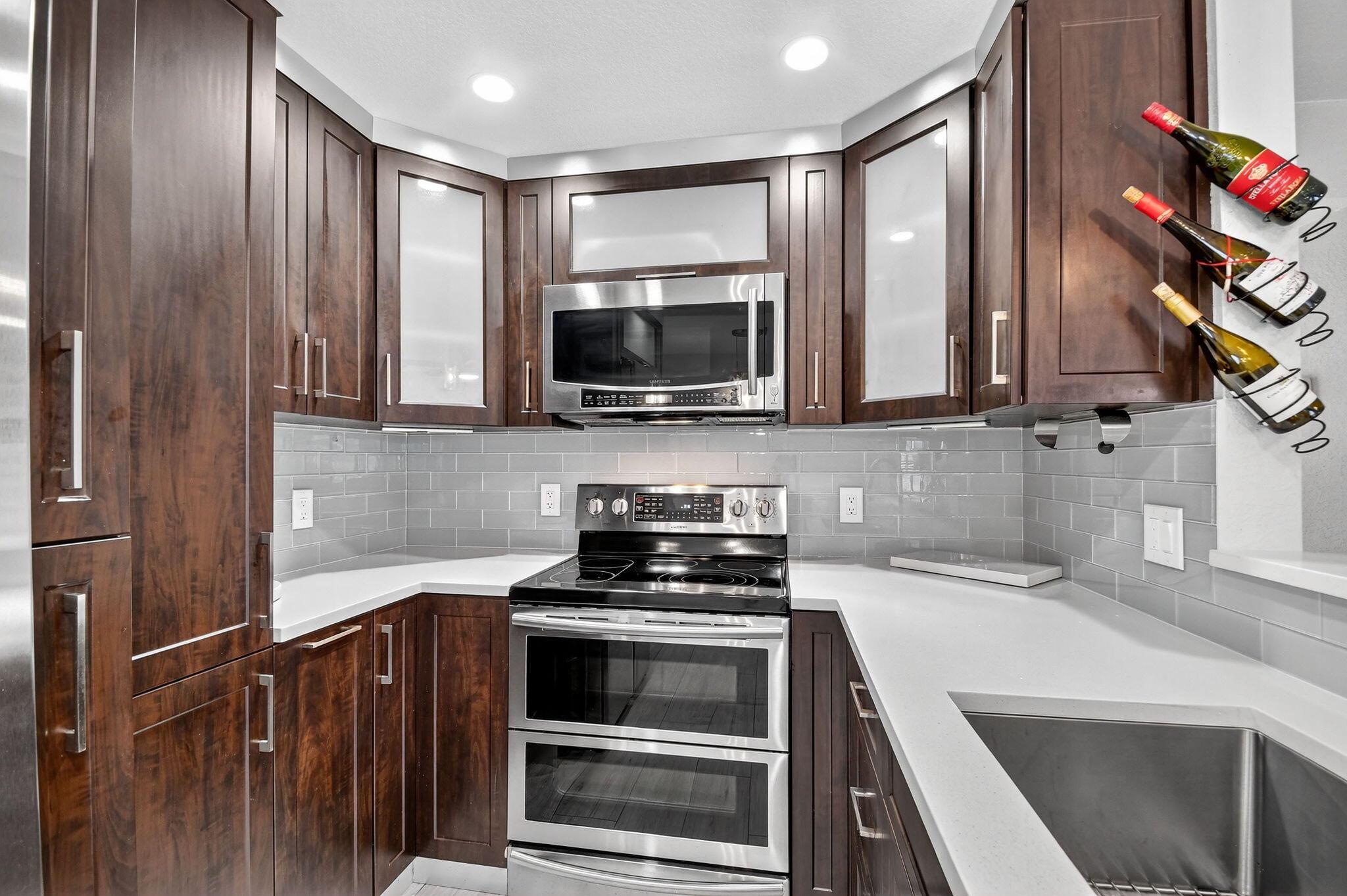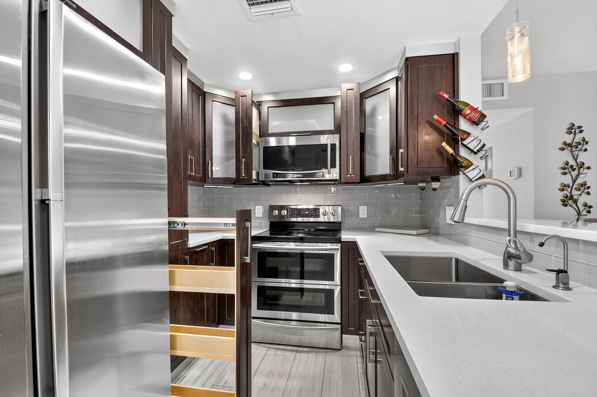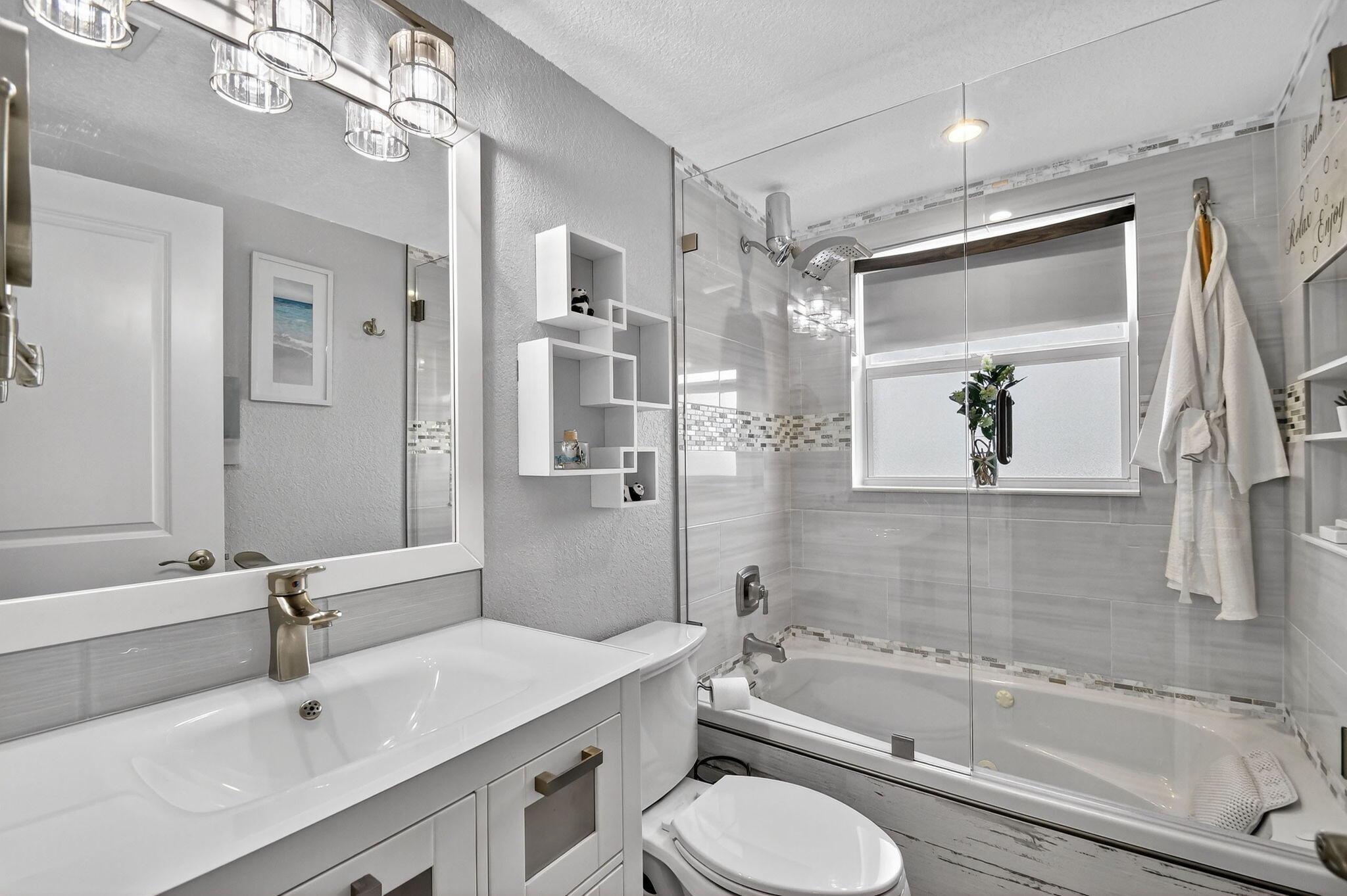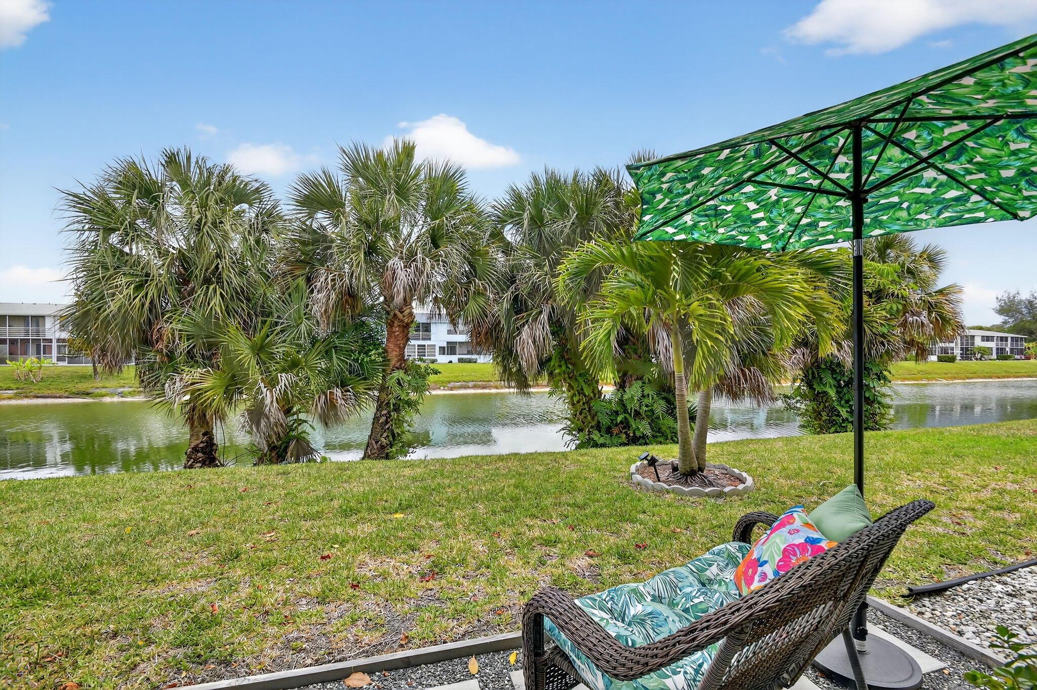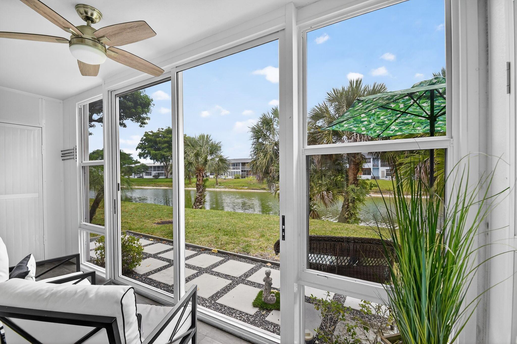 WOW! HIGH END UPDATED 2 BED 2 FULL BATH GROUND FLOOR CORNER CONDO WITH A SERENE WATER VIEW. ELEGANT PORCELAIN TILING THROUGHOUT, OPEN -CONCEPT GOURMET KITCHEN WITH PLENTY OF CUPBOARD SPACE AND STAINLESS STEEL APPLIANCES. TWO BEAUTIFULLY UPDATED BATHROOMS INCLUDING A LUXURIOUS JACUZZI. TAKE IN THE BREATHTAKING WATER VIEW RIGHT FROM YOUR OWN HOME. PLUS REST EASY WITH IMPACT WINDOWS AND HURRICANE SHUTTERS FOR ADDED PEACE OF MIND. NEW ROOF COMING SOON. SELLER WILL PAY THE ASSESSMENT. Assigned parking spot plus visitor parking available; local bus for errands/shopping both within & outside The Village; COME AND ENJOY RESORT STYLE LIVING IN THIS GATED COMMUNITY FOR ACTIVE ADULTS 55+. Clubhouse with theater, shows, movies, craft and card rooms, billiards, yoga, and dance classes. GREAT LOCATI