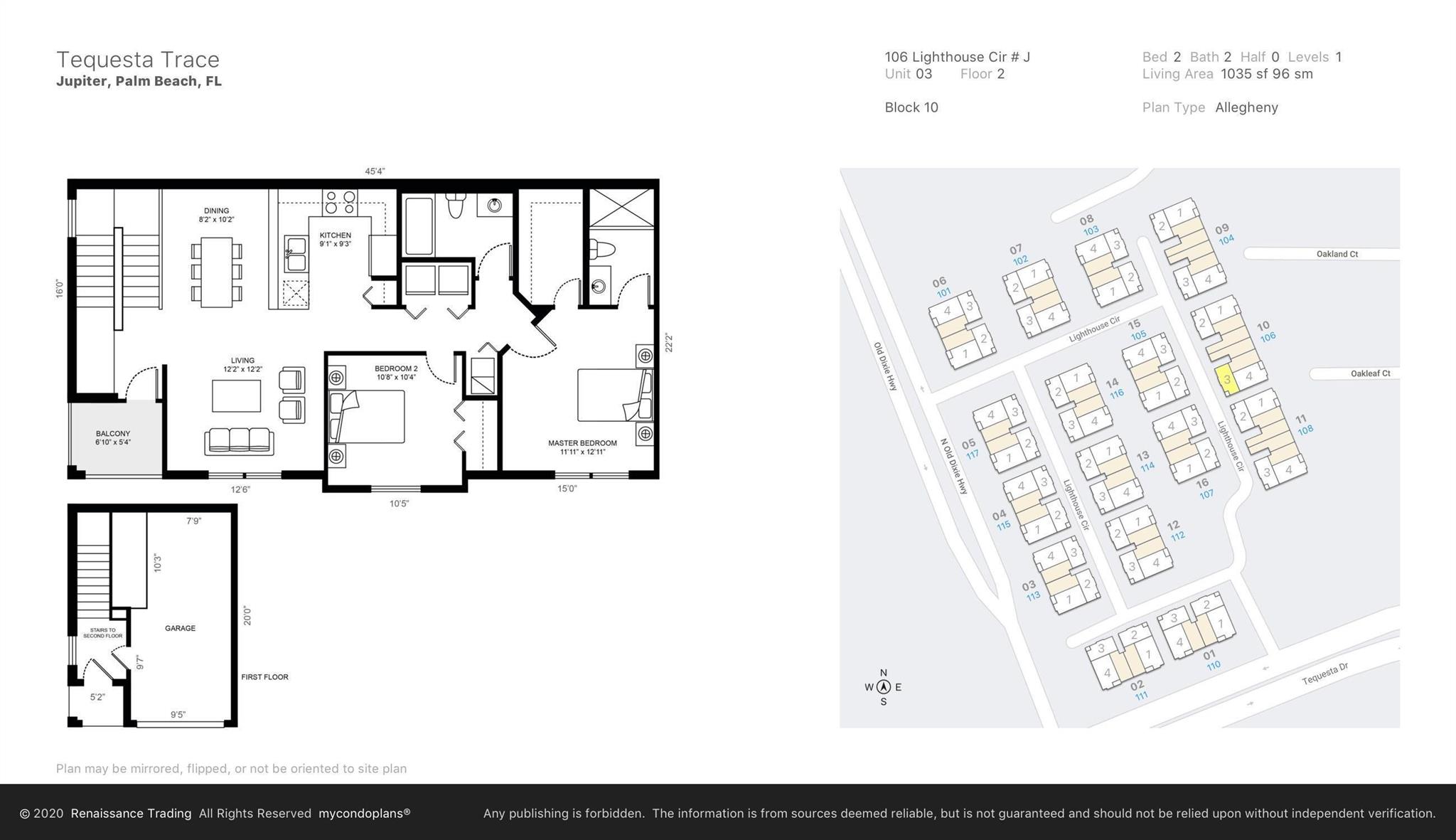 Open Floor Plan Condo:2 Bedroom, 2 Bath, 1 Car Garage, 1035 s.f., 2nd Floor Condo in Quiet Tequesta, Florida. Includes primary bedroom with en-suite bathroom and large walk-in closet. Laundry closet with washer (1 year old)/dryer. Kitchen has 1 year old refrigerator and new dishwasher. Accordion Hurricane shutters. 1 year old water heater. Roof replaced 2023. End unit is in back of the community. Community Pool and playground. Well run homeowners' association with reserves. Close to beaches, dining, Publix, Starbucks, pharmacy. A rated school. Minutes from beaches.