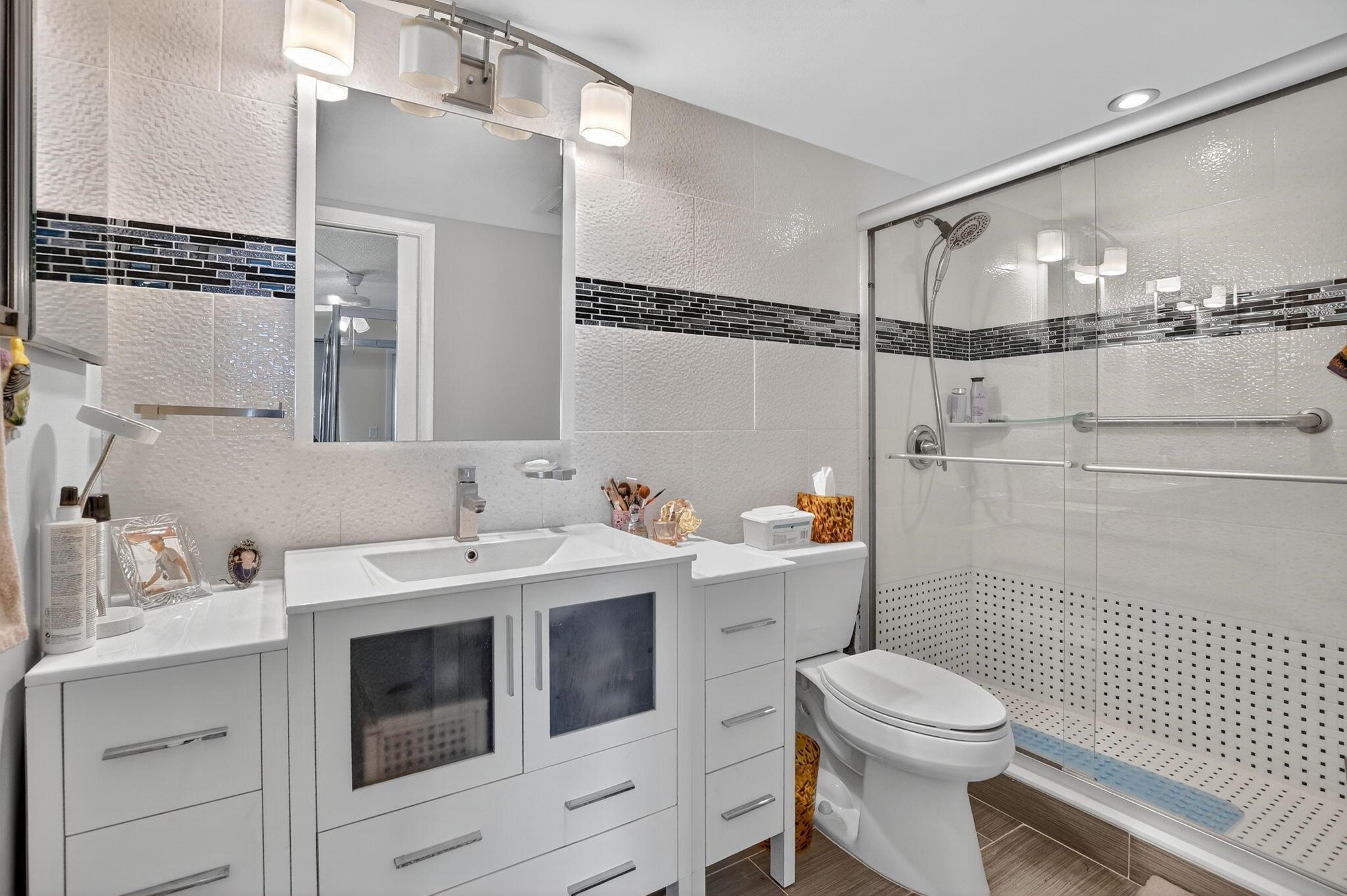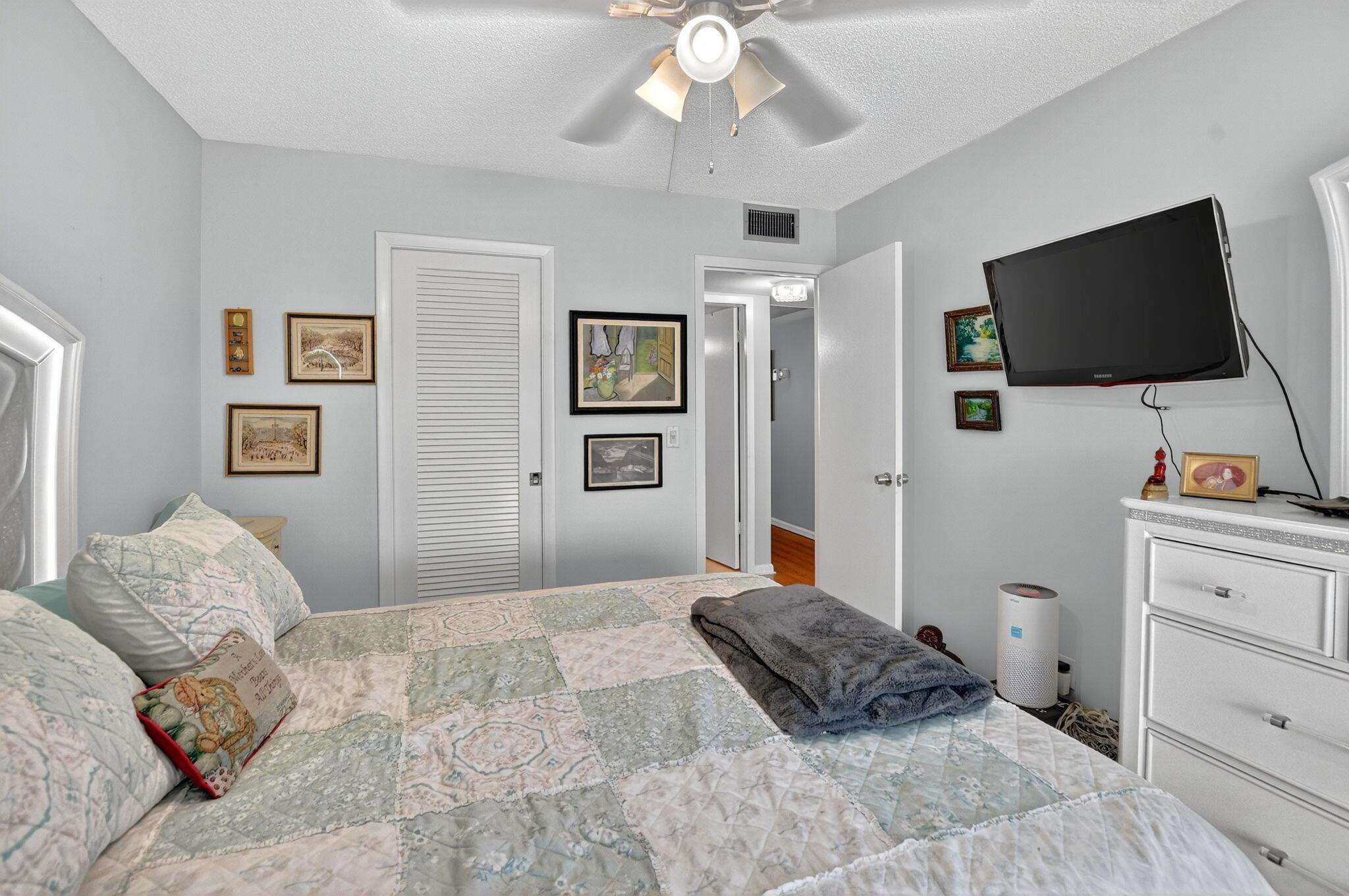 Ainslie! PRICED TO SELL! This OPEN layout, beautifully RENOVATED KITCHEN features the wall removed, between the living room and kitchen. It has white wooden cabinets, and granite countertops, connecting to a spacious living and dining area. The condo includes attractive wood flooring. Both bathrooms are tastefully renovated. The lanai offers impressive WATER VIEWS views. It is conveniently located near places of worship, clubhouse, and the entrance gate. This appealing and reasonably priced third-floor condo is situated in the desirable Ainslie section of Century Village Boca, a lively community for individuals aged 55 and older.