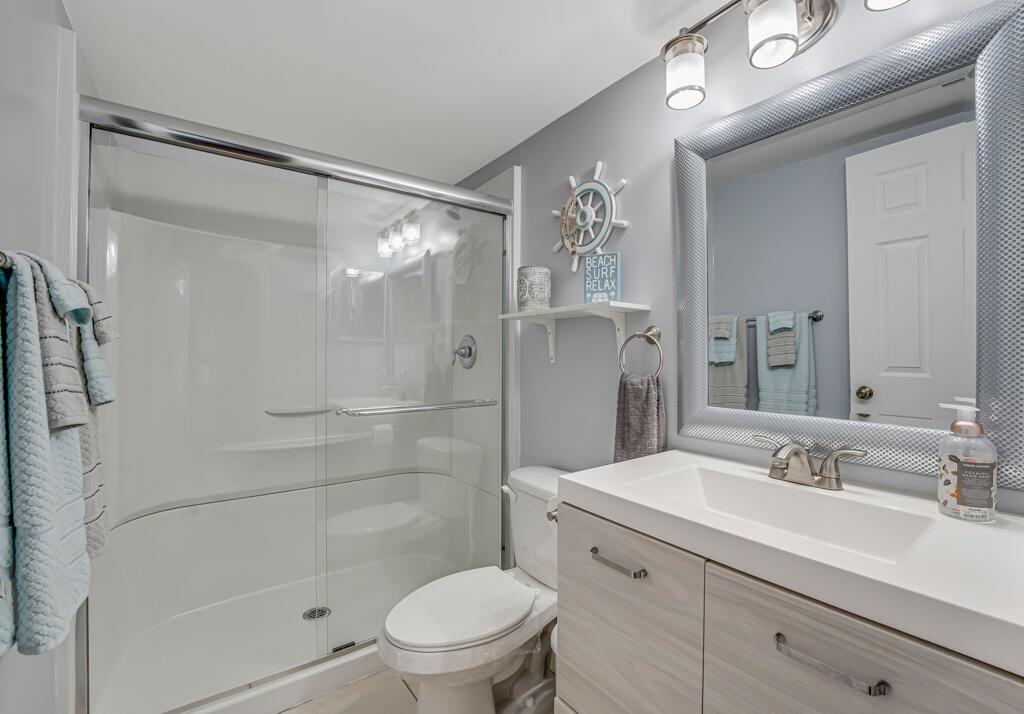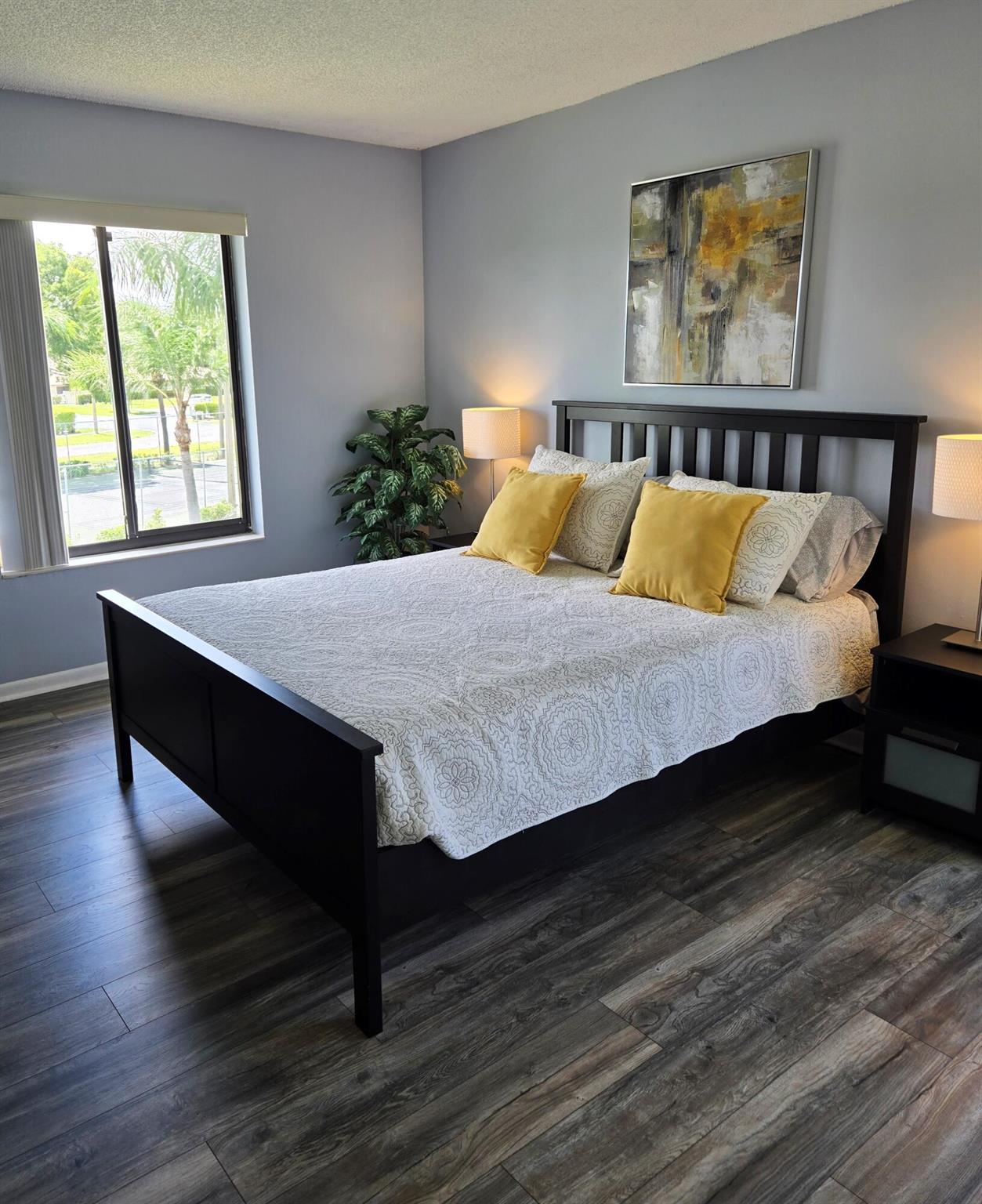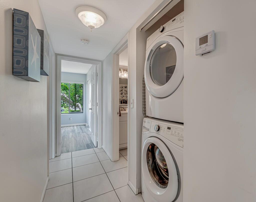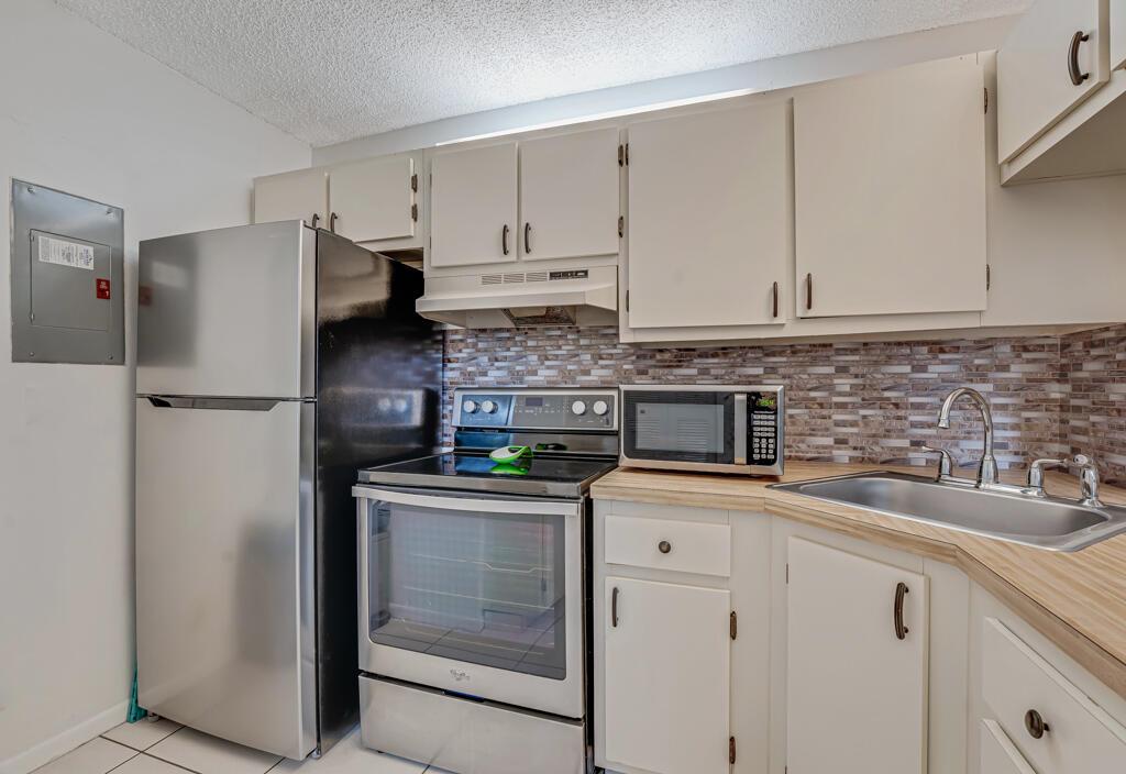 BRAND NEW AC JUST INSTALLED 07/2025! Spacious condo with vaulted ceiling in the living room with an additional window to allow for ambient natural light. This is a rare find. Being on the top floor of this 3 story building gives you more privacy and no noisy neighbors above. 2 bedrooms, 2 full baths and a spacious living, dining and kitchen area. Bathrooms have been tastefully redone and the floors in the bedrooms and baths is a very nice wood look/coastal tile. Condo has been freshly painted. No carpet! Nice water view from your patio to enjoy morning coffee or evening glass of wine while enjoy the sunsets. Or, morning wine and evening coffee!!This condo building is right next to the pool and clubhouse! Just a short walk.