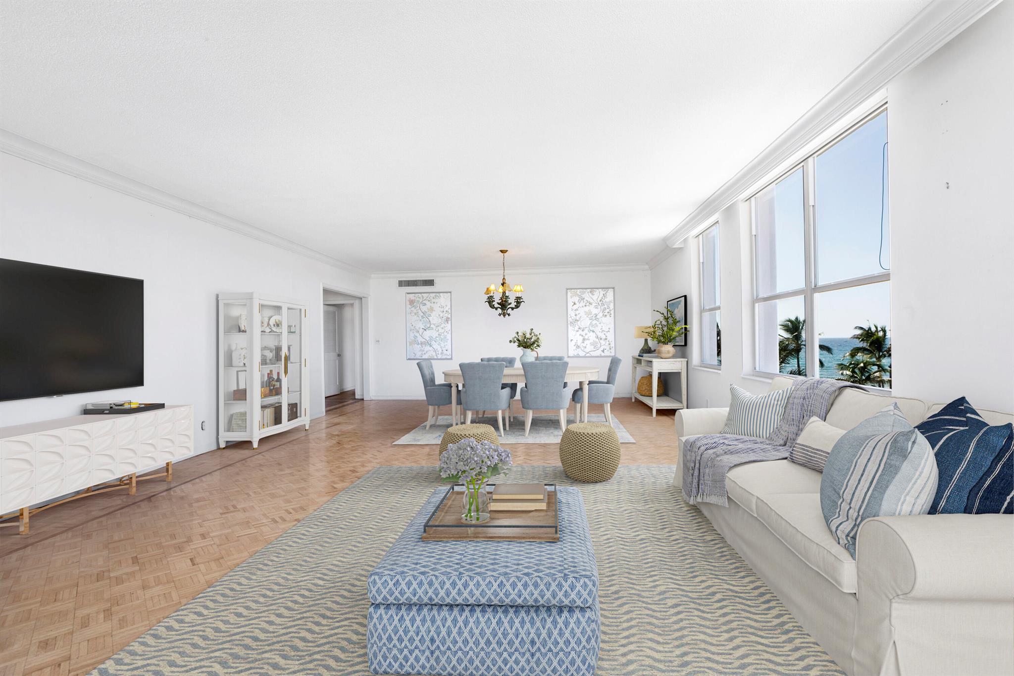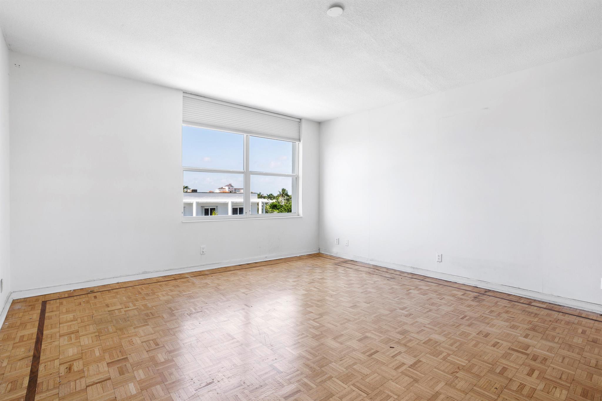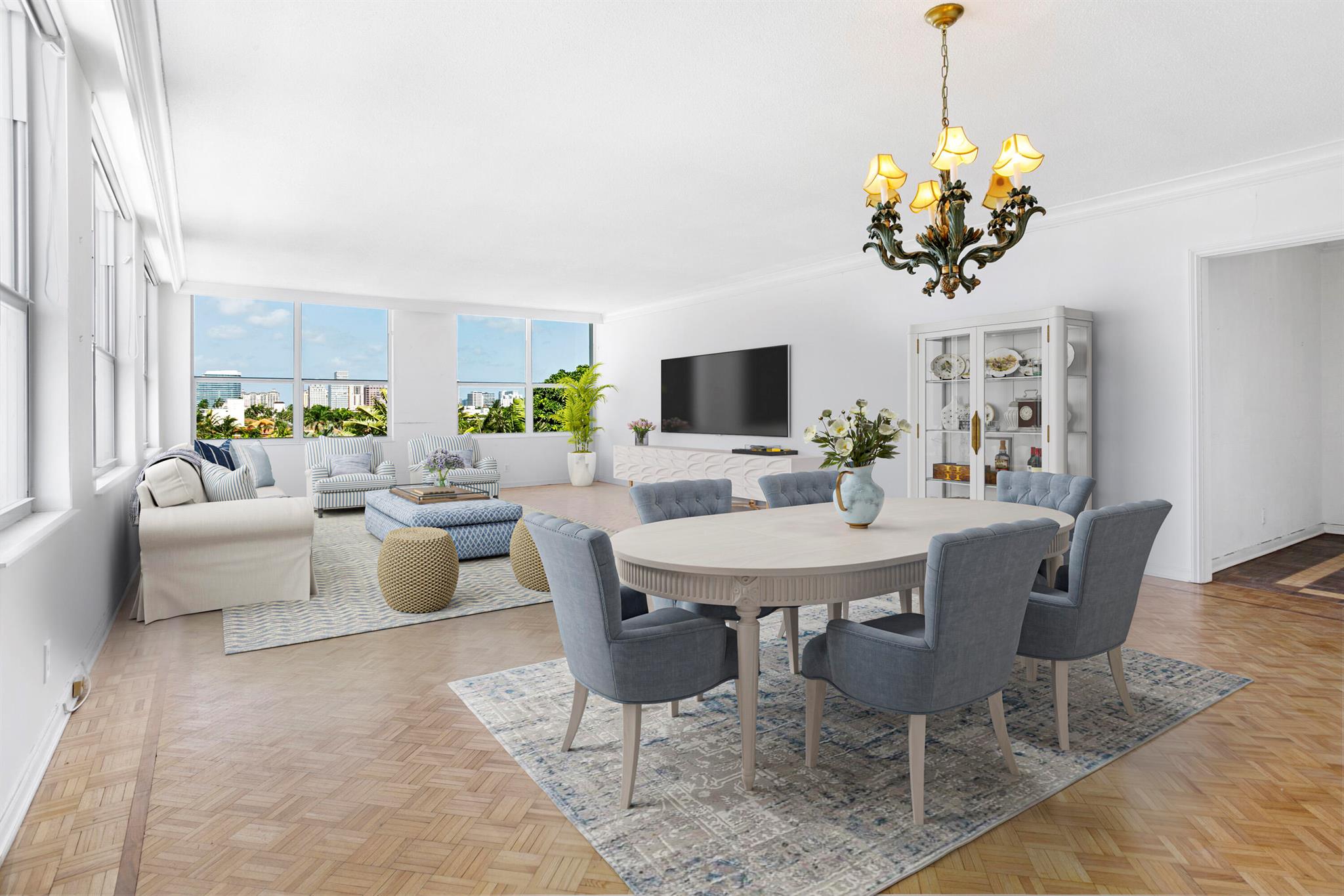 Rare opportunity to purchase this Timeless Two Bedroom, Two Bath, 4th floor condo unit in the Highly Desirable Lowell House! Boasting 2076 living square feet, high ceilings and a spaciously grand living room with oversized impact windows throughout. Freshly painted!Enjoy bright eastern views of the ocean and south western views of the tropical tree lined streets of Palm Beach. Primary bedroom offers separate dressing room, large bathroom with walk-in shower and roomy walk-in closet. Guest bedroom offers sizeable walk-in closet. Kitchen offers spacious eat-in dining area. Stunningly well-maintained parquet flooring throughout all main living areas. This unit includes two parking space and a hall storage closet. Embrace the charm of retro design or elevate this condo to a dreamy..