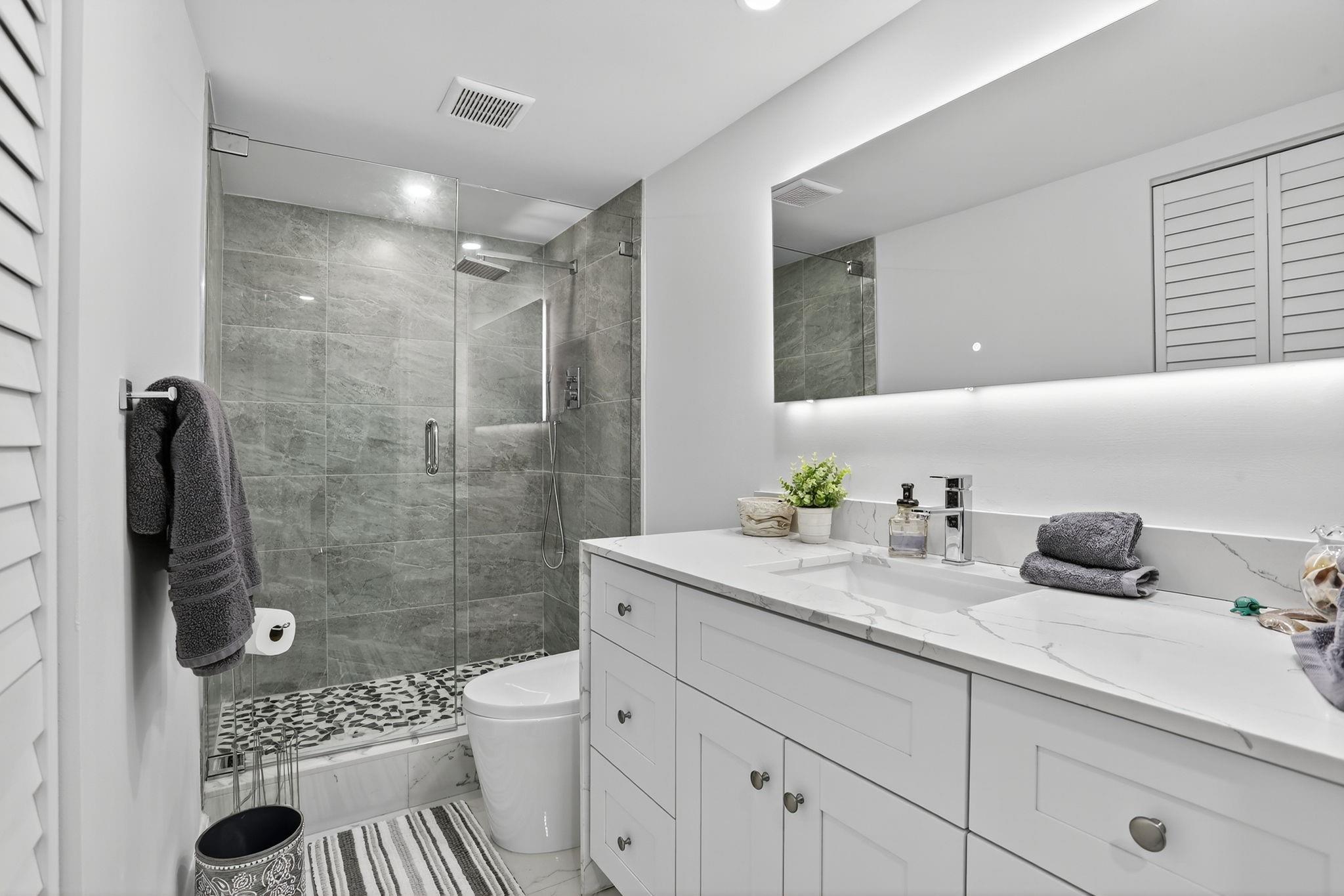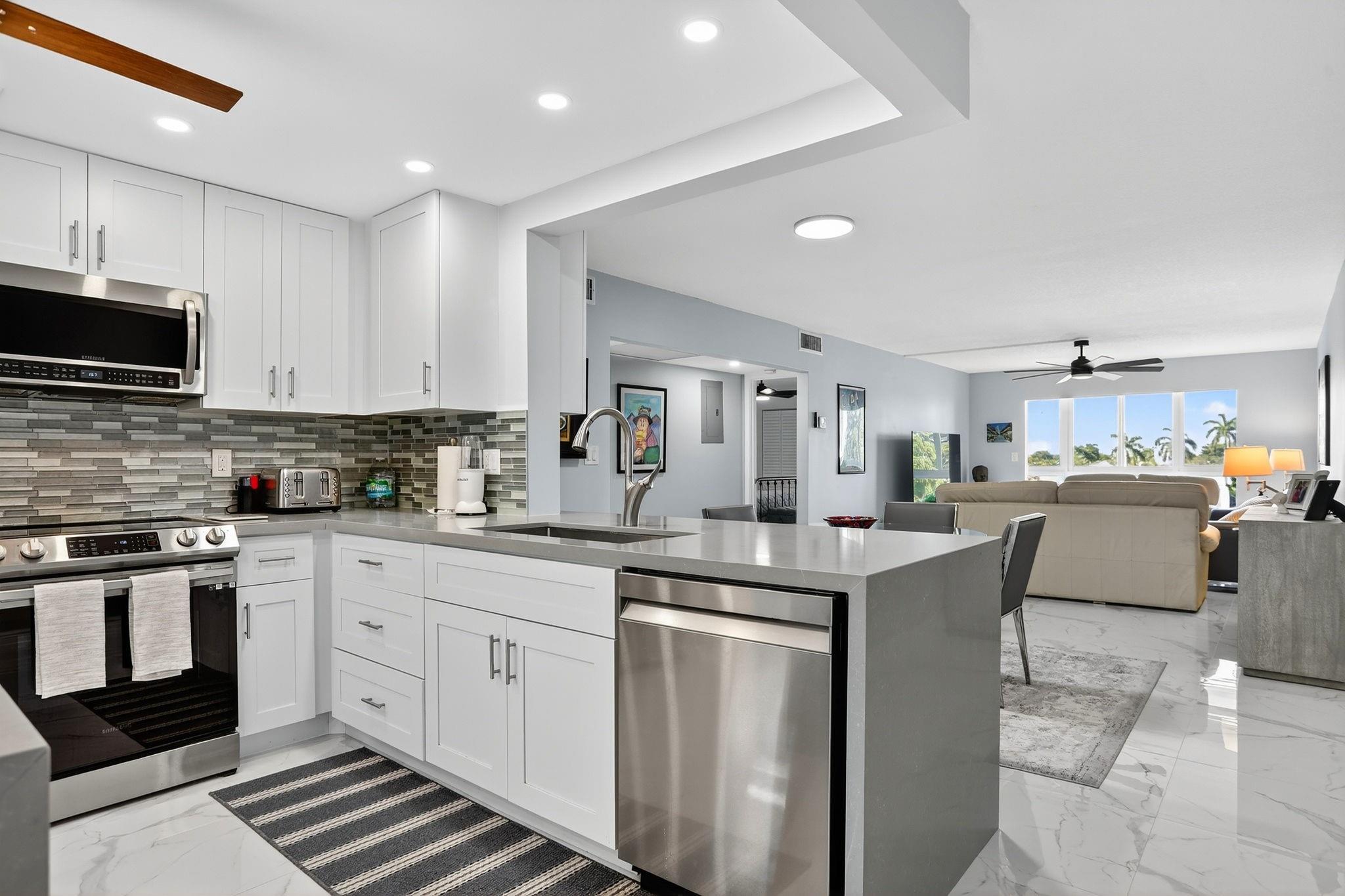 THIS IS IT — WYNMOOR'S MOST BREATHTAKING VIEW of the golf course, lake, and clubhouse! This fully remodeled 2BR/2BA condo stuns with sleek porcelain flooring, a gorgeous designer kitchen with quartz waterfall countertops and breakfast bar, shaker cabinetry, and top-tier stainless steel appliances. Both bathrooms have been tastefully updated, and there's a washer/dryer right in the unit. Impact windows throughout. Set in a guard-gated, 24/7 secured community with unbeatable amenities: a brand-new pool with BBQ area, 18-hole golf course, clubhouse, restaurant, tennis & pickleball, a 962-seat theater, fitness & wellness classes, billiards, 18 heated pools, a resistance pool, hot spa, shuttle service, and 80+ clubs to help you live your best tropical life!