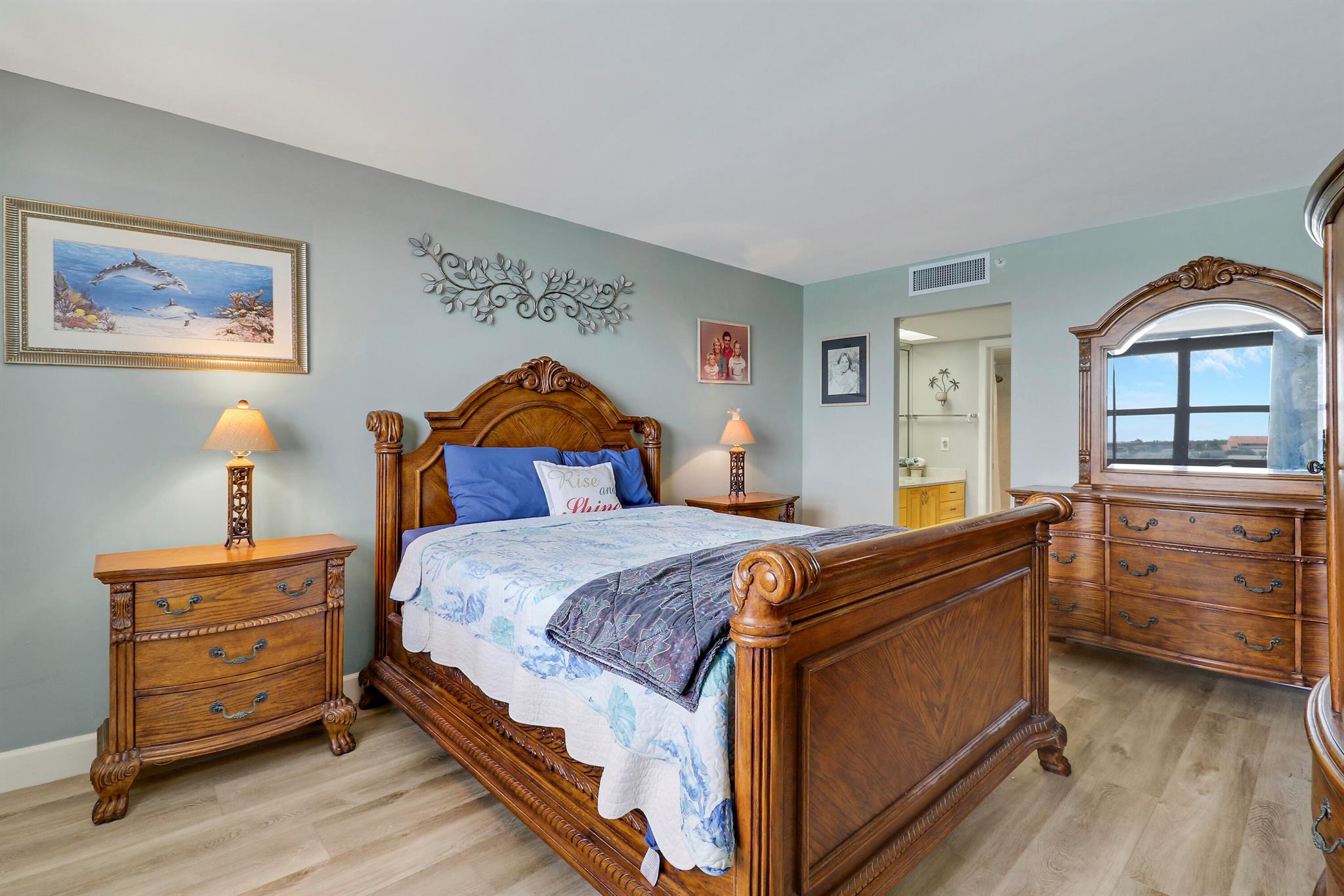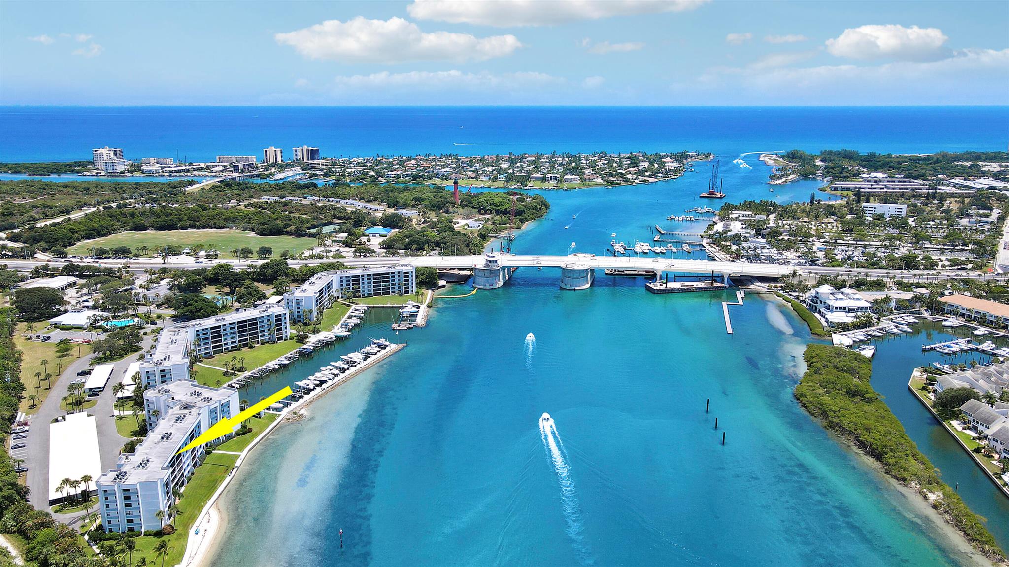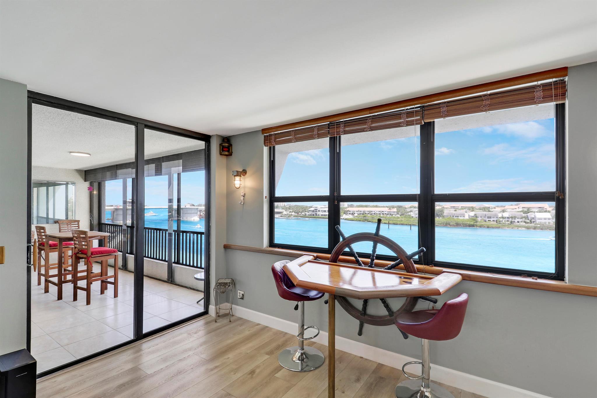 Amazing unobstructed views of blue water tides, ocean and river, sunrise and sunsets. Watch the dolphins and turtles and manatees swim by! THE BEST waterfront building in THE BEST waterfront community in Jupiter. Split Bedroom plan, Private marina with up to 40'+ dock spot available for rent or purchase, when available. Gated Entry; Carport Parking with 3' x 8' (+/-) Storage unit...plus extra storage on 6th floor storage unit. Private Tiki, Tennis, CLUB House & Community Pool and so much more. Second bedroom photos digital stage.